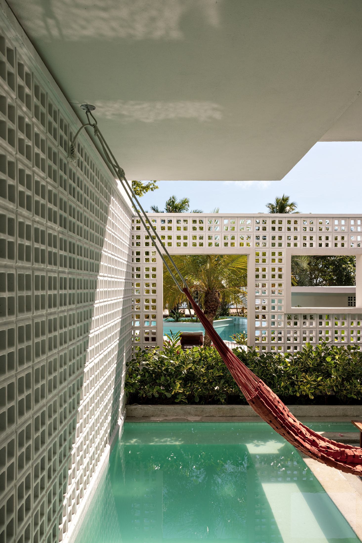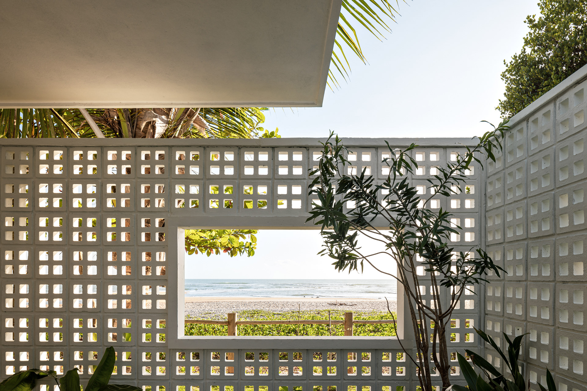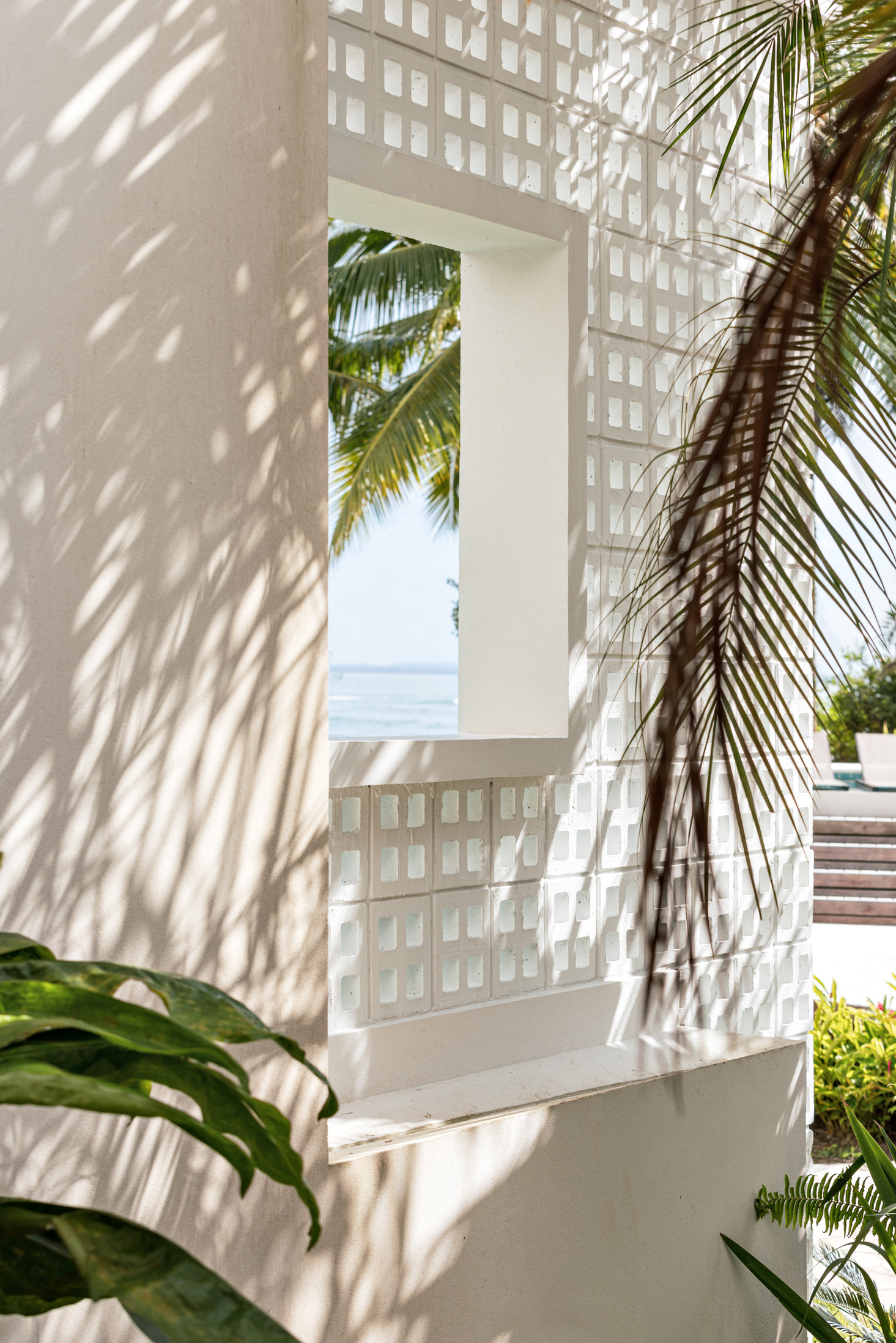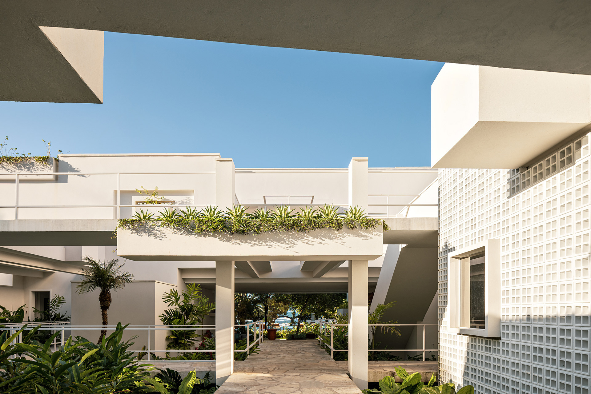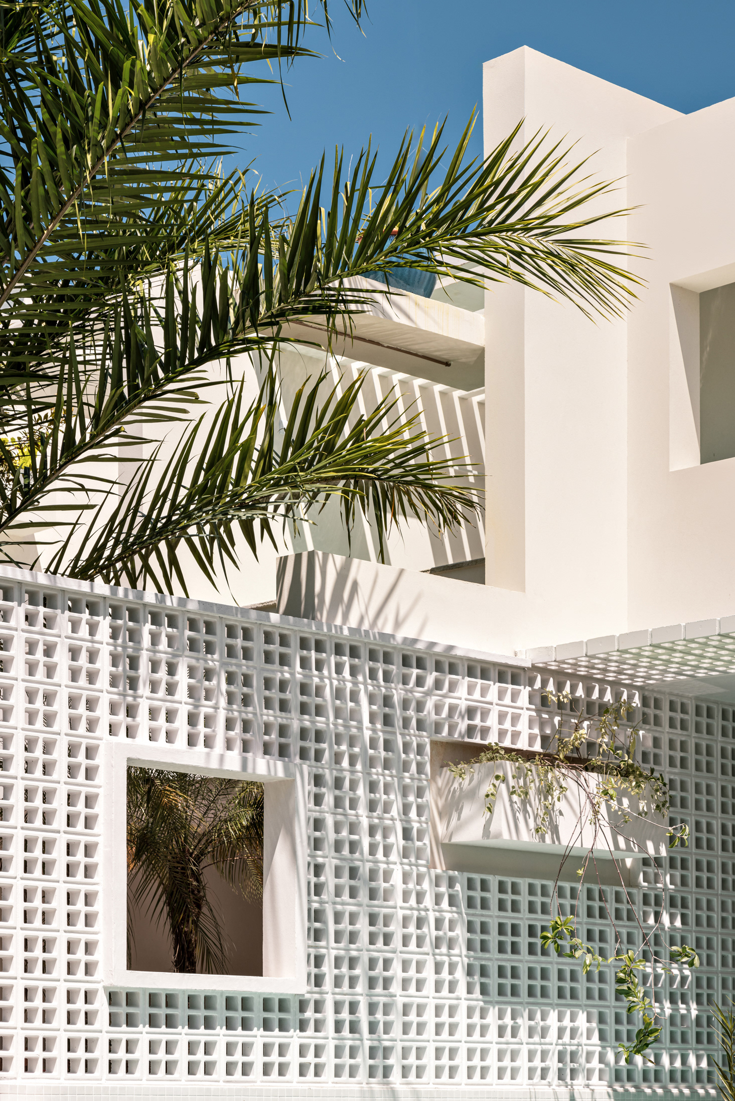 Partindo da alvenaria e concreto moldado in loco, materiais existentes na ilha e com que a mão de obra local estava acostumada, criamos diversos itens que fariam a composição dessas varandas, ora cobertas ora descobertas, piscinas em diferentes formatos, bancos, espreguiçadeiras moldadas in loco, jardineiras, bicas d’água, cobogós e etc. A partir desses elementos, surgiu uma diversidade volumétrica na fachada.
