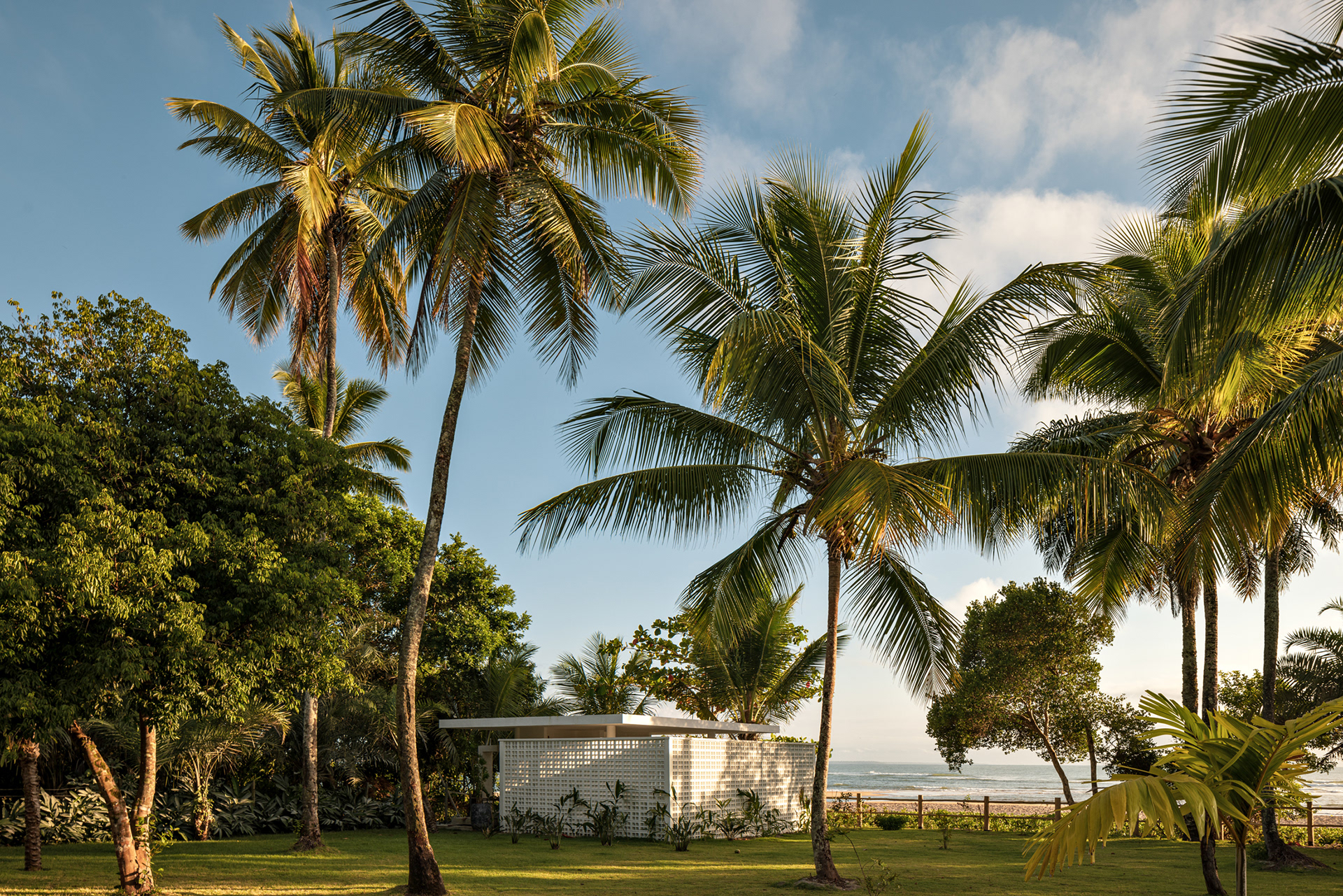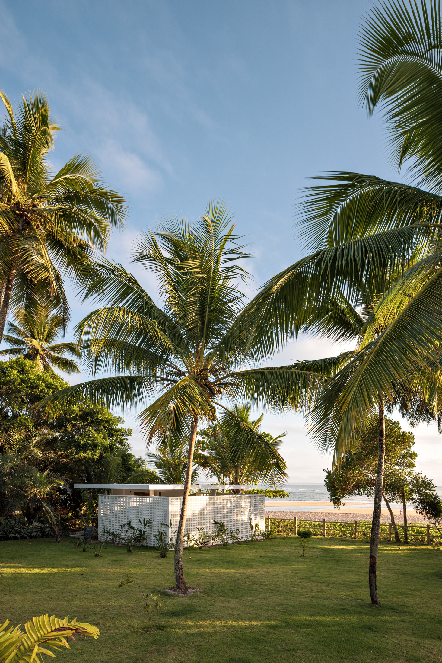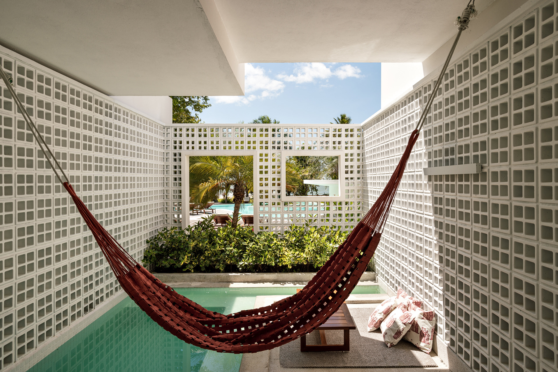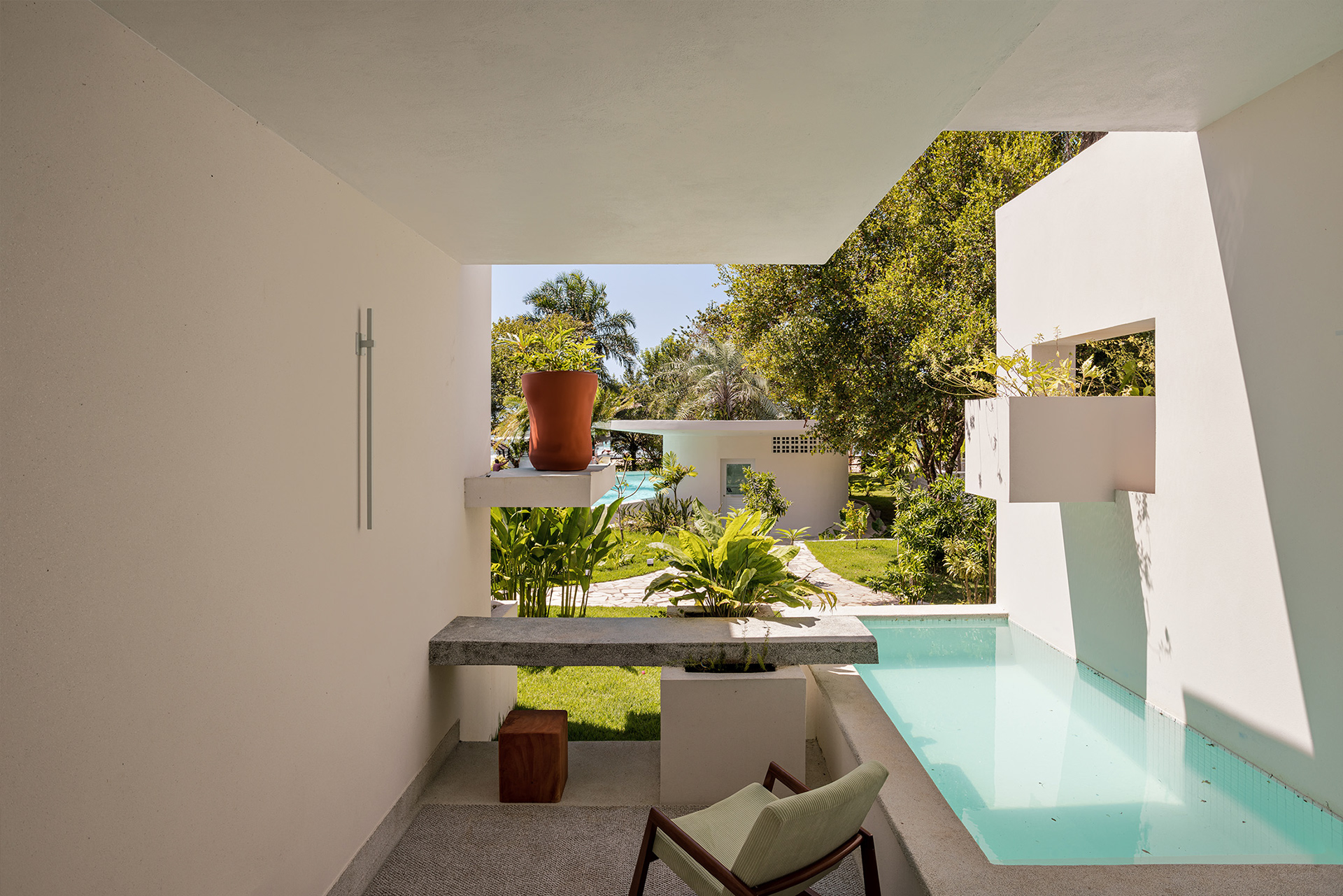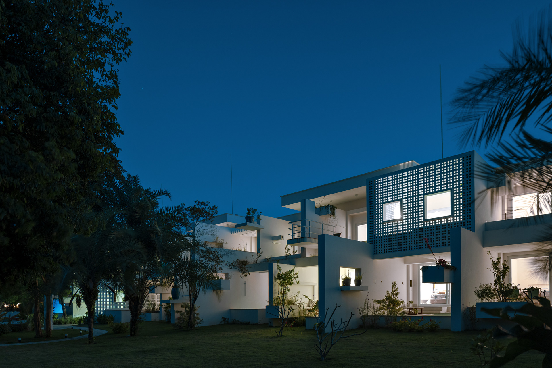 Partindo da alvenaria e concreto moldado in loco, materiais existentes na ilha e com que a mão de obra local estava acostumada, criamos diversos itens que fariam a composição dessas varandas, ora cobertas ora descobertas, piscinas em diferentes formatos, bancos, espreguiçadeiras moldadas in loco, jardineiras, bicas d’água, cobogós e etc. A partir desses elementos, surgiu uma diversidade volumétrica na fachada.