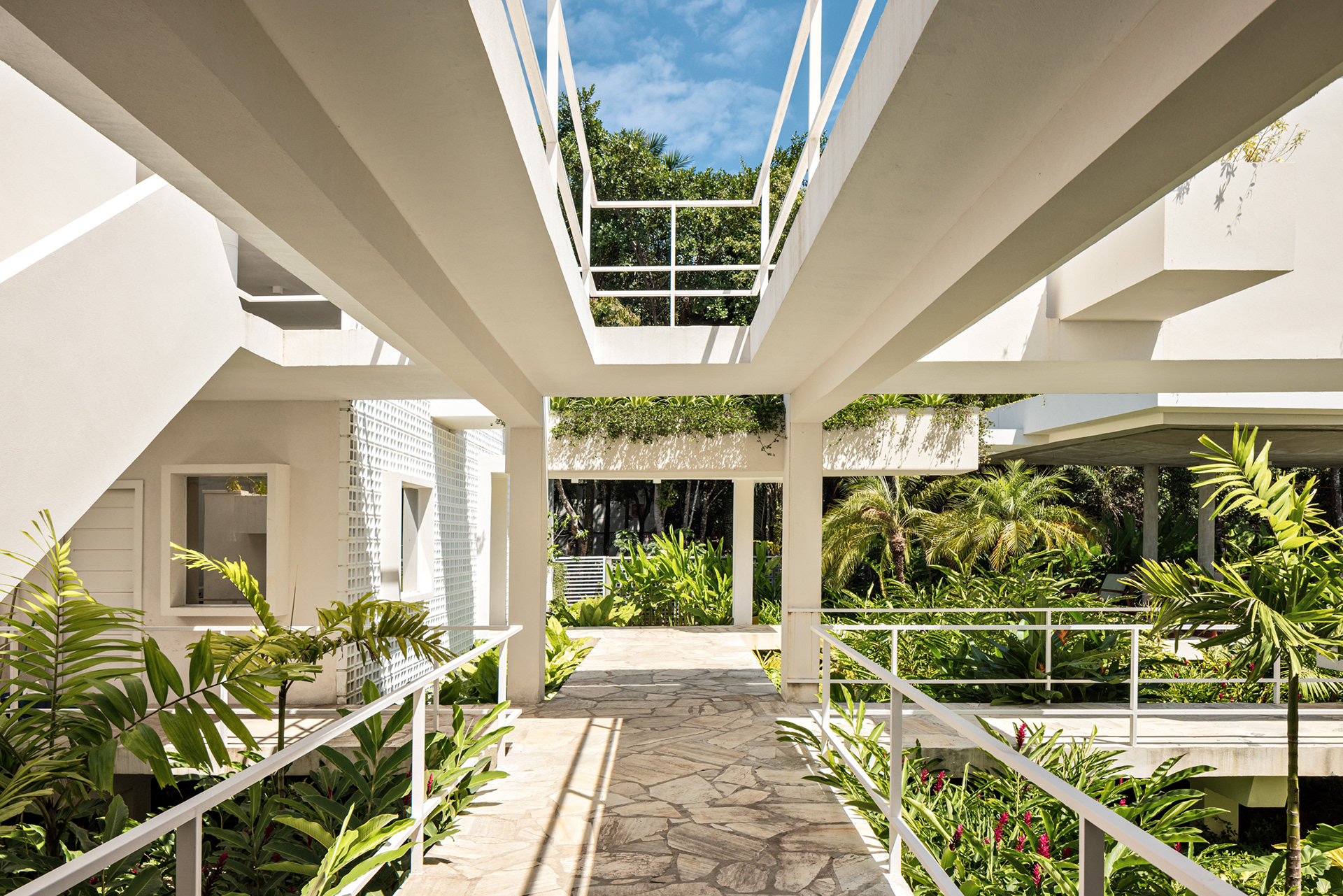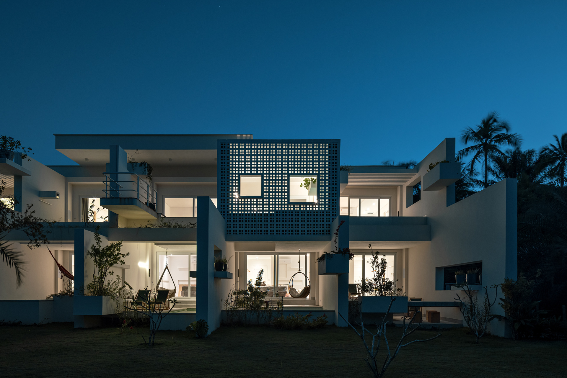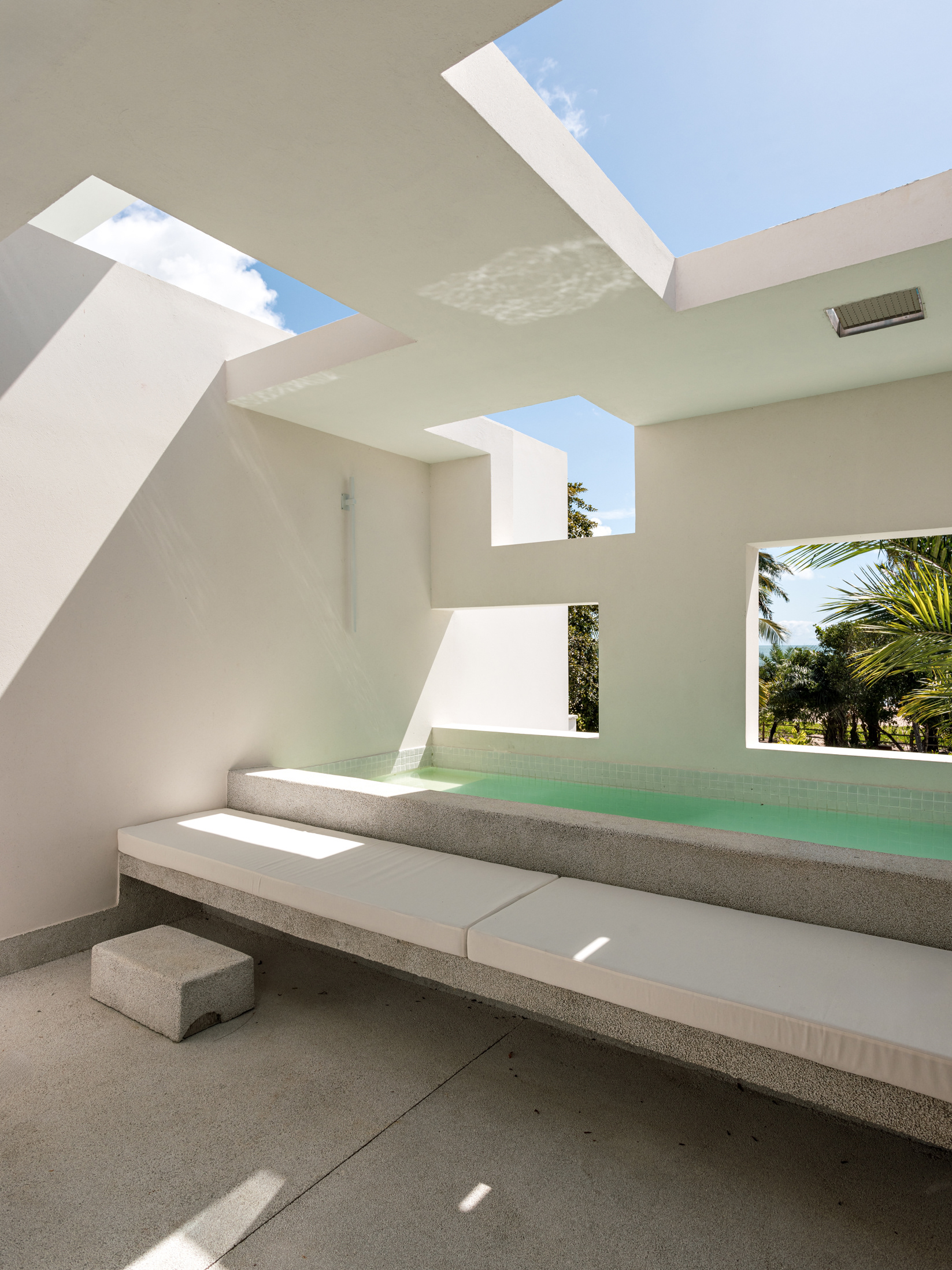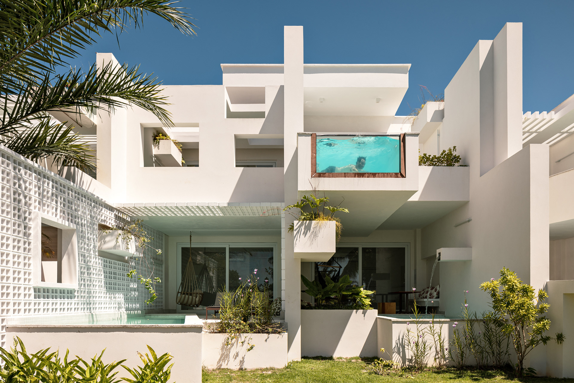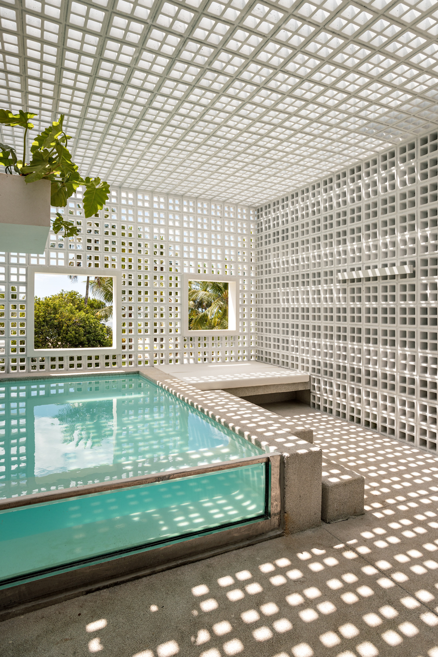 O resultado é uma construção complexa que explora a diversidade de elementos de forma inusitada, permitindo experimentos pontuais, como varanda totalmente envolta em cobogós, mirante, piscinas com formatos pensados para um casal e assim por diante.