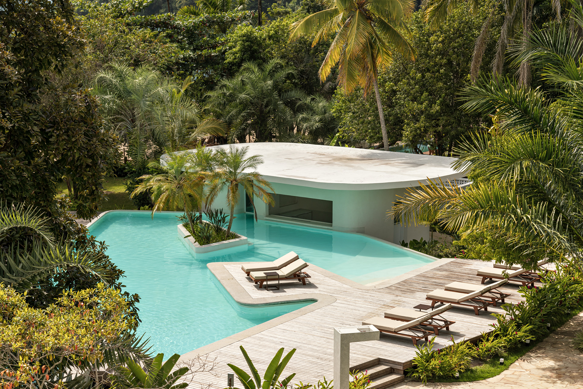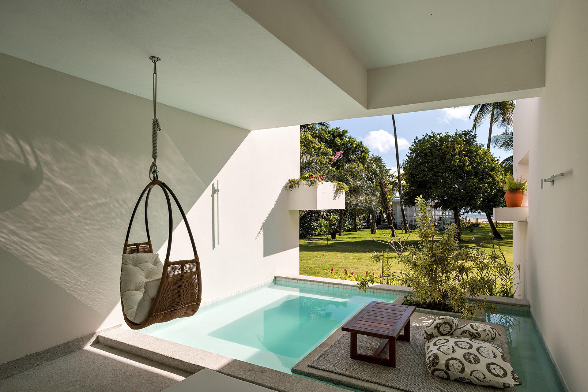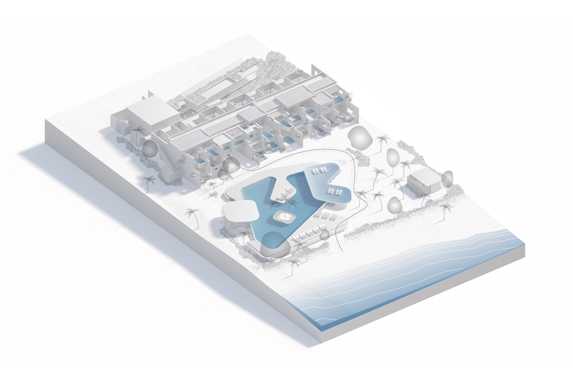 As demandas principais desse projeto foram: todos os quartos iguais com piscinas privativas, voltados para a vista do mar e o uso de concreto moldado in loco e alvenaria, dada a dificuldade da chegada de outros materiais à ilha.