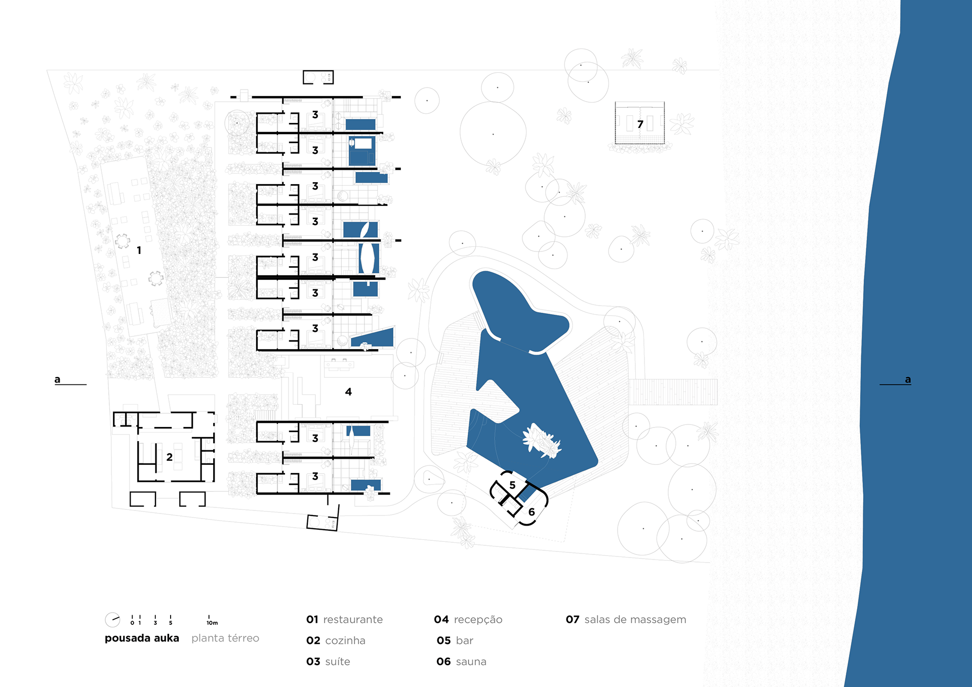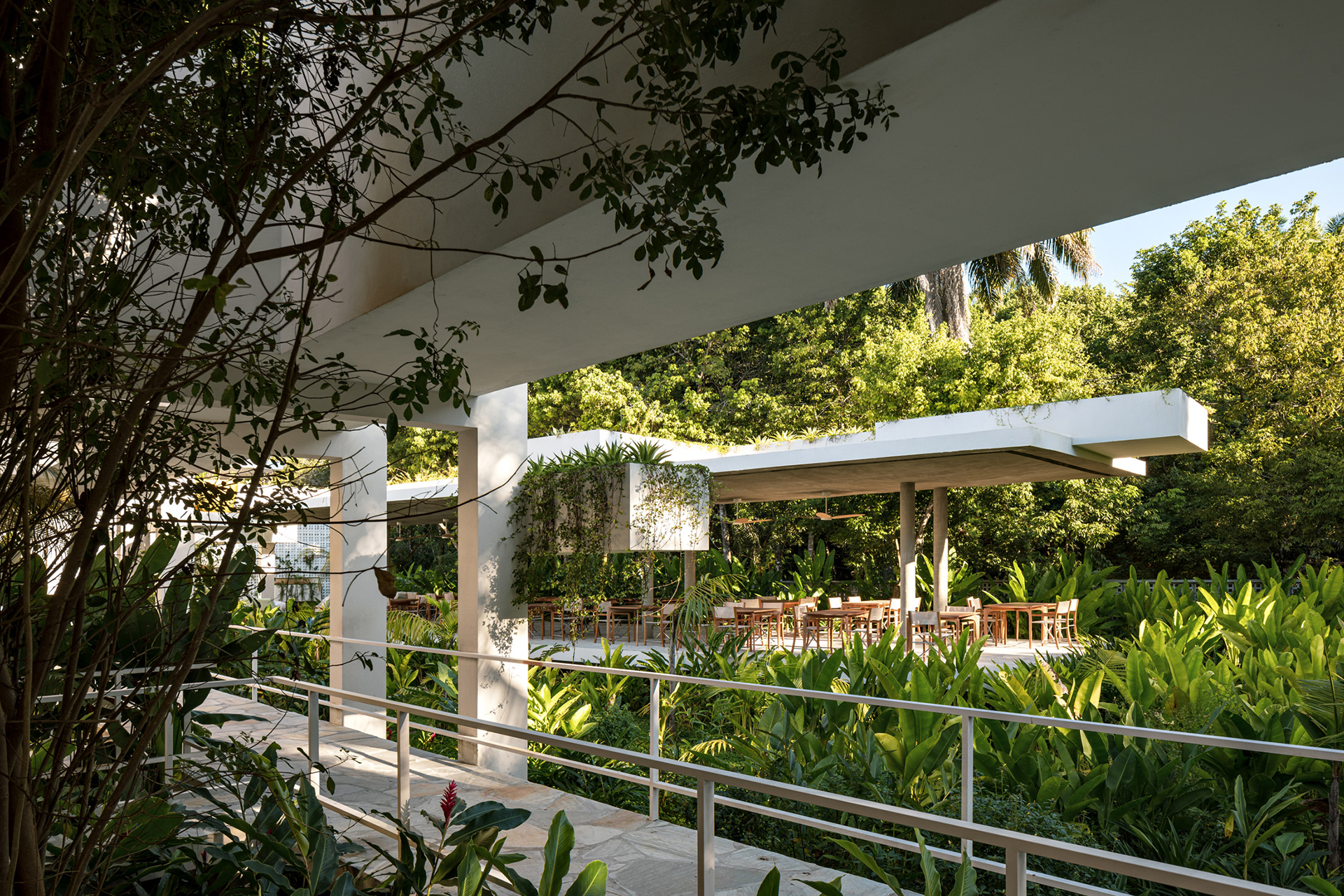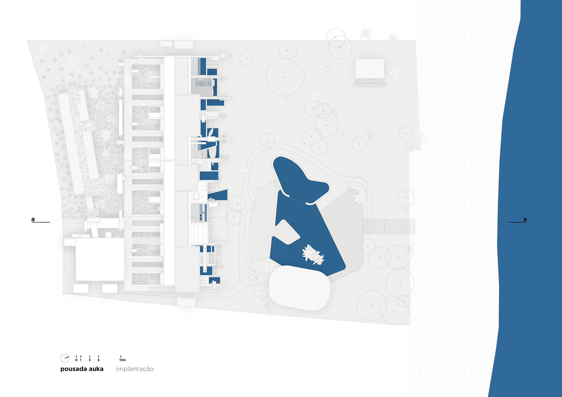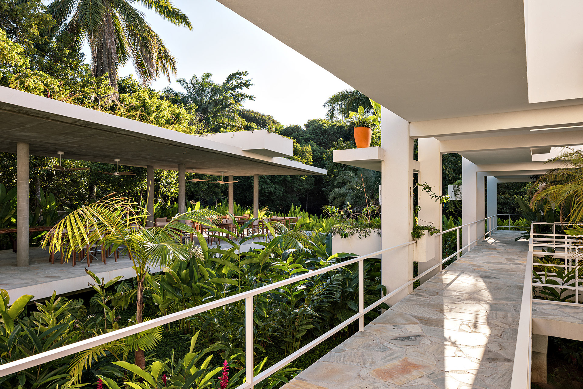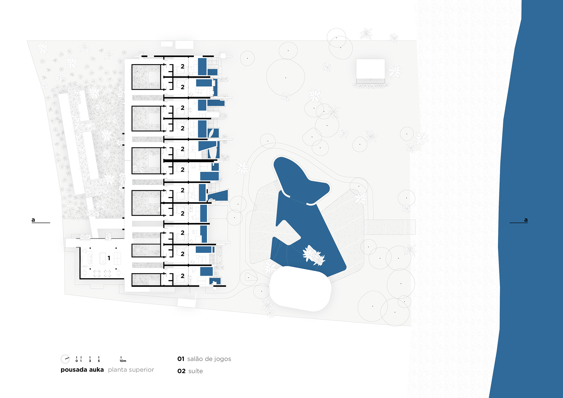 Na porção posterior, está localizada sala de jogos, restaurante e acesso aos quartos, em meio a um denso paisagismo, que com o passar dos anos, irá envolver completamente esse trecho, separando o projeto em área mata e área piscina-mar.