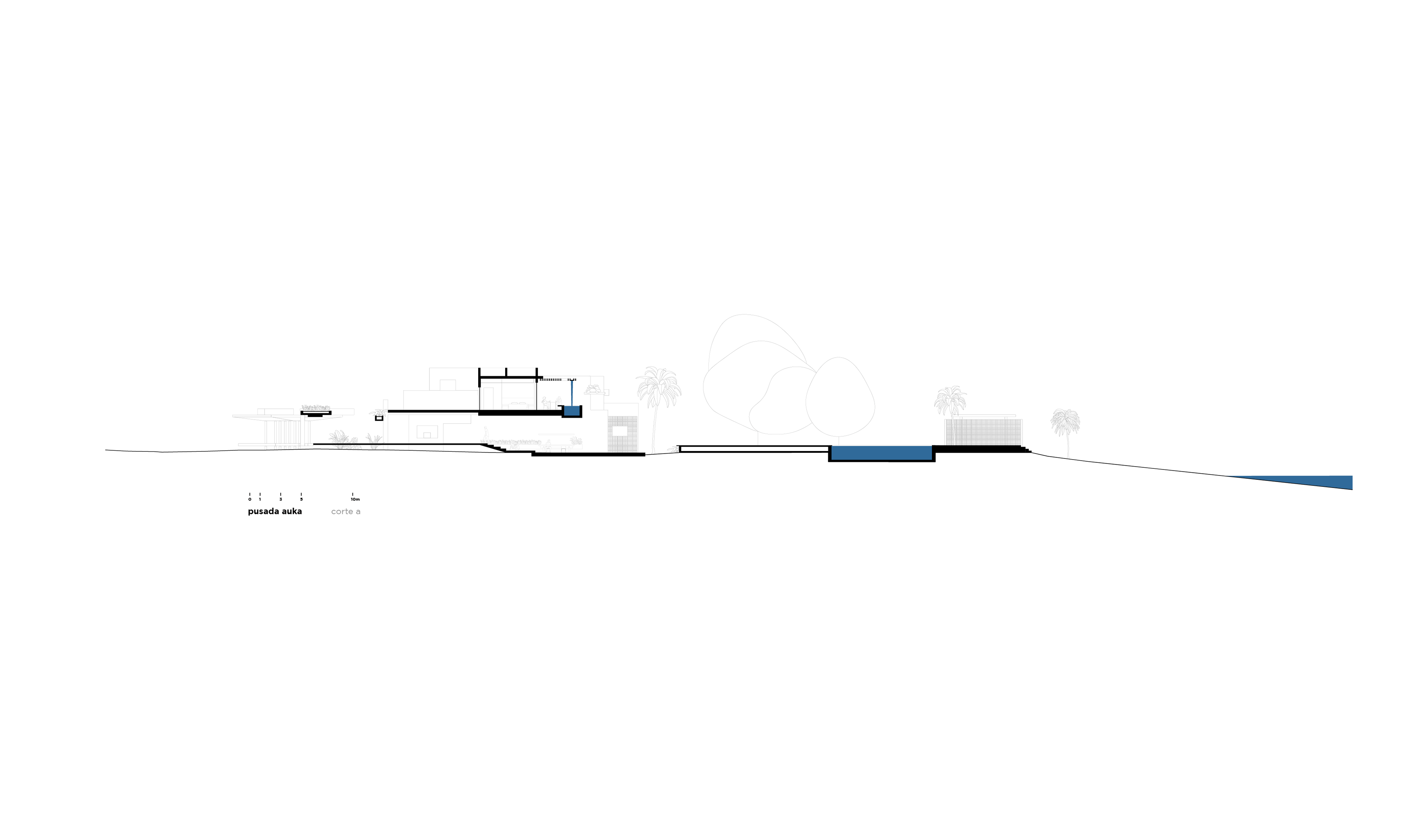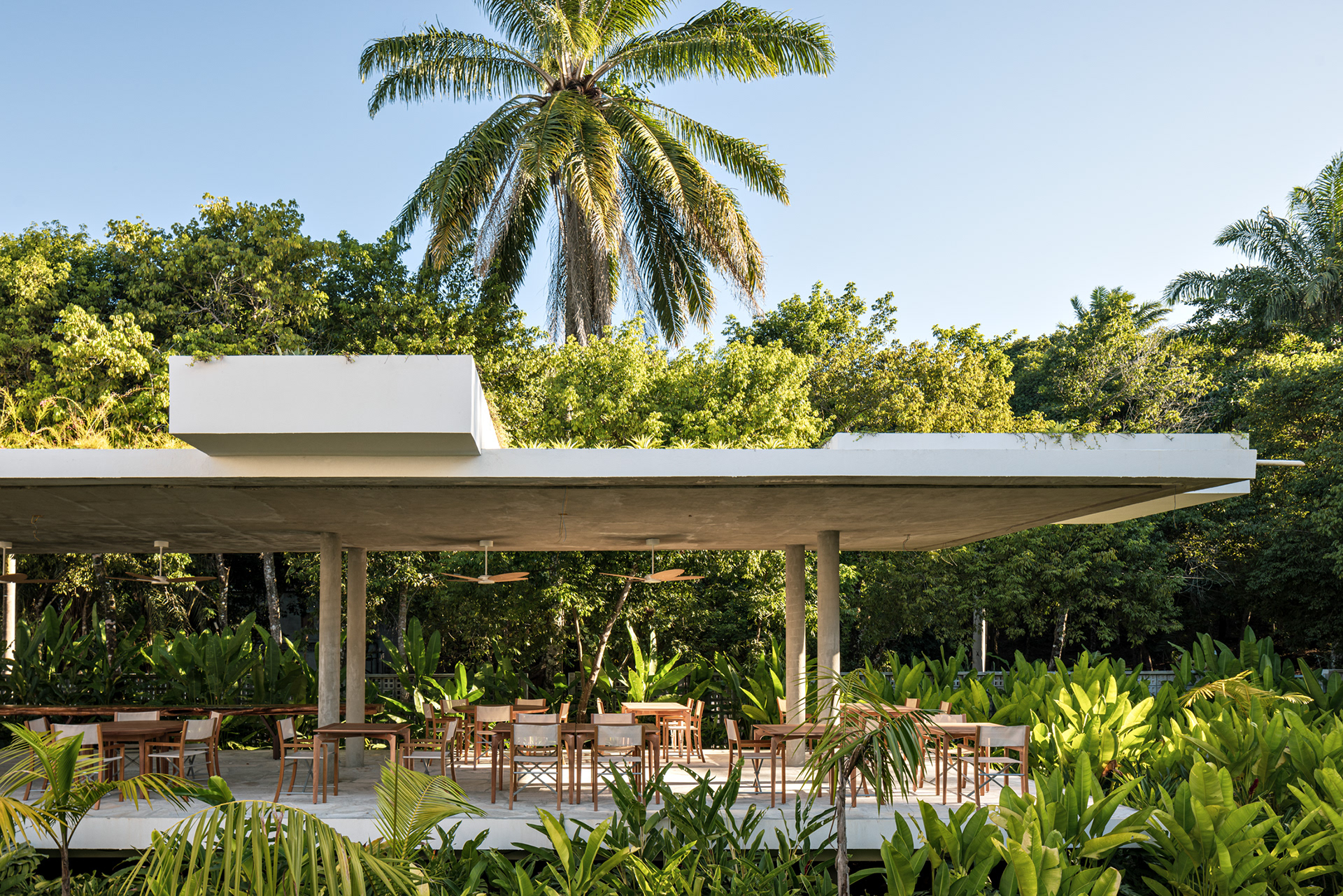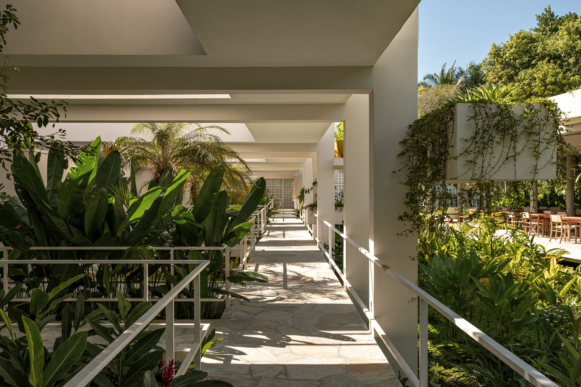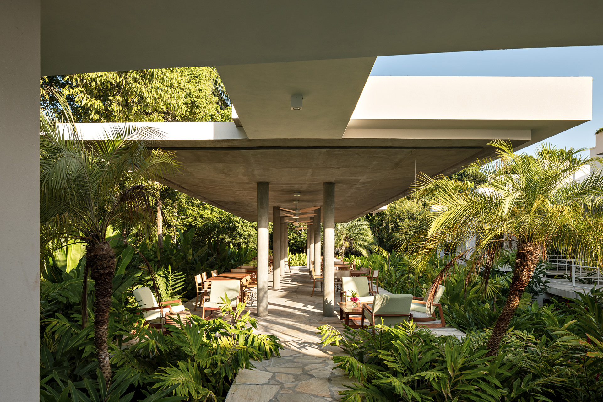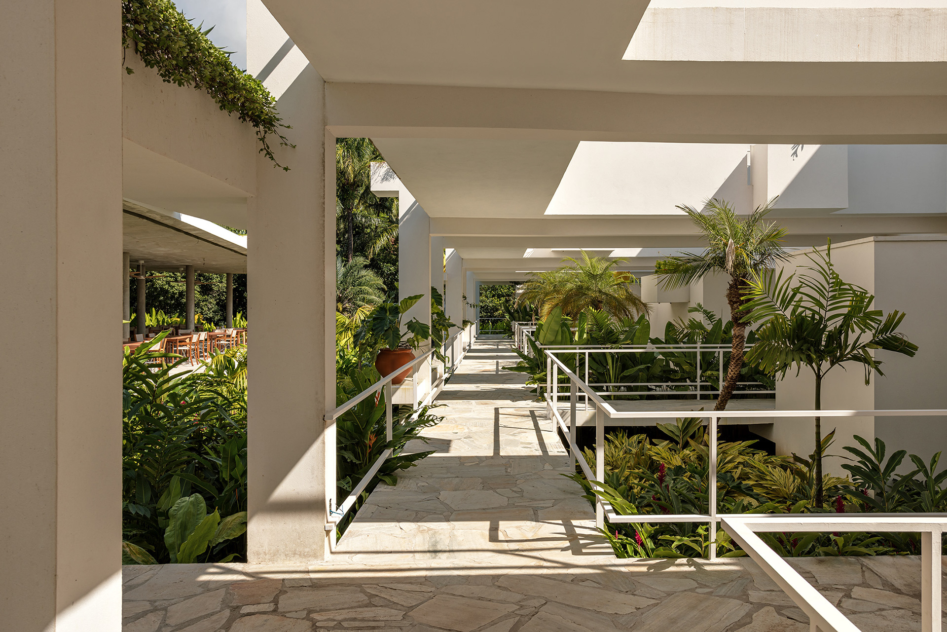 Na porção posterior, está localizada sala de jogos, restaurante e acesso aos quartos, em meio a um denso paisagismo, que com o passar dos anos, irá envolver completamente esse trecho, separando o projeto em área mata e área piscina-mar.