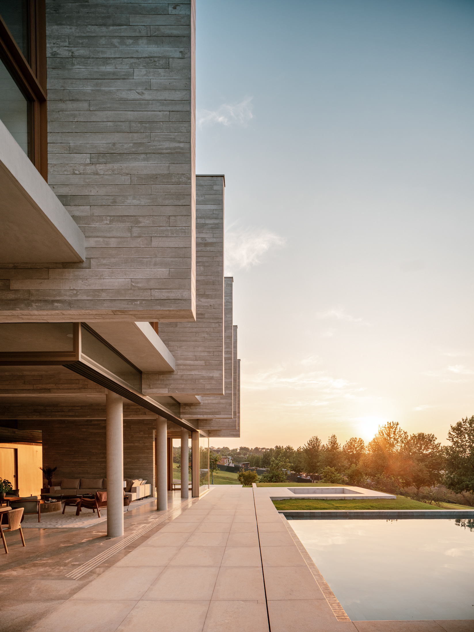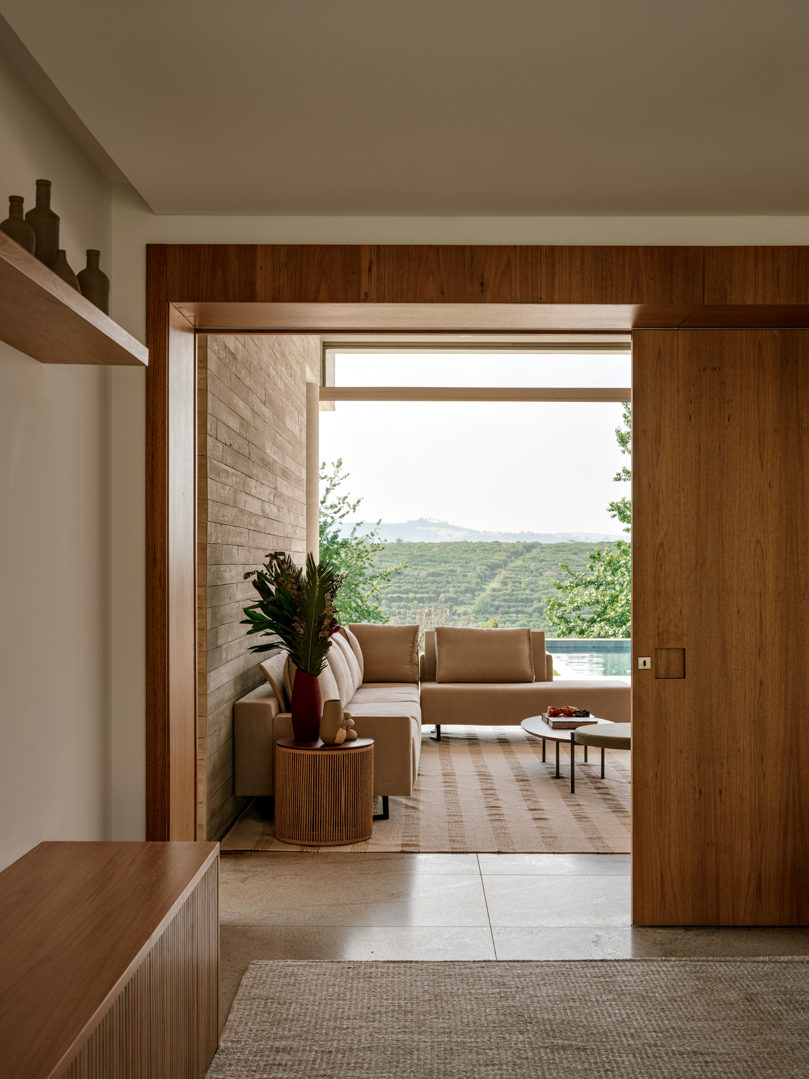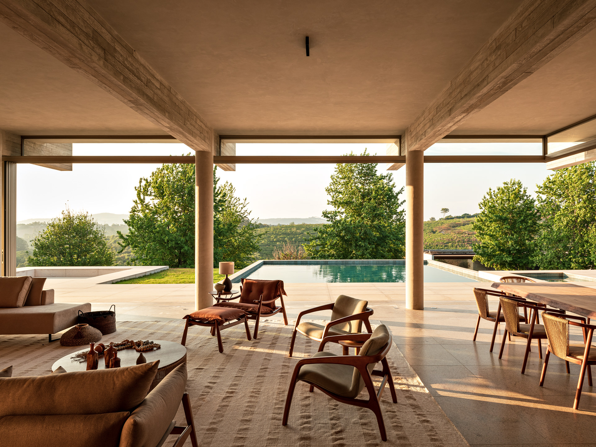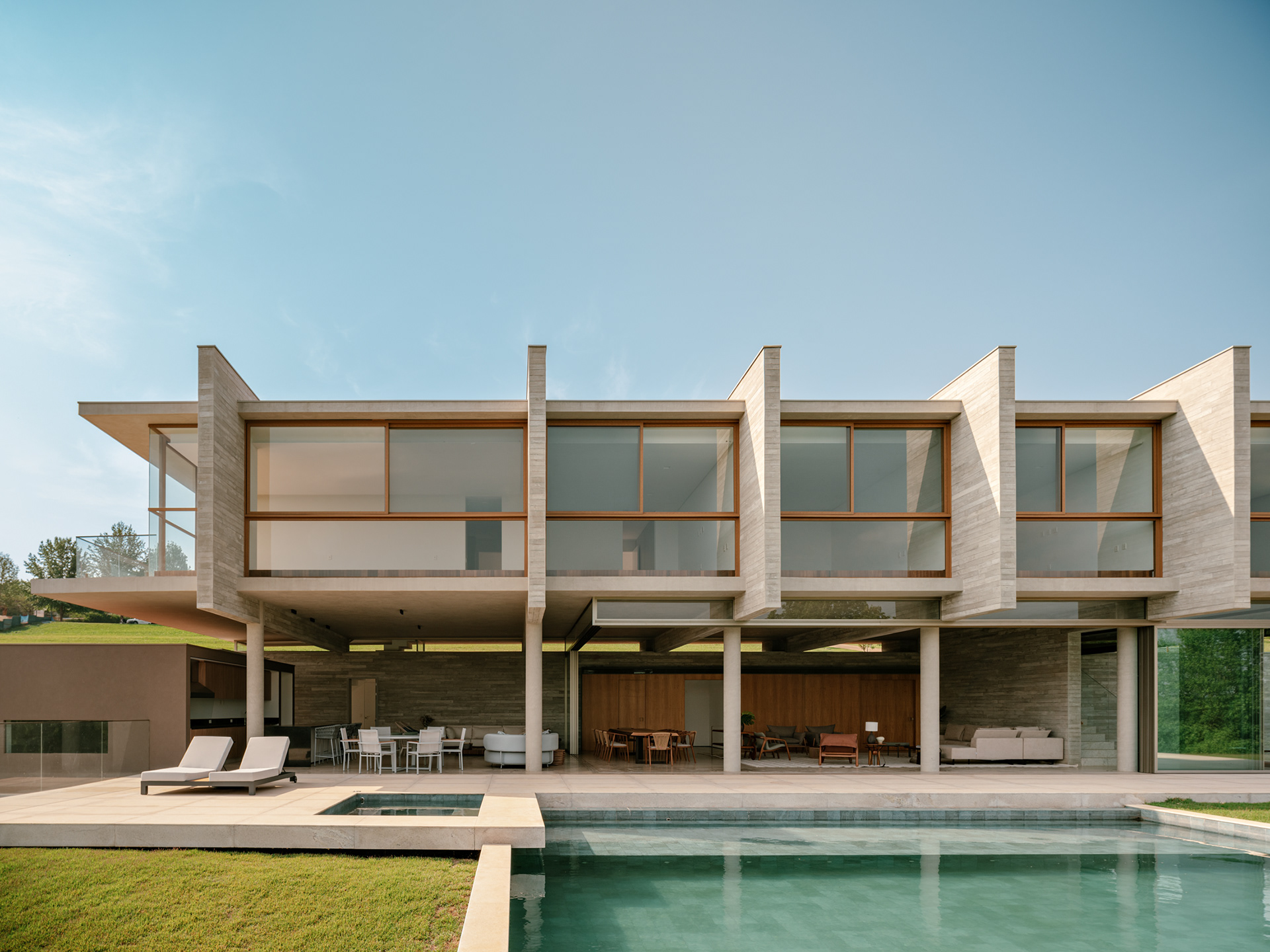 Do ponto de vista construtivo e de acabamento, buscamos trabalhar com materiais em seu estado natural, como muito vidro nos fechamentos, o concreto aparente na estrutura, a pedra e a madeira nos pisos internos, externos e na piscina de forma a criar um elemento ao mesmo tempo de estética marcante e neutro do ponto de vista cromático, onde o que se destaca é a paisagem natural externa.