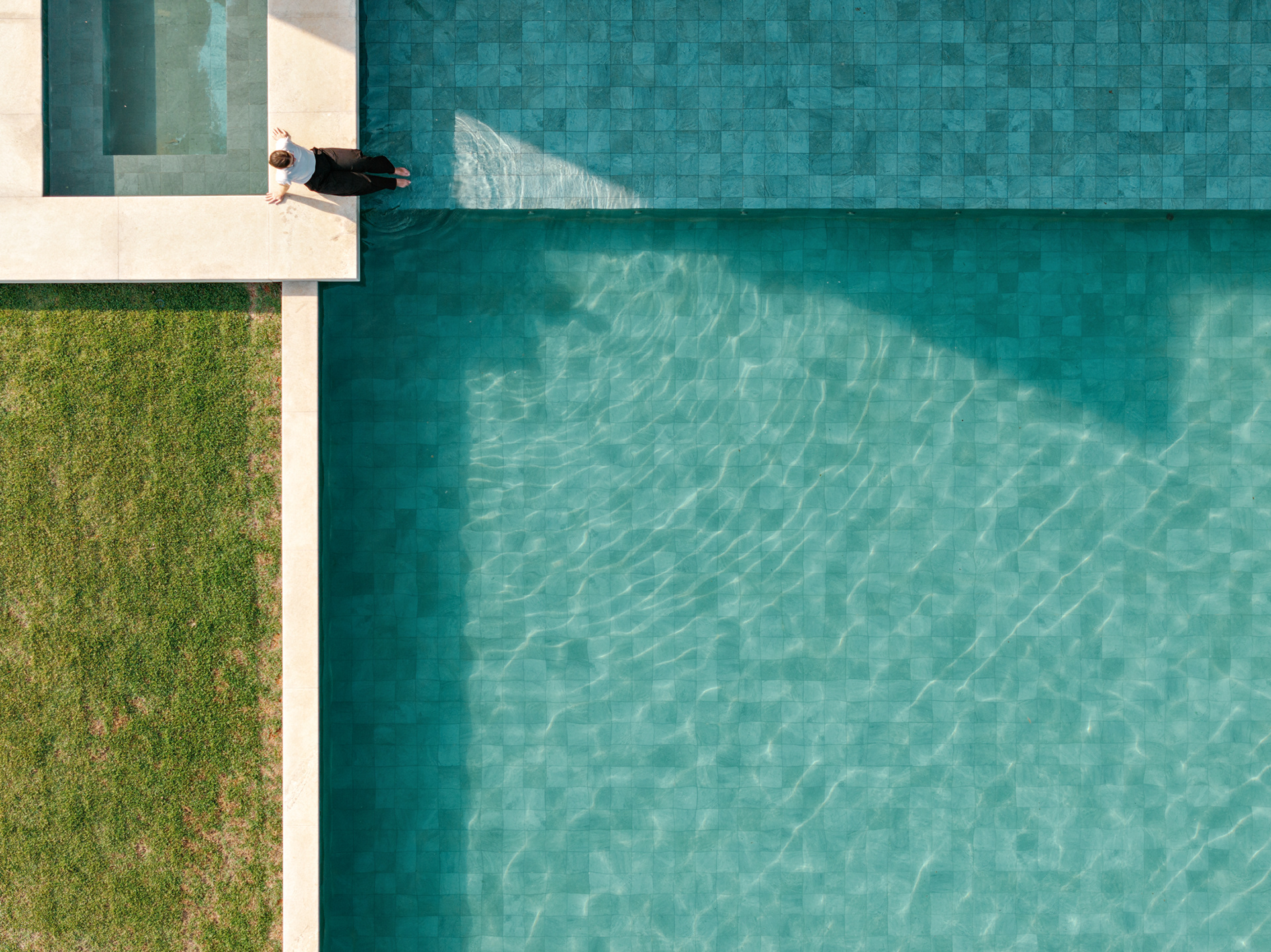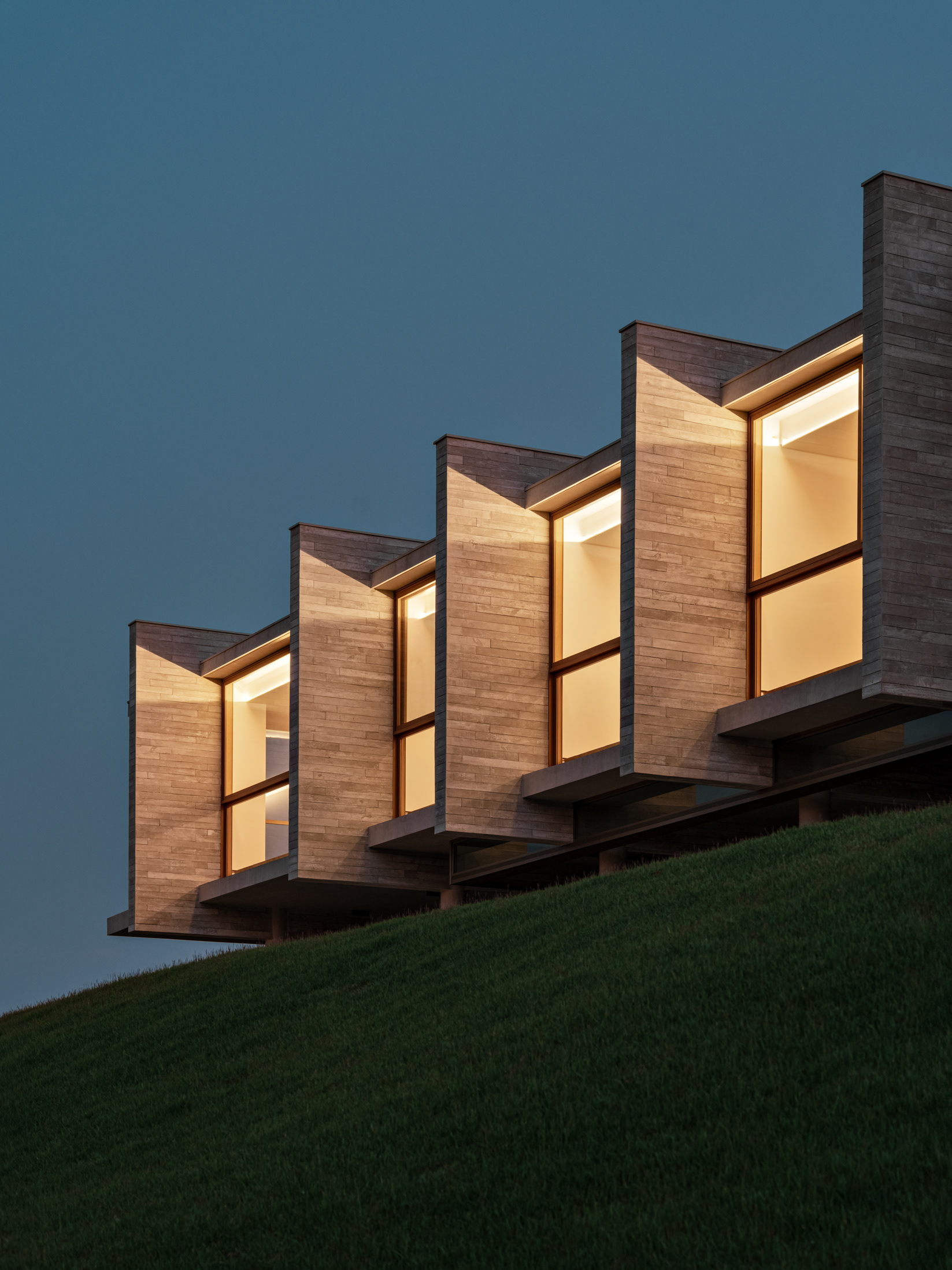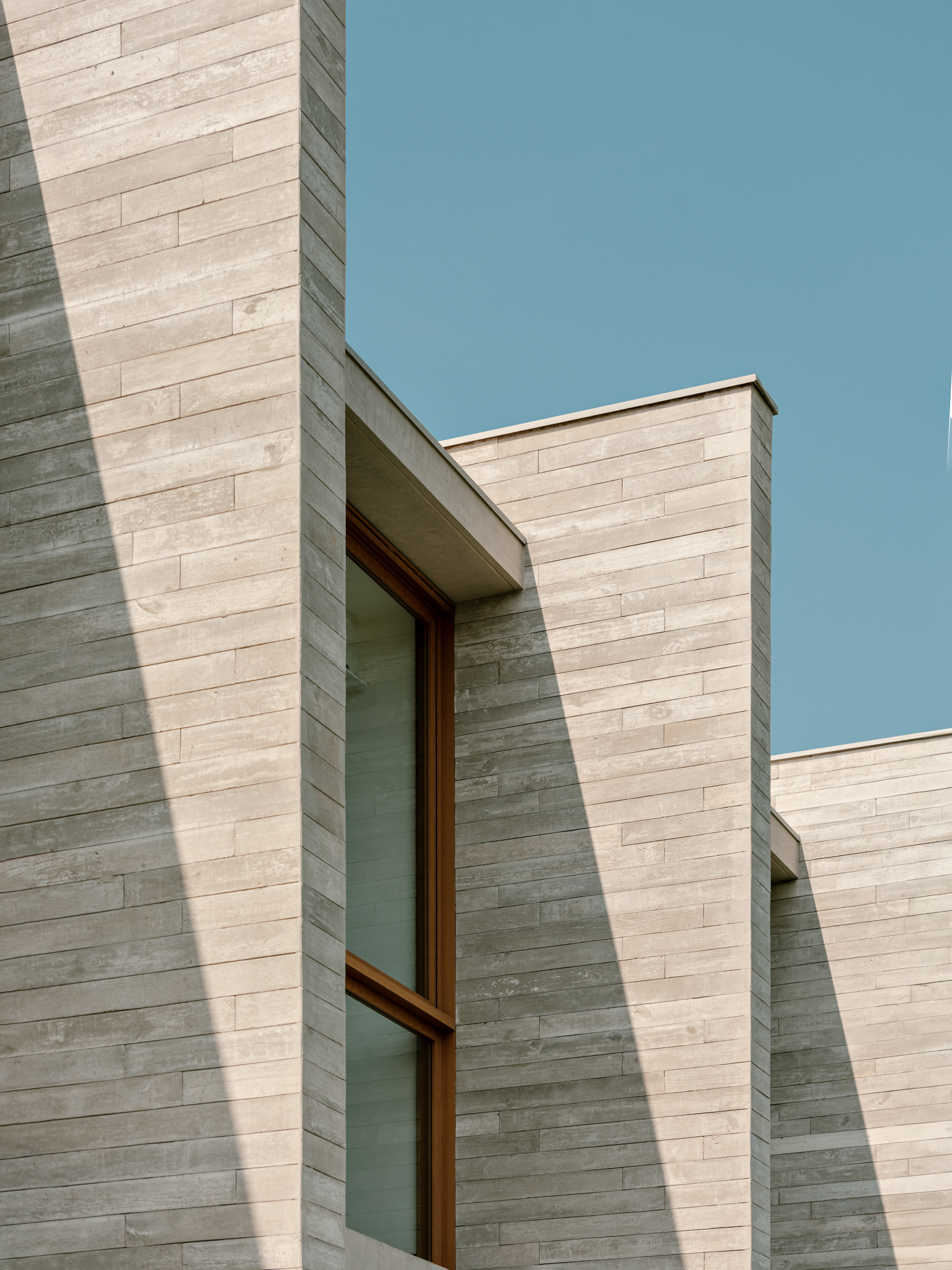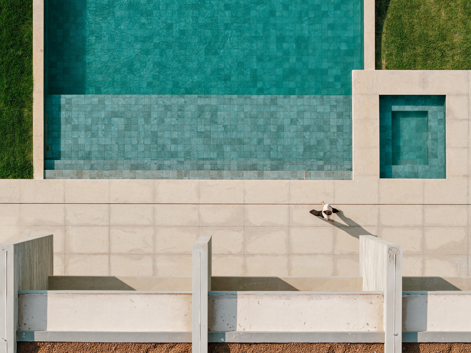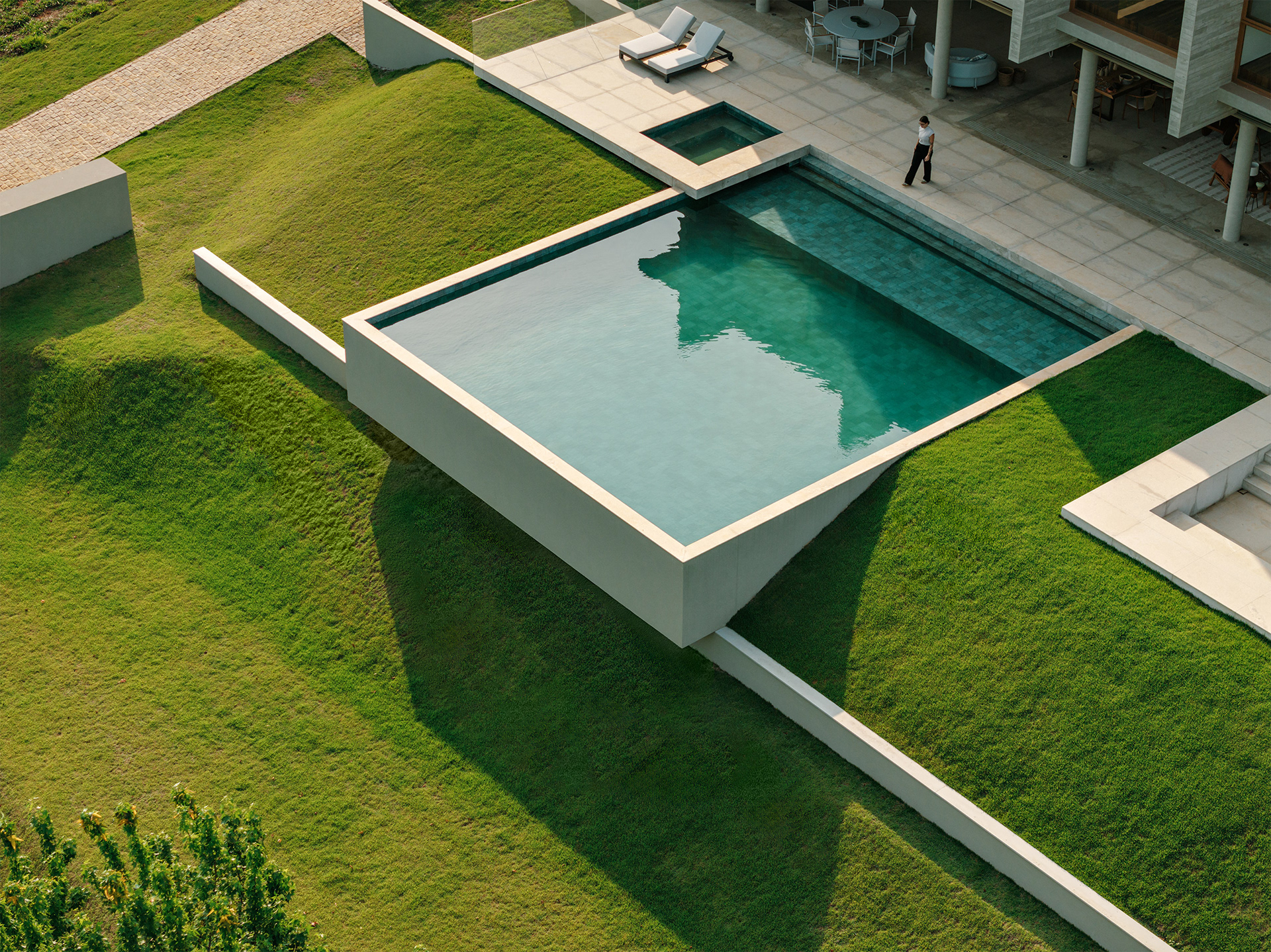 Do ponto de vista construtivo e de acabamento, buscamos trabalhar com materiais em seu estado natural, como muito vidro nos fechamentos, o concreto aparente na estrutura, a pedra e a madeira nos pisos internos, externos e na piscina de forma a criar um elemento ao mesmo tempo de estética marcante e neutro do ponto de vista cromático, onde o que se destaca é a paisagem natural externa.
