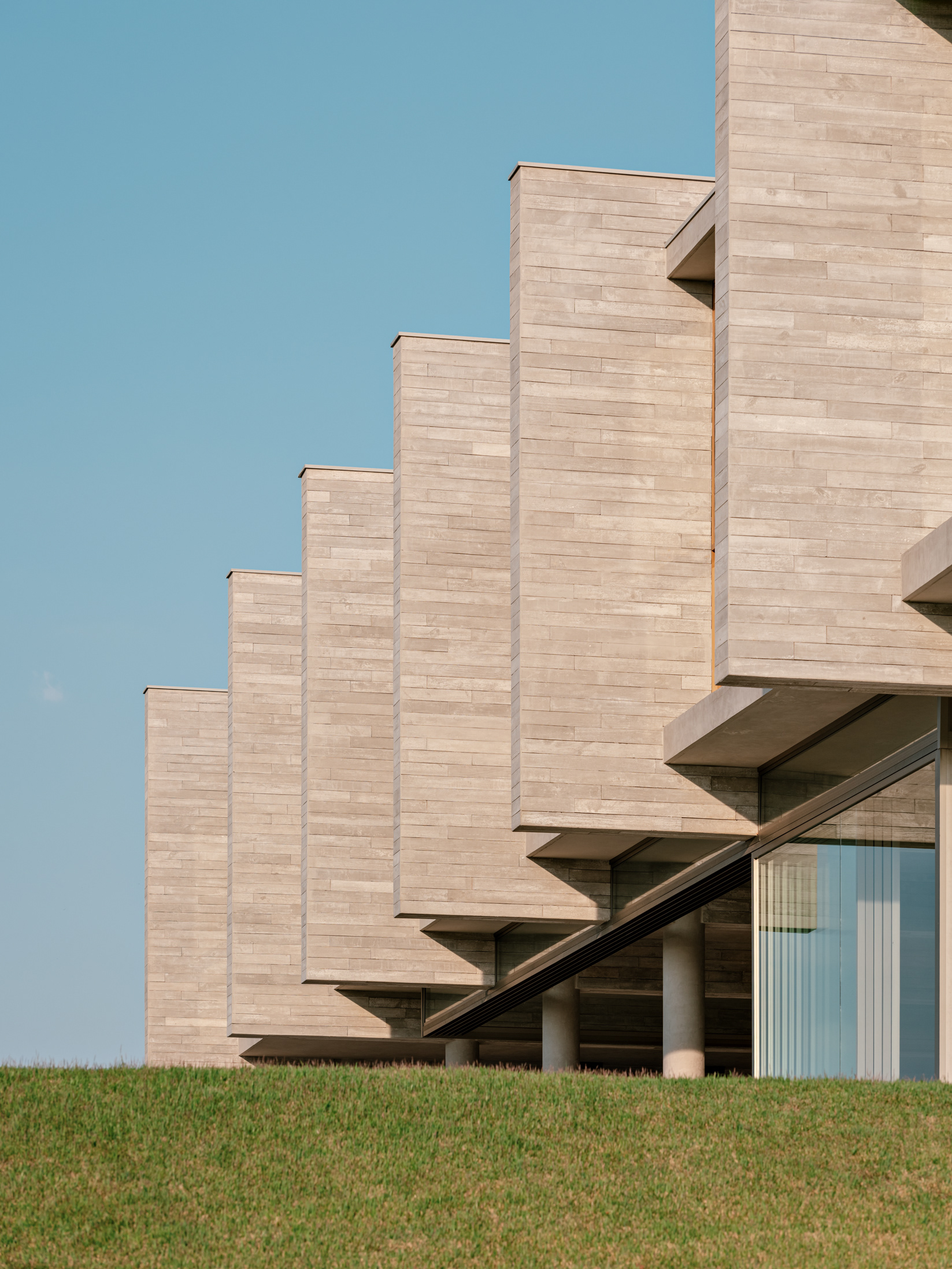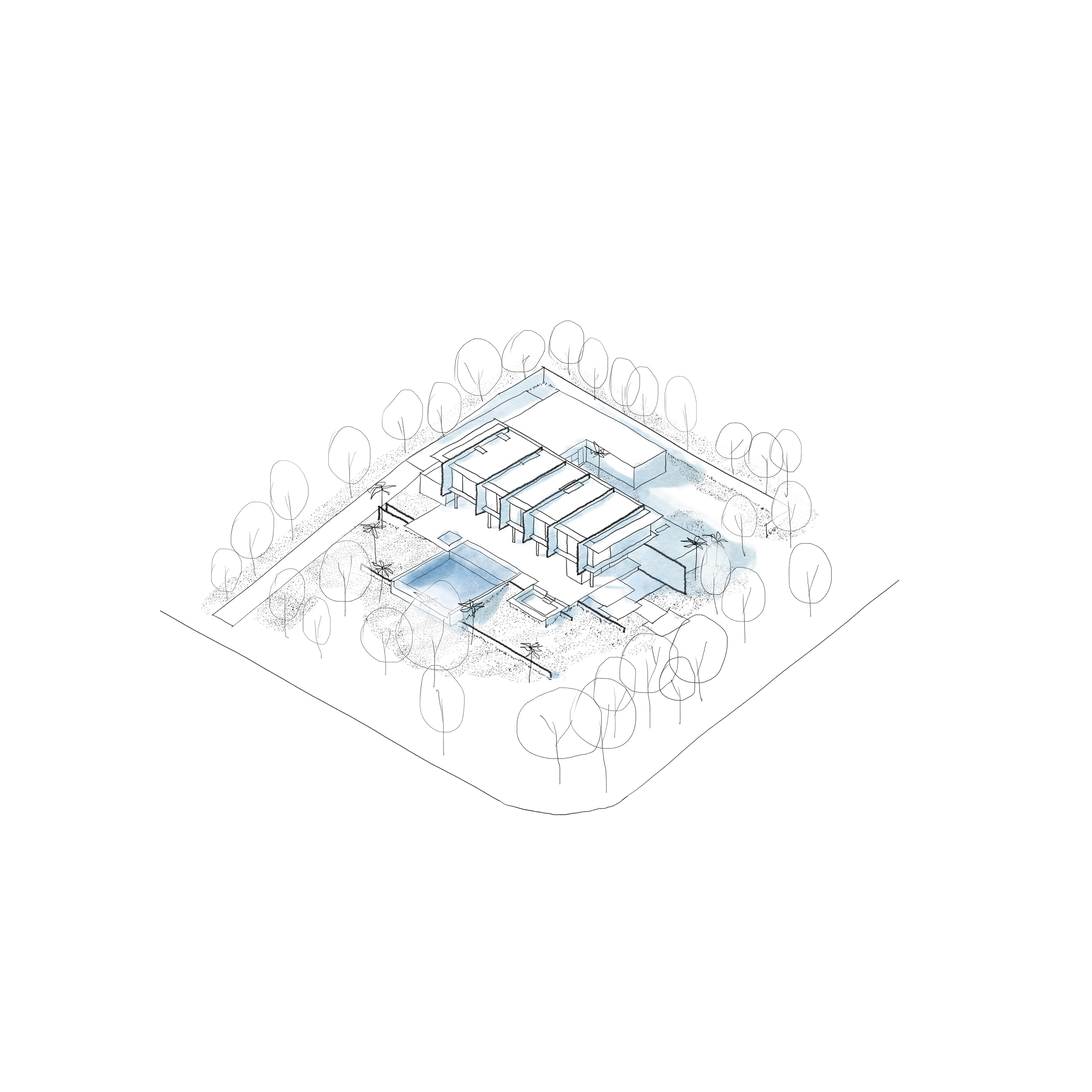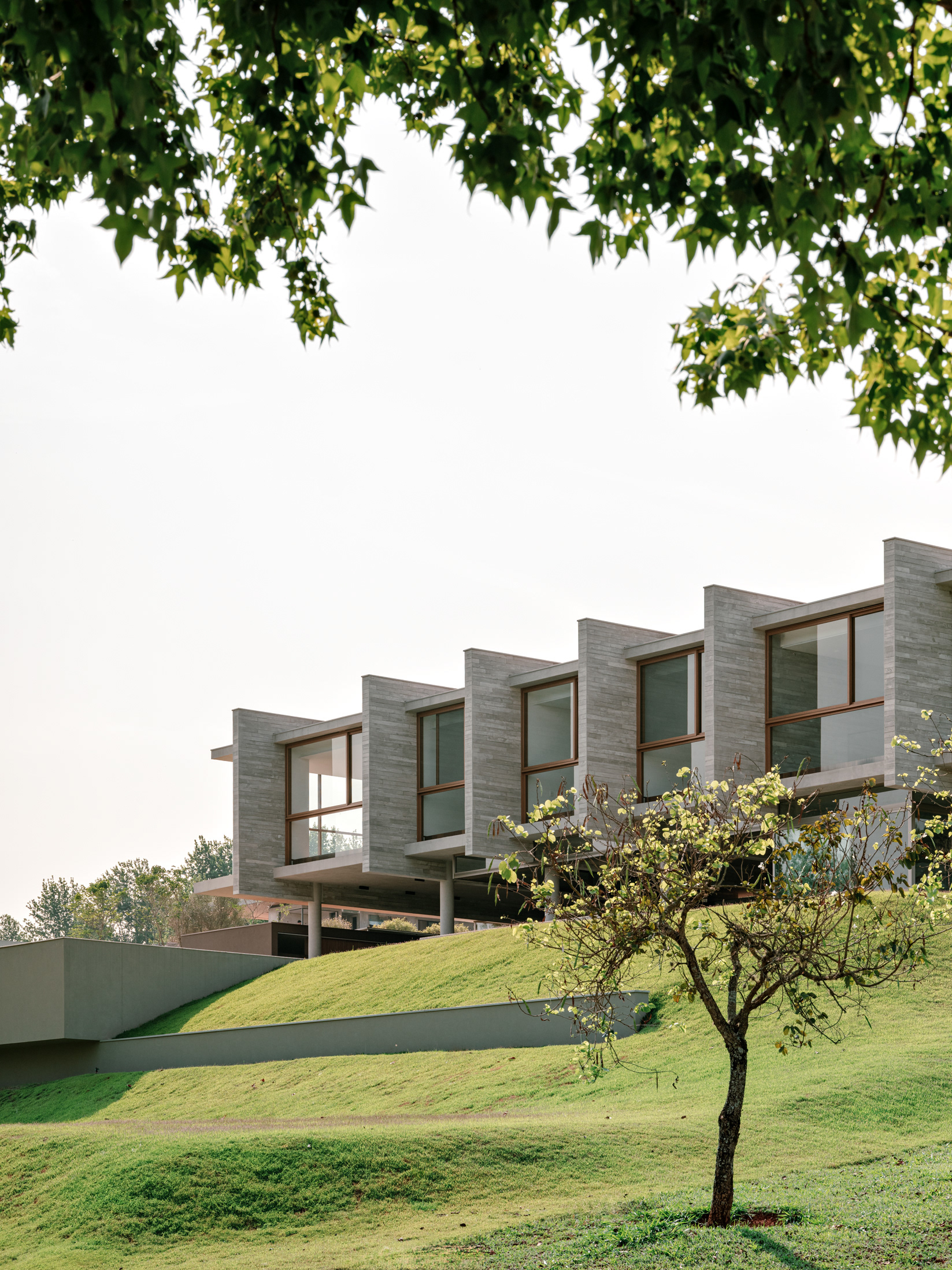 O partido do projeto é bastante simples e parte da concepção estrutural. Neste projeto a estrutura é a casa, quase que composta de uma sobreposição de pilares, vigas e lajes. Uma sequência de pilares redondos de concreto aparente forma pórticos com uma parede também em concreto e uma sequência de empenas do mesmo material com cerca de 4m de altura, que sustentam o pavimento superior, penduram a laje de piso deste andar e fazem a separação entre as suítes principais da casa. Este conjunto de pilares e empenas é o principal elemento visível de longe e de perto e cobre o nível social da casa, fechado apenas por painéis deslizantes de vidro, que criam as separações entre sala e varandas. Destacando-se do terreno inclinado, os pisos externos são formados por planos horizontais desencontrados que conformam o acesso, o espelho d’água, as varandas e terraços externos, bem como se relacionam com o volume semi suspenso da grande piscina da casa.