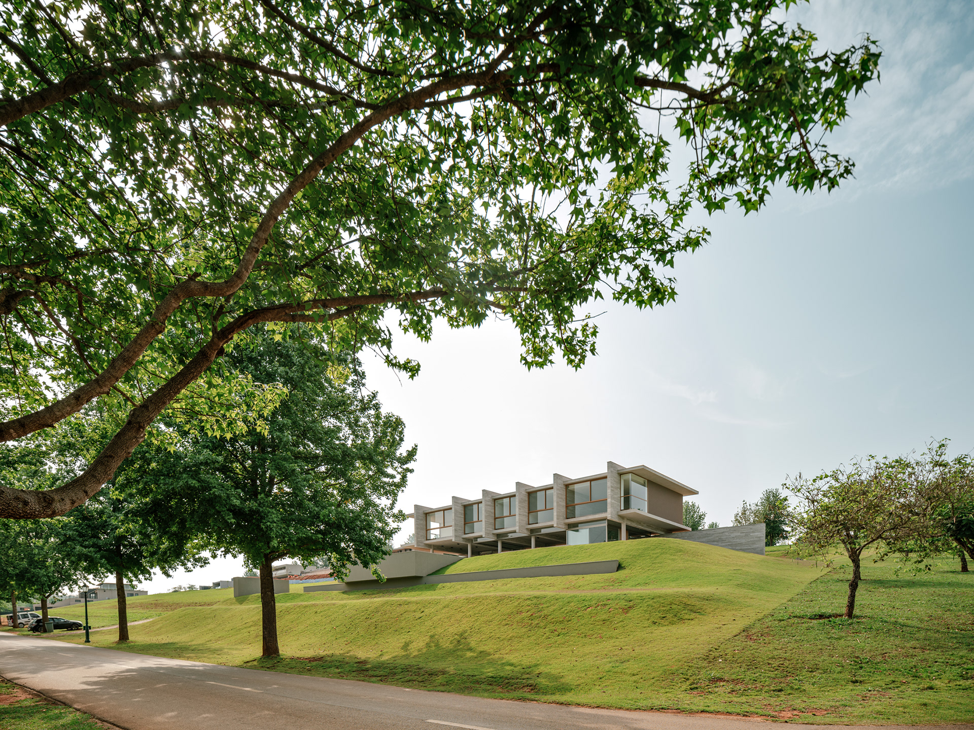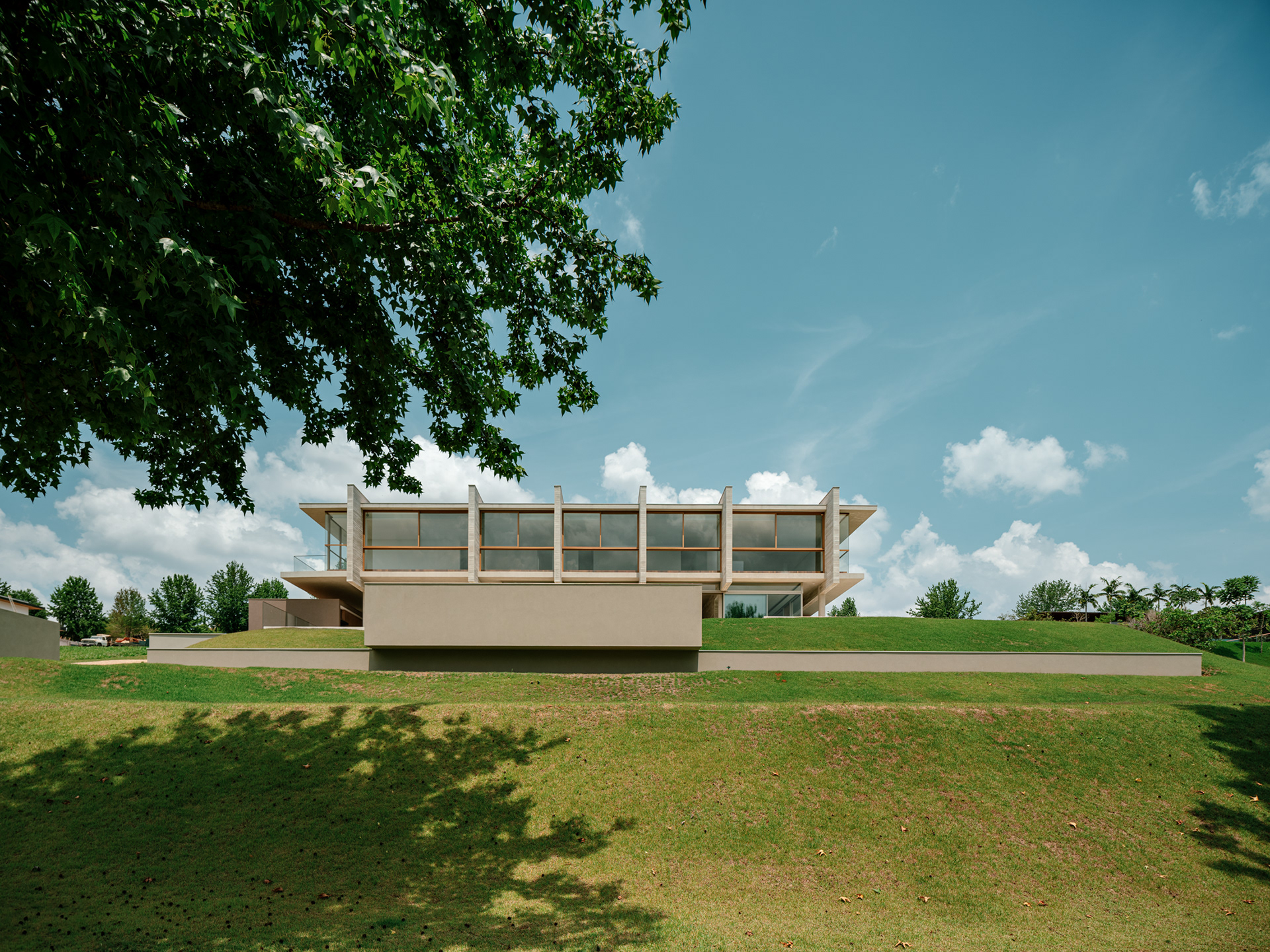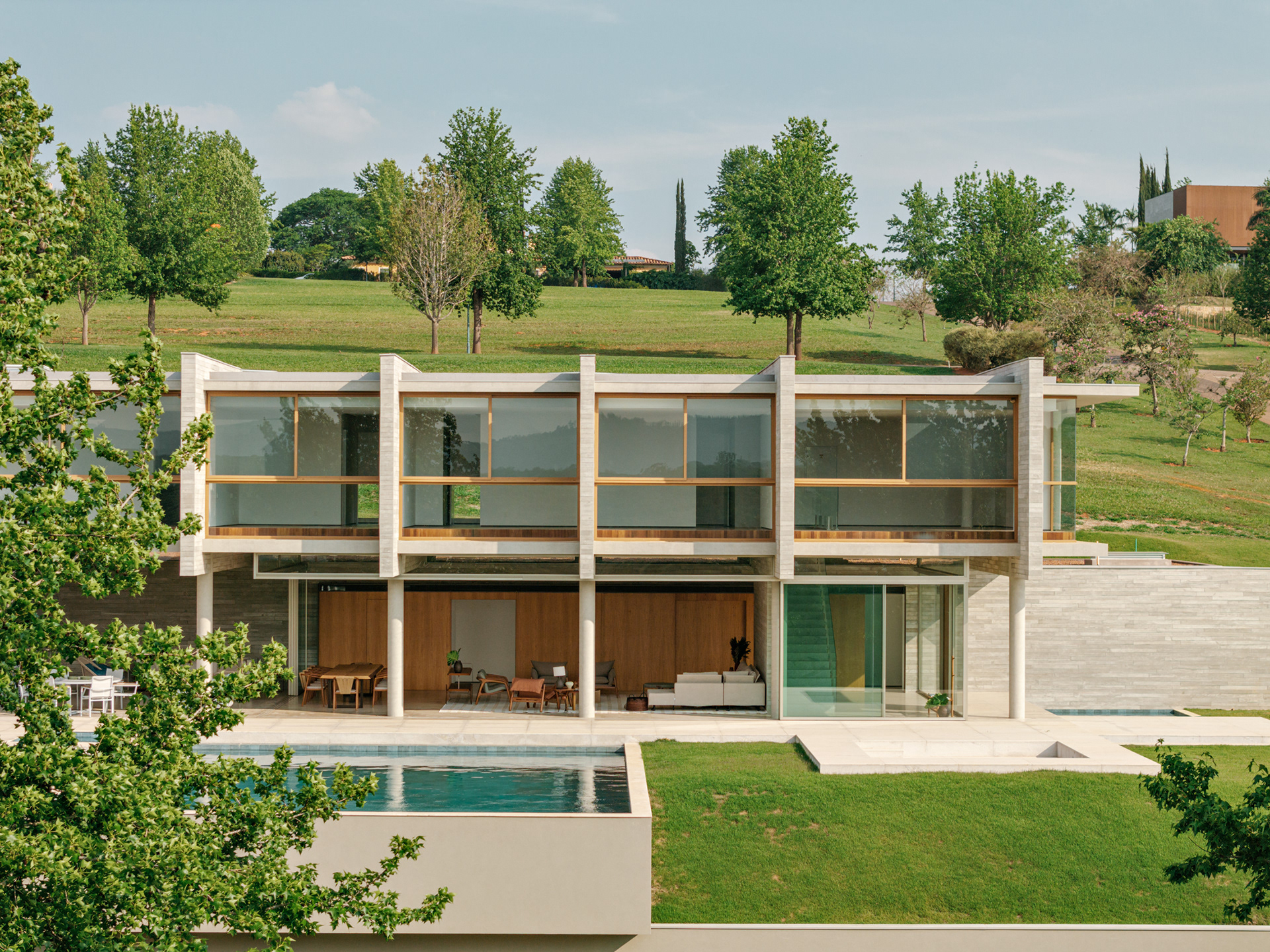 O extenso programa de mais de 1000 m2 é disposto em dois pavimentos de forma linear, sendo o térreo primordialmente social e de serviços - contando ainda com dois quartos de hóspedes - e o superior basicamente reservado à área íntima da residência. Todos os principais cômodos da casa ficam voltados para a vista principal do lote, para a piscina e para a fazenda lindeira.