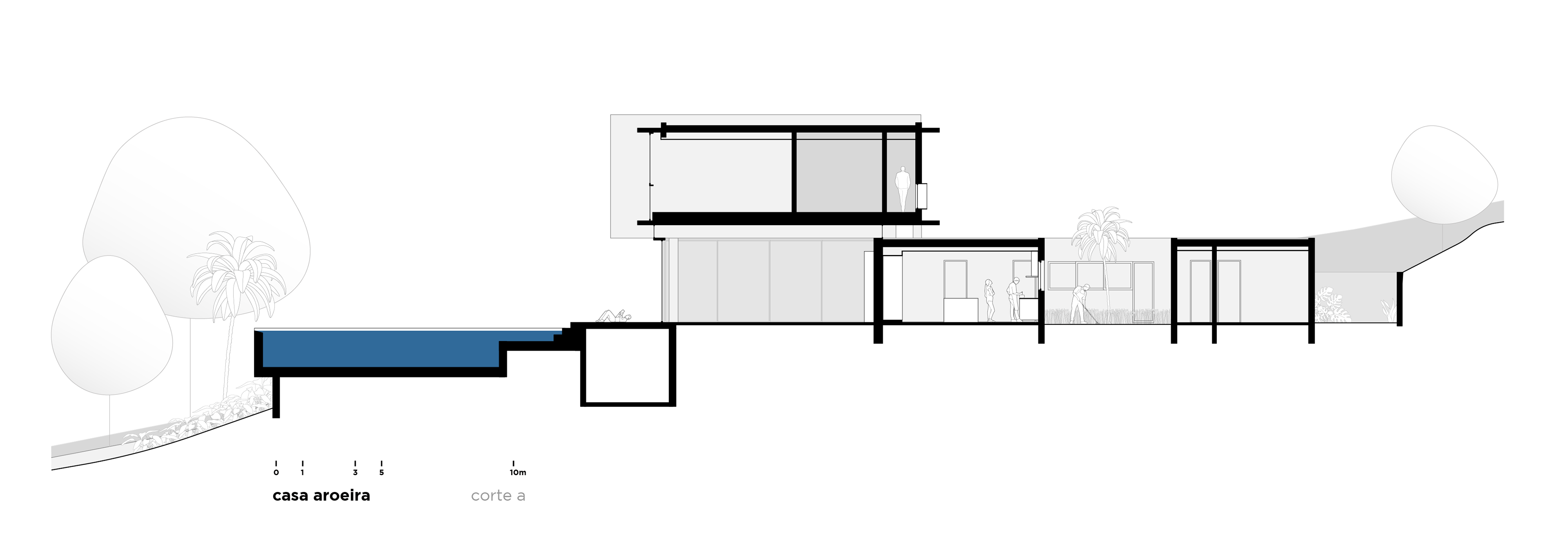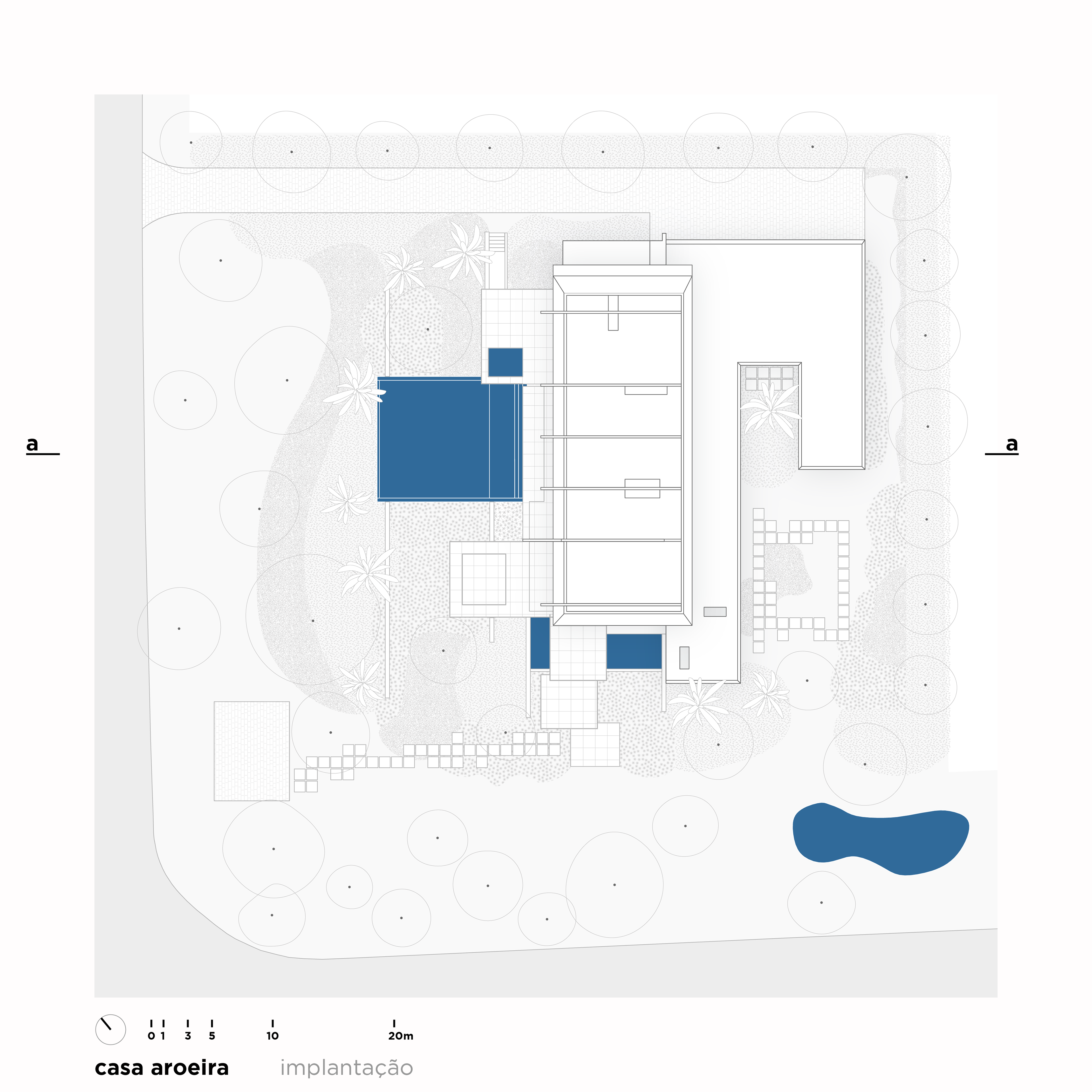 O projeto para a Casa Aroeira parte da observação das características do terreno inclinado, na esquina de uma quadra dentro de um condomínio fechado no interior de São Paulo e voltado para uma vista exuberante para a melhor implantação da residência no lote. Devido à acentuada inclinação do terreno, a casa é disposta em sua porção superior, proporcionando as melhores visuais e faz uso da esquina para possibilitar um acesso em nível para os pedestres pela rua lateral ao mesmo tempo em que os carros acessam a garagem através da rua inferior.