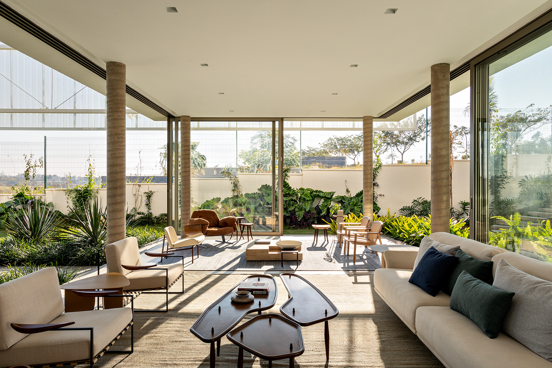 Para solucionar o extenso programa solicitado pelo cliente, optamos por criar um arrimo e um grande platô social no nível inferior ao do acesso, garantindo privacidade, ao mesmo tempo que o volume dos quartos poderia ter ampla vista no sentido norte/sul, para ambos os lados. Esta organização possibilitou a sala de estar totalmente em vidro, rodeada por jardins, enquanto a cozinha, sala de jantar e espaço de confraternização se encontram no extremo norte do terreno junto à piscina.