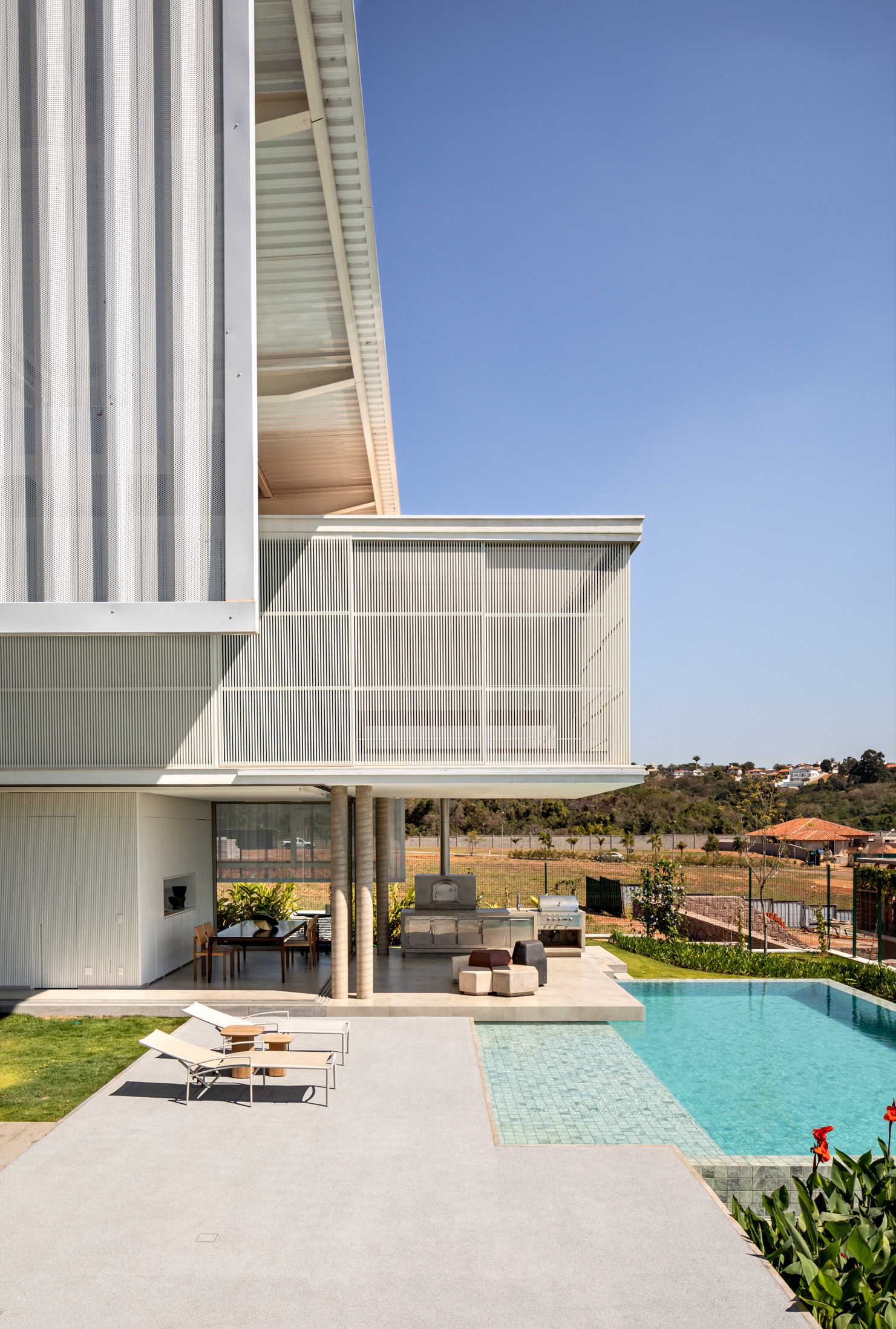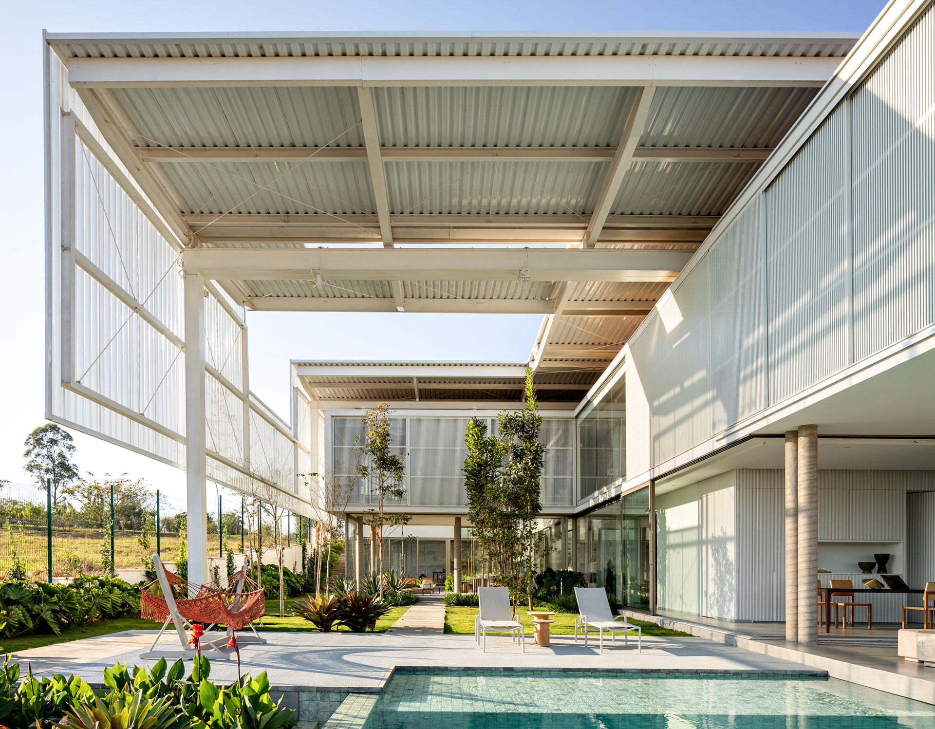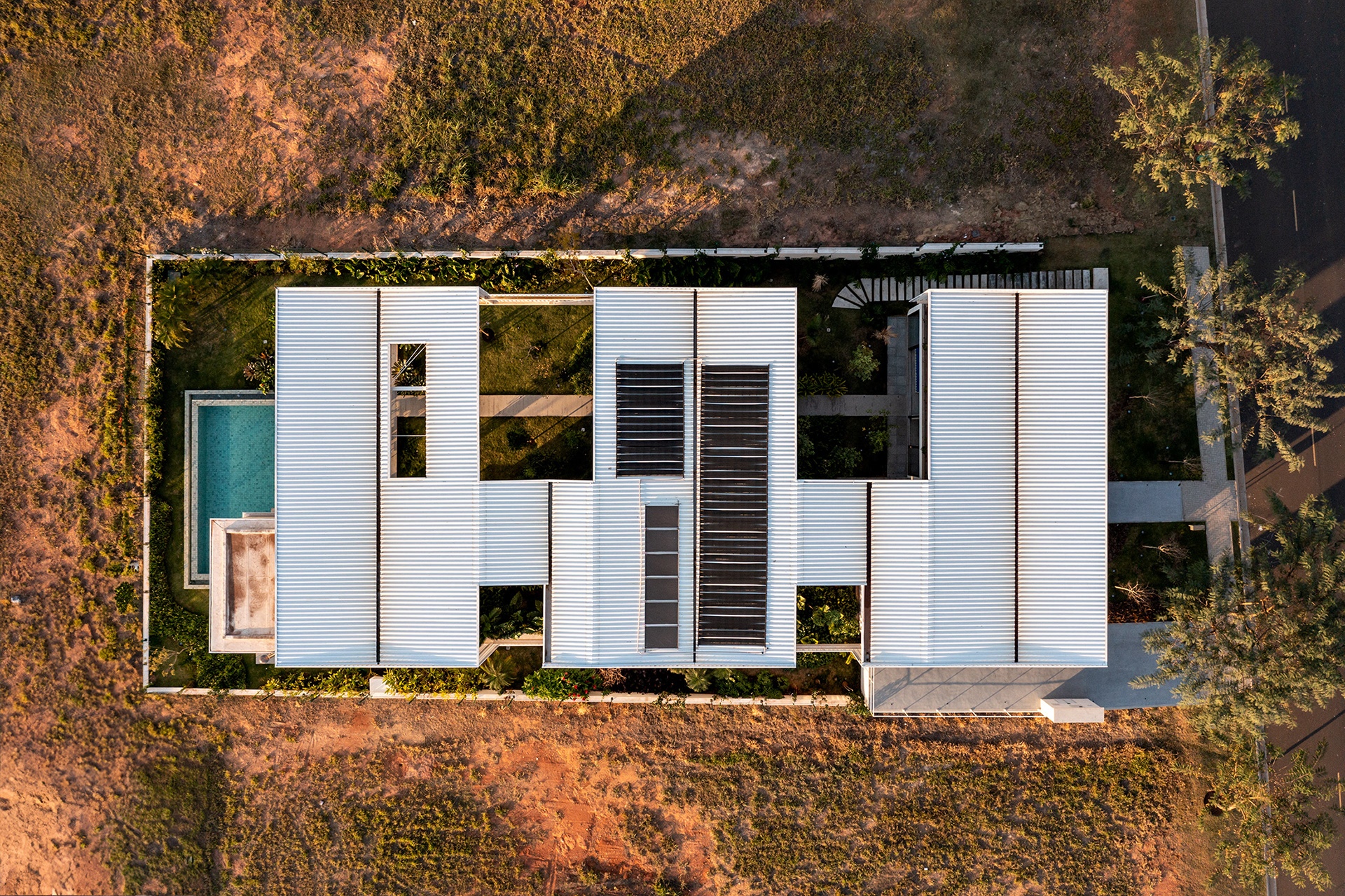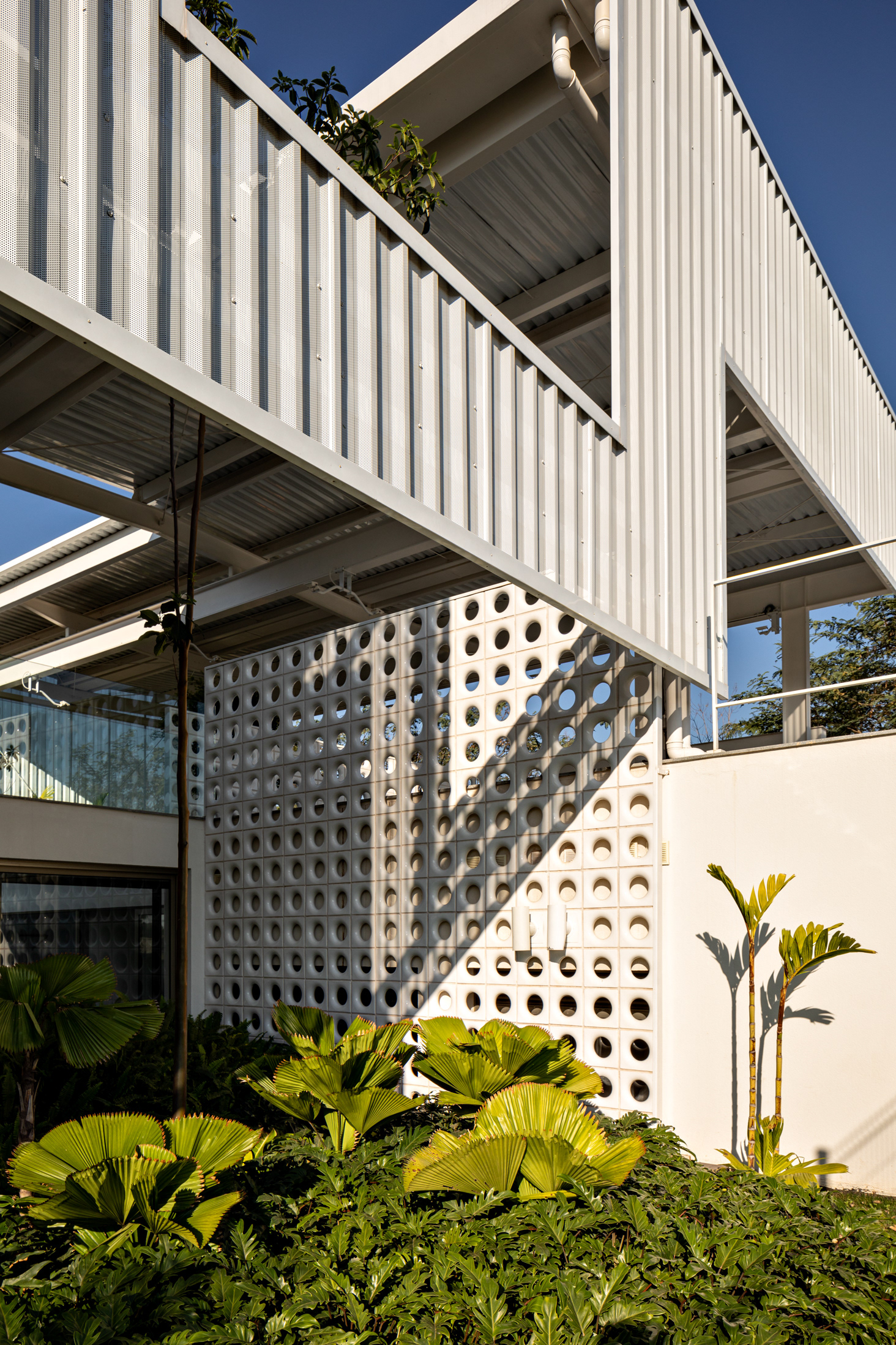 Considerando que o local é muito quente, na maior parte do ano, optamos por criar uma segunda cobertura em telhas metálicas, ora sanduíches isolantes (cobertura), ora telhas metálicas perfuradas (planos laterais) que funcionasse como uma sobrecapa em trechos íntimos da residência e como cobertura da garagem, acesso e espaços avarandados.