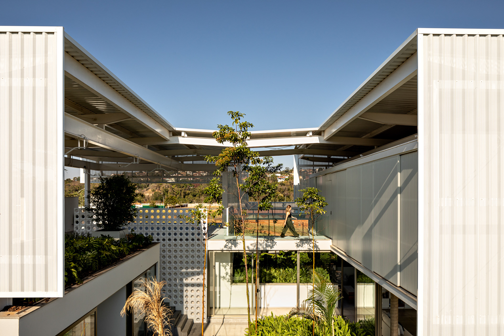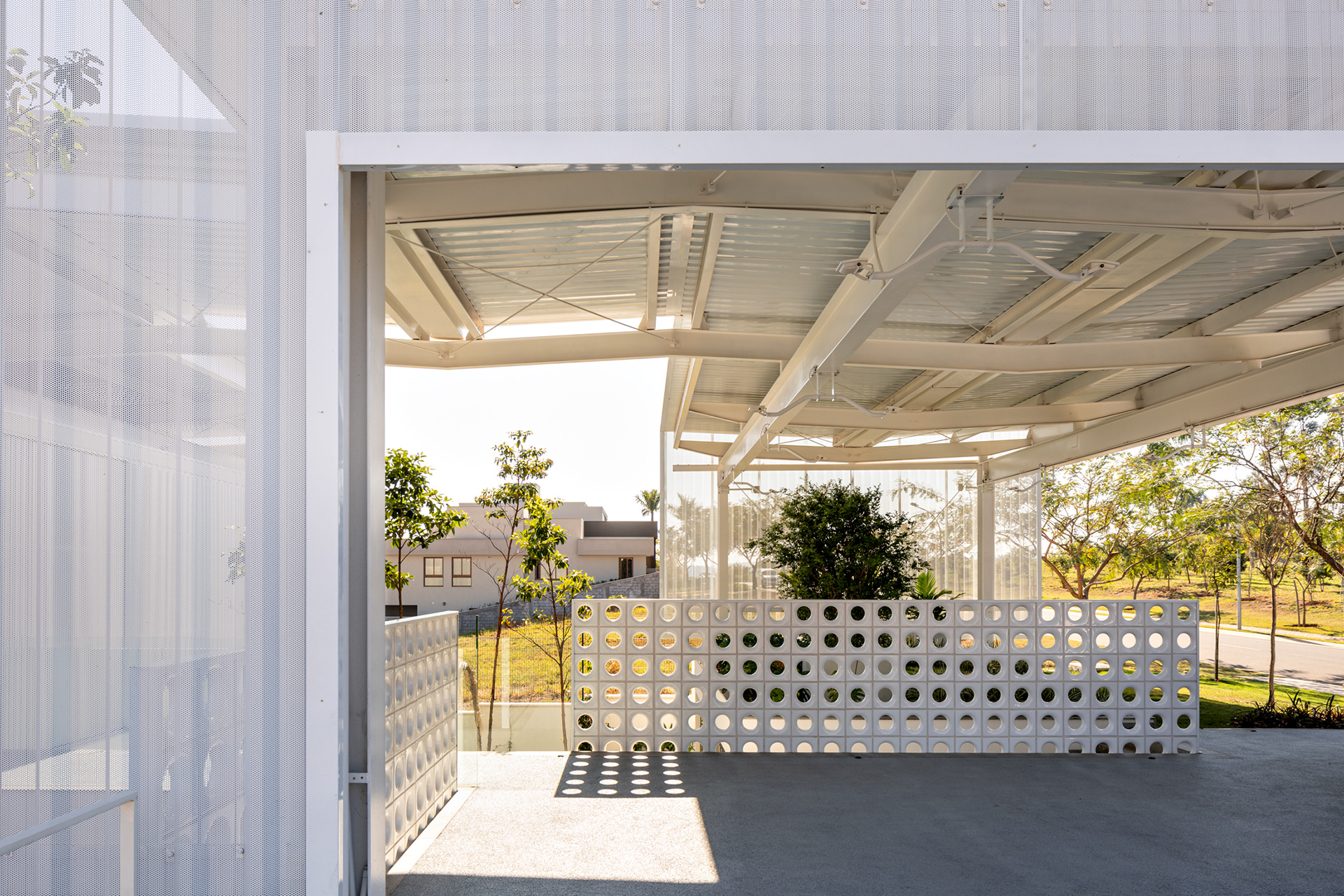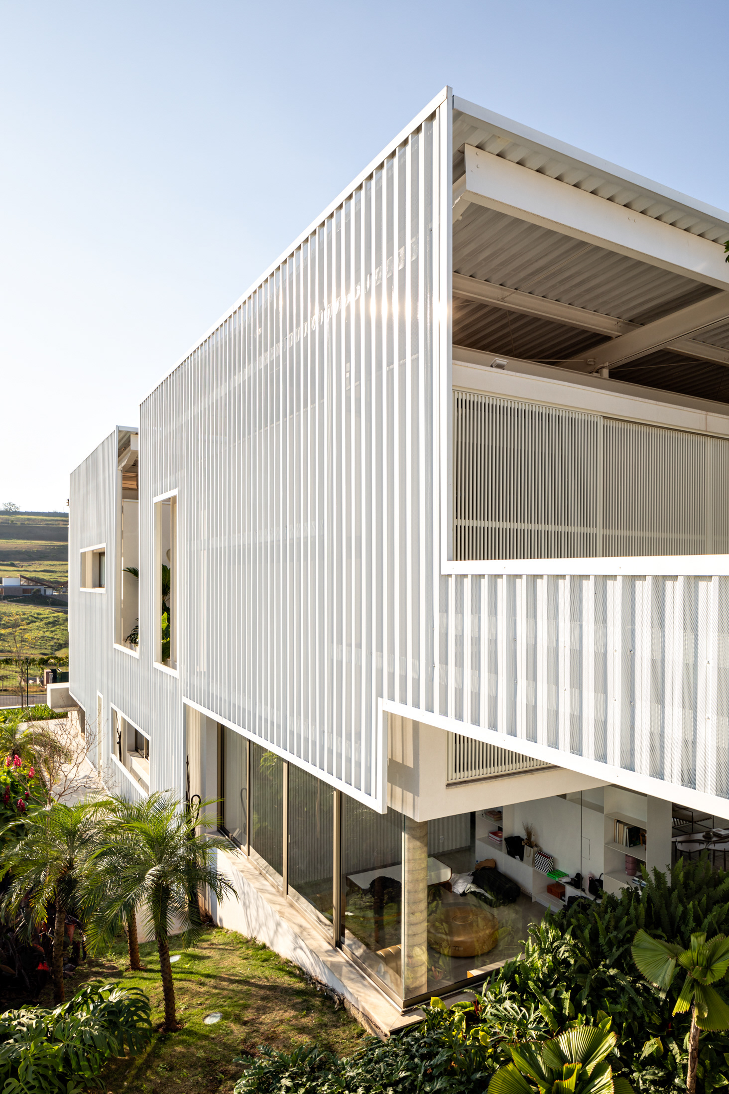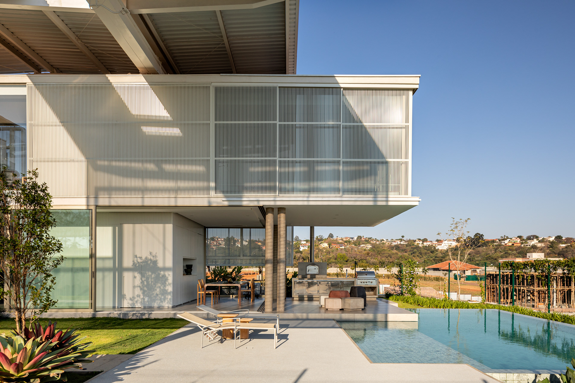 Considerando que o local é muito quente, na maior parte do ano, optamos por criar uma segunda cobertura em telhas metálicas, ora sanduíches isolantes (cobertura), ora telhas metálicas perfuradas (planos laterais) que funcionasse como uma sobrecapa em trechos íntimos da residência e como cobertura da garagem, acesso e espaços avarandados.