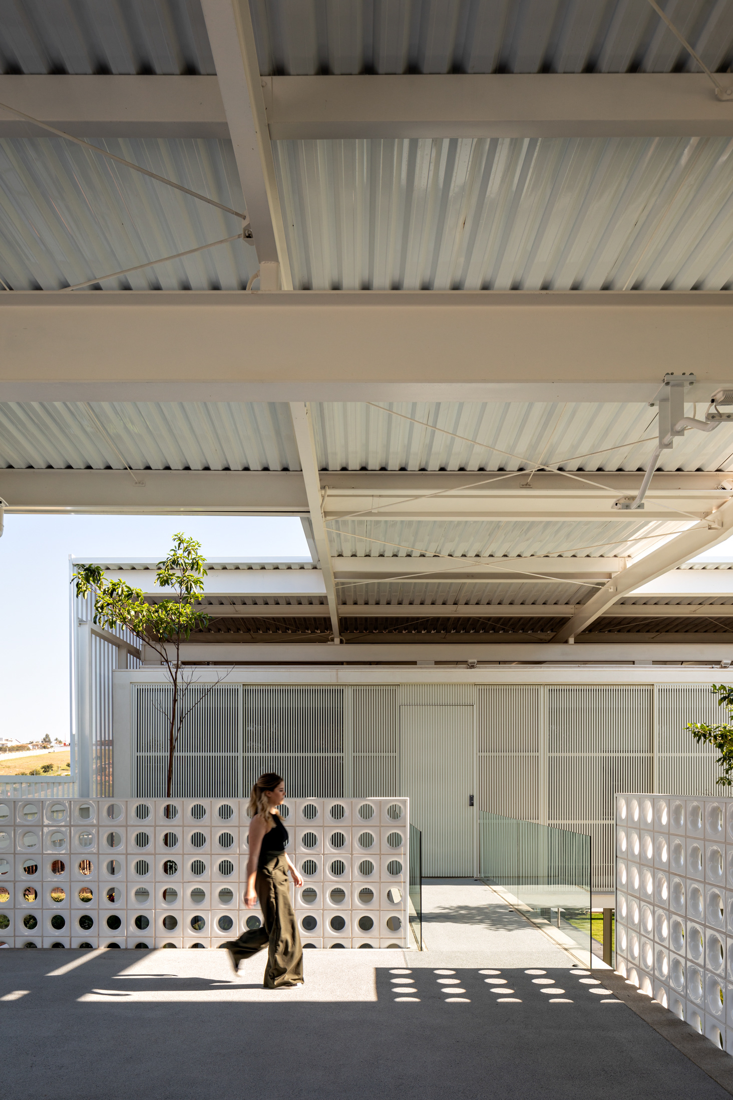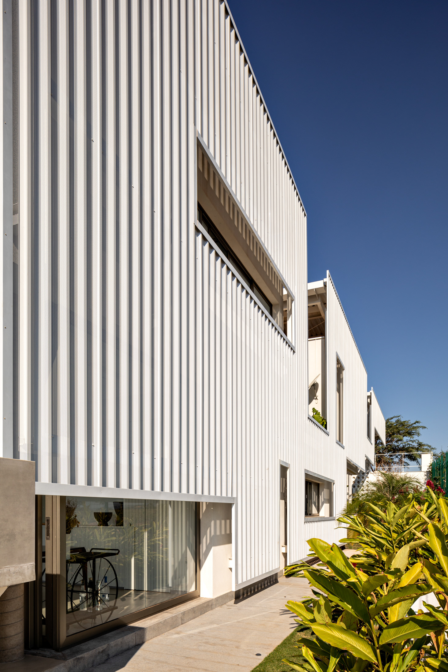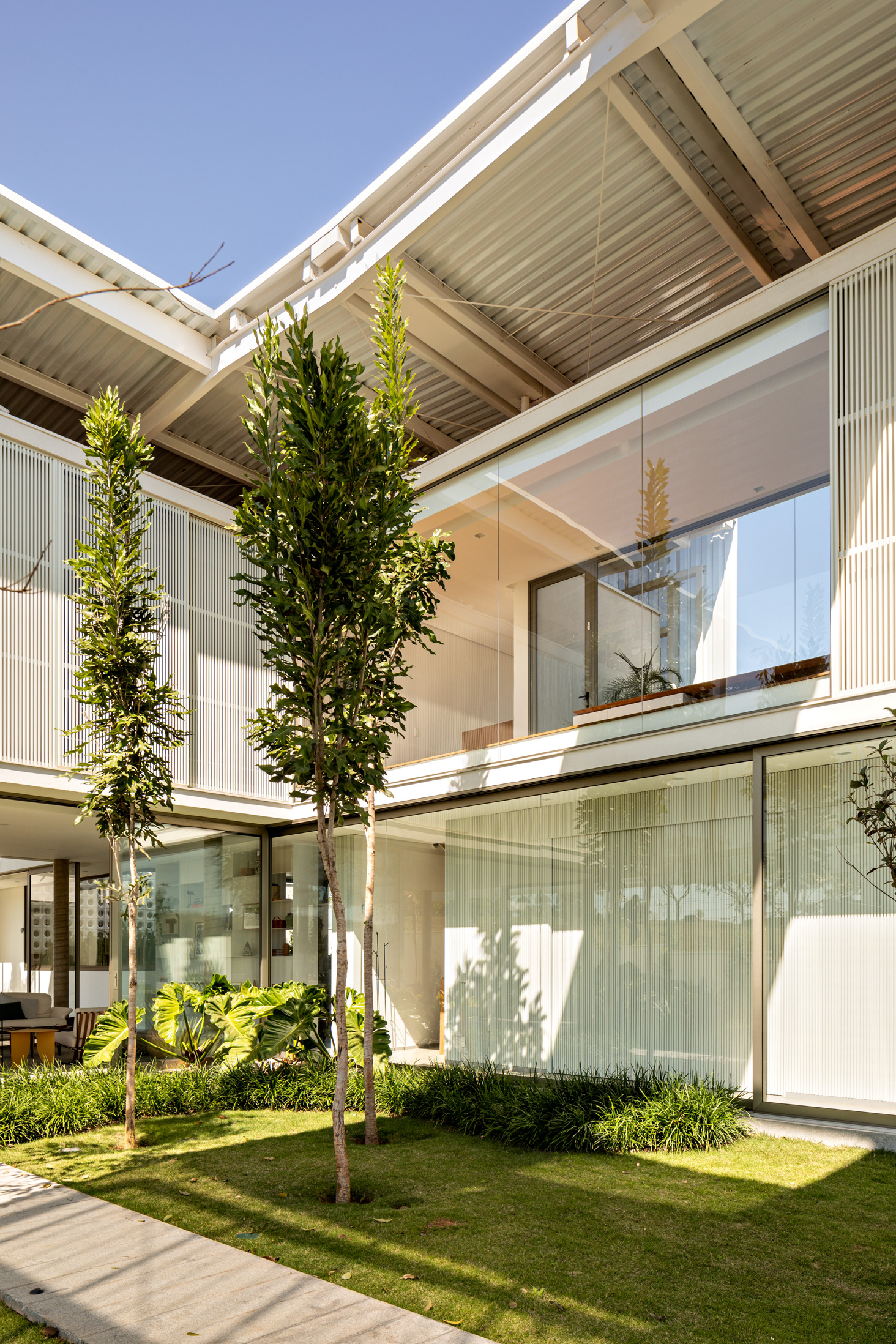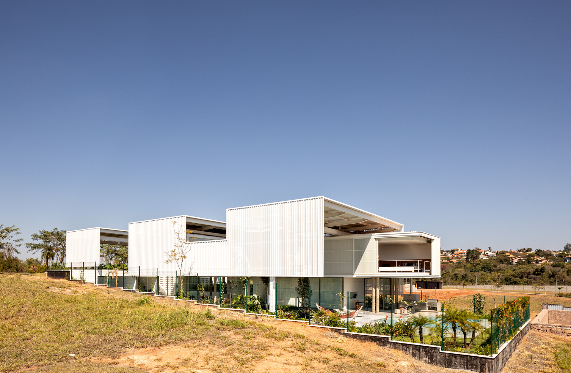Considerando que o local é muito quente, na maior parte do ano, optamos por criar uma segunda cobertura em telhas metálicas, ora sanduíches isolantes (cobertura), ora telhas metálicas perfuradas (planos laterais) que funcionasse como uma sobrecapa em trechos íntimos da residência e como cobertura da garagem, acesso e espaços avarandados.