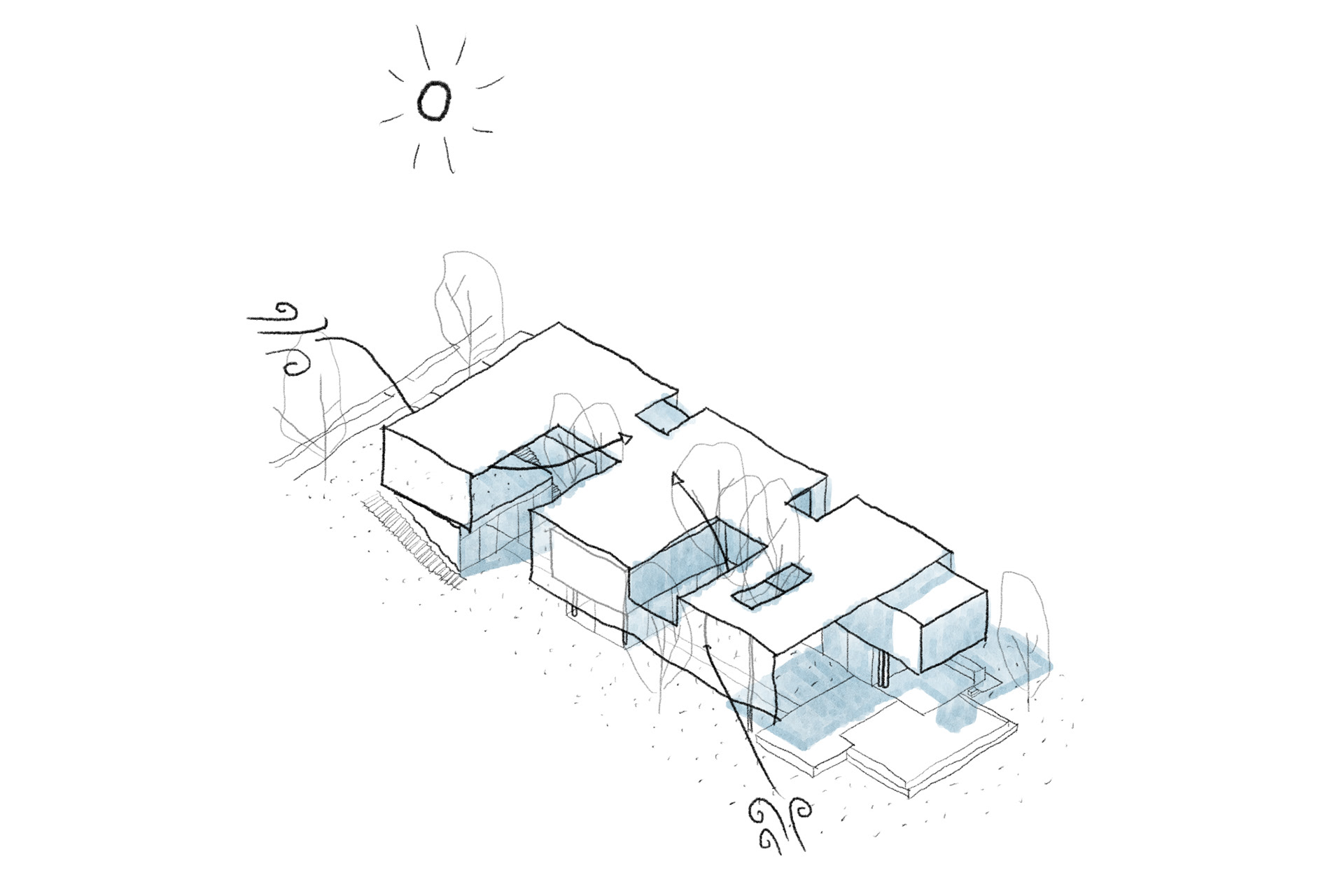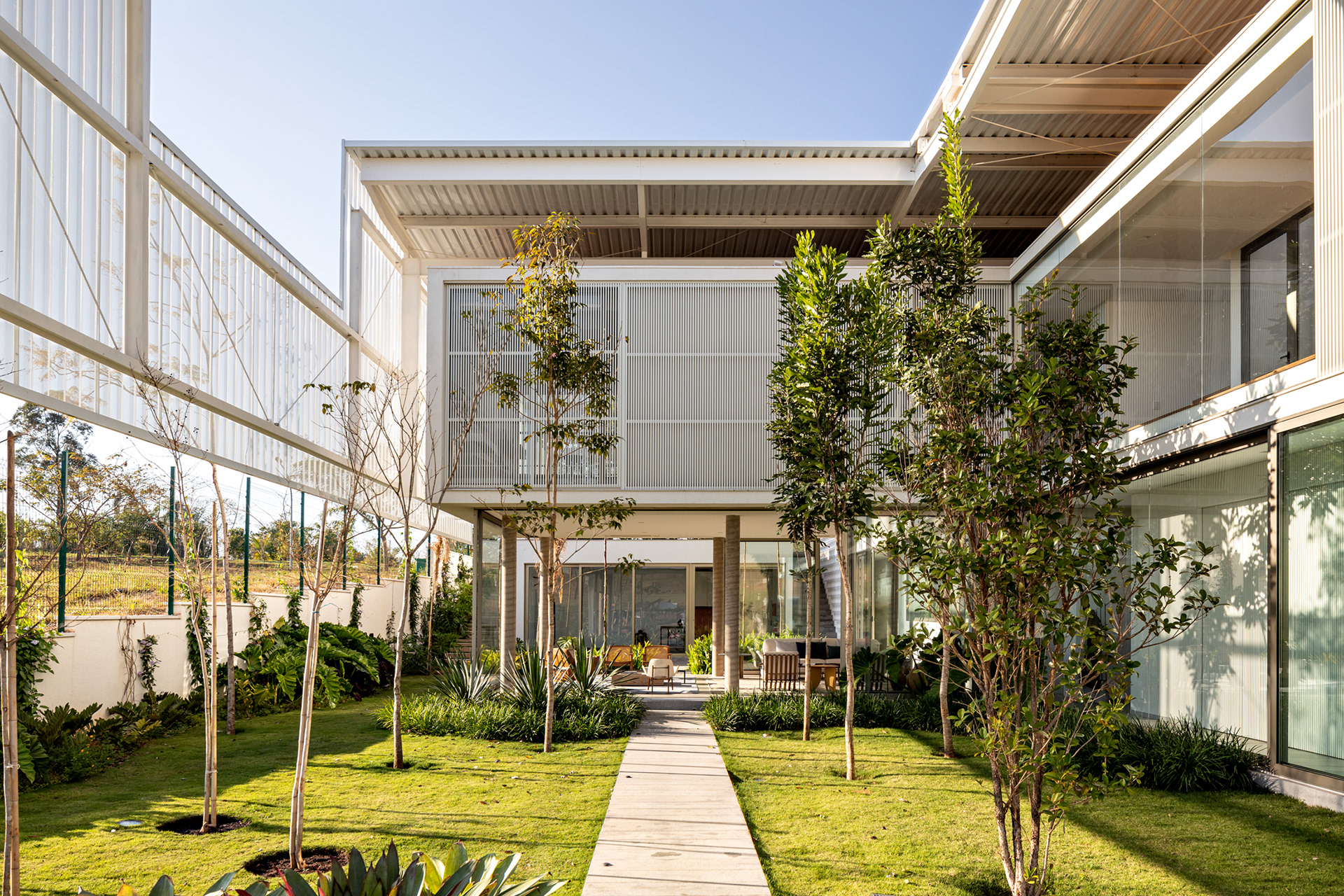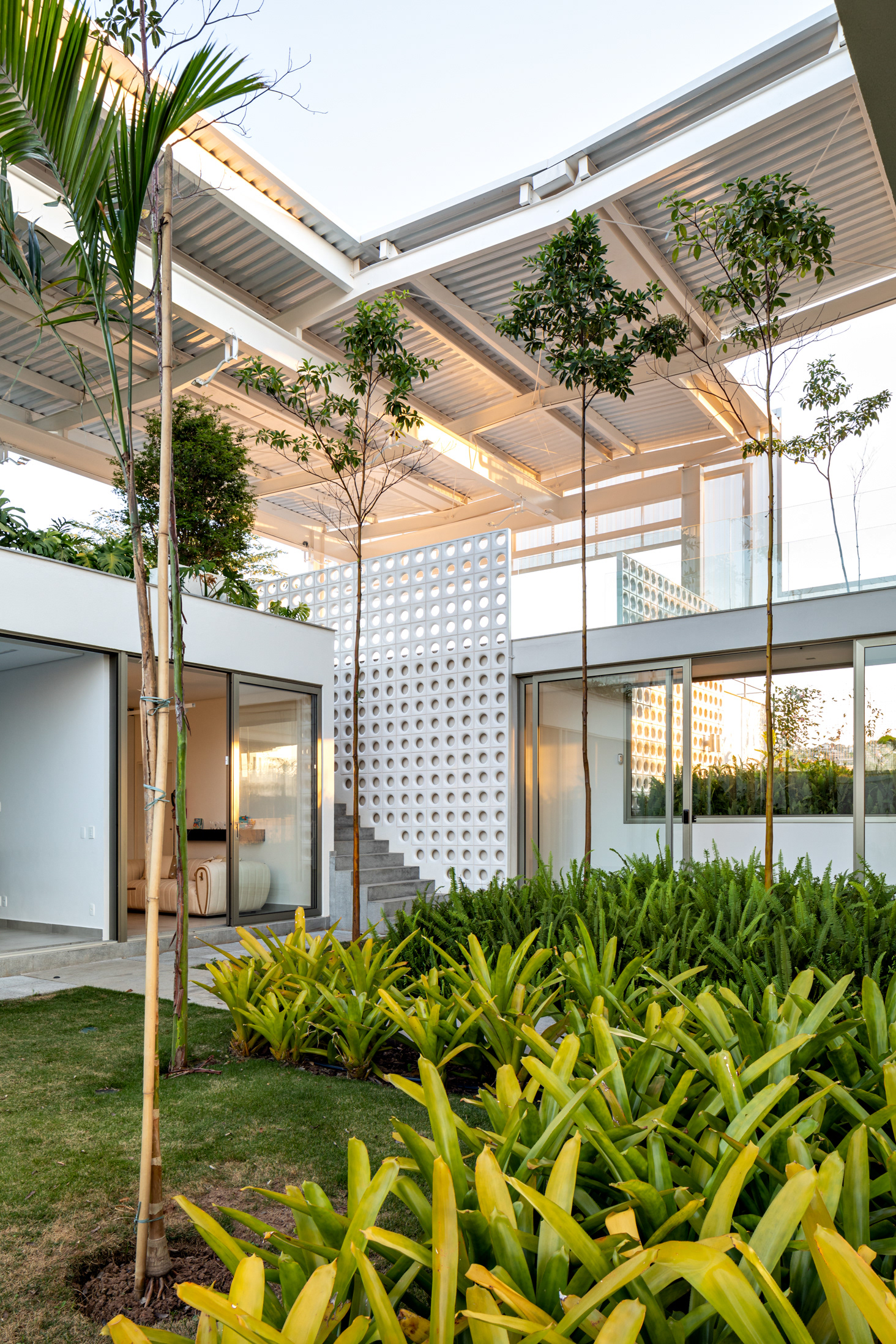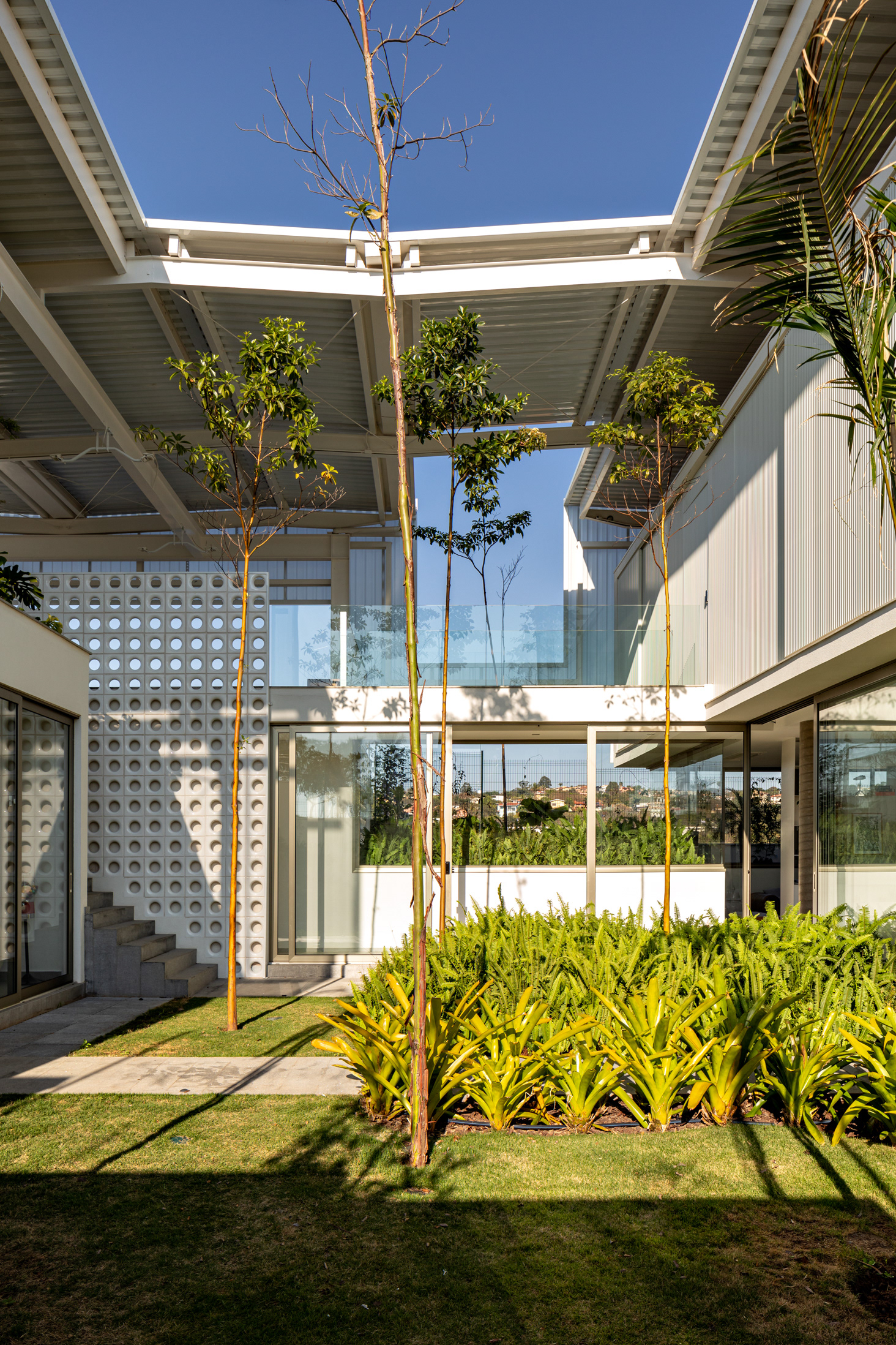 As generosas aberturas dos espaços sociais e íntimos, brises em ripas de alumínio dos quartos, espaço entre coberturas ventilados, rasgos na cobertura metálica para efeito chaminé, e o uso intenso de jardins em meio a casa (paisagismo de Juliana Freitas) aliados ao uso de placas fotovoltaicas, aquecimento solar, reuso de água de chuva e iluminação artificial com leds e inteligência de consumo (projeto de Marcos Castilha, lighting designer) funcionam como um sistema de sustentabilidade intimamente ligado à setorização e investigação de entre espaços que a arquitetura desejava realizar neste projeto.