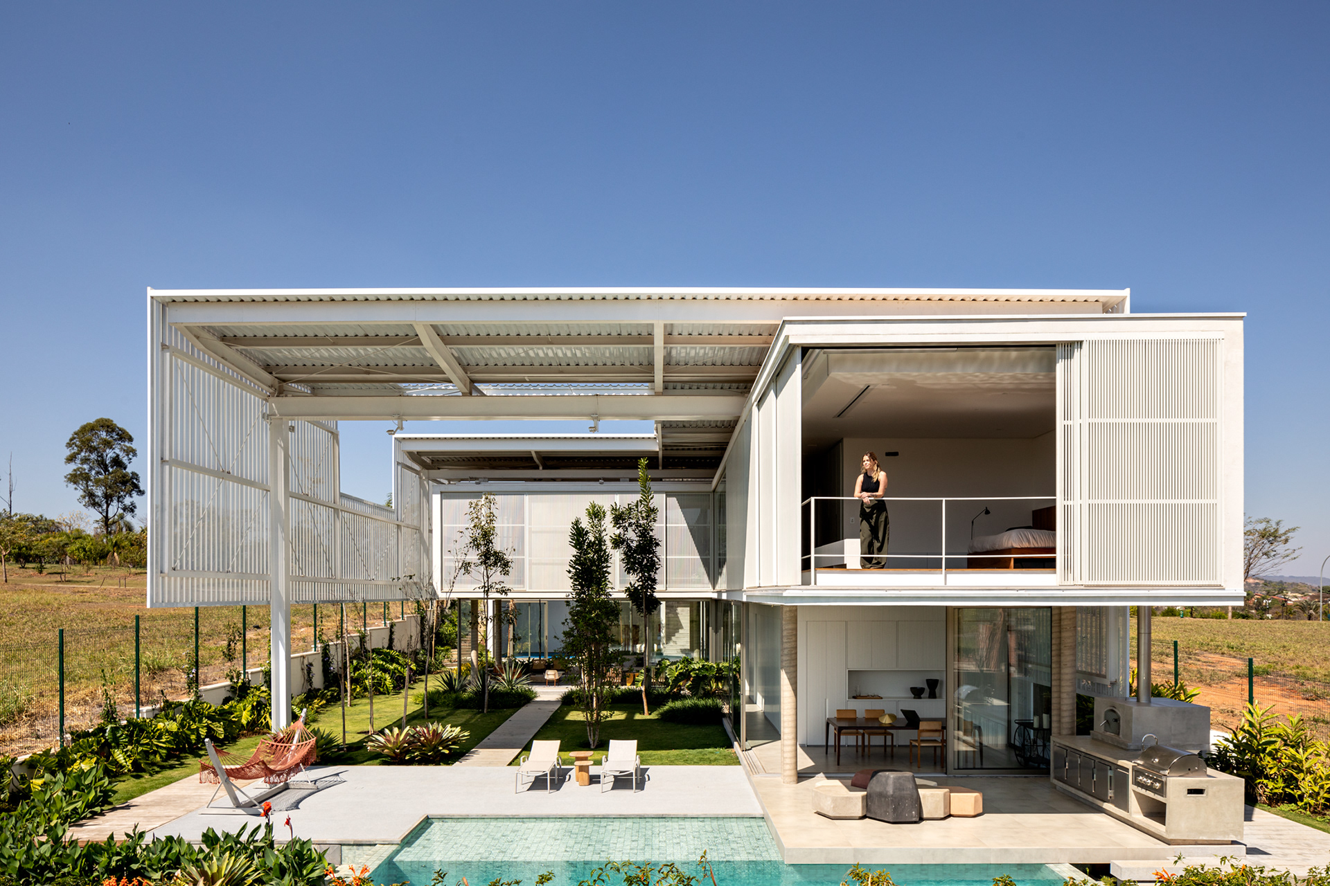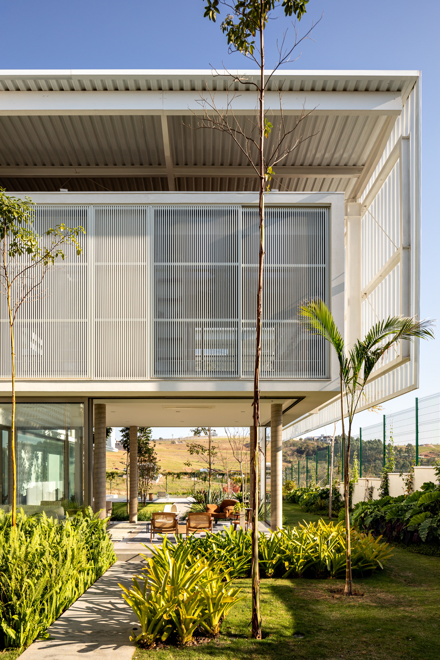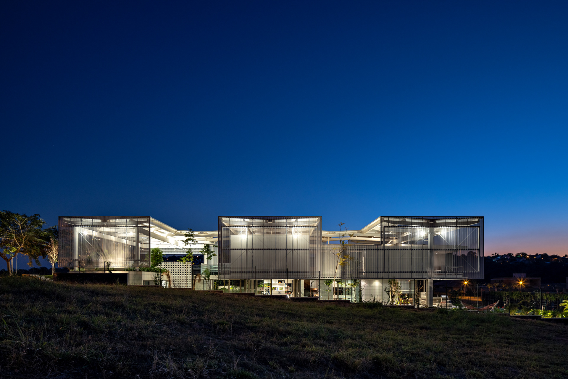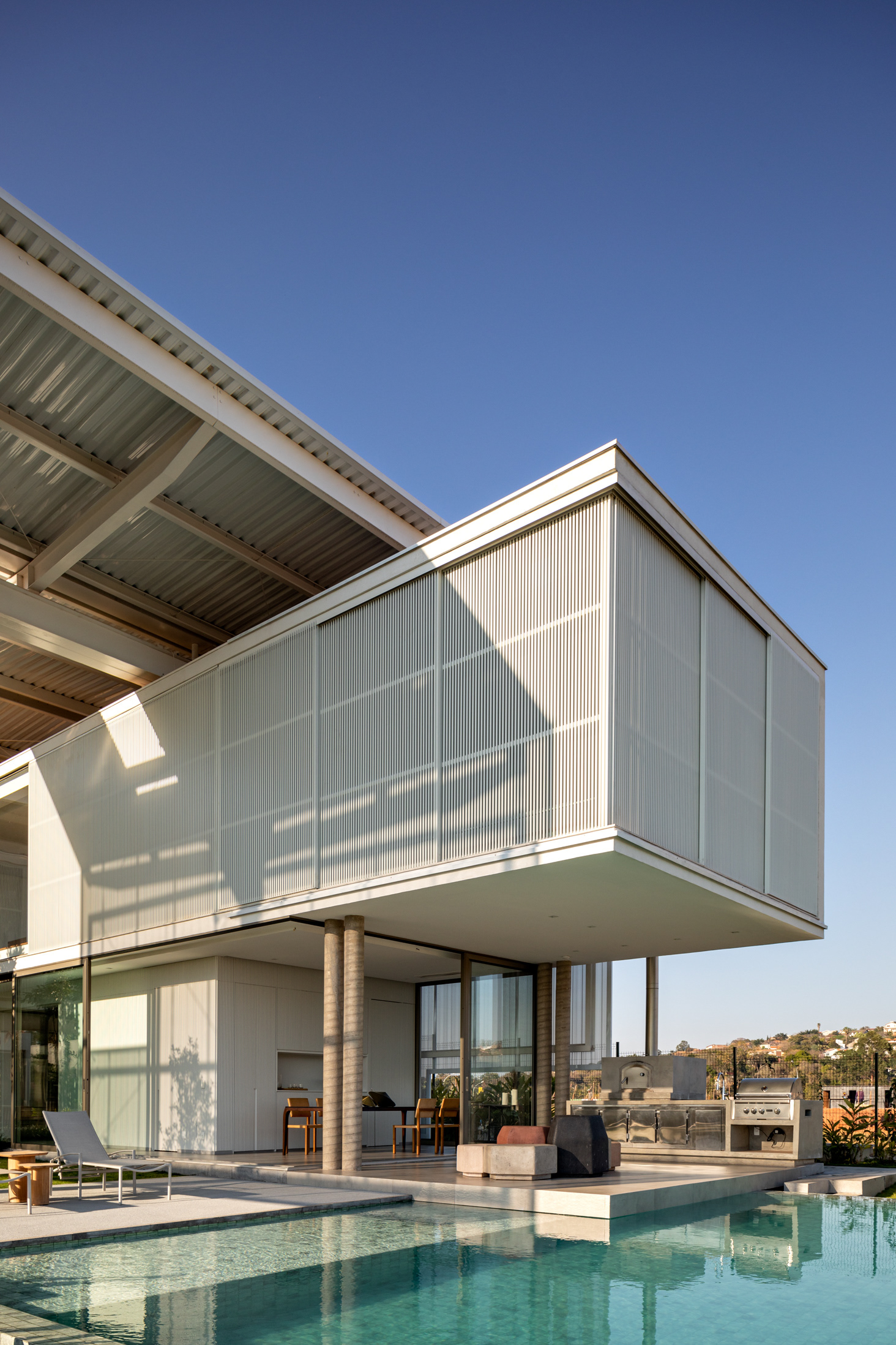 As laterais, perfuradas, funcionam como um véu – de dia sombreiam e permitem que o usuário veja através dessa barreira, e impedem a visualização de fora para dentro, conformando um monólito flutuando sobre o terreno na percepção externa. À noite, com a iluminação artificial interna da residência, o efeito se inverte e a casa surge diáfana, transparente.