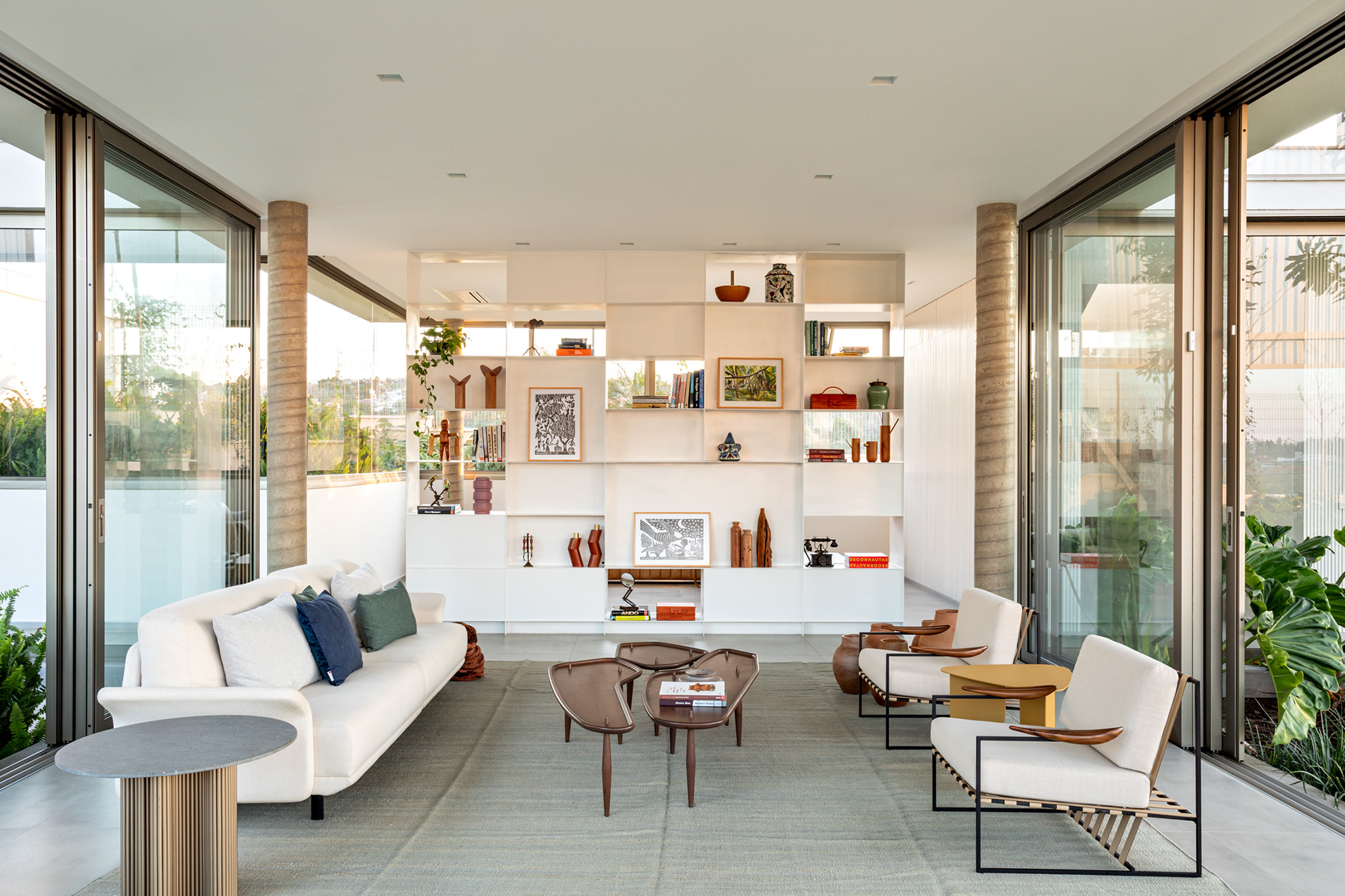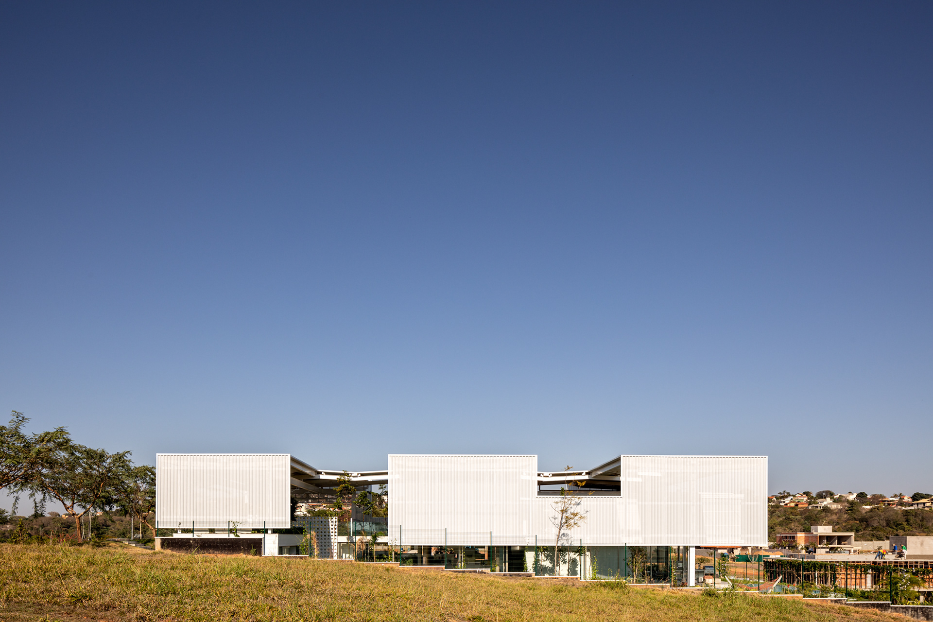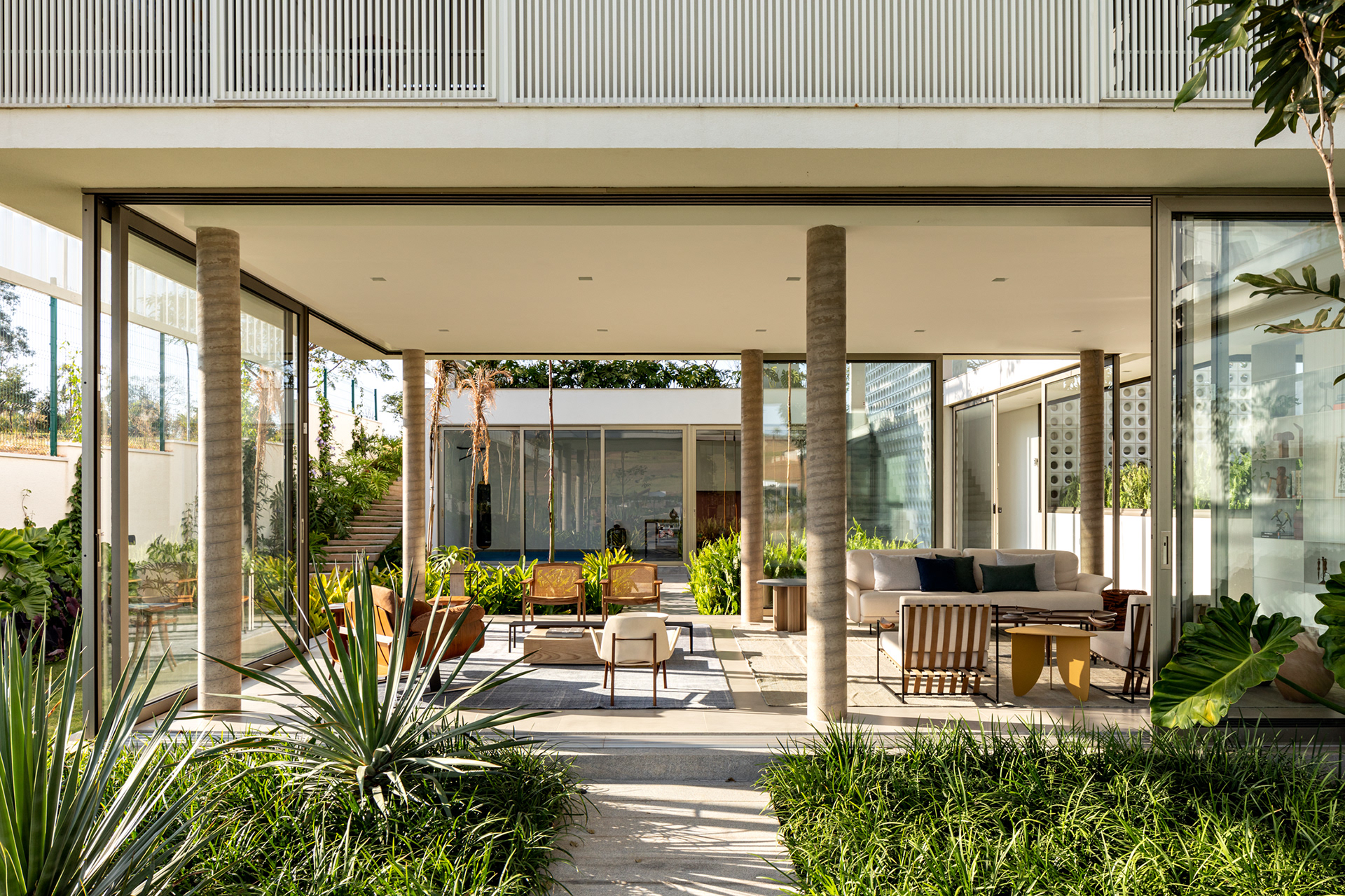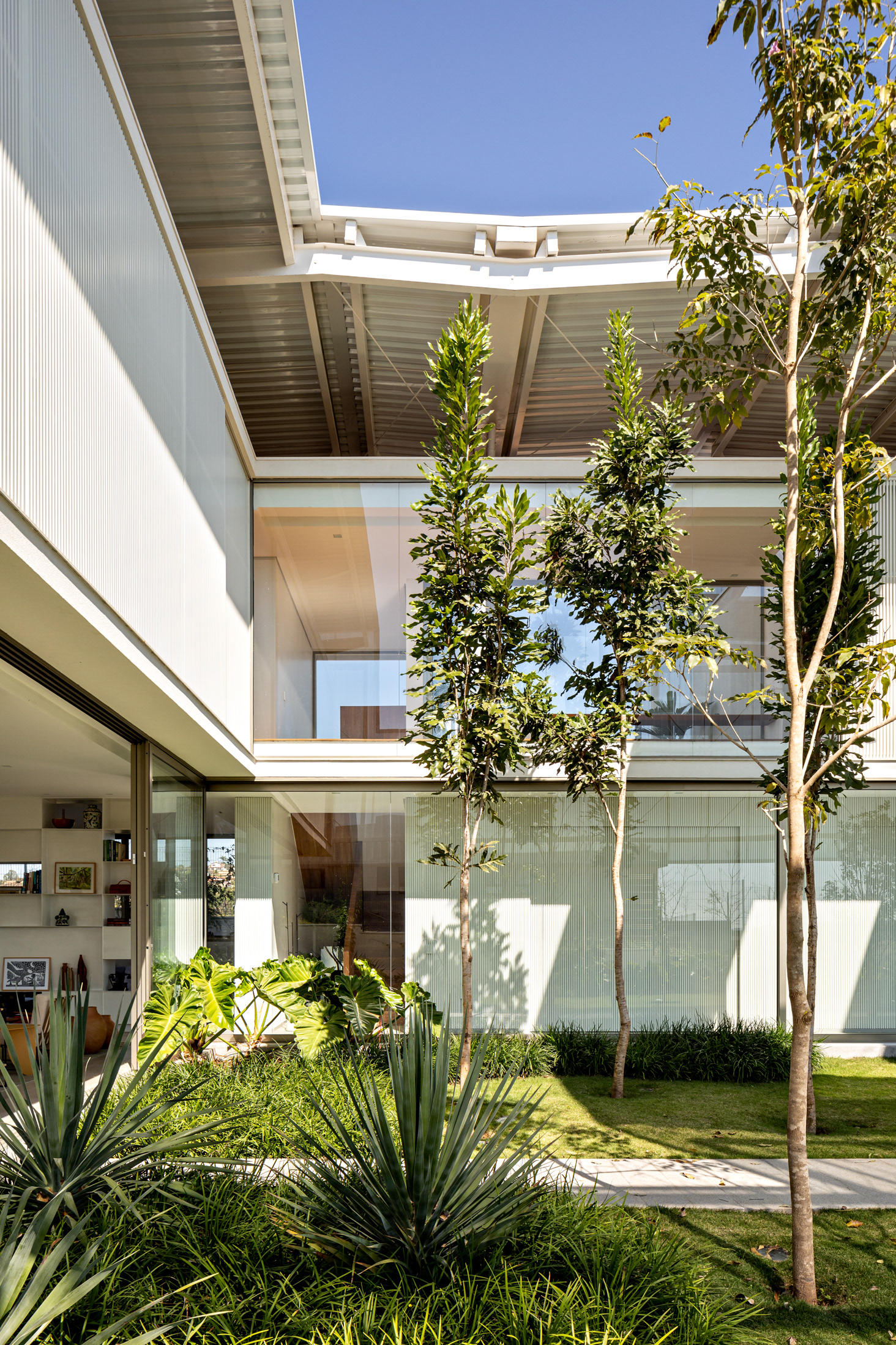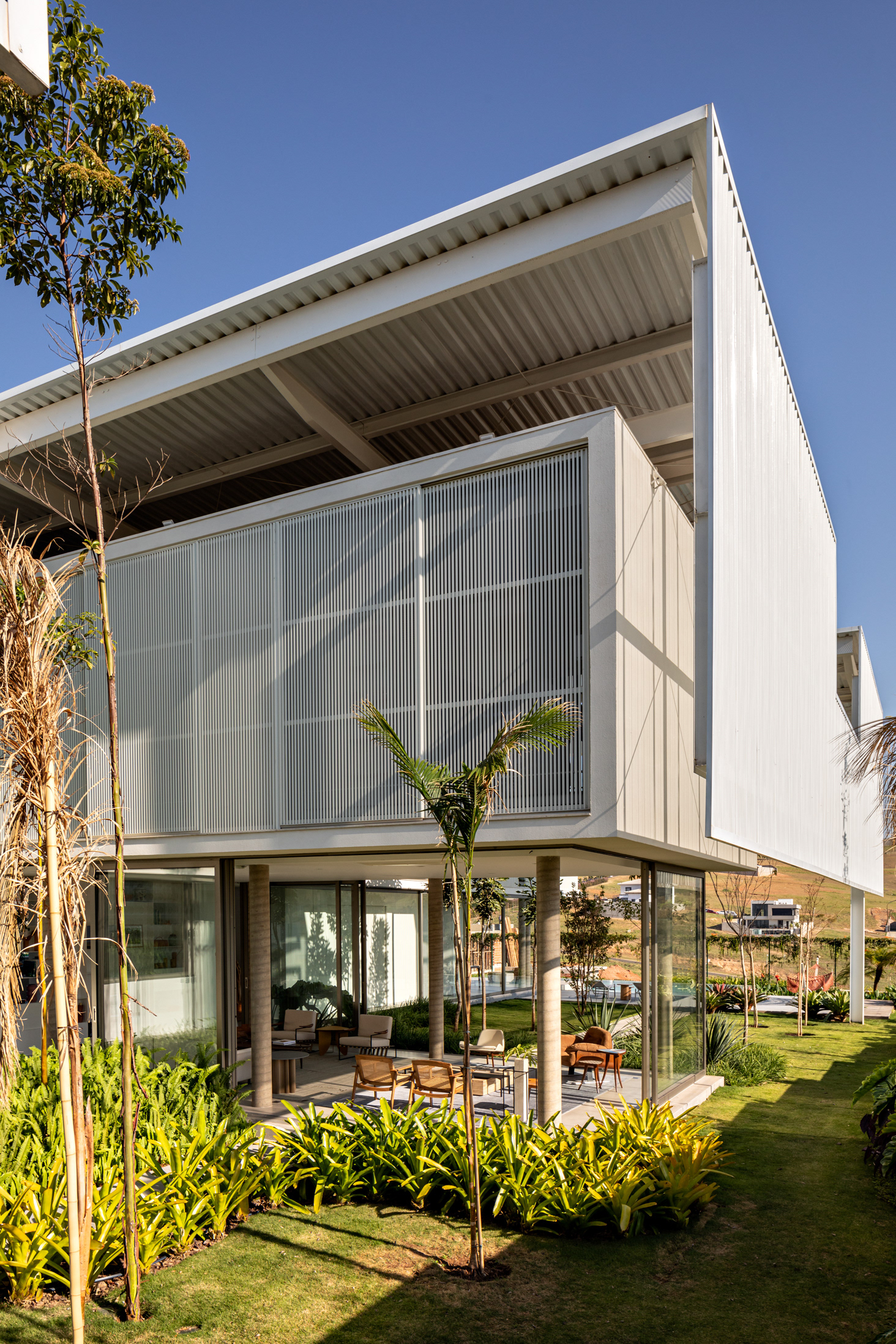 As laterais, perfuradas, funcionam como um véu – de dia sombreiam e permitem que o usuário veja através dessa barreira, e impedem a visualização de fora para dentro, conformando um monólito flutuando sobre o terreno na percepção externa. À noite, com a iluminação artificial interna da residência, o efeito se inverte e a casa surge diáfana, transparente.