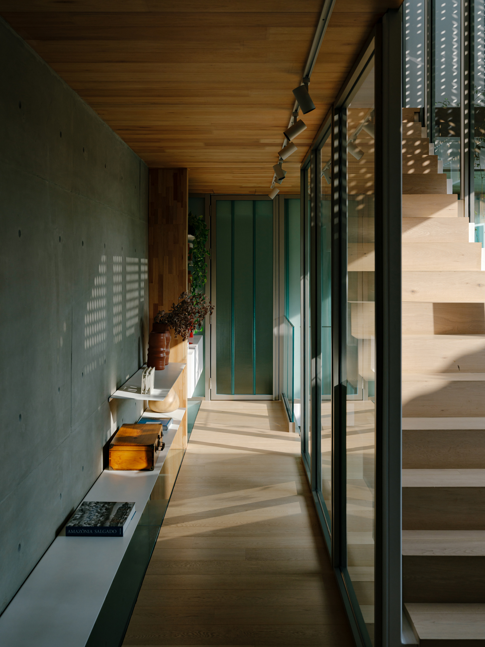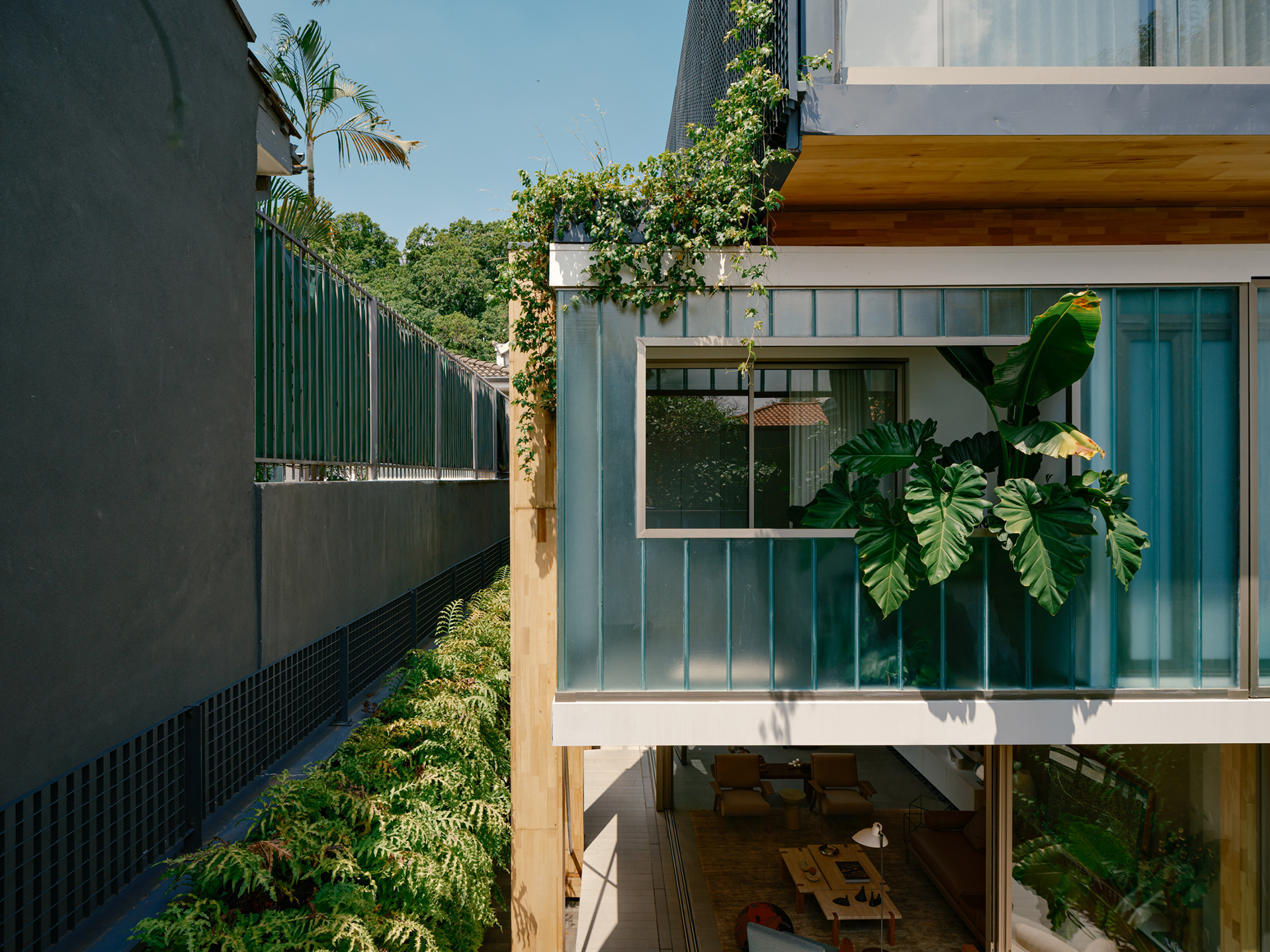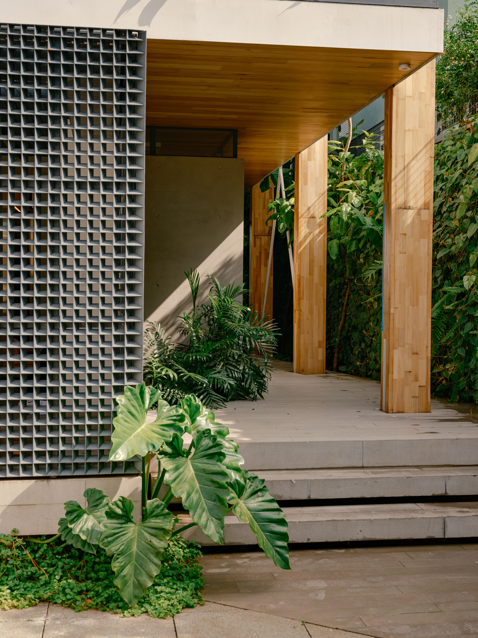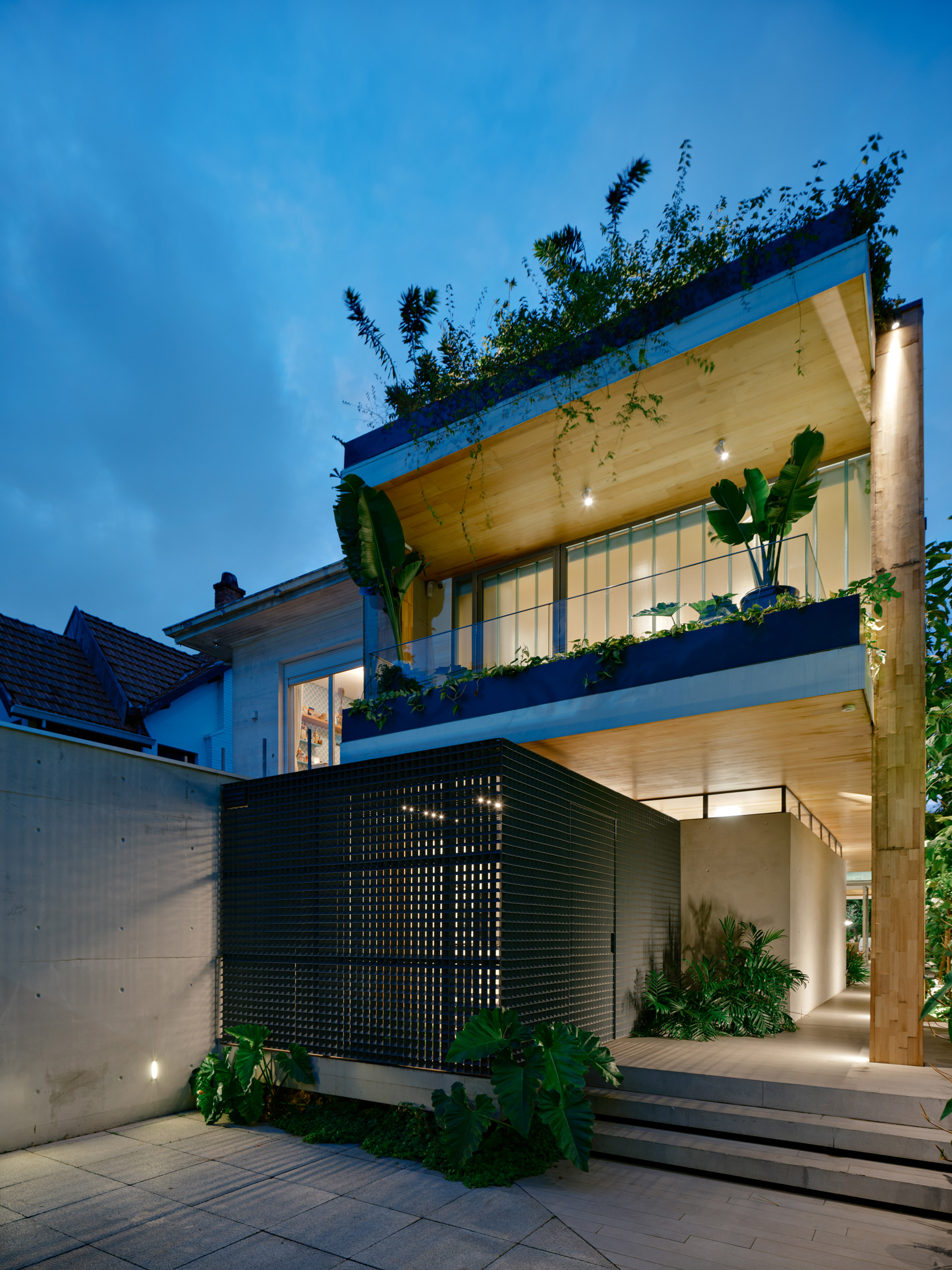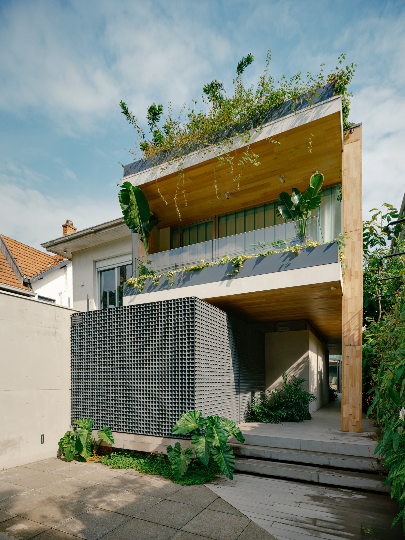 Composta de 3 pavimentos, o último pavimento acomoda um espaço de lazer com um spa na altura das árvores da rua. Protegido da insolação por um cobogó metálico, este pavimento se apoia sobre o pórtico de madeira e constitui um elemento à parte dos dois pavimentos logo abaixo.