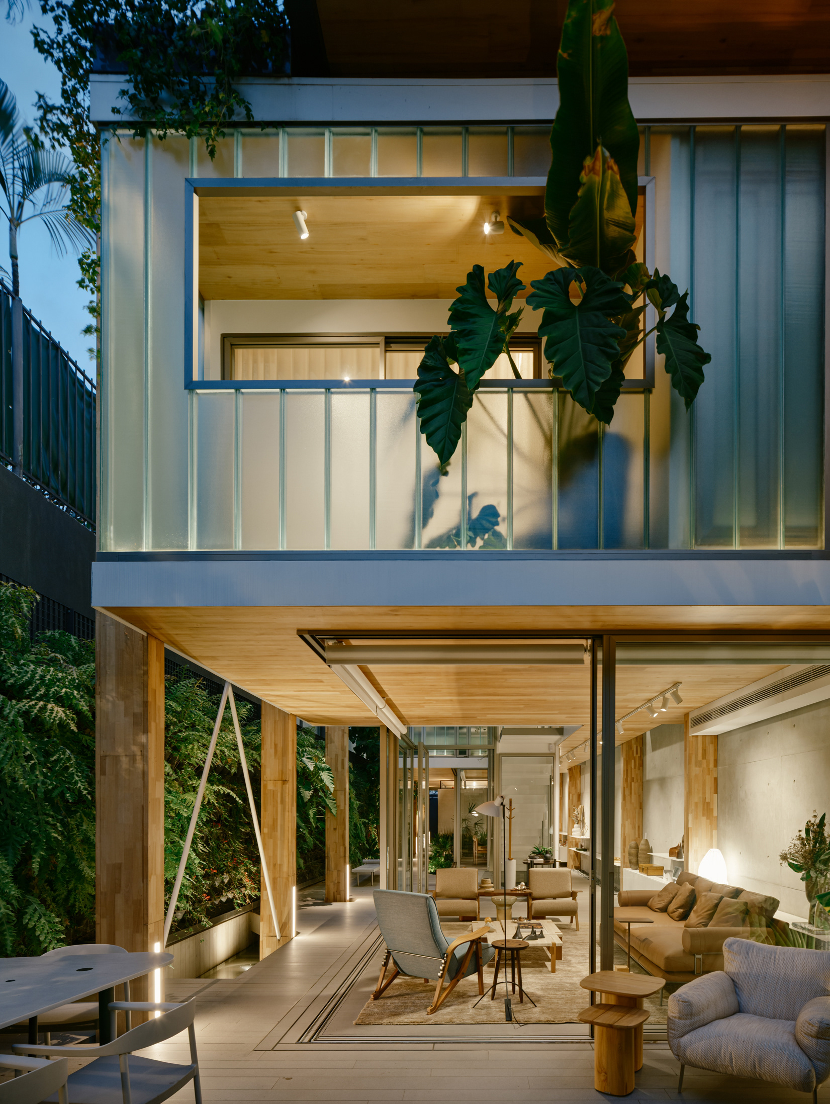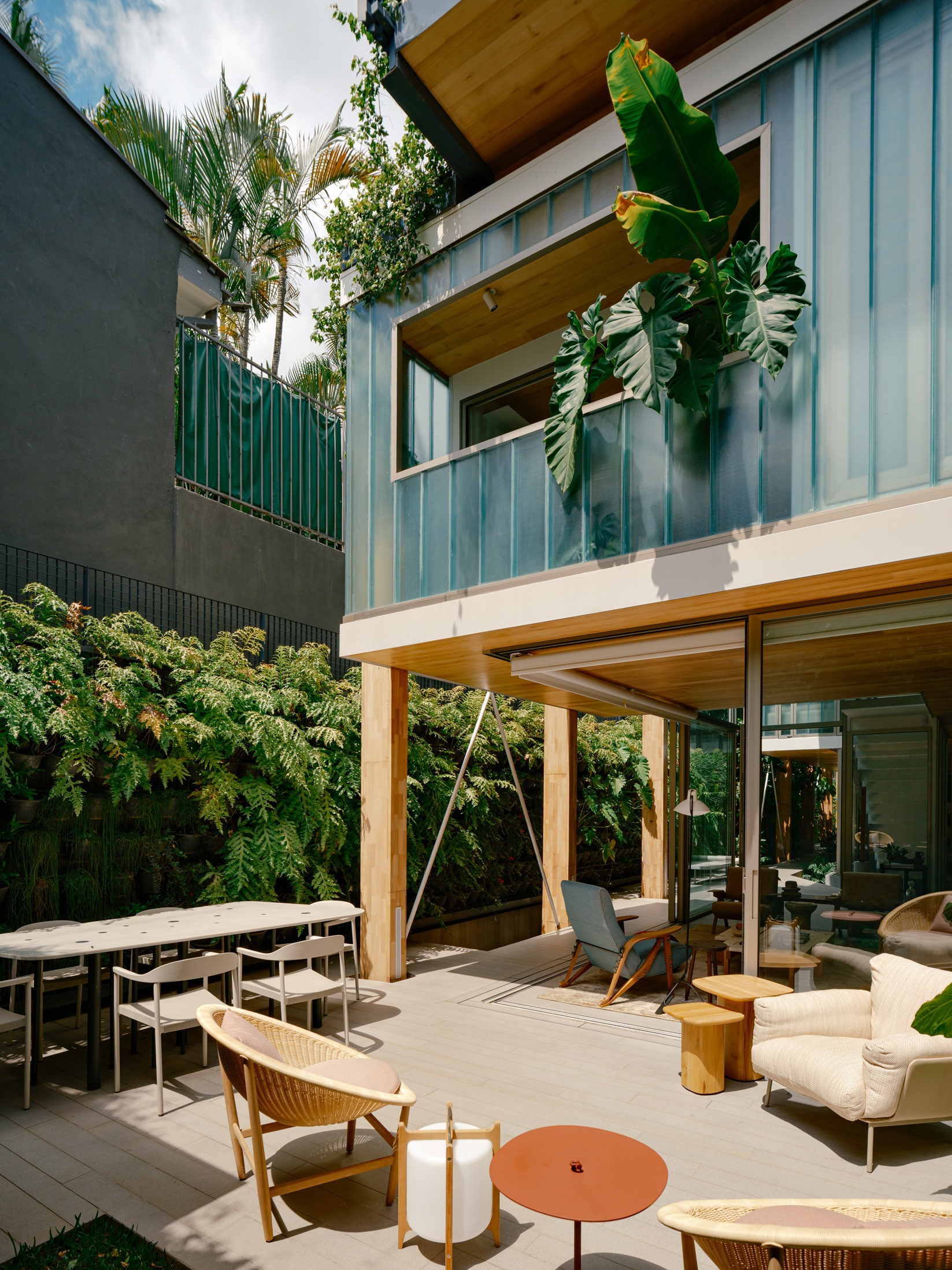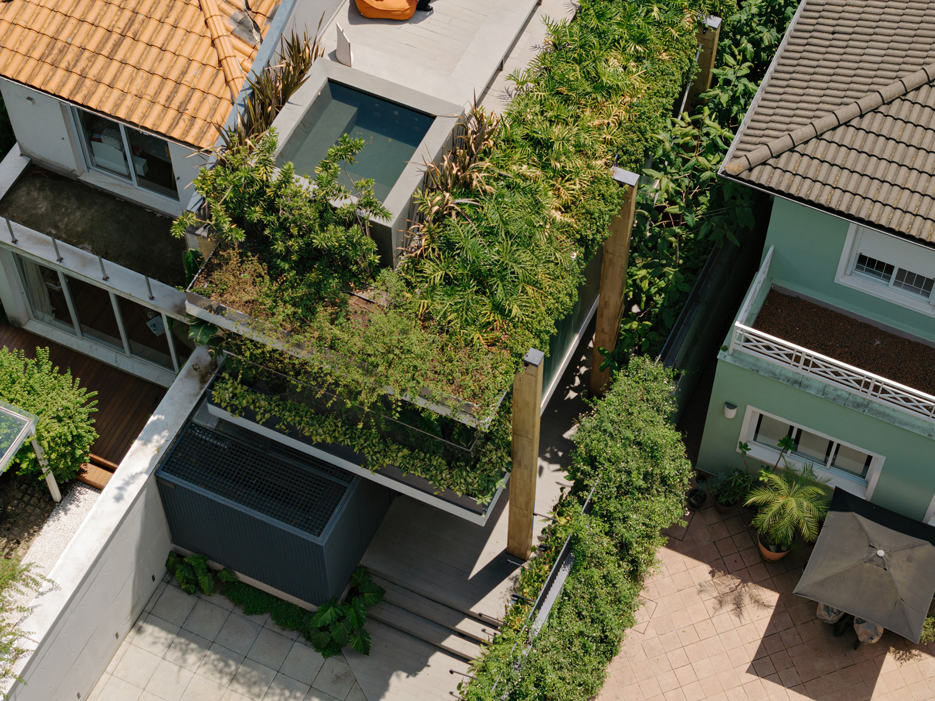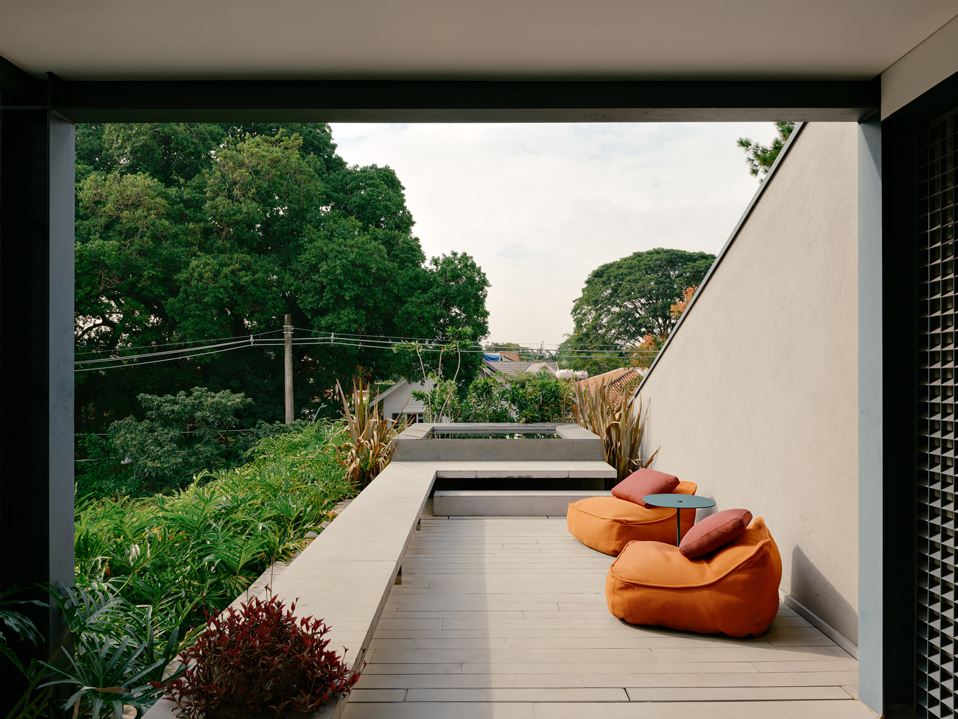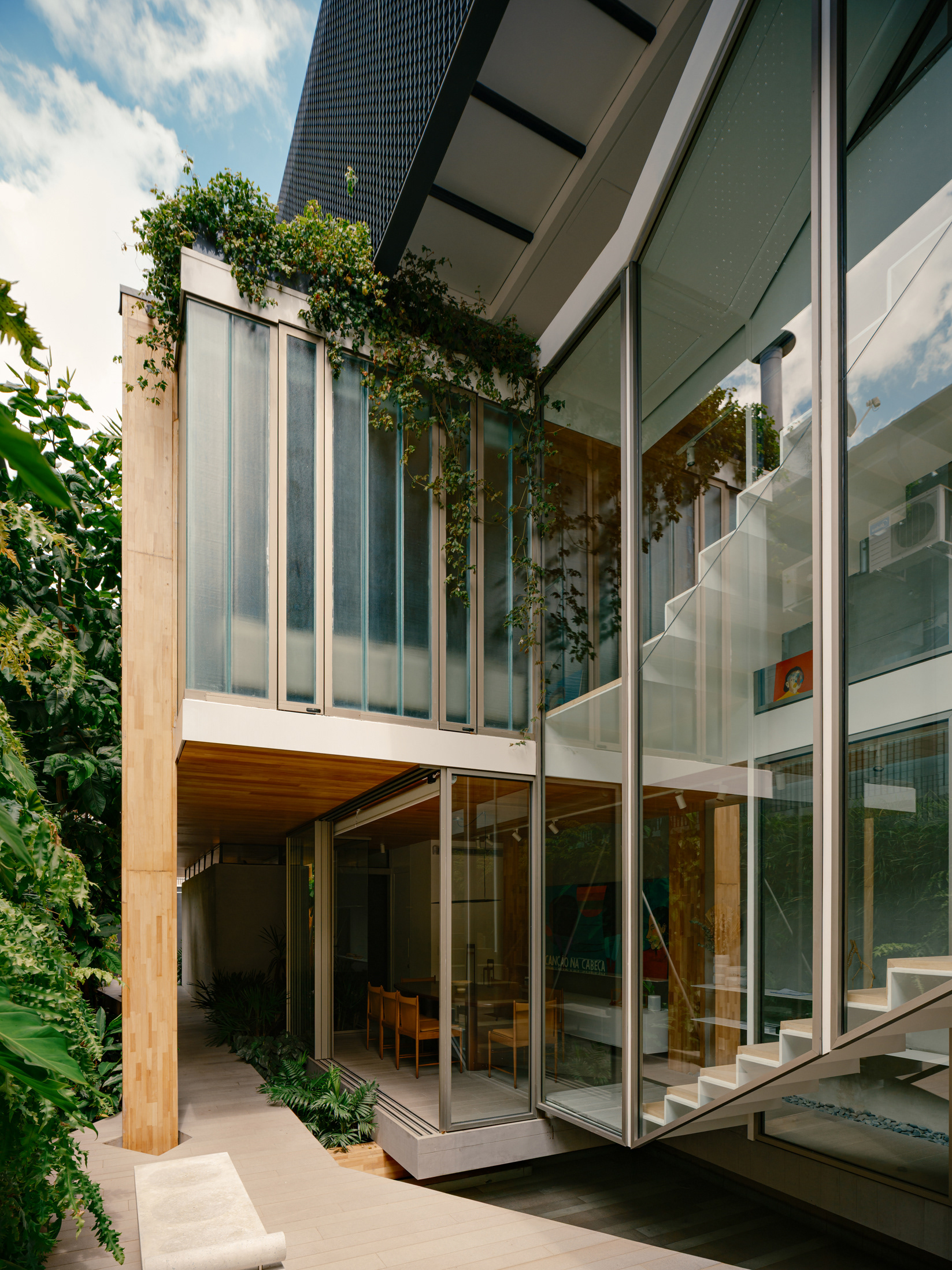 Composta de 3 pavimentos, o último pavimento acomoda um espaço de lazer com um spa na altura das árvores da rua. Protegido da insolação por um cobogó metálico, este pavimento se apoia sobre o pórtico de madeira e constitui um elemento à parte dos dois pavimentos logo abaixo.
