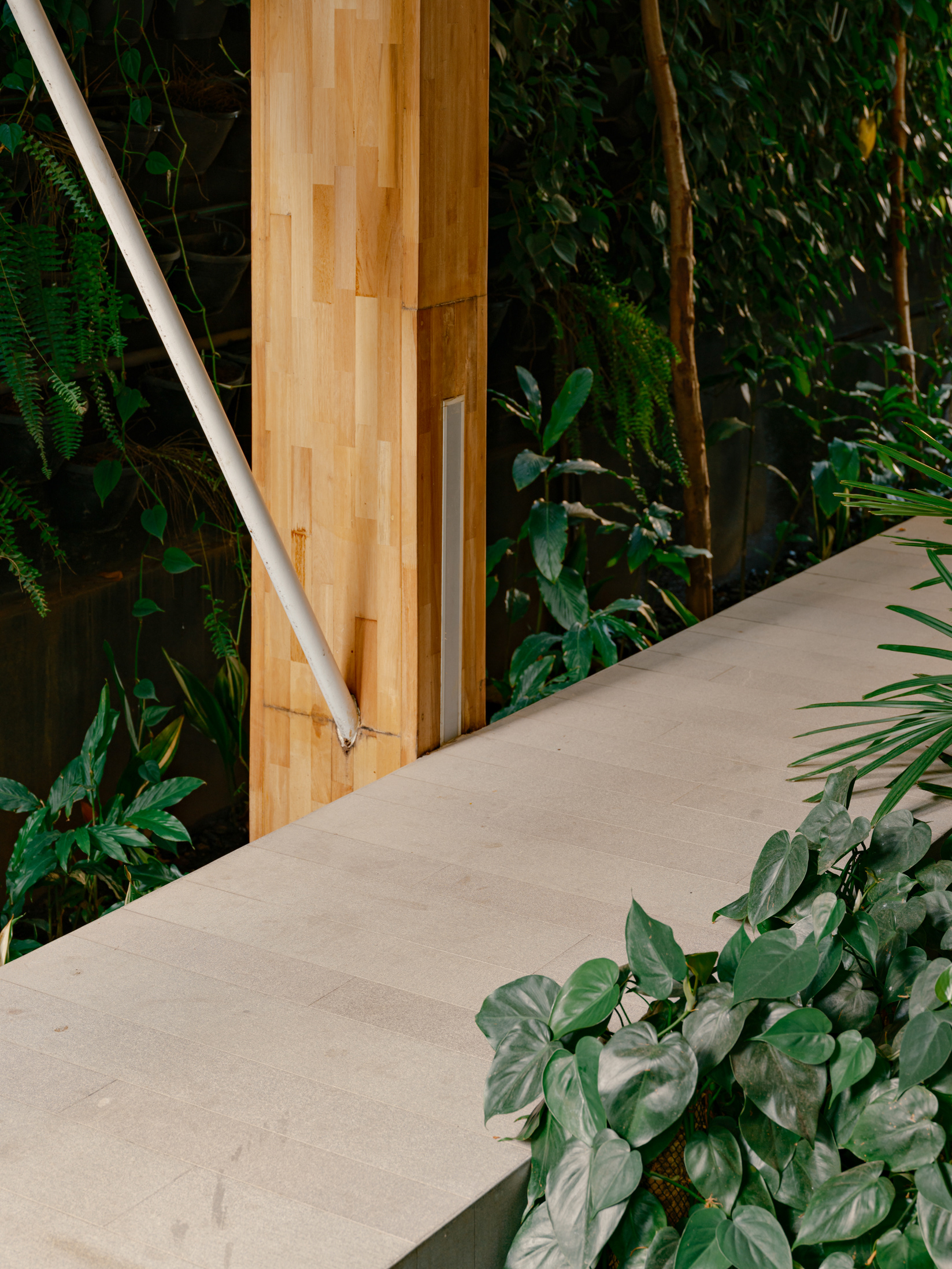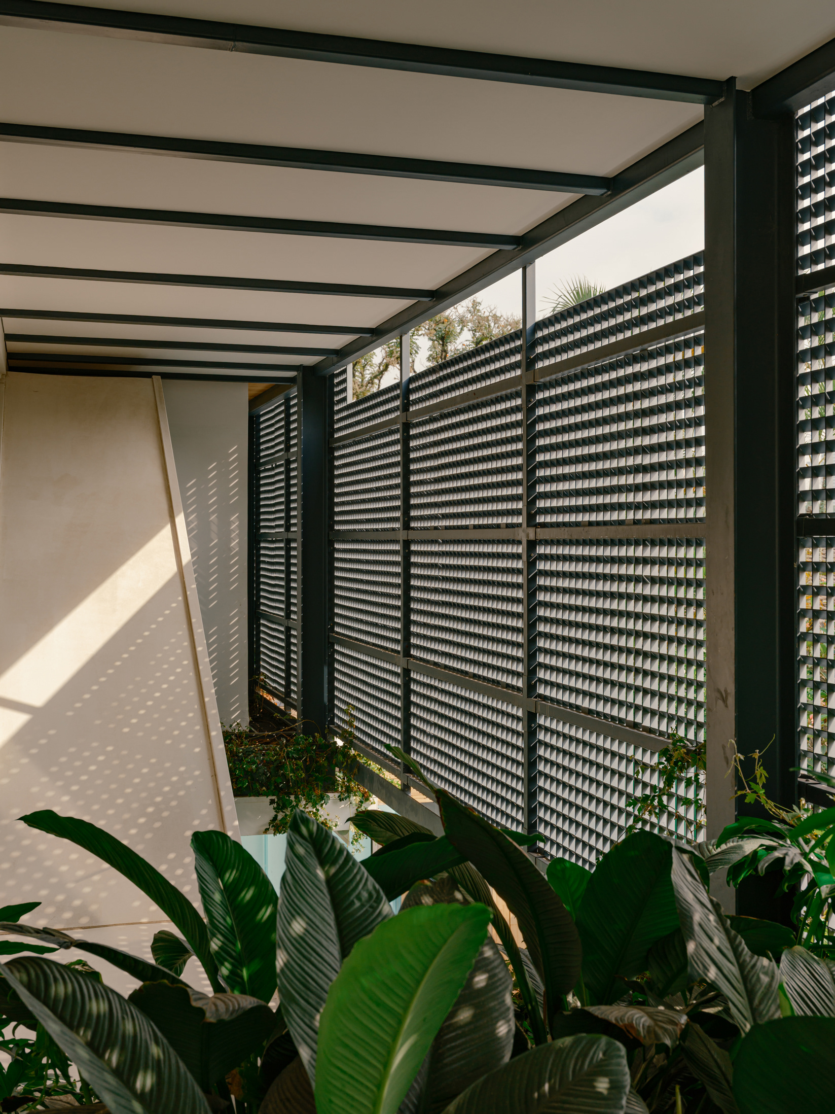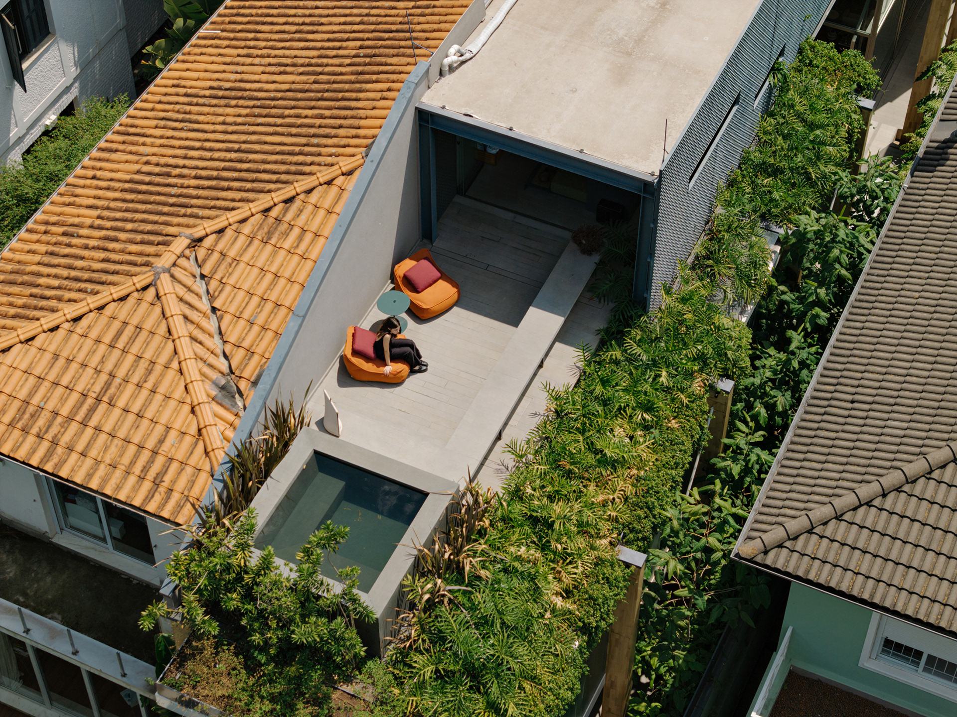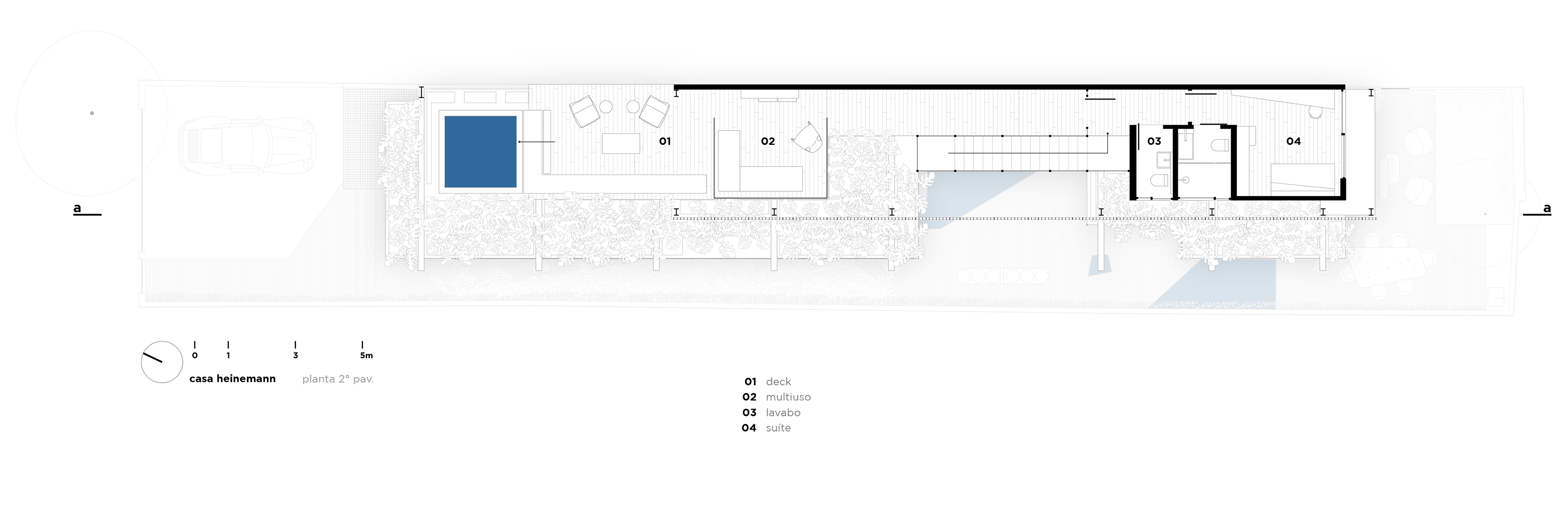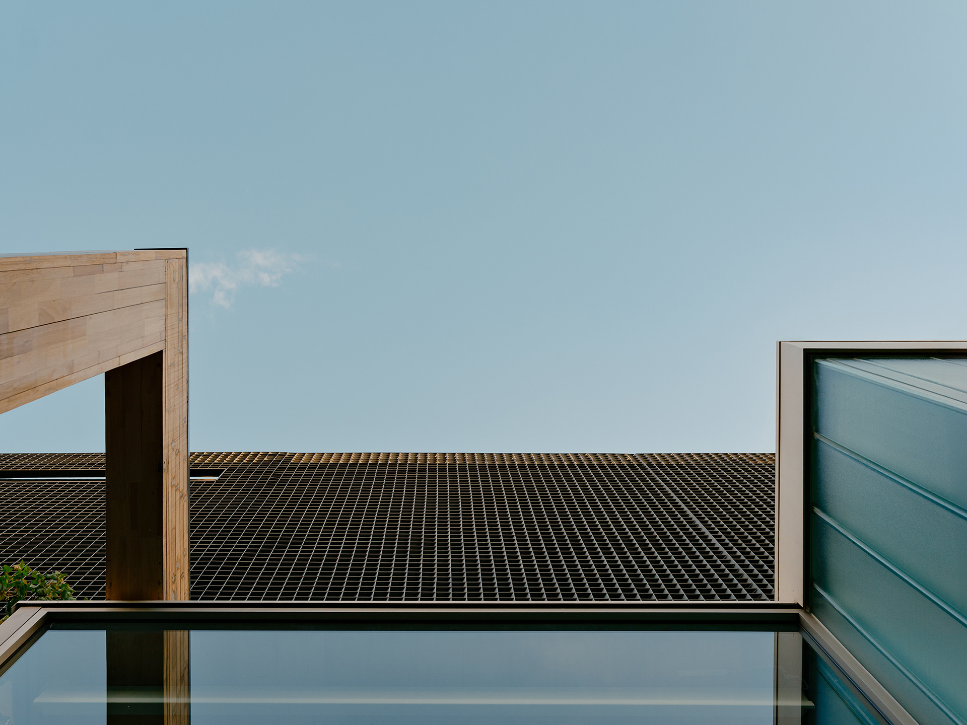 Composta de 3 pavimentos, o último pavimento acomoda um espaço de lazer com um spa na altura das árvores da rua. Protegido da insolação por um cobogó metálico, este pavimento se apoia sobre o pórtico de madeira e constitui um elemento à parte dos dois pavimentos logo abaixo.