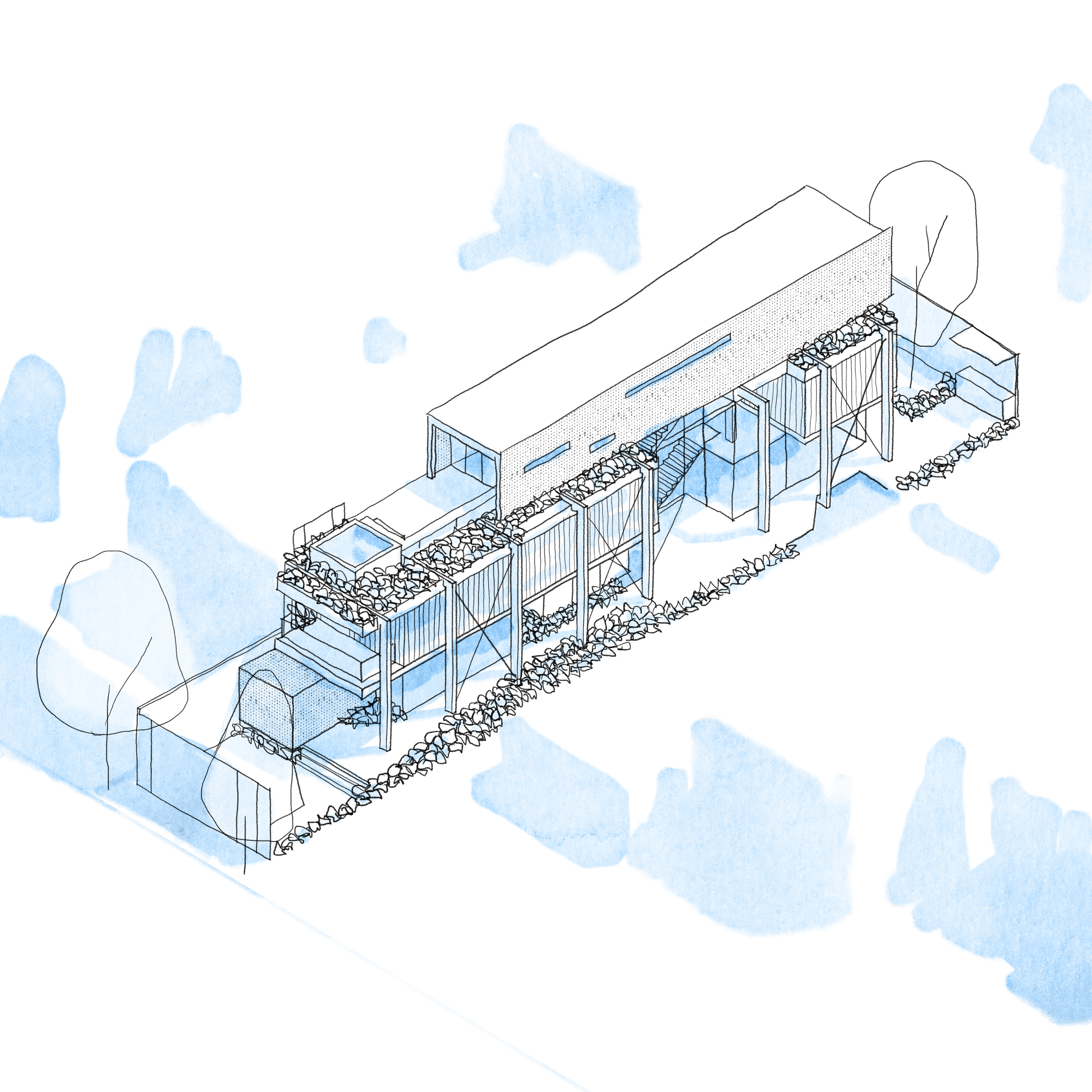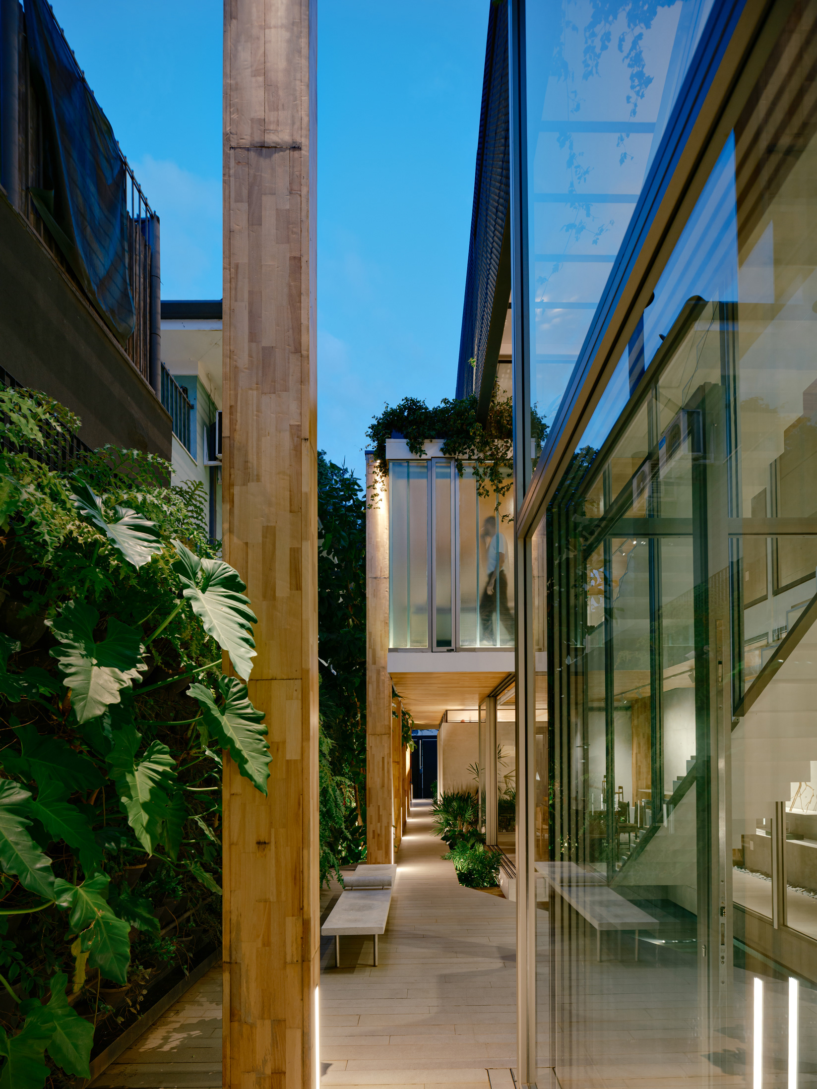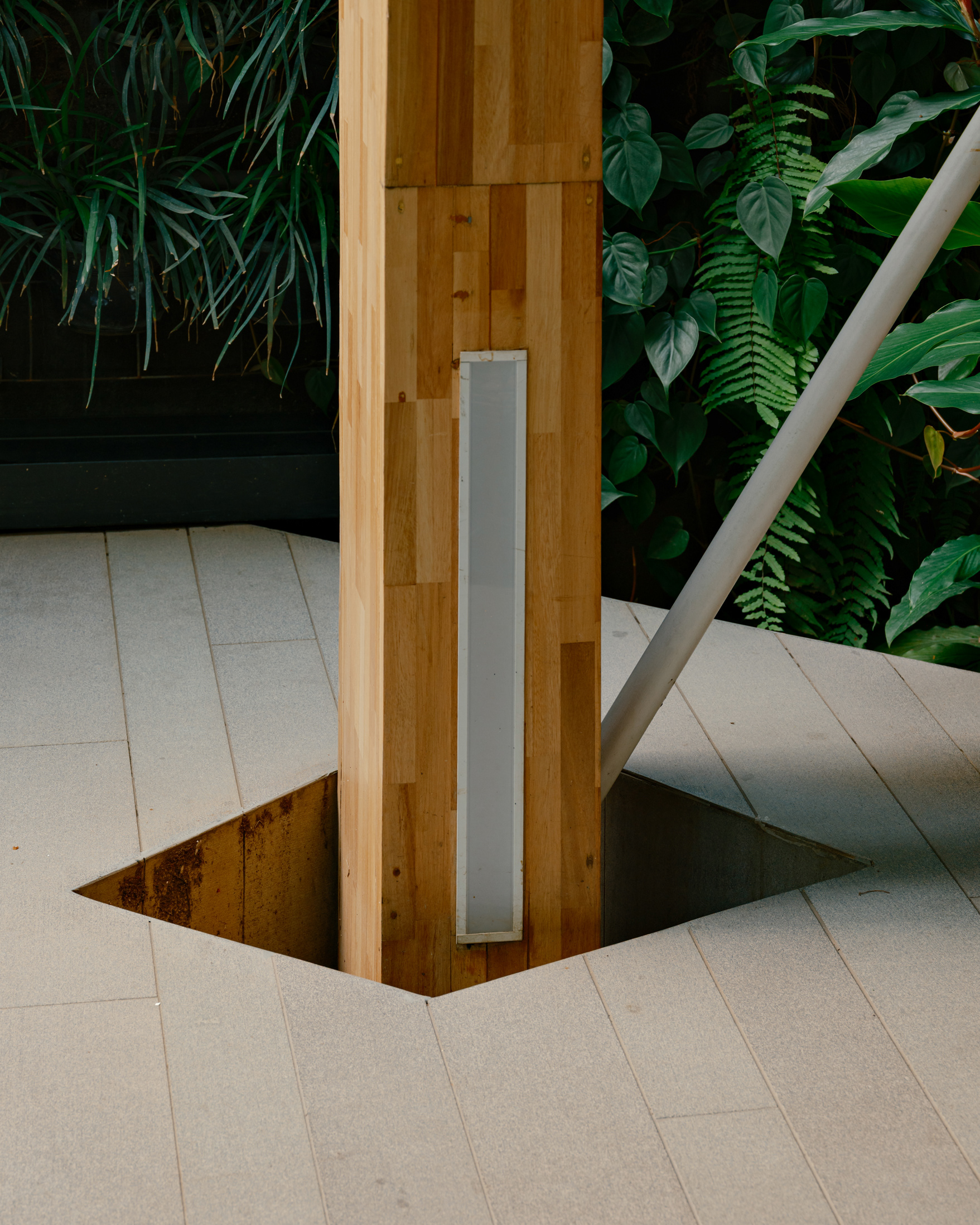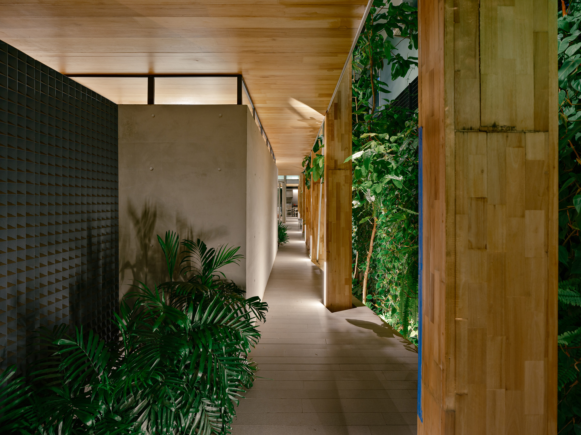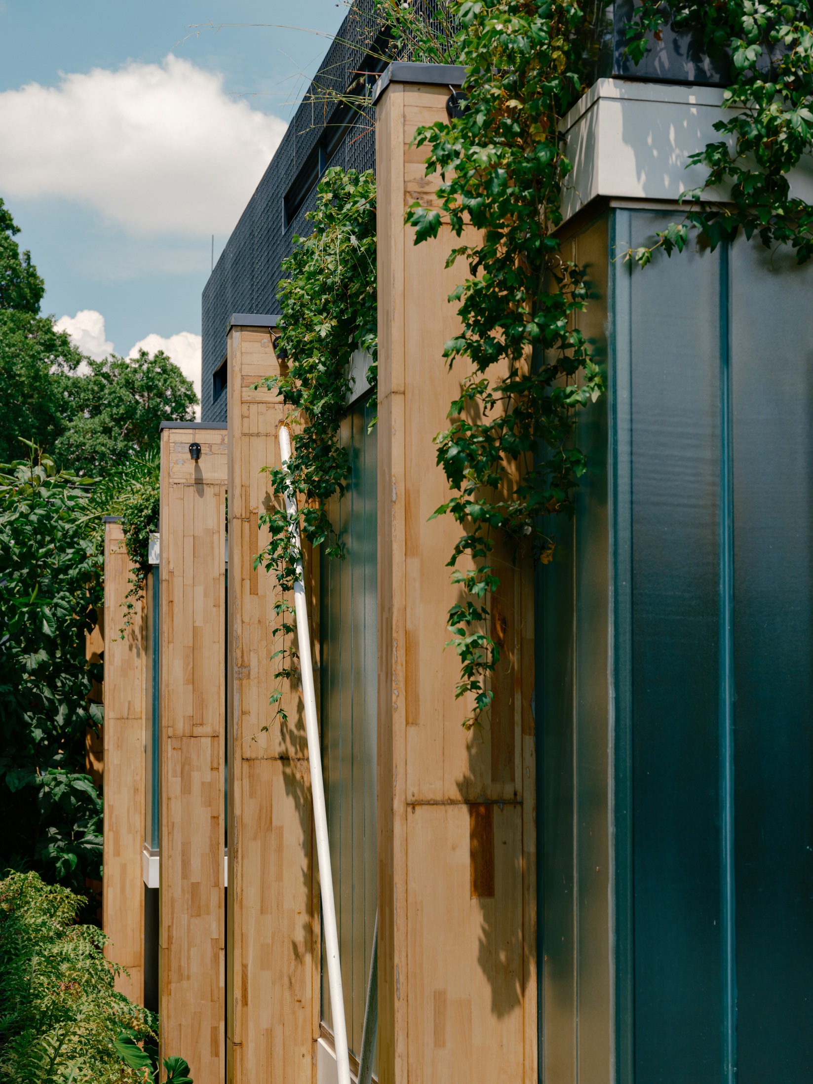 Composta de 3 pavimentos, o último pavimento acomoda um espaço de lazer com um spa na altura das árvores da rua. Protegido da insolação por um cobogó metálico, este pavimento se apoia sobre o pórtico de madeira e constitui um elemento à parte dos dois pavimentos logo abaixo.