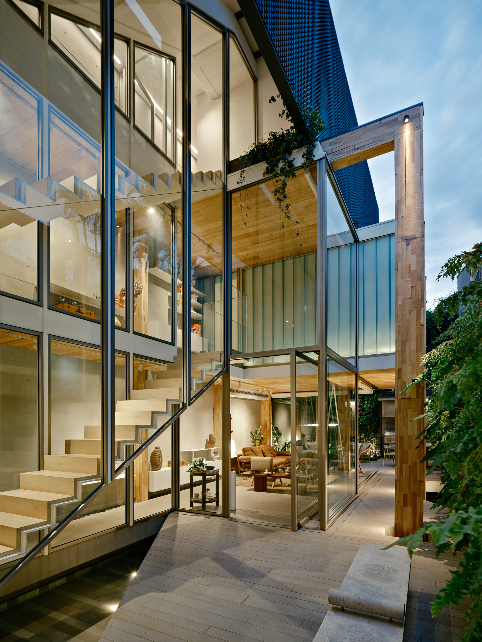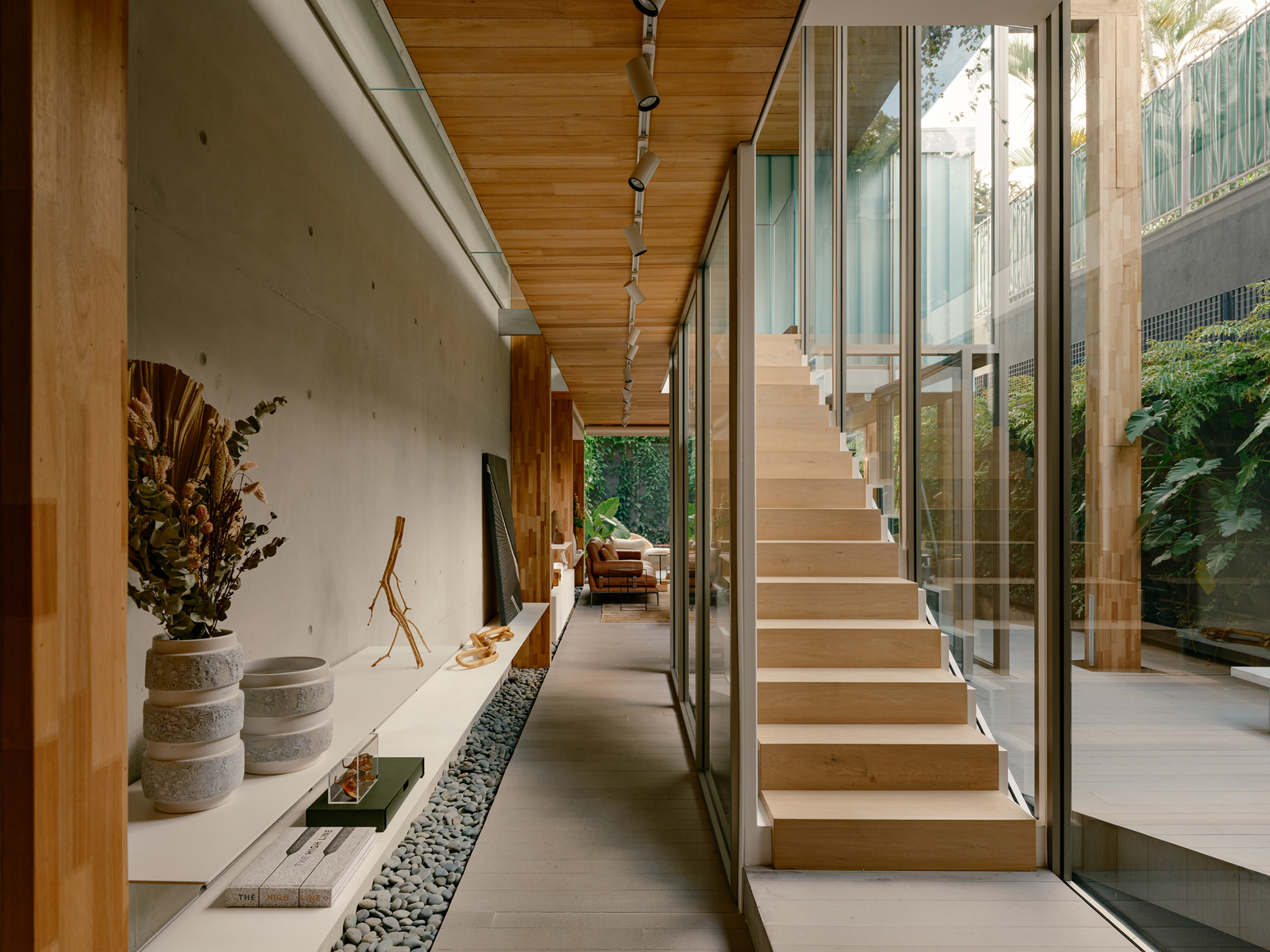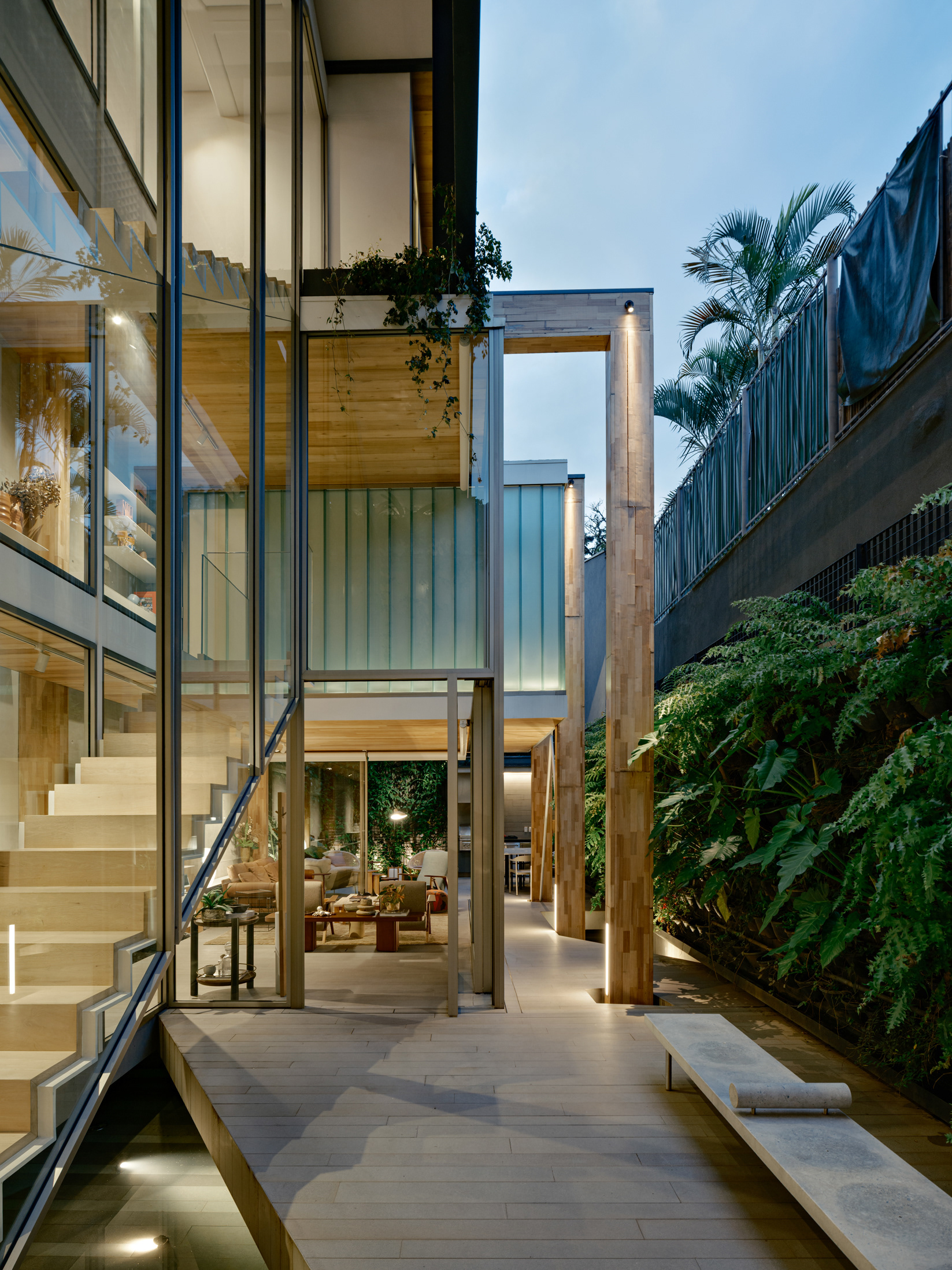 Os pórticos seguem por cima da casa e apoiam-se junto a uma parede de concreto aparente, que define o limite com o vizinho da esquerda. Os elementos de MLC são complementados com lajes CLT nos dois pavimentos superiores da casa. Tratadas para ficarem aparentes, as lajes ressaltam o sistema construtivo em quase todos os ambientes da casa.