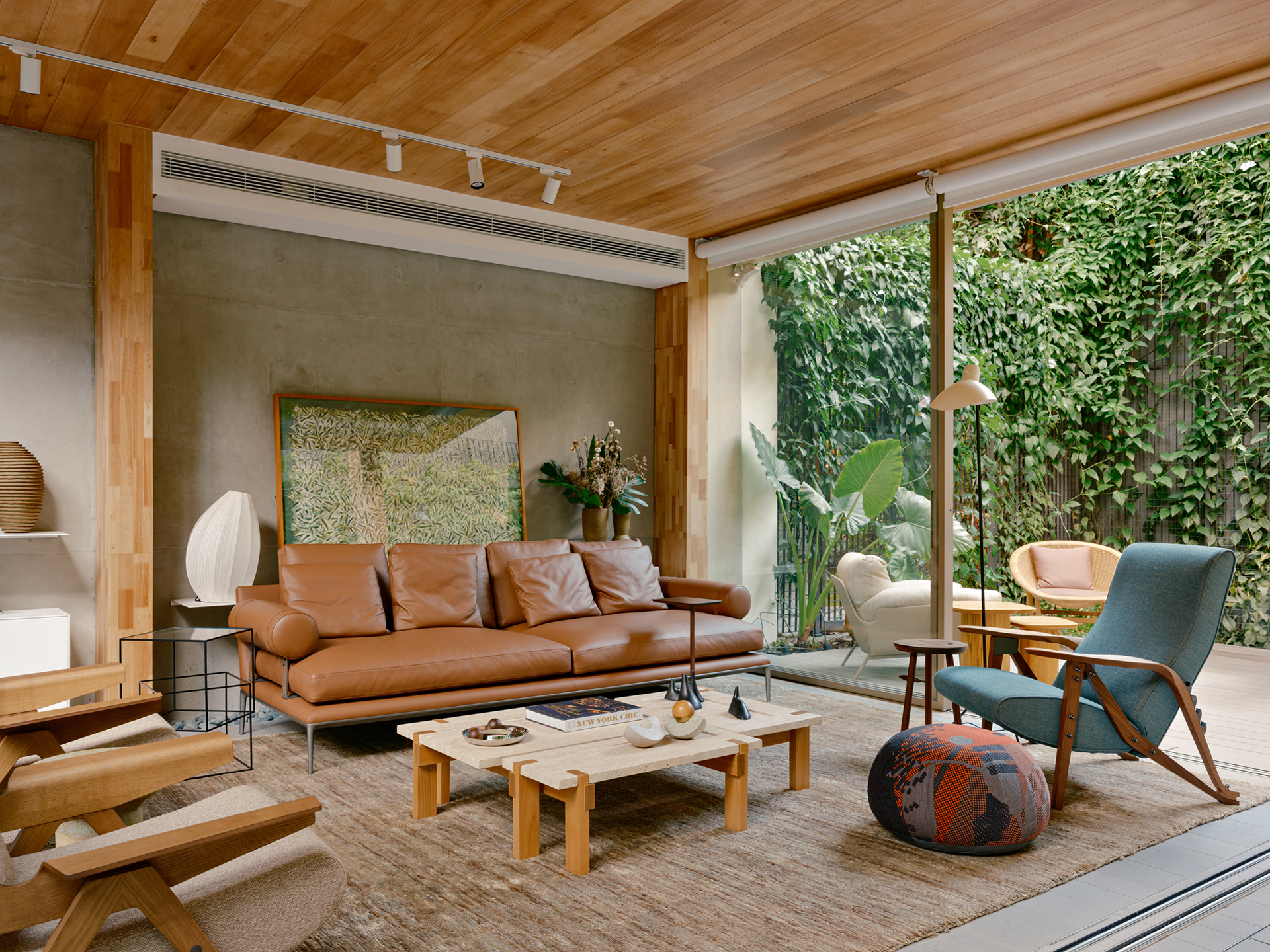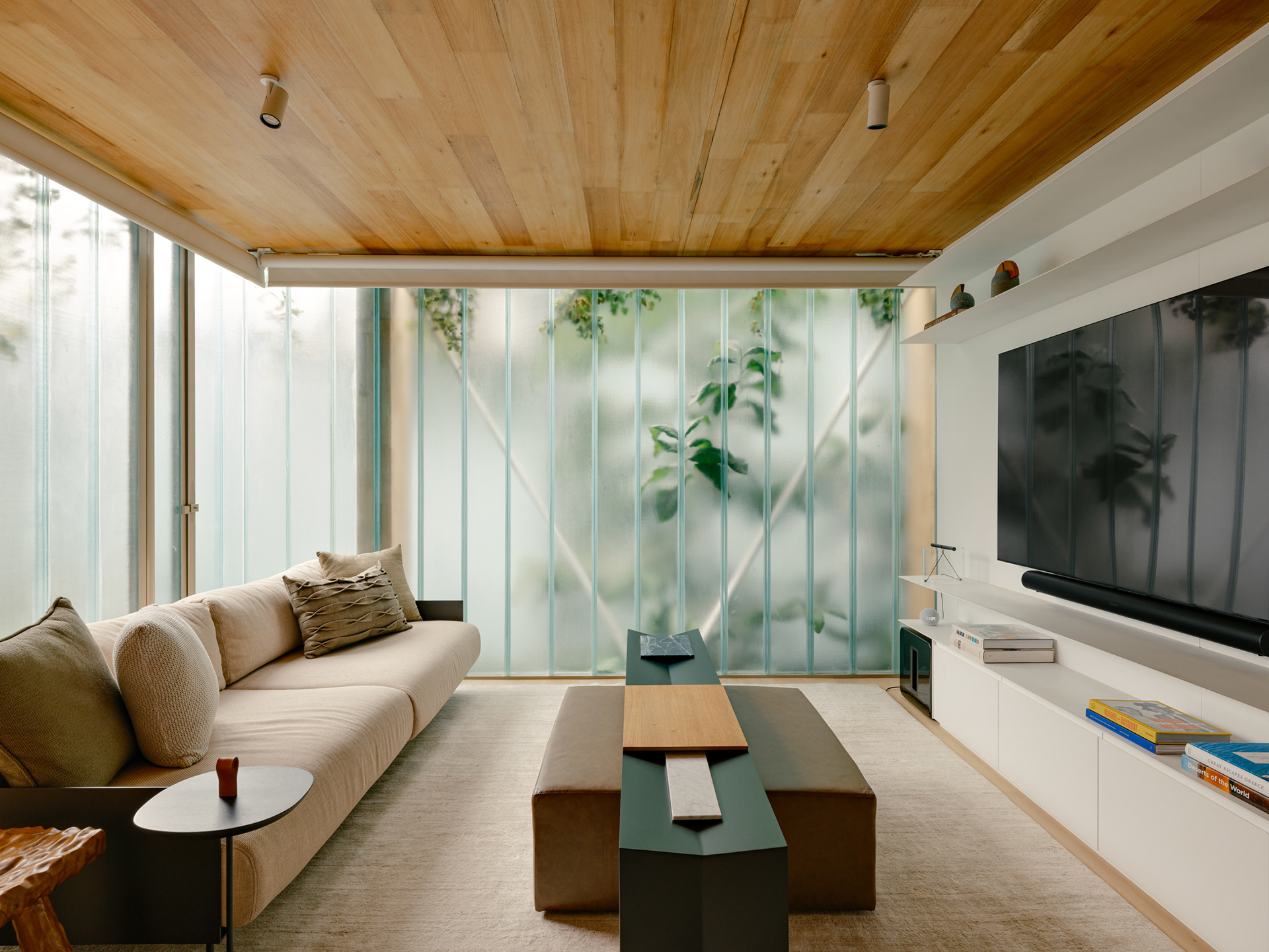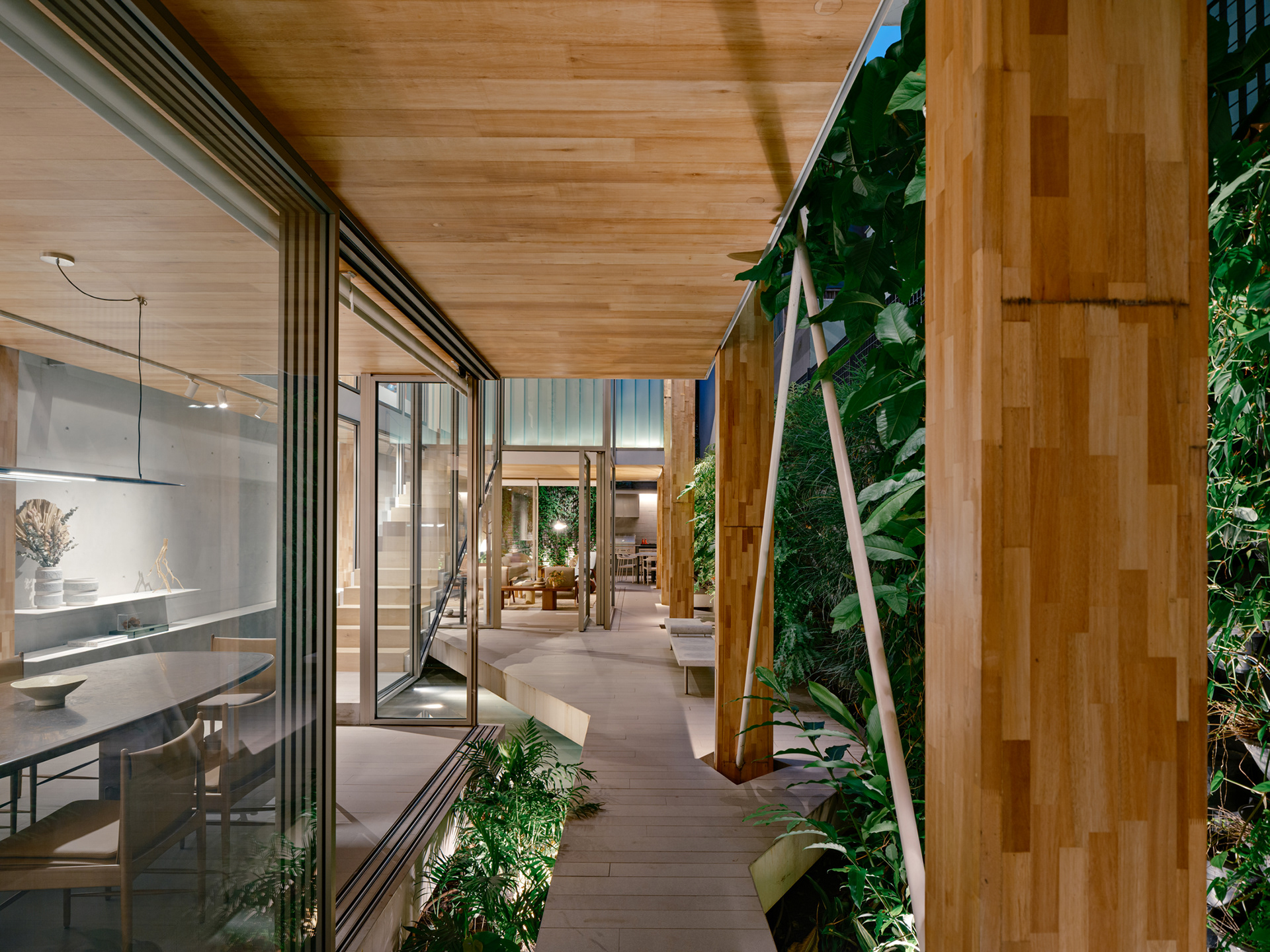 Os pórticos seguem por cima da casa e apoiam-se junto a uma parede de concreto aparente, que define o limite com o vizinho da esquerda. Os elementos de MLC são complementados com lajes CLT nos dois pavimentos superiores da casa. Tratadas para ficarem aparentes, as lajes ressaltam o sistema construtivo em quase todos os ambientes da casa.