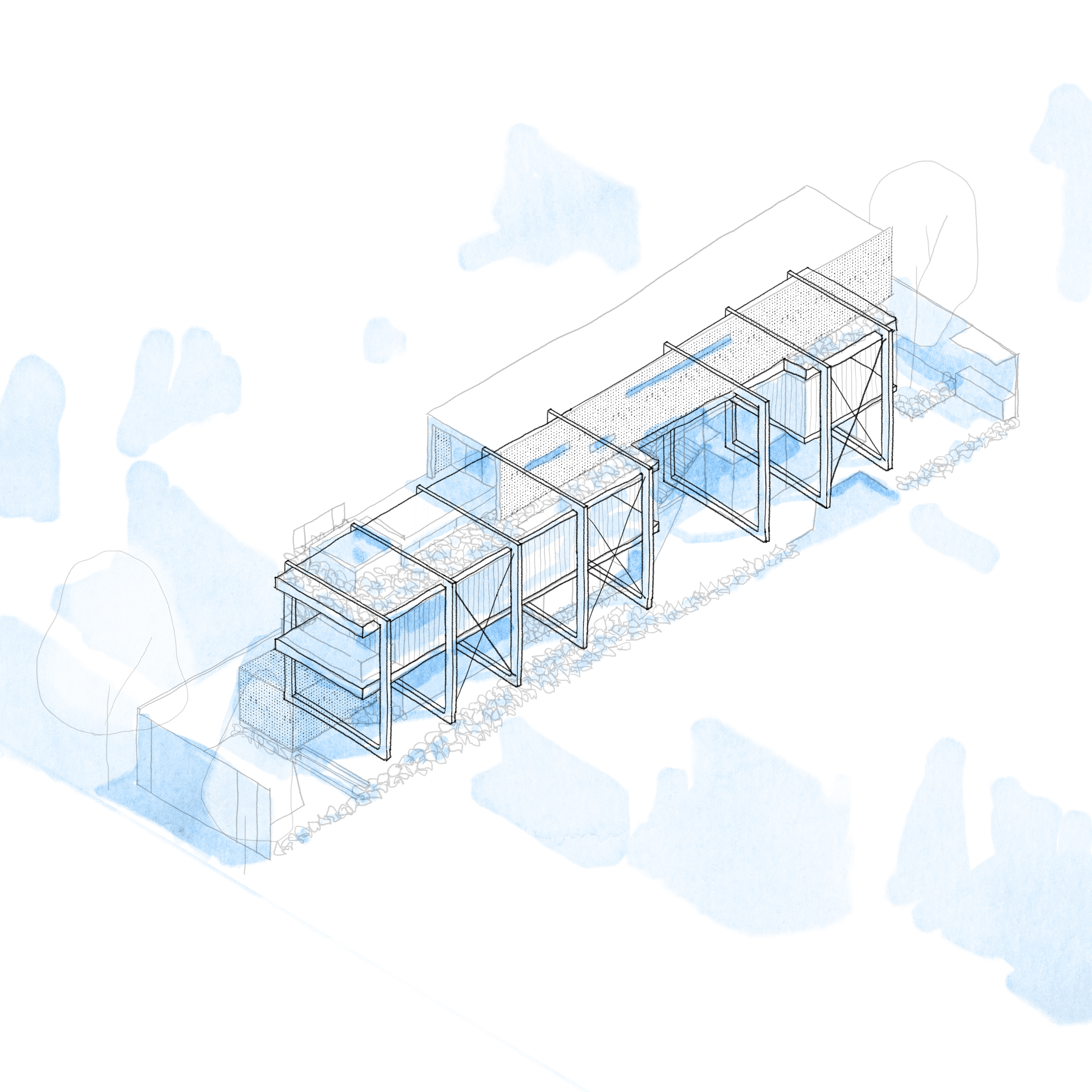 Uma sequência de pórticos em estrutura de madeira criam um ritmo no percurso, fazendo da madeira um material presente desde a entrada do visitante. Leves e espaçados, soltos do volume principal da casa, fazem parte tanto da casa quanto do jardim, definindo o percurso como um espaço de transição entre o dentro e o fora da casa. Tratam-se de elementos de MLC que, por ficarem expostos a intempéries, recebem uma capa de sacrifício também em madeira. O contraventamento dos pórticos é feito em hastes de aço, o que permite que a solução estrutural seja uma parte fundamental da linguagem arquitetônica da casa.