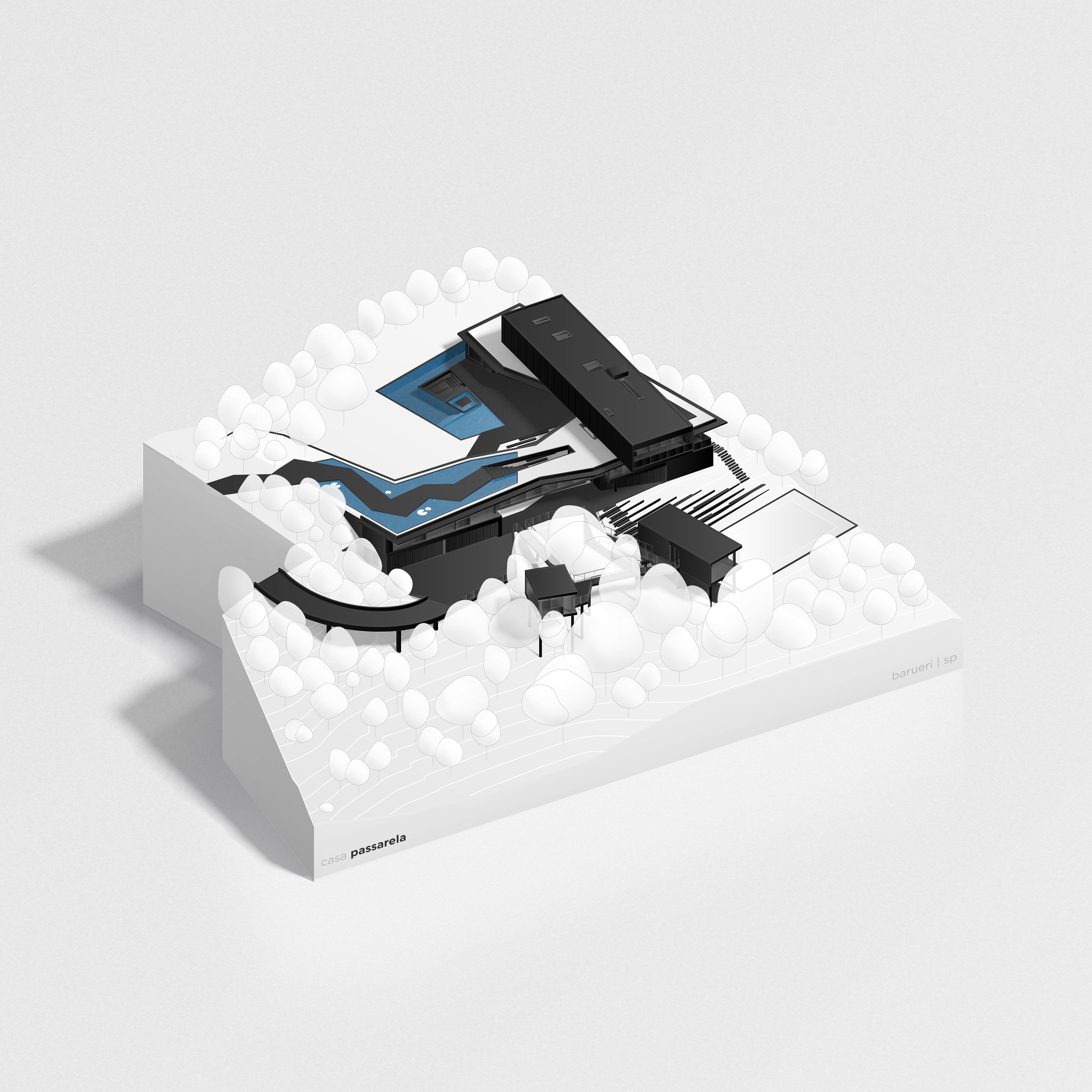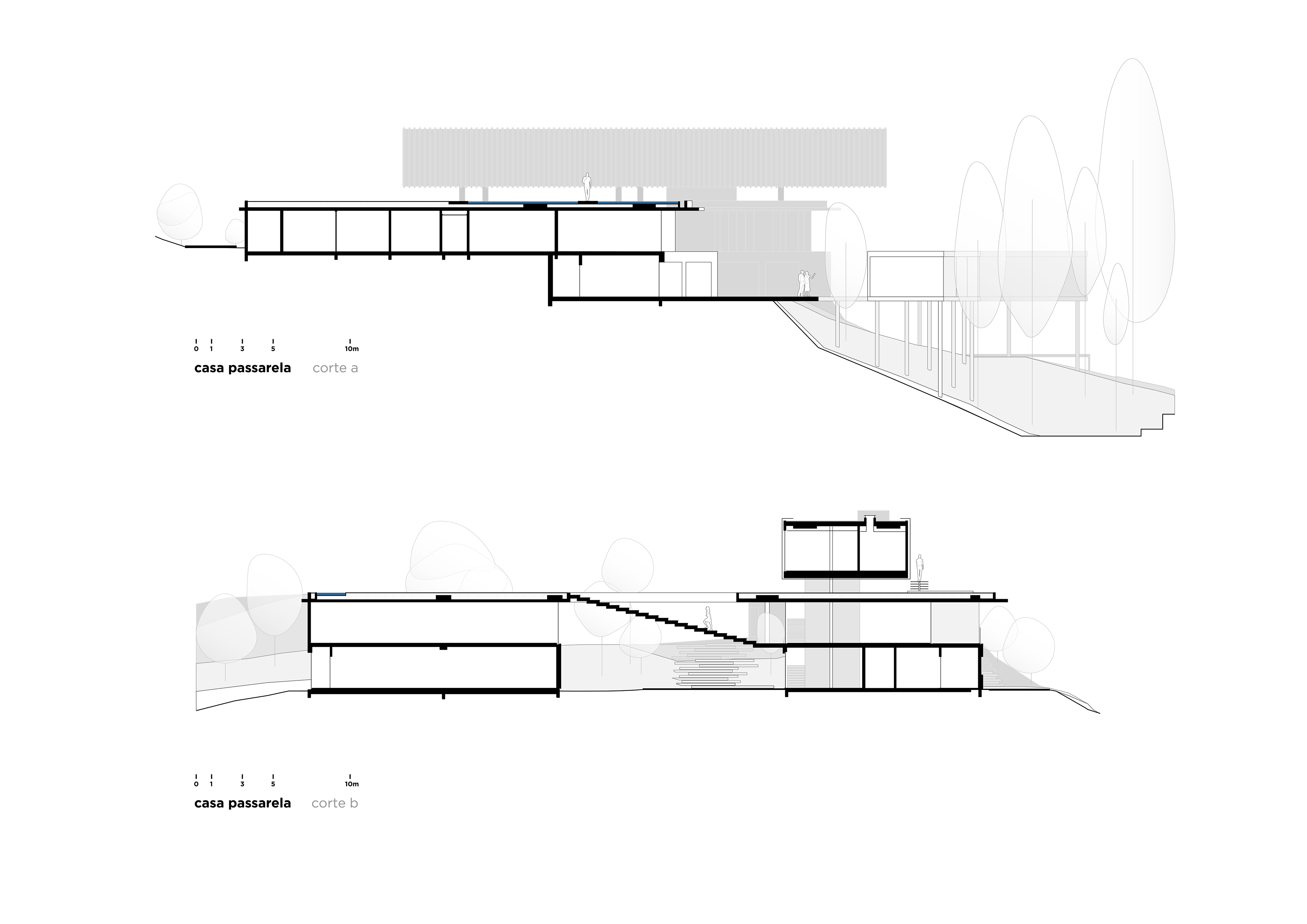 O projeto da Casa Passarela nasceu de uma profunda conexão com as características singulares do terreno. A implantação do edifício foi determinante na concepção do partido arquitetônico. O lote é composto por duas partes distintas: uma área plana e gramada e outra com um acentuado declive, densamente arborizada com árvores de grande porte. Ambas as porções estão situadas em um nível inferior à rua de acesso, que termina em uma via sem saída.