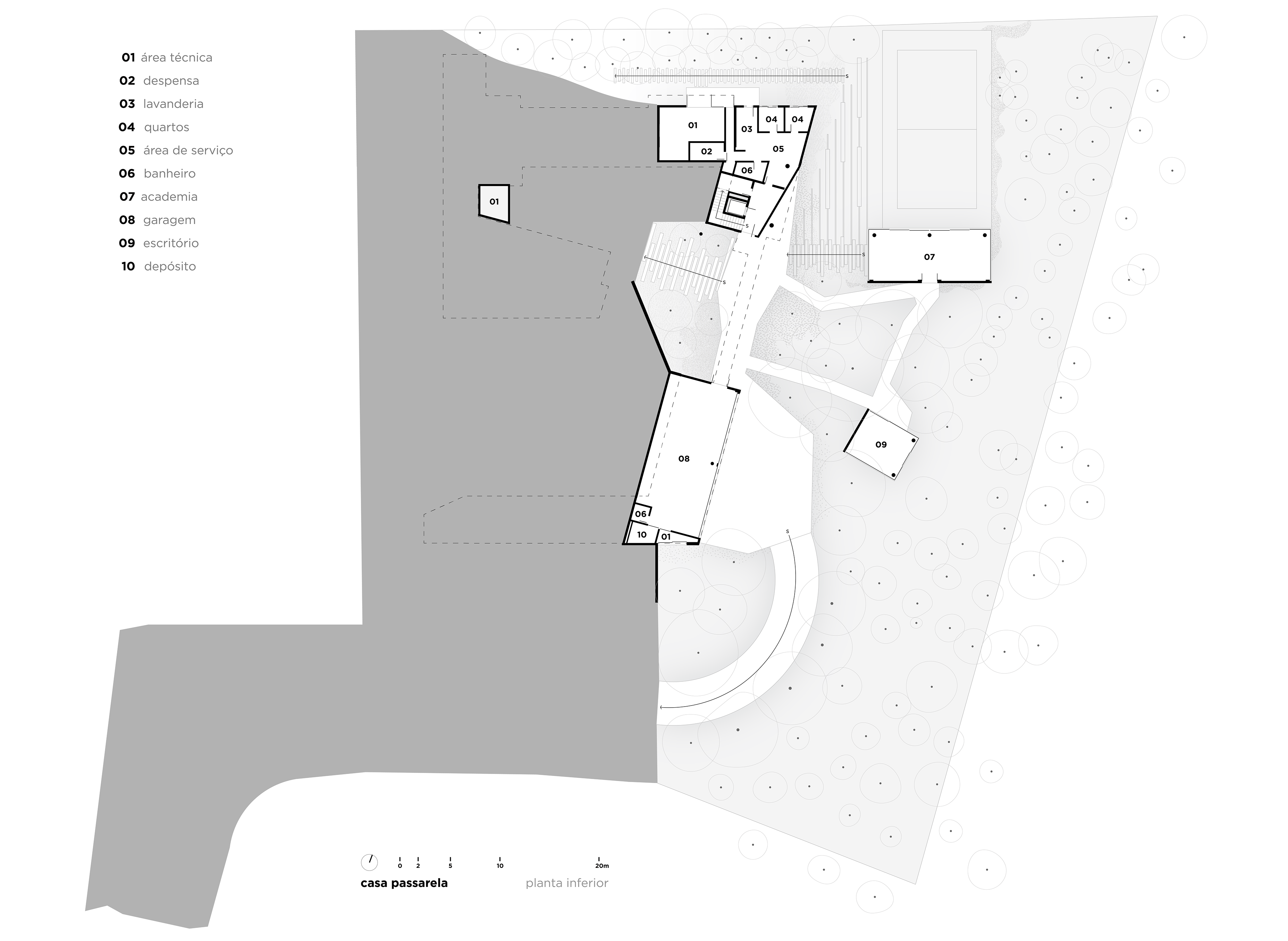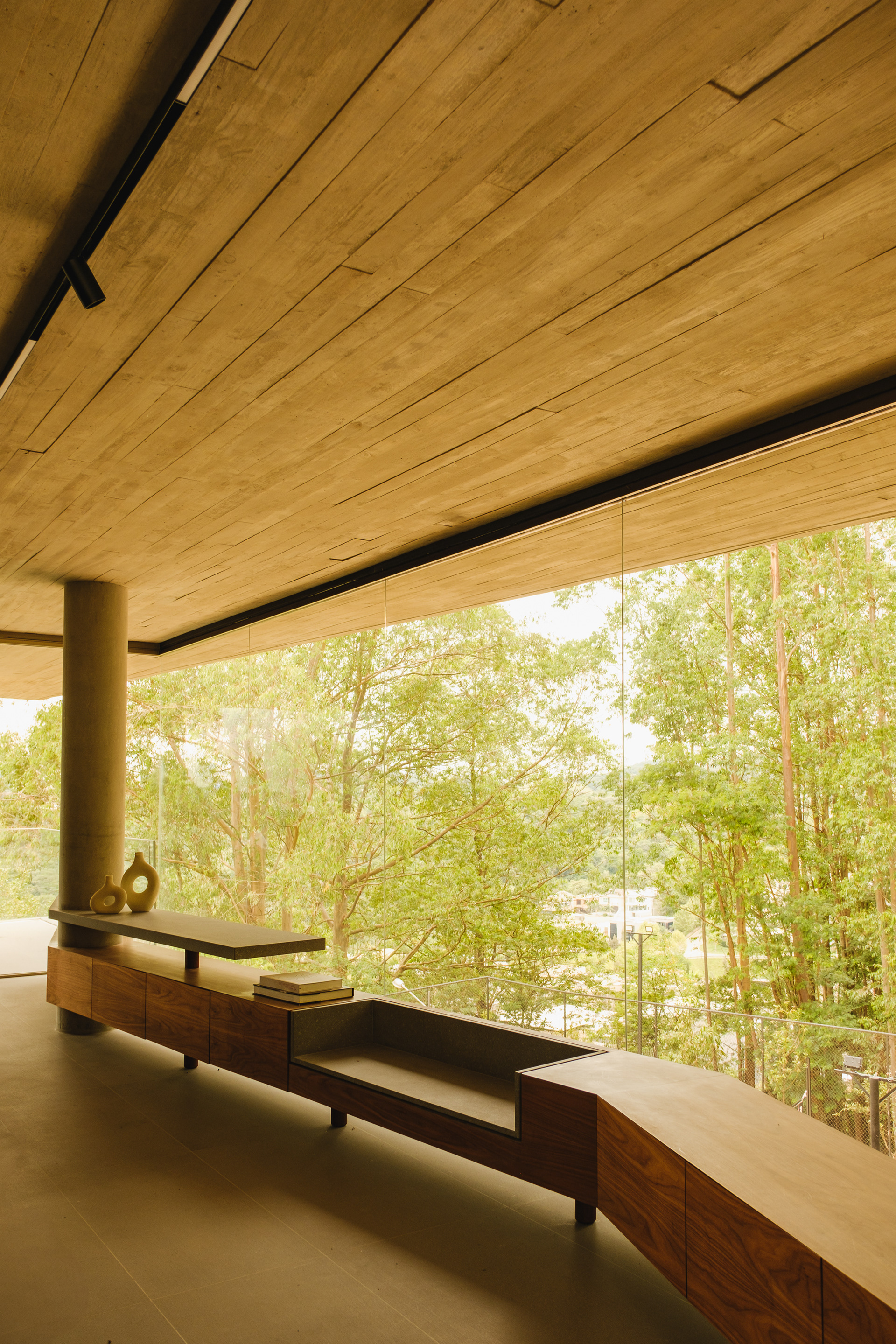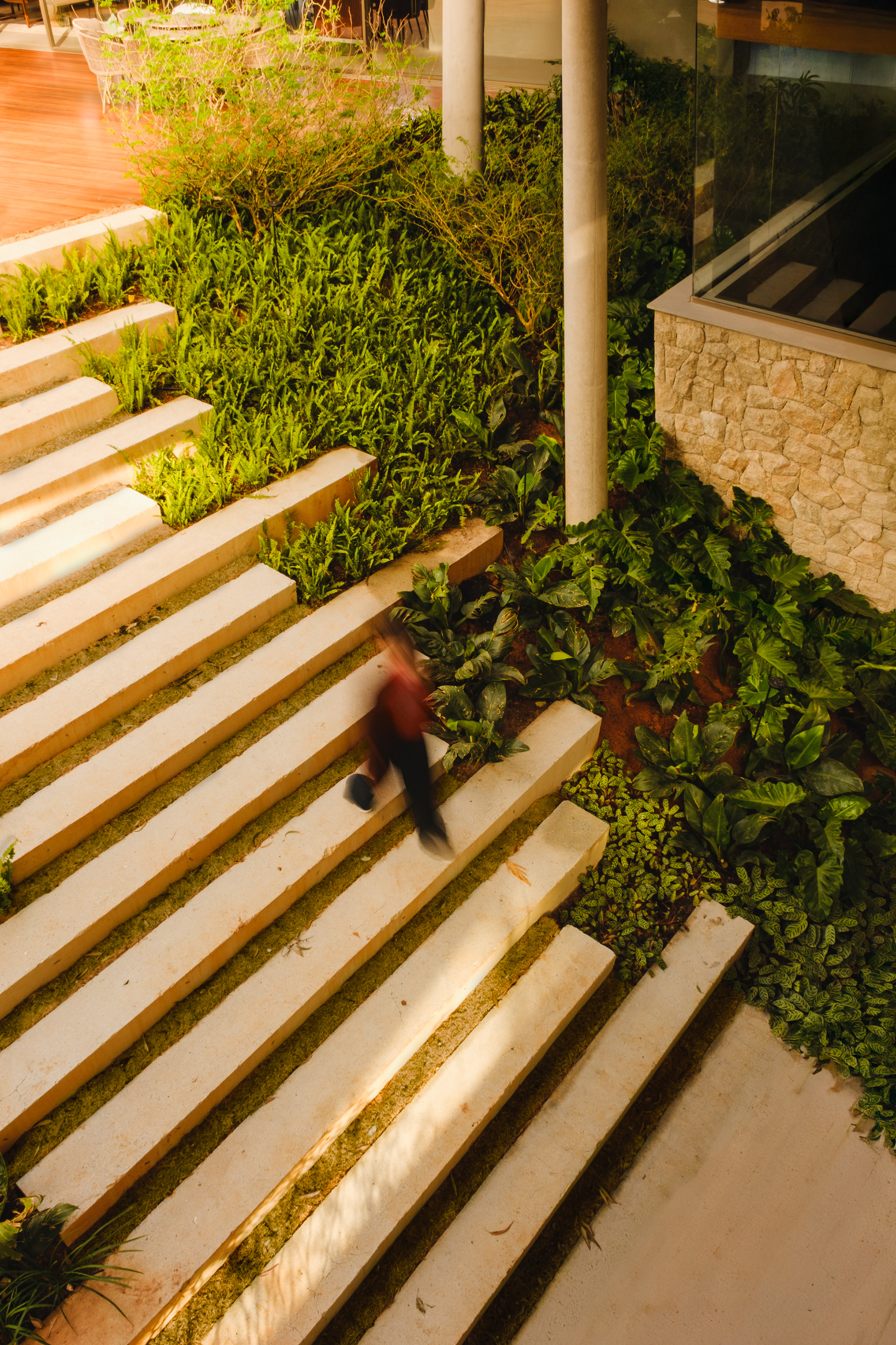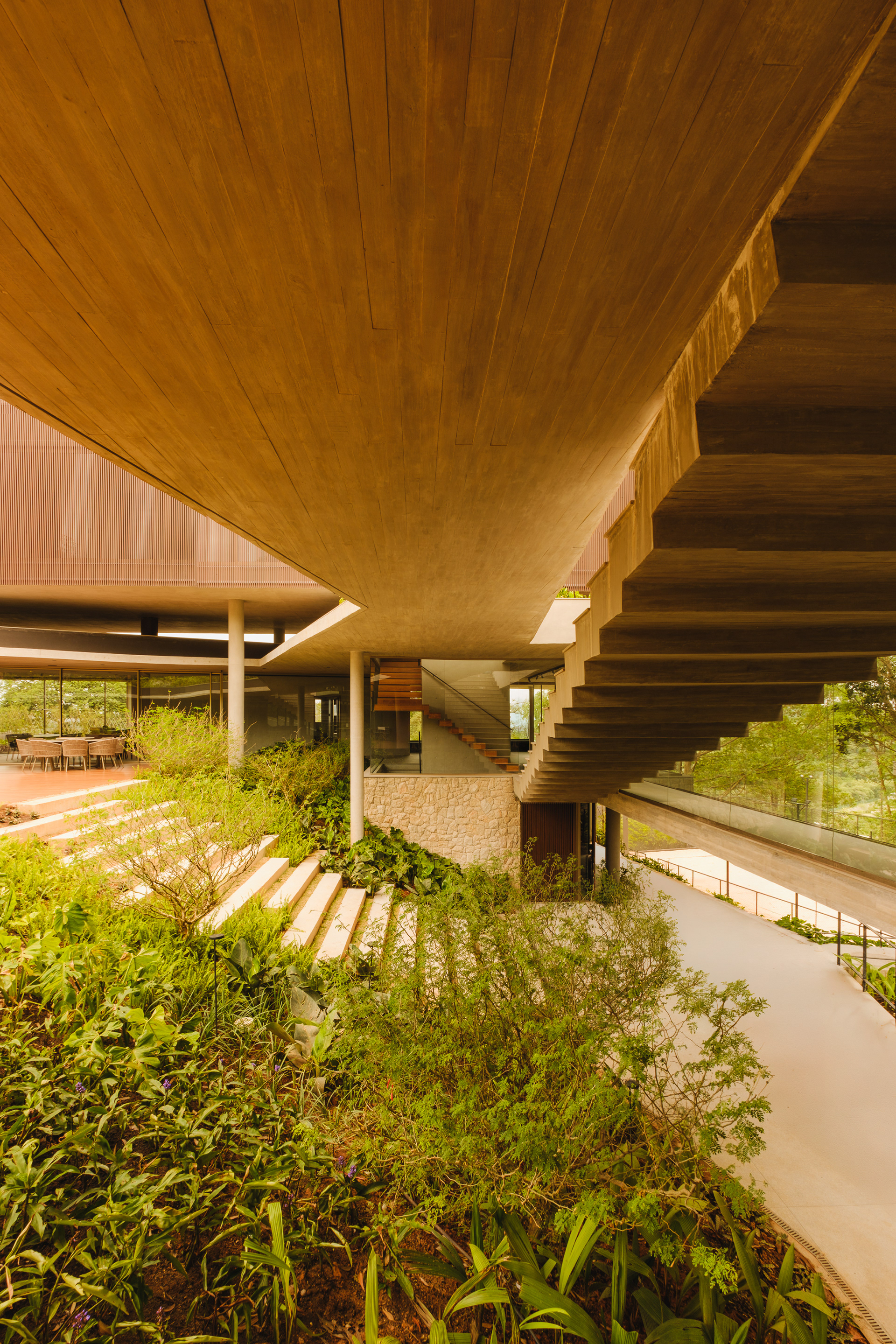 Uma fresta sob essa grande cobertura faz a transição entre o pátio e a área de mata, conectando-as por meio de uma passarela de 14 metros que estabelece um elo entre a área social e a área de lazer. No nível inferior, passarelas suspensas entre as árvores integram volumes sobre pilotis que se elevam na altura das copas. Nestes volumes estão o escritório e a academia, imersos na vegetação existente.