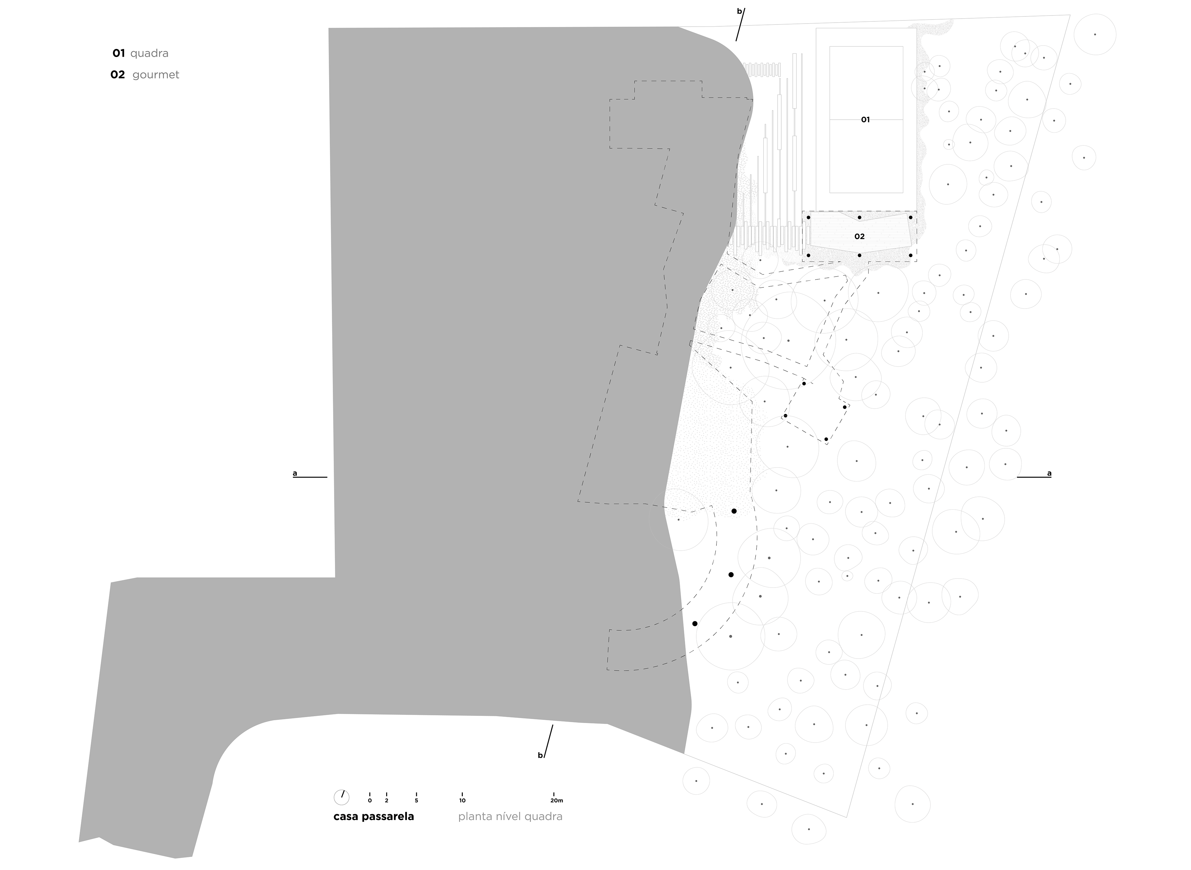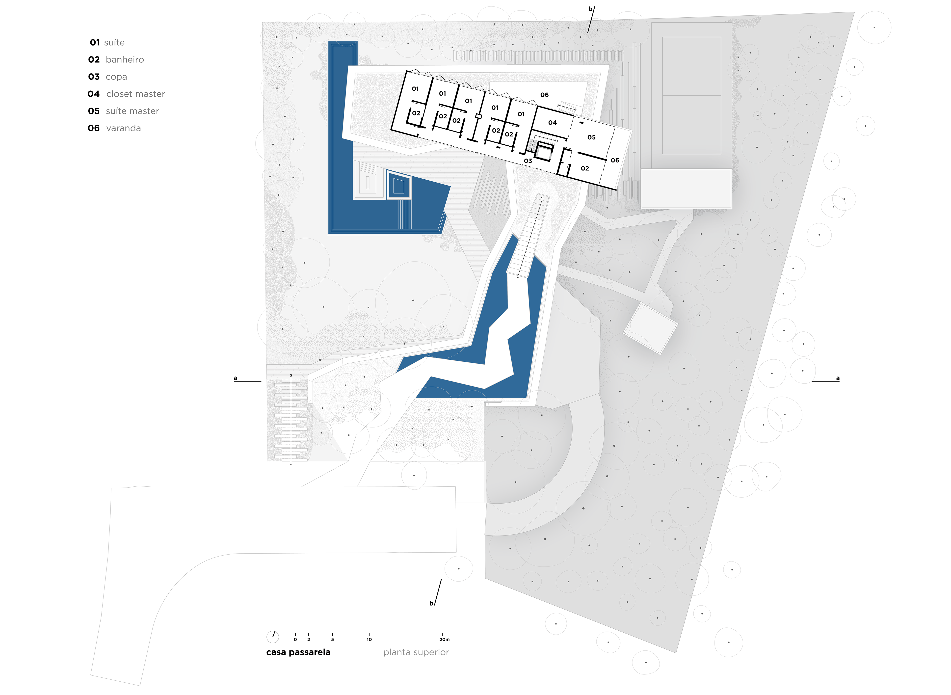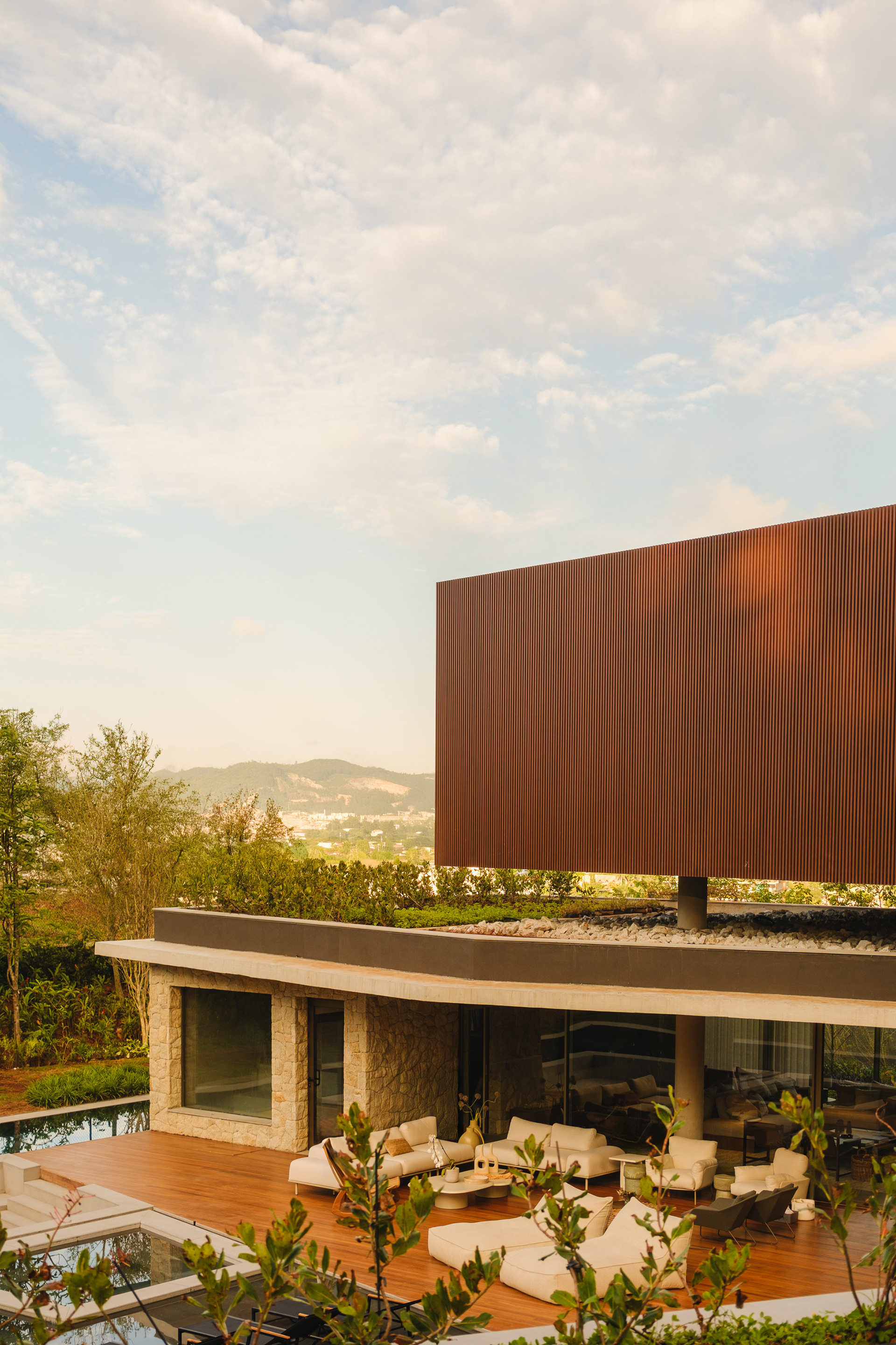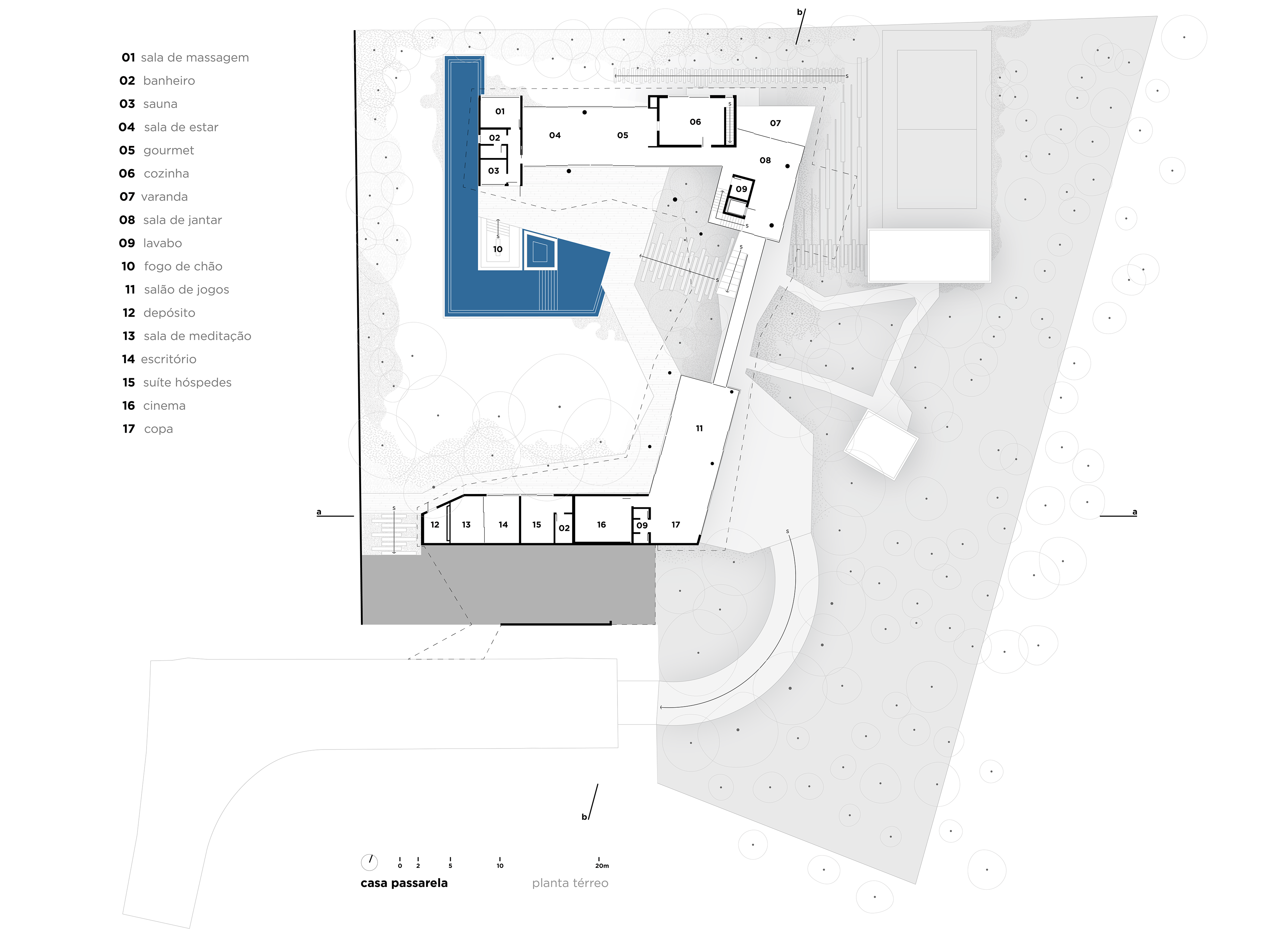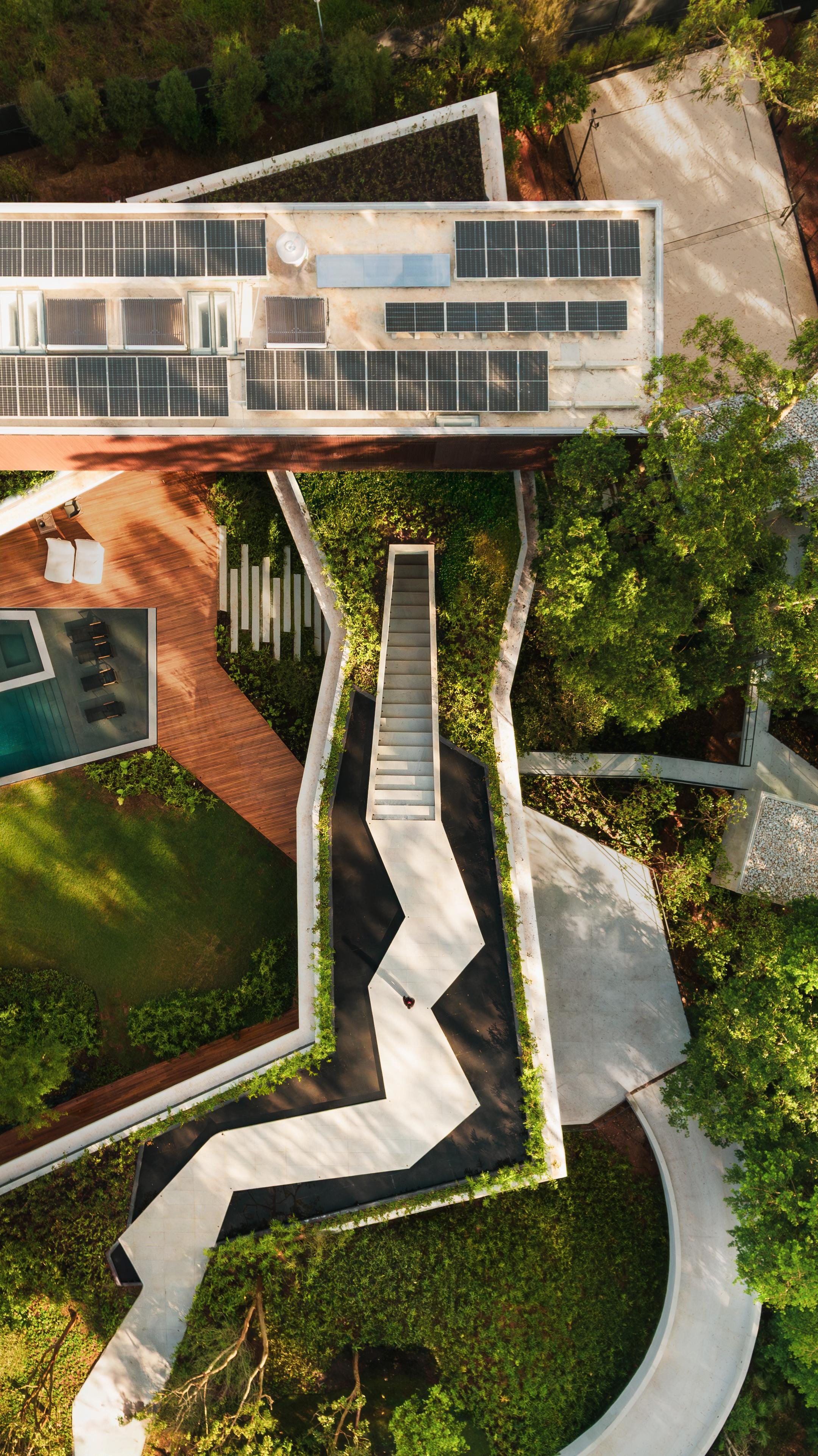 Uma fresta sob essa grande cobertura faz a transição entre o pátio e a área de mata, conectando-as por meio de uma passarela de 14 metros que estabelece um elo entre a área social e a área de lazer. No nível inferior, passarelas suspensas entre as árvores integram volumes sobre pilotis que se elevam na altura das copas. Nestes volumes estão o escritório e a academia, imersos na vegetação existente.