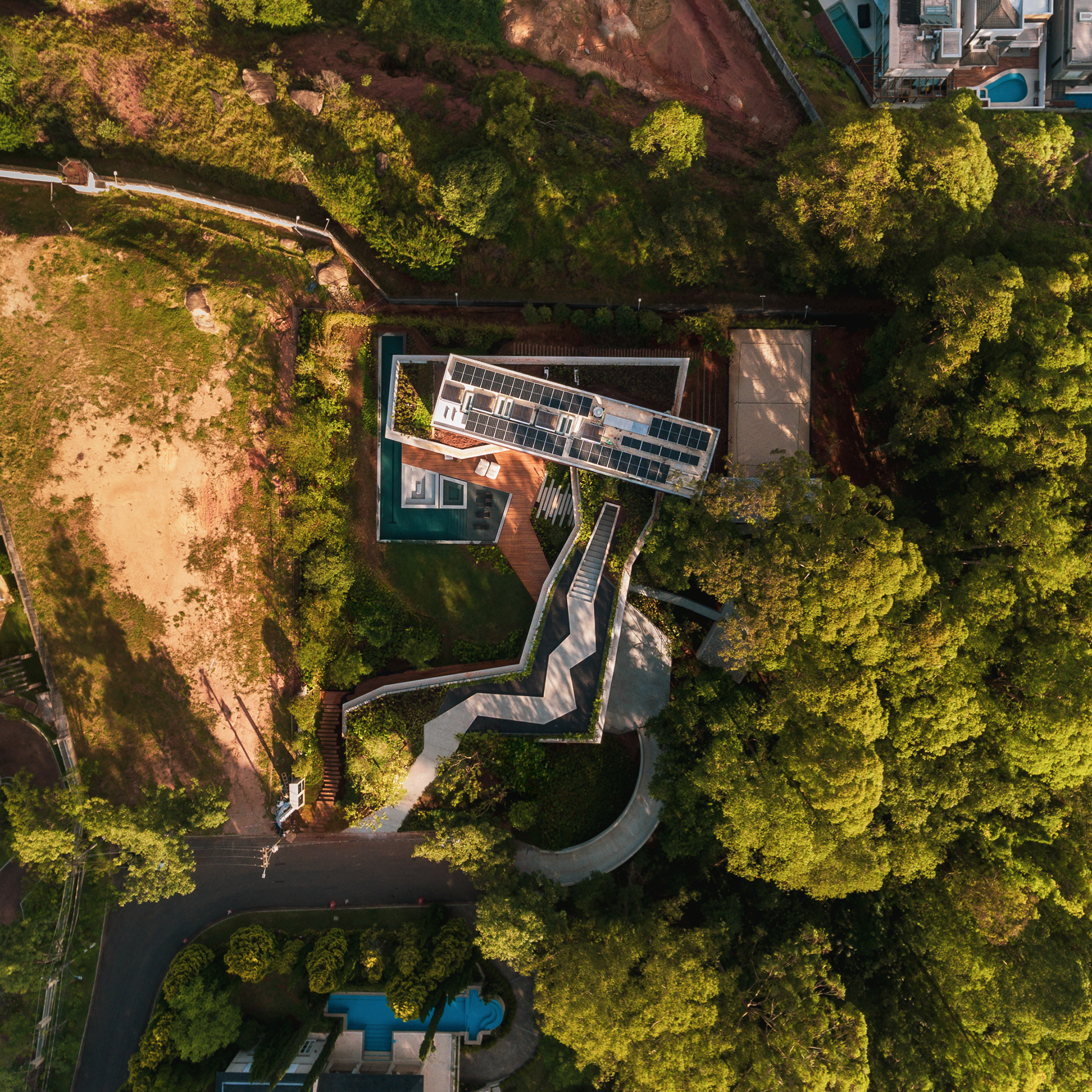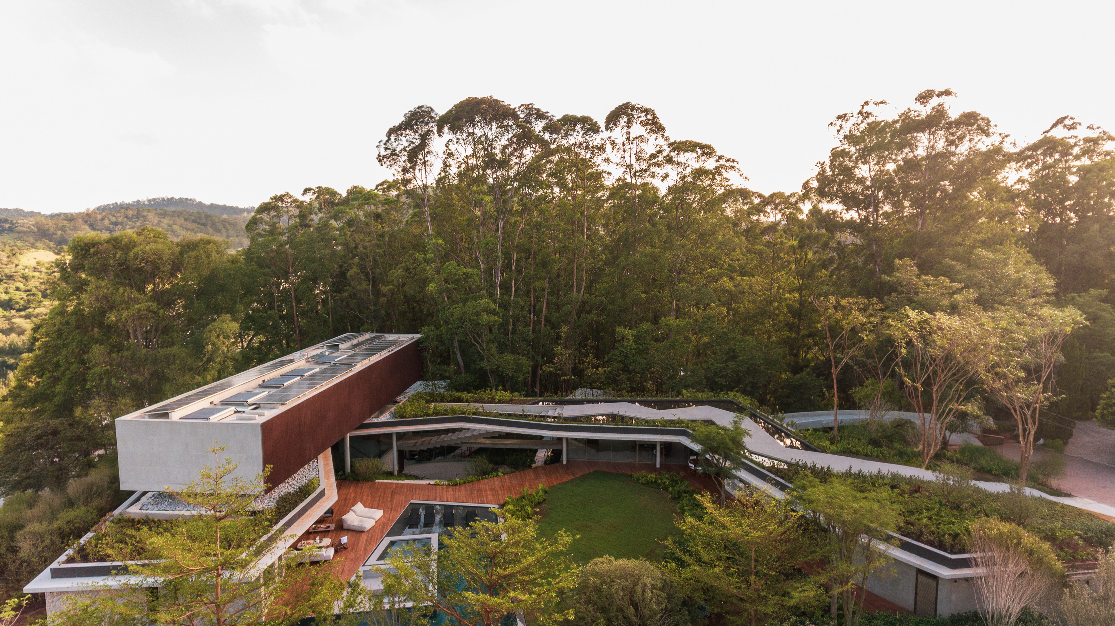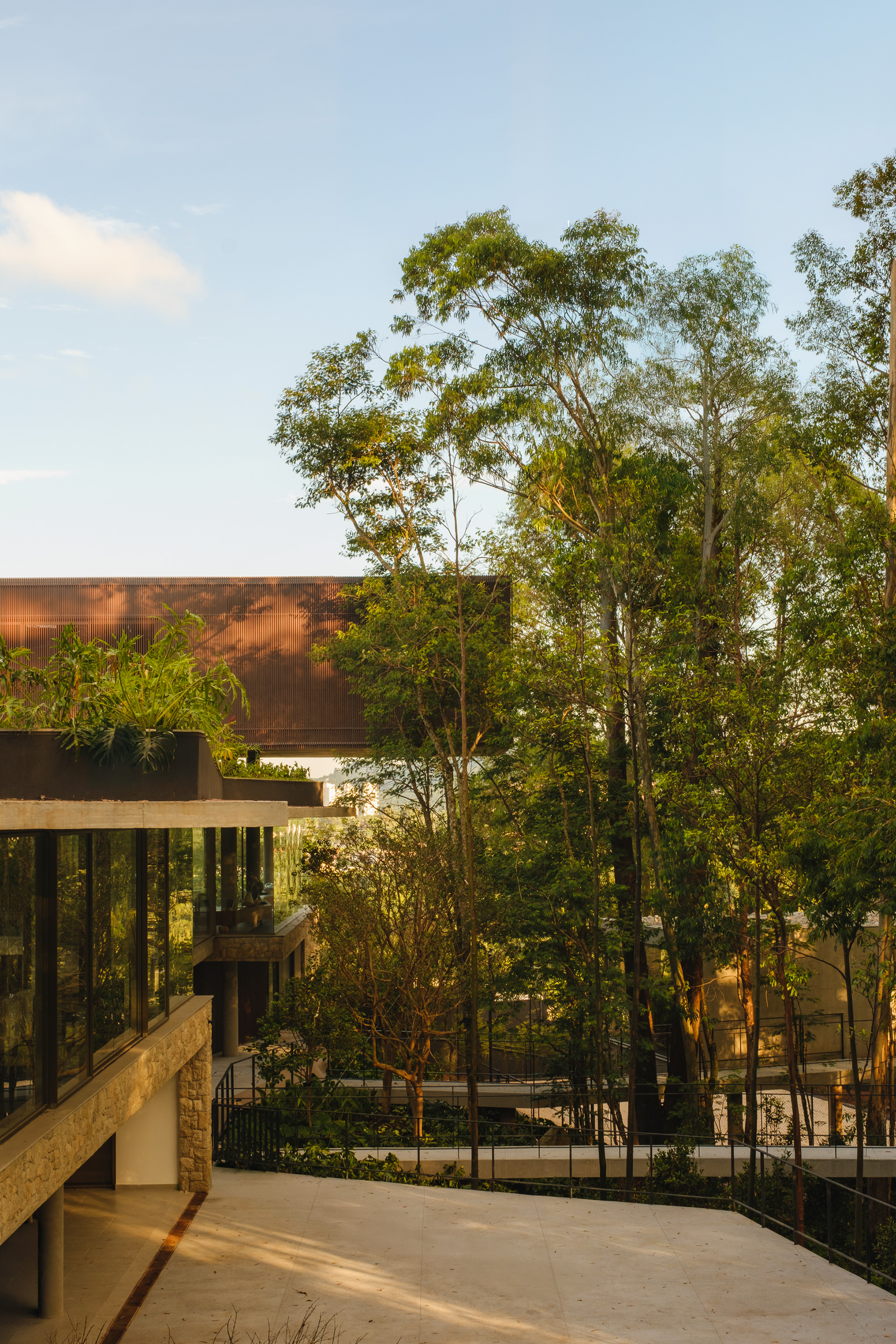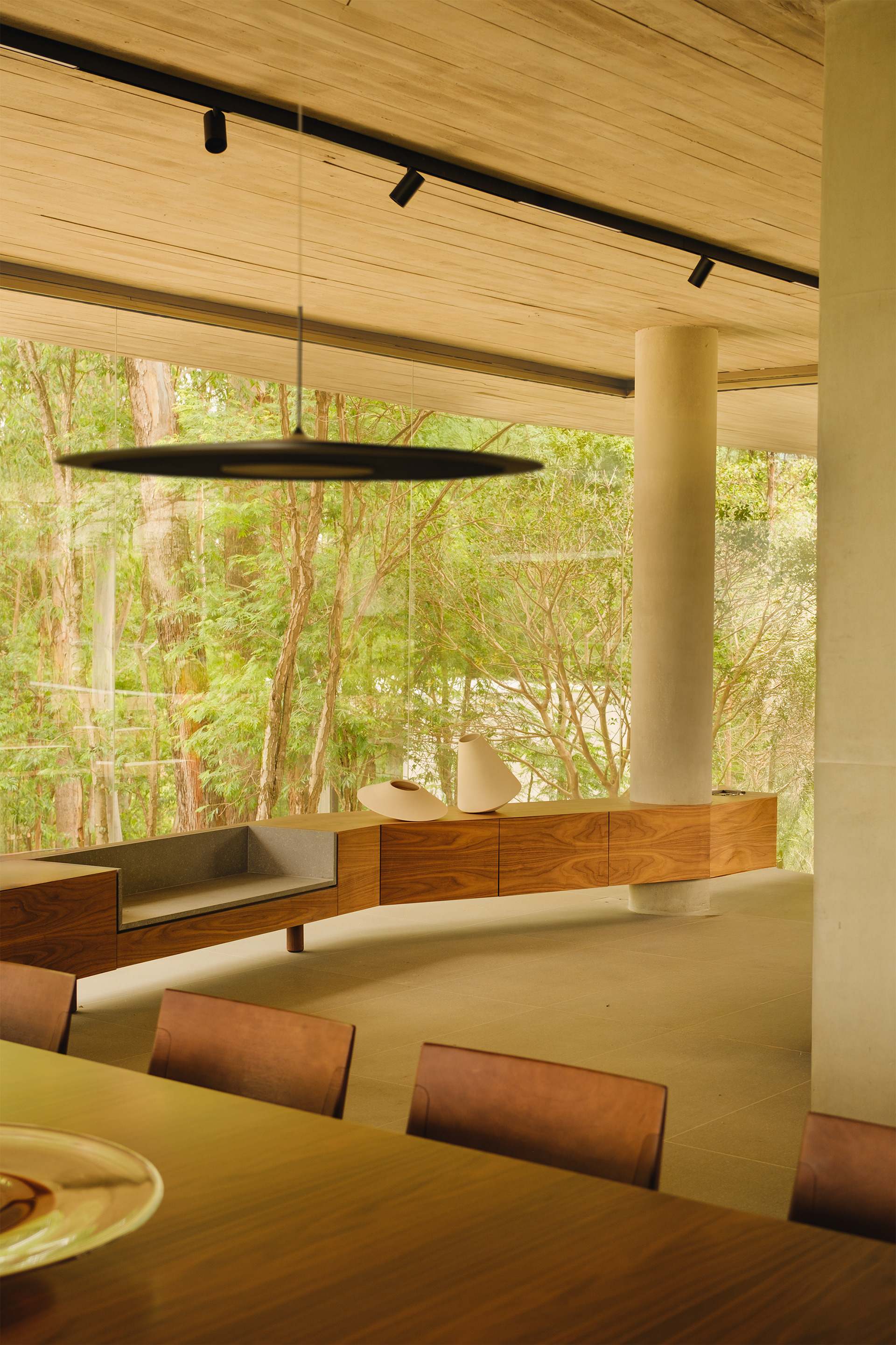 Uma fresta sob essa grande cobertura faz a transição entre o pátio e a área de mata, conectando-as por meio de uma passarela de 14 metros que estabelece um elo entre a área social e a área de lazer. No nível inferior, passarelas suspensas entre as árvores integram volumes sobre pilotis que se elevam na altura das copas. Nestes volumes estão o escritório e a academia, imersos na vegetação existente.