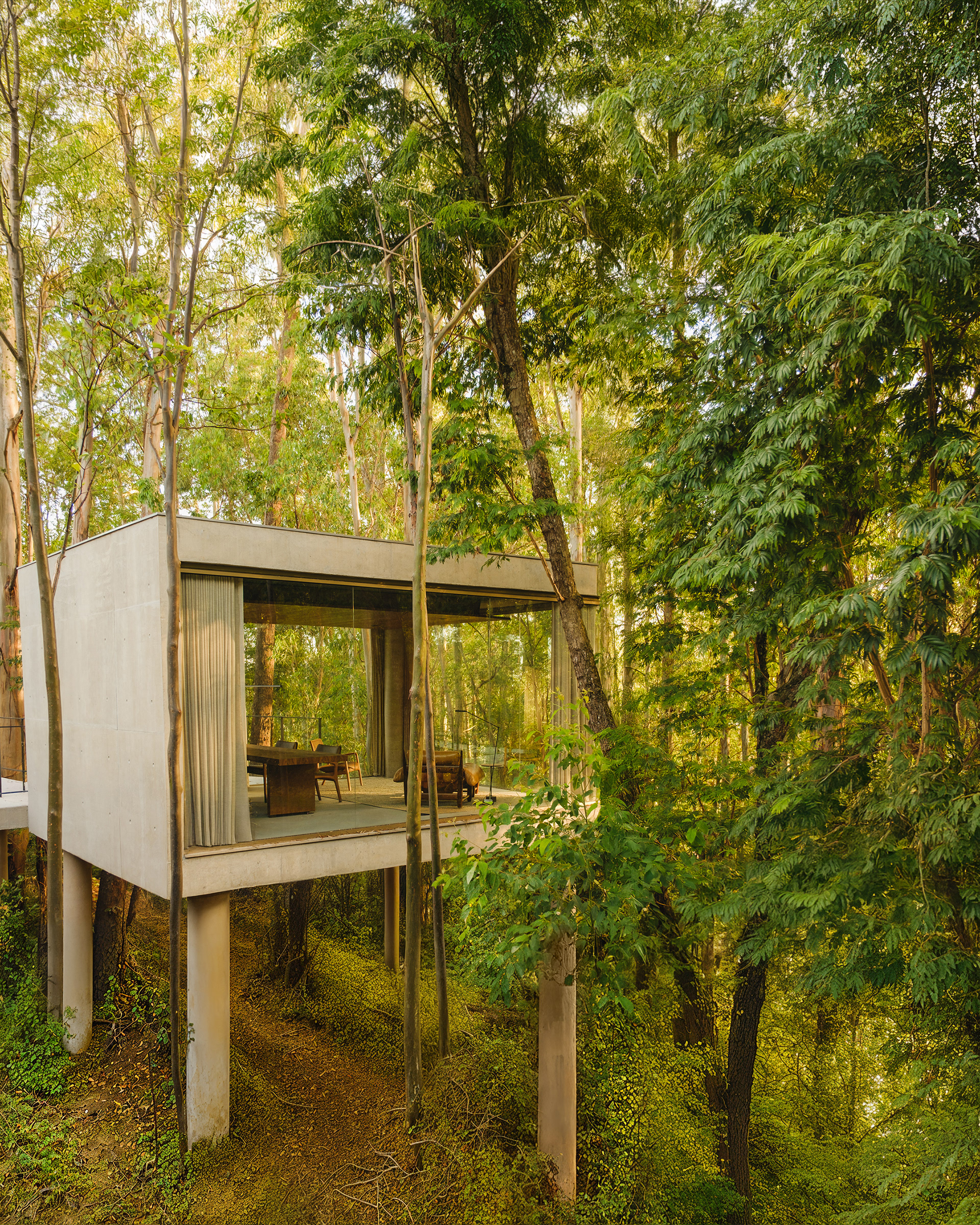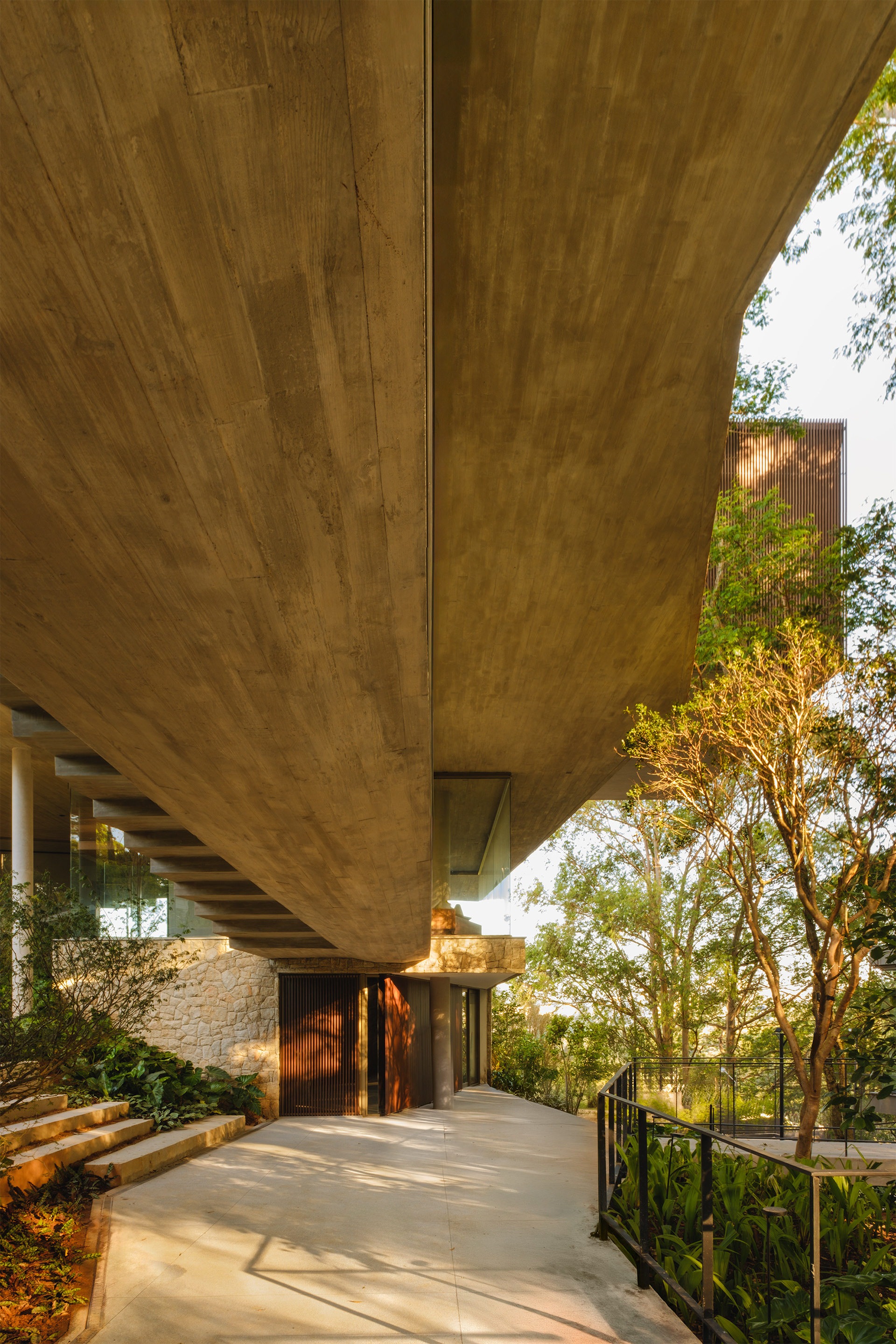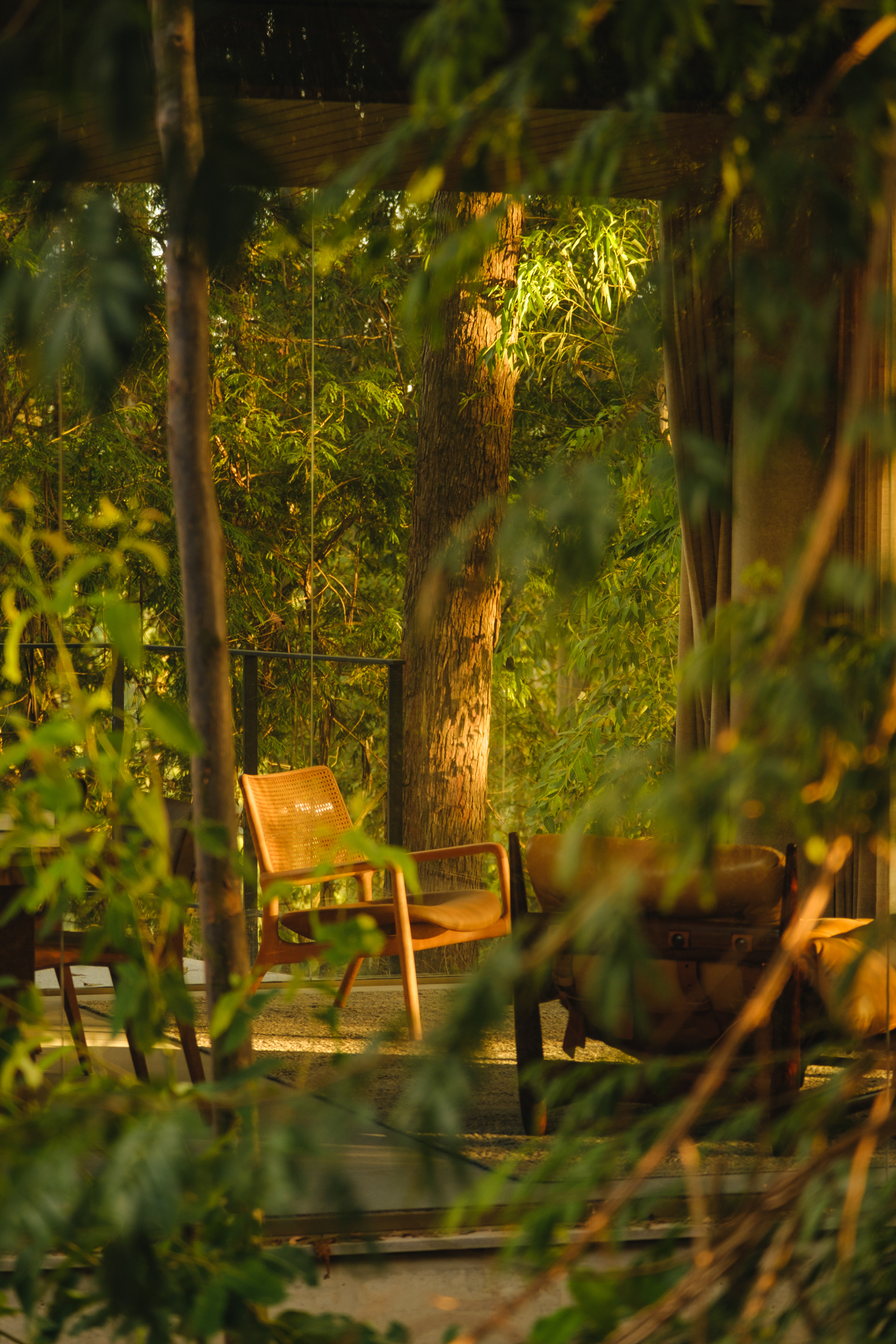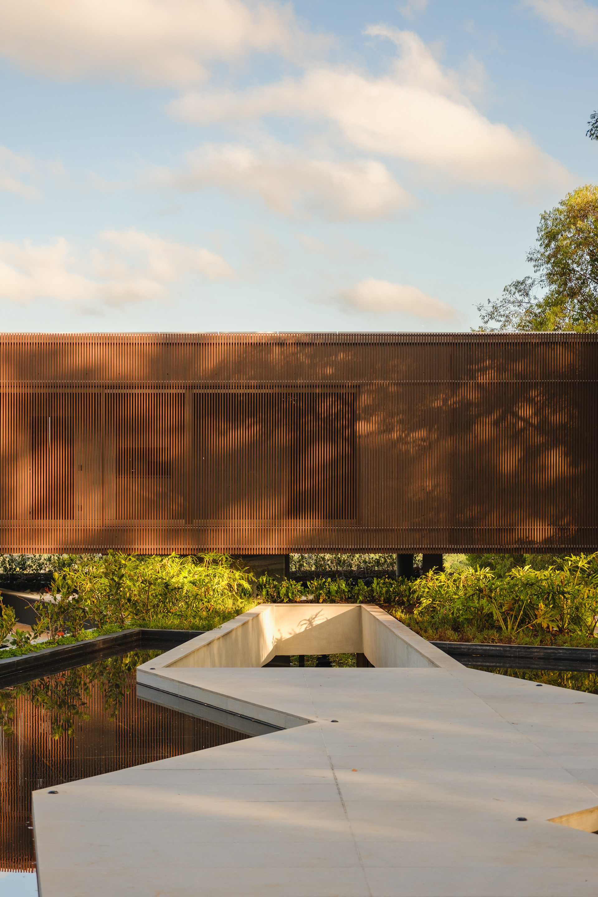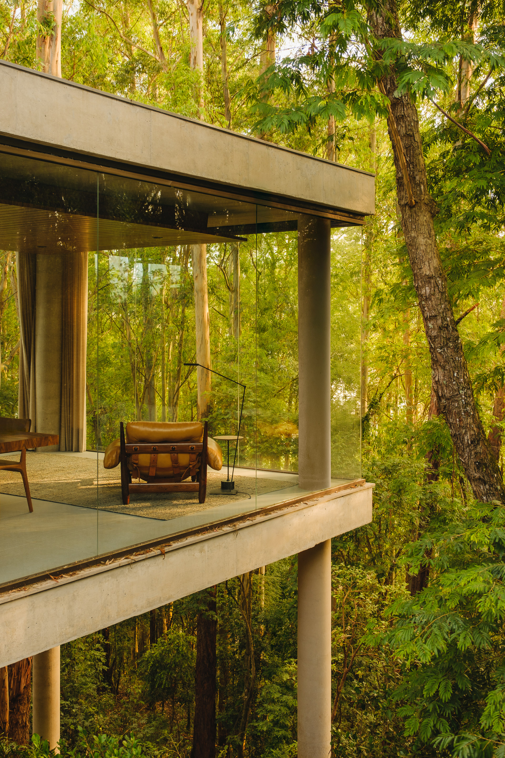 Uma fresta sob essa grande cobertura faz a transição entre o pátio e a área de mata, conectando-as por meio de uma passarela de 14 metros que estabelece um elo entre a área social e a área de lazer. No nível inferior, passarelas suspensas entre as árvores integram volumes sobre pilotis que se elevam na altura das copas. Nestes volumes estão o escritório e a academia, imersos na vegetação existente.