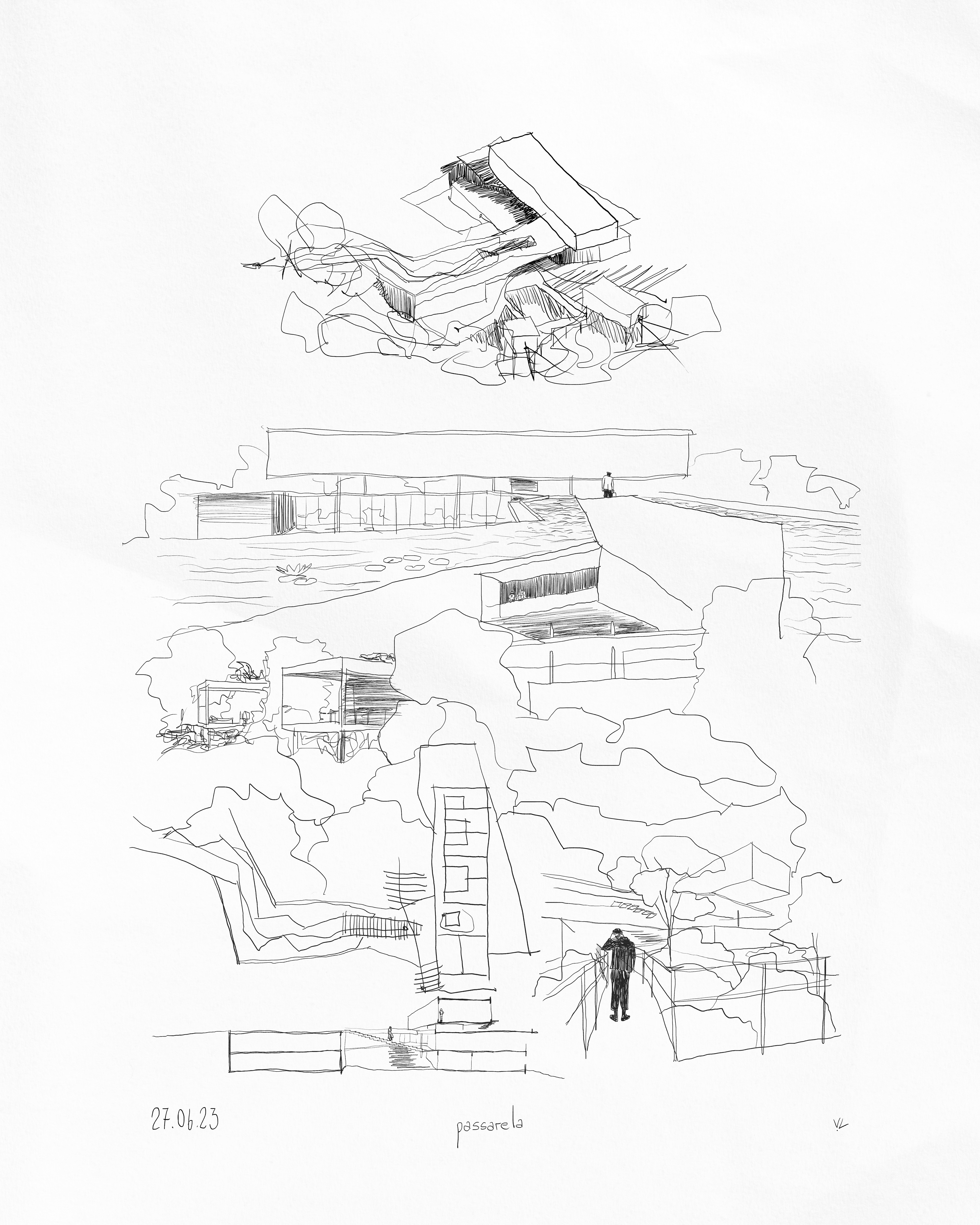 Diante dessa topografia, nossa proposta foi a criação de uma grande laje coberta por um jardim que se alinha ao nível da rua, permitindo que o acesso principal ocorra através de um percurso que rasga um espelho d’água, cercado pelo paisagismo de Alex Hanazaki, e desemboca em uma escada descoberta. Sob essa extensa laje verde, organizamos as áreas sociais e de lazer, que se voltam para o trecho plano do terreno, onde localizamos a piscina e o solário, compondo um pátio interno generoso.