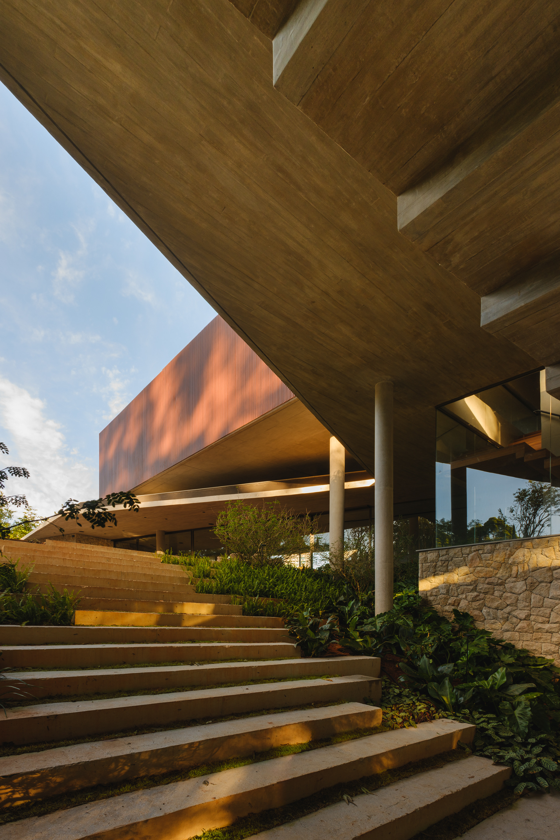A área íntima da residência foi concebida como um volume autônomo, que flutua sobre a laje do pavimento térreo, envolto por brises. Esse volume se abre para a vista da cidade à distância, ao pátio central e às imponentes árvores localizadas na extremidade oposta do lote.