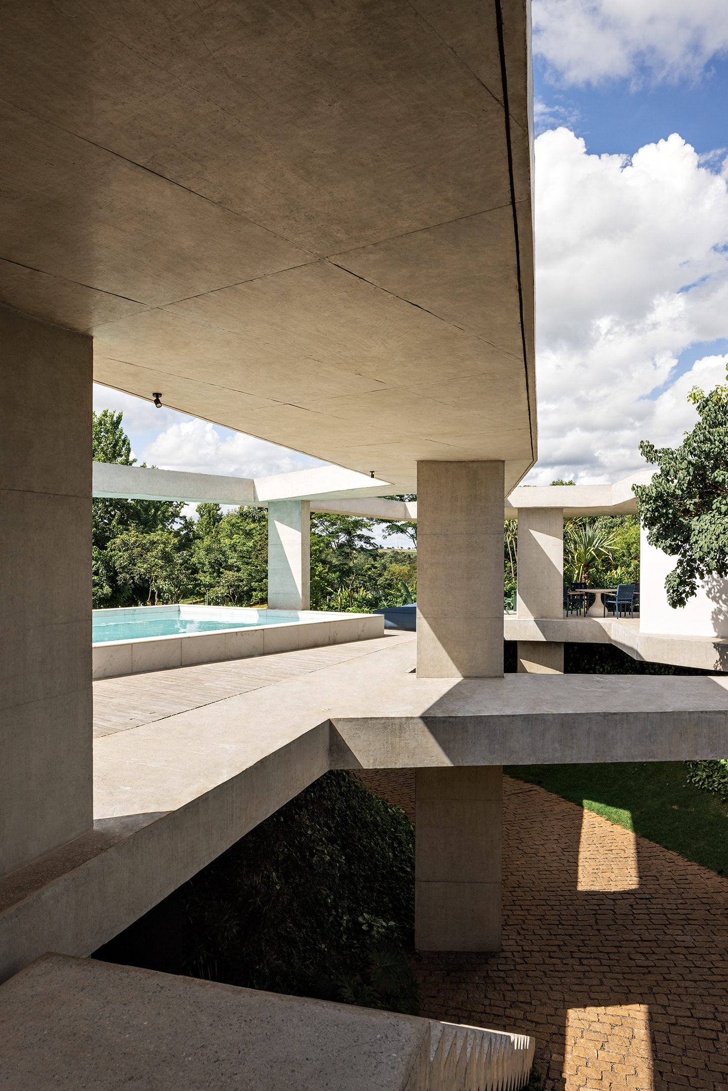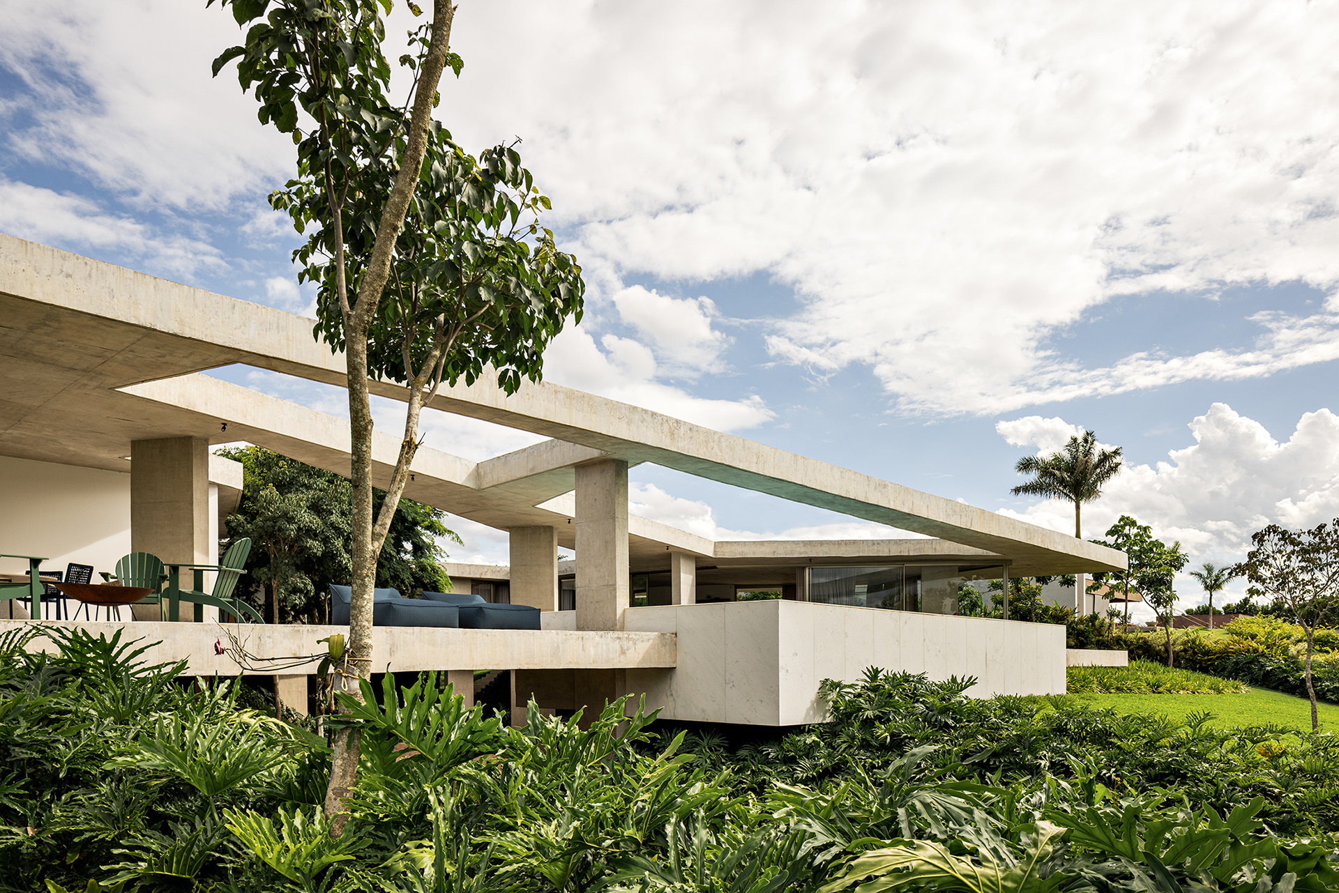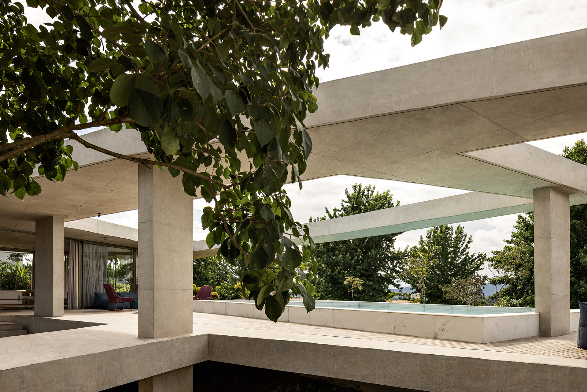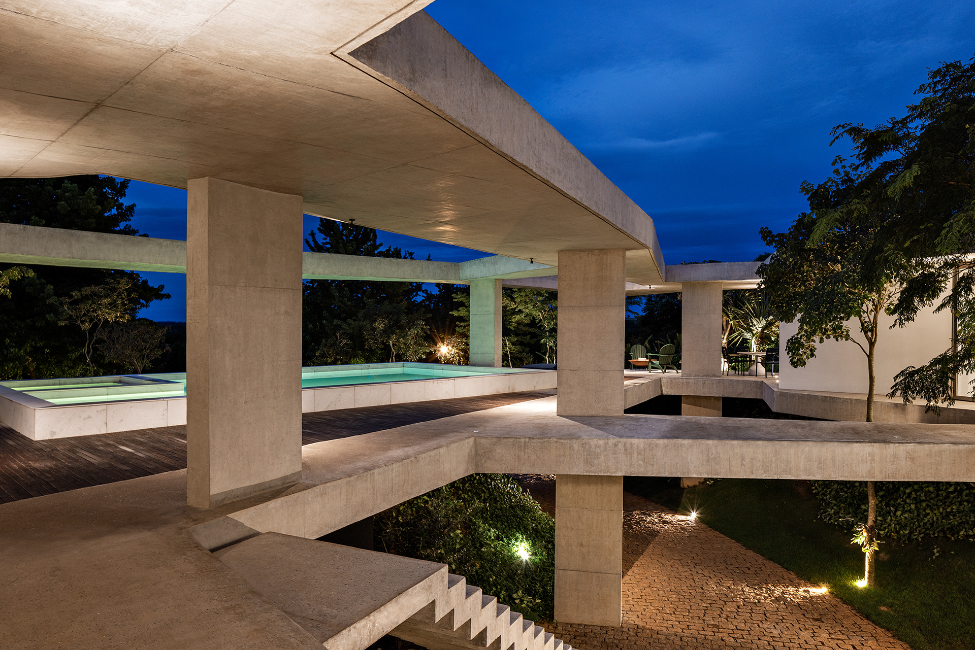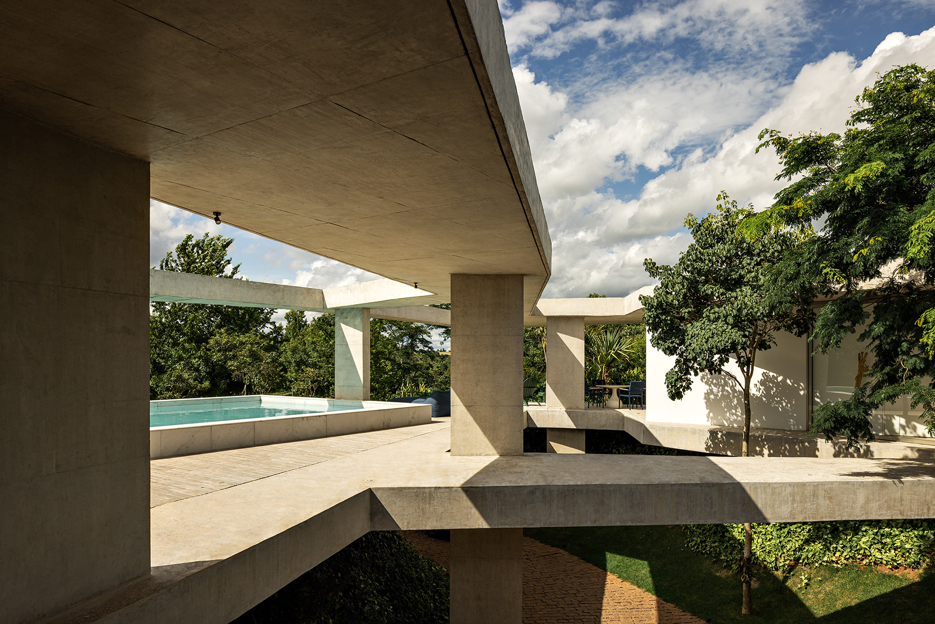 A laje de piso e a de cobertura formam dois planos de concreto aparente que, paralelos, delimitam o espaço onde se distribui o programa. Nele, a maior parte dos ambientes está integrada a terraços externos, com exceção dos quartos e banheiros que, tendo as aberturas voltadas para fora, são como pequenas caixas brancas encaixadas entre as lajes. Contudo, a acentuada horizontalidade do projeto é contrabalançada por vazios abertos nos planos horizontais, desencontrados entre si e associados às escadas. Através dos vazios há a multiplicidade de vistas e o contato visual entre as pessoas na sala, na piscina e no jardim da garagem, bem como a vegetação - as árvores no nível inferior estão crescendo e ocupando parte dos vazios. “O desafio é fazer um programa convencional assumir uma aparência não ordinária”, define o arquiteto.