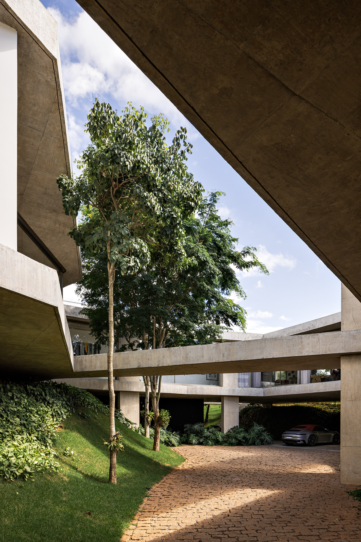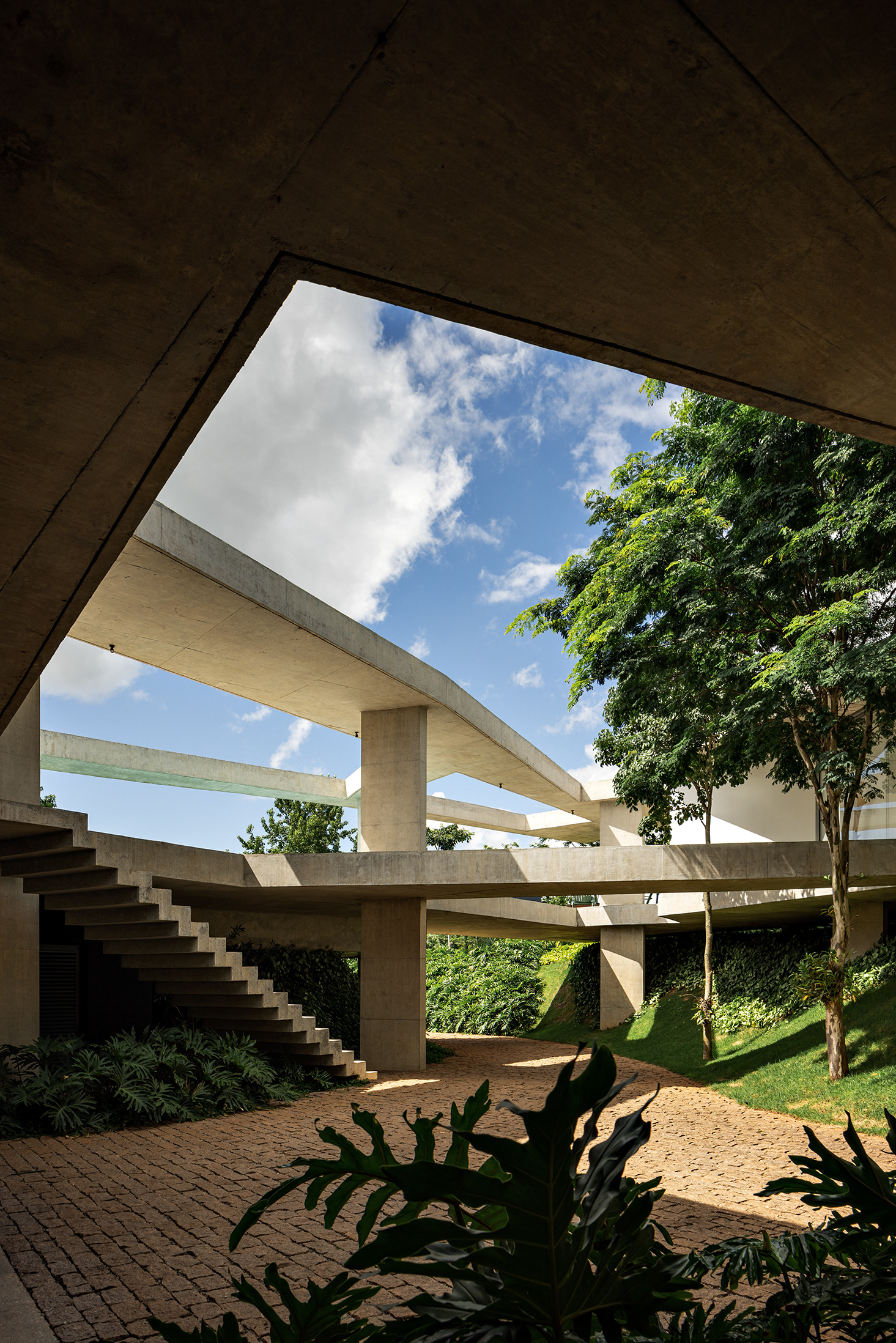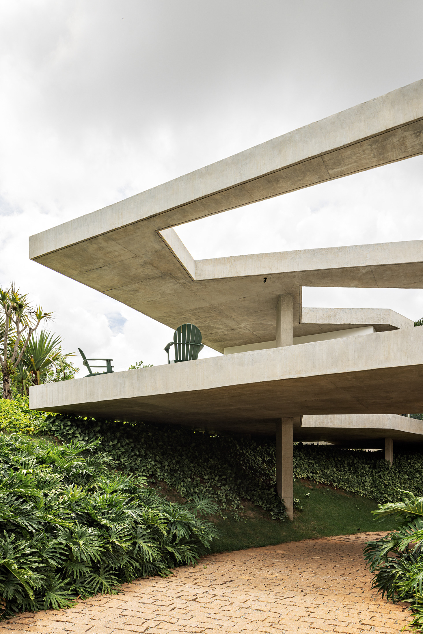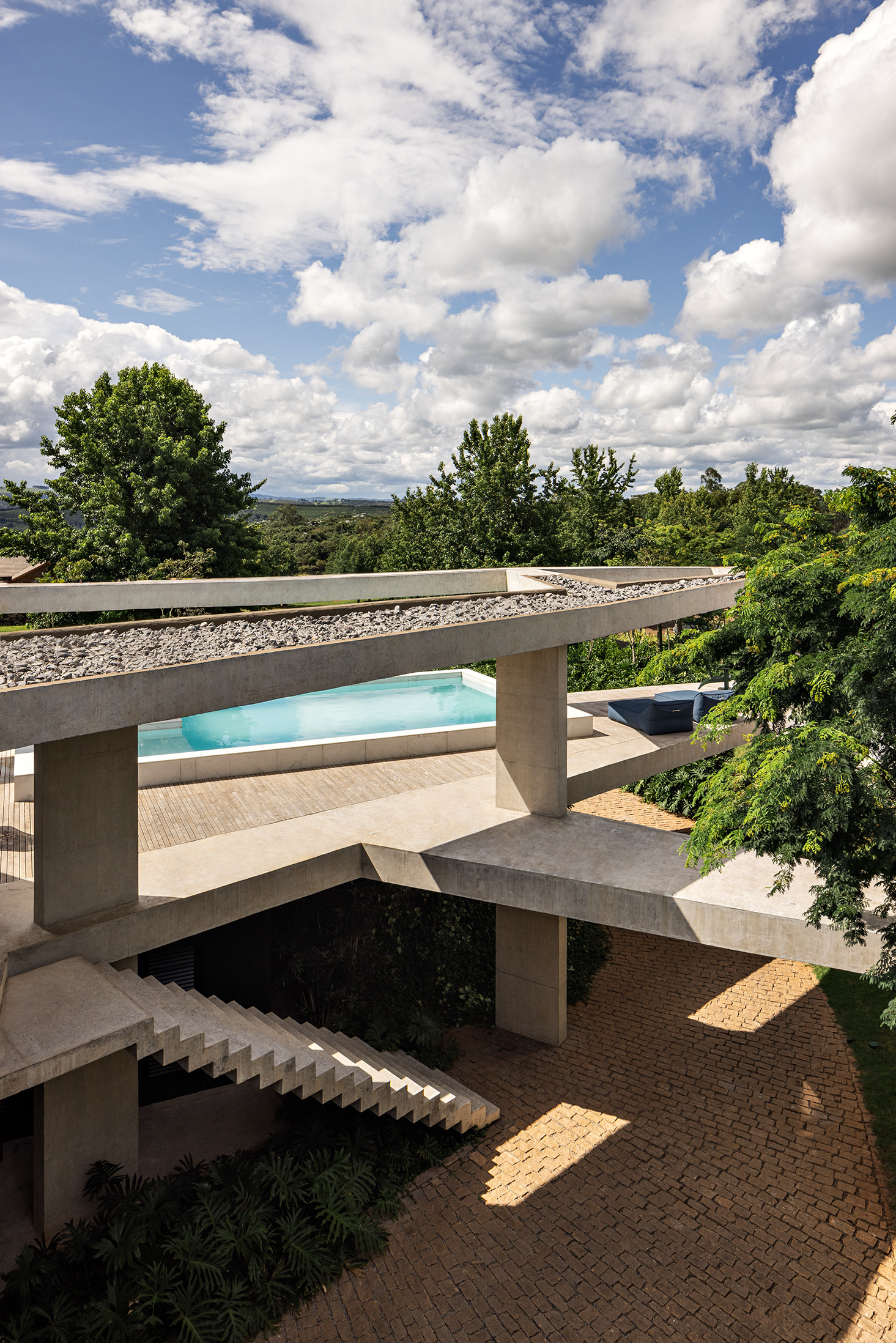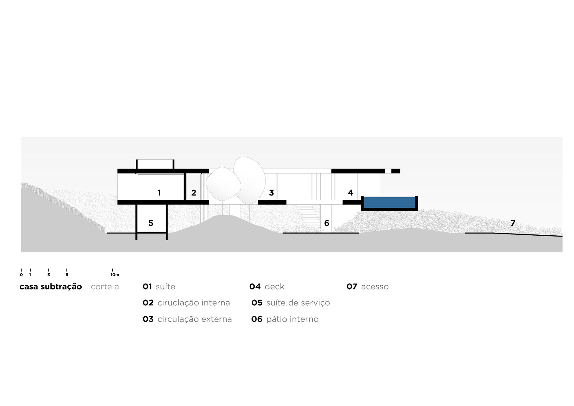 A laje de piso e a de cobertura formam dois planos de concreto aparente que, paralelos, delimitam o espaço onde se distribui o programa. Nele, a maior parte dos ambientes está integrada a terraços externos, com exceção dos quartos e banheiros que, tendo as aberturas voltadas para fora, são como pequenas caixas brancas encaixadas entre as lajes. Contudo, a acentuada horizontalidade do projeto é contrabalançada por vazios abertos nos planos horizontais, desencontrados entre si e associados às escadas. Através dos vazios há a multiplicidade de vistas e o contato visual entre as pessoas na sala, na piscina e no jardim da garagem, bem como a vegetação - as árvores no nível inferior estão crescendo e ocupando parte dos vazios. “O desafio é fazer um programa convencional assumir uma aparência não ordinária”, define o arquiteto.