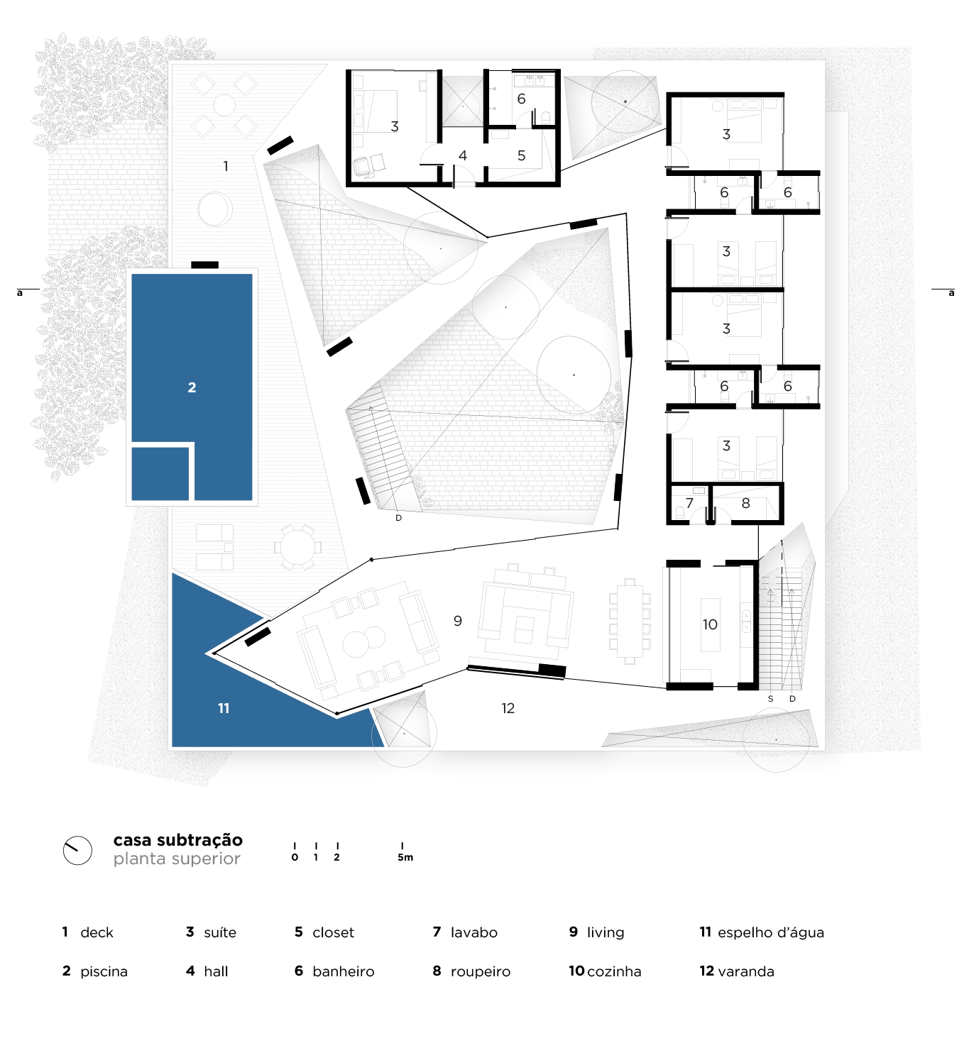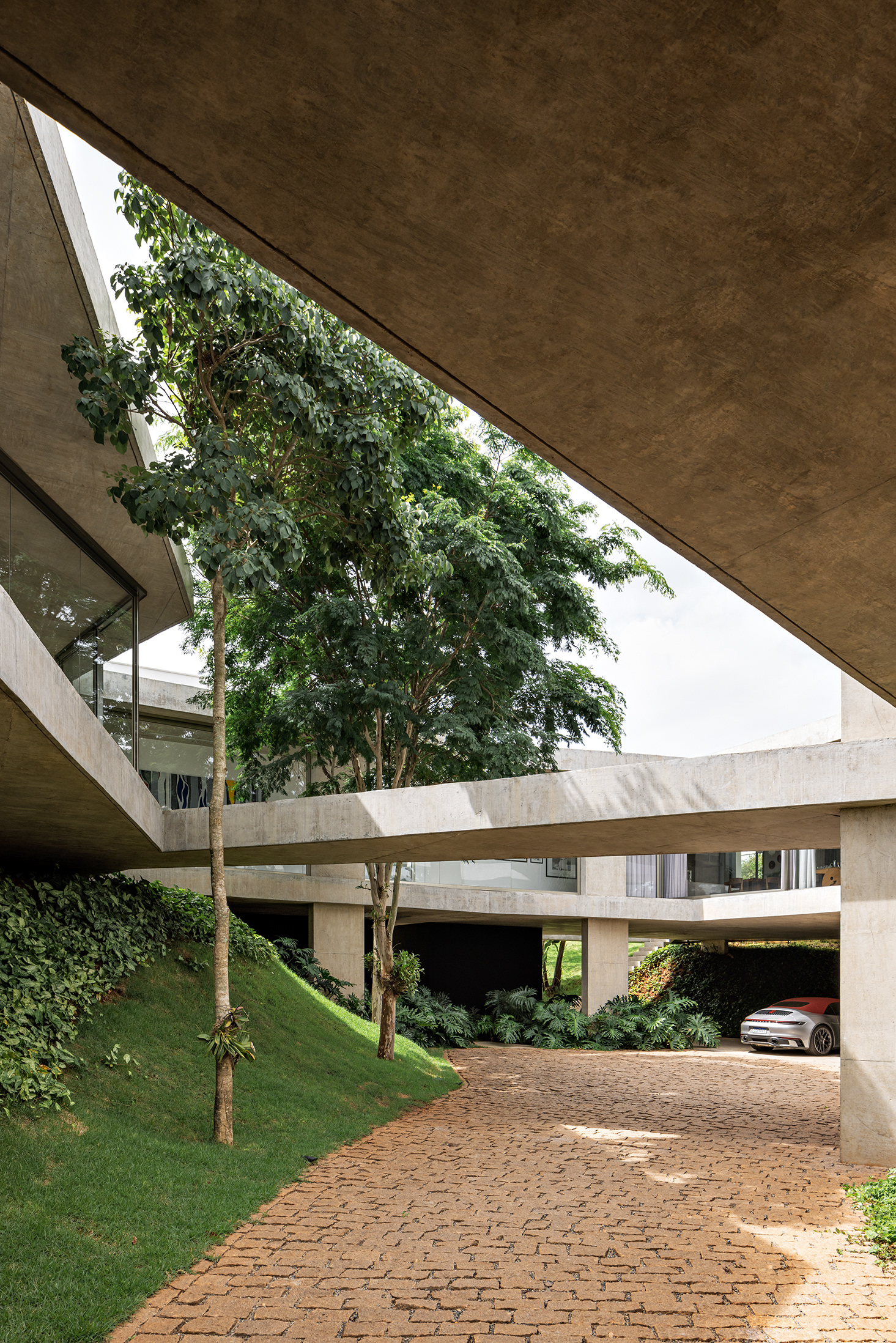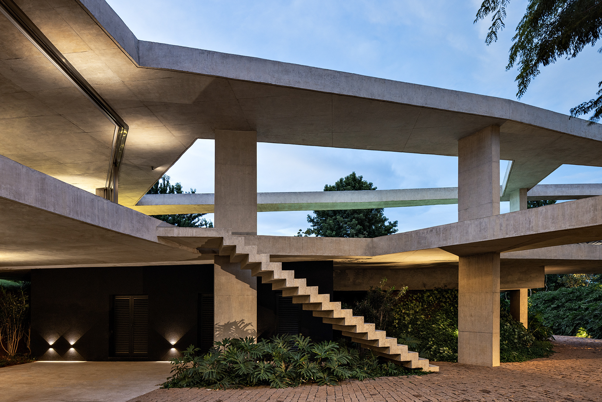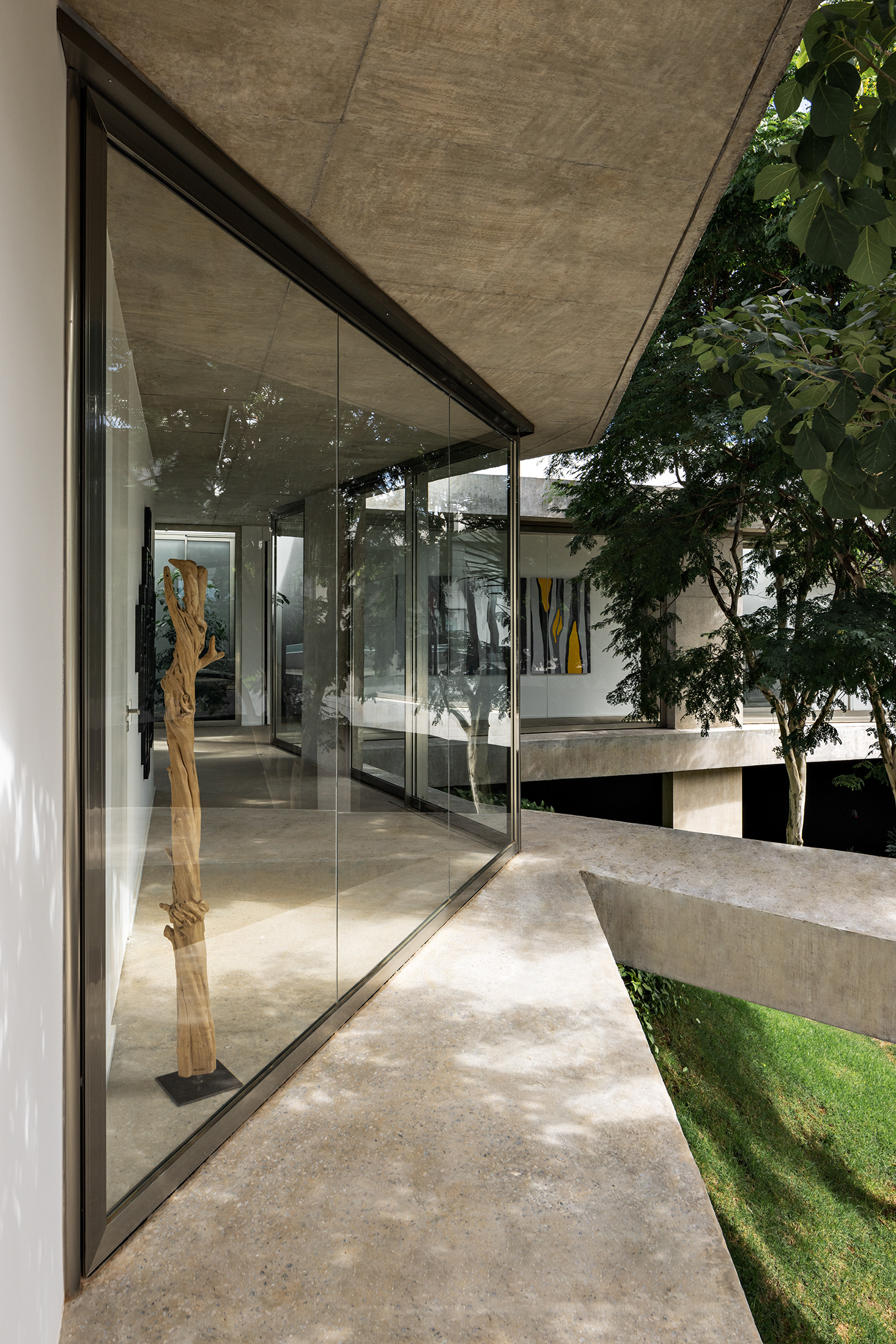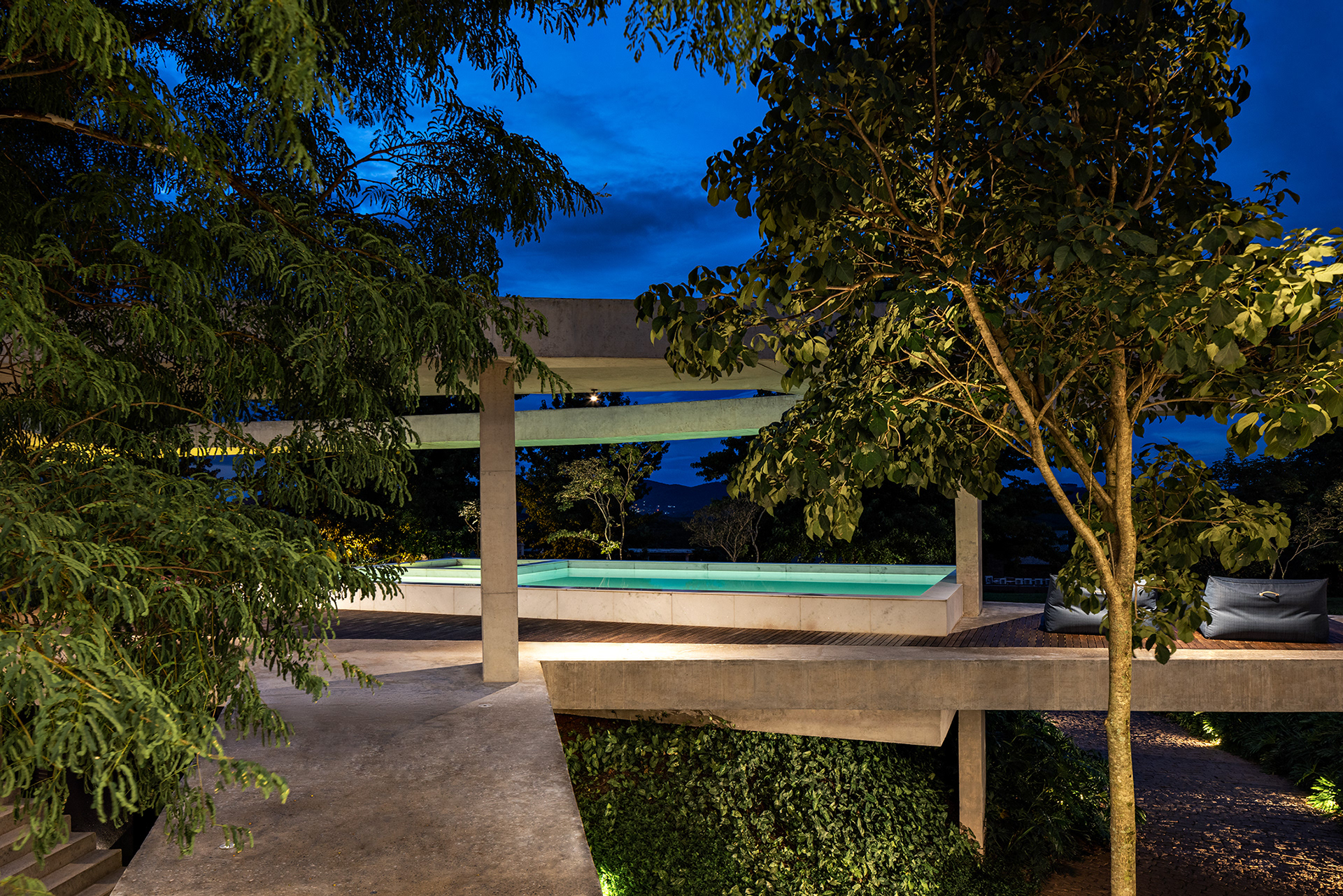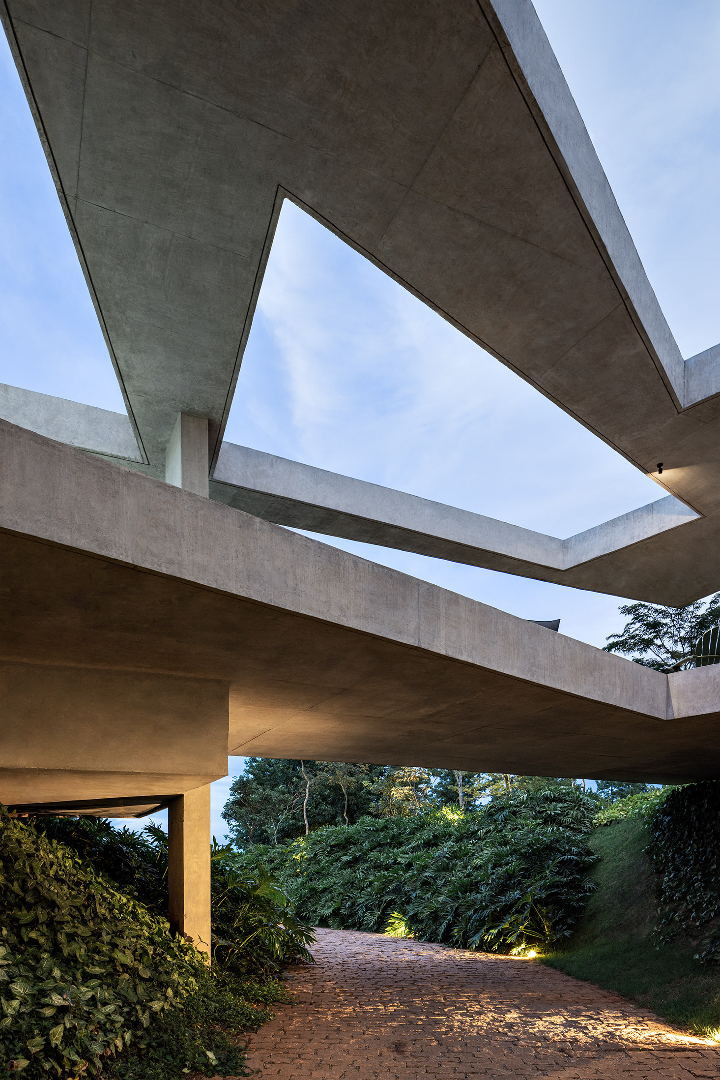 A laje de piso e a de cobertura formam dois planos de concreto aparente que, paralelos, delimitam o espaço onde se distribui o programa. Nele, a maior parte dos ambientes está integrada a terraços externos, com exceção dos quartos e banheiros que, tendo as aberturas voltadas para fora, são como pequenas caixas brancas encaixadas entre as lajes. Contudo, a acentuada horizontalidade do projeto é contrabalançada por vazios abertos nos planos horizontais, desencontrados entre si e associados às escadas. Através dos vazios há a multiplicidade de vistas e o contato visual entre as pessoas na sala, na piscina e no jardim da garagem, bem como a vegetação - as árvores no nível inferior estão crescendo e ocupando parte dos vazios. “O desafio é fazer um programa convencional assumir uma aparência não ordinária”, define o arquiteto.