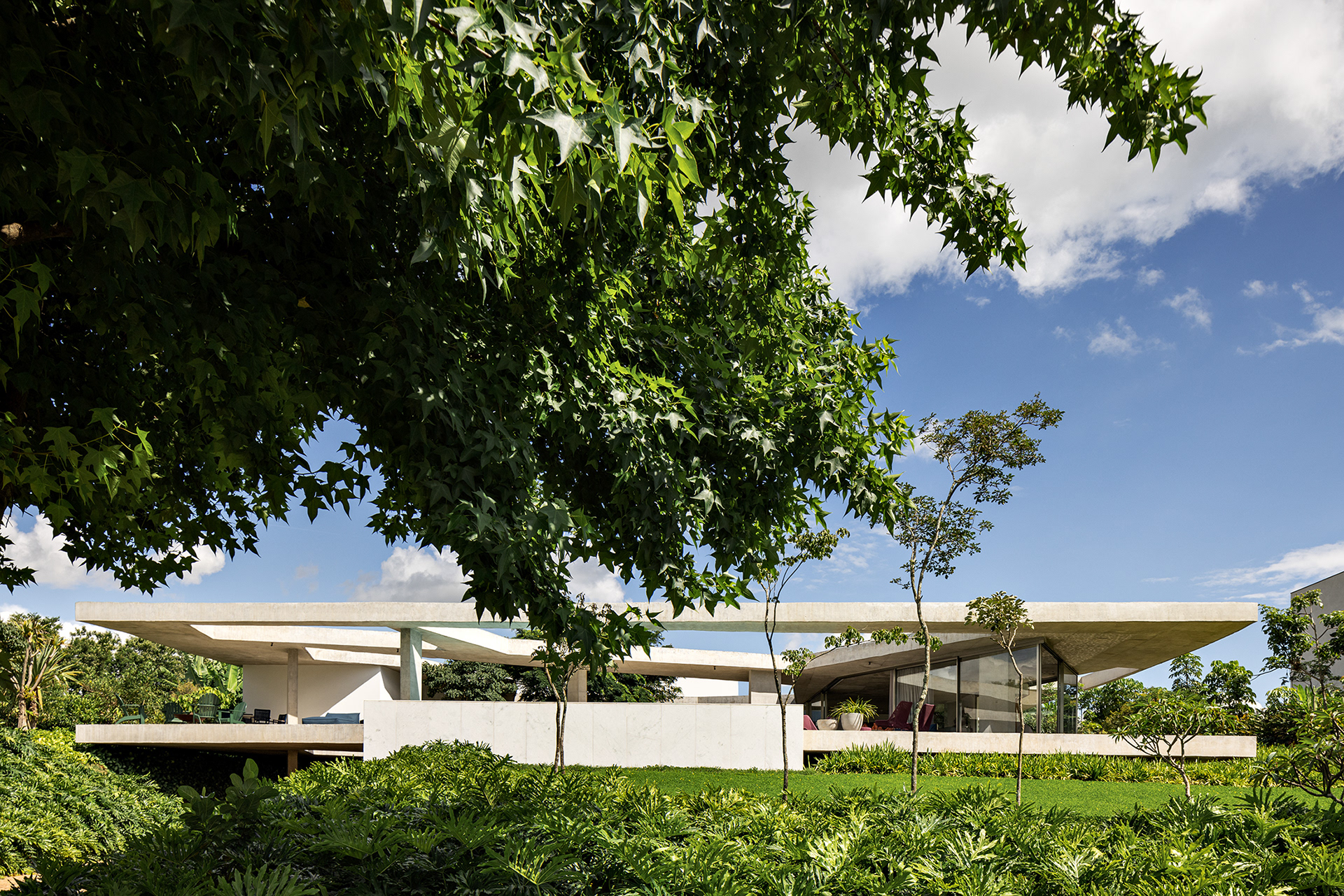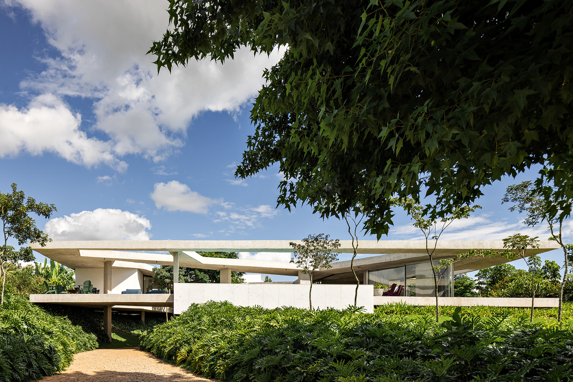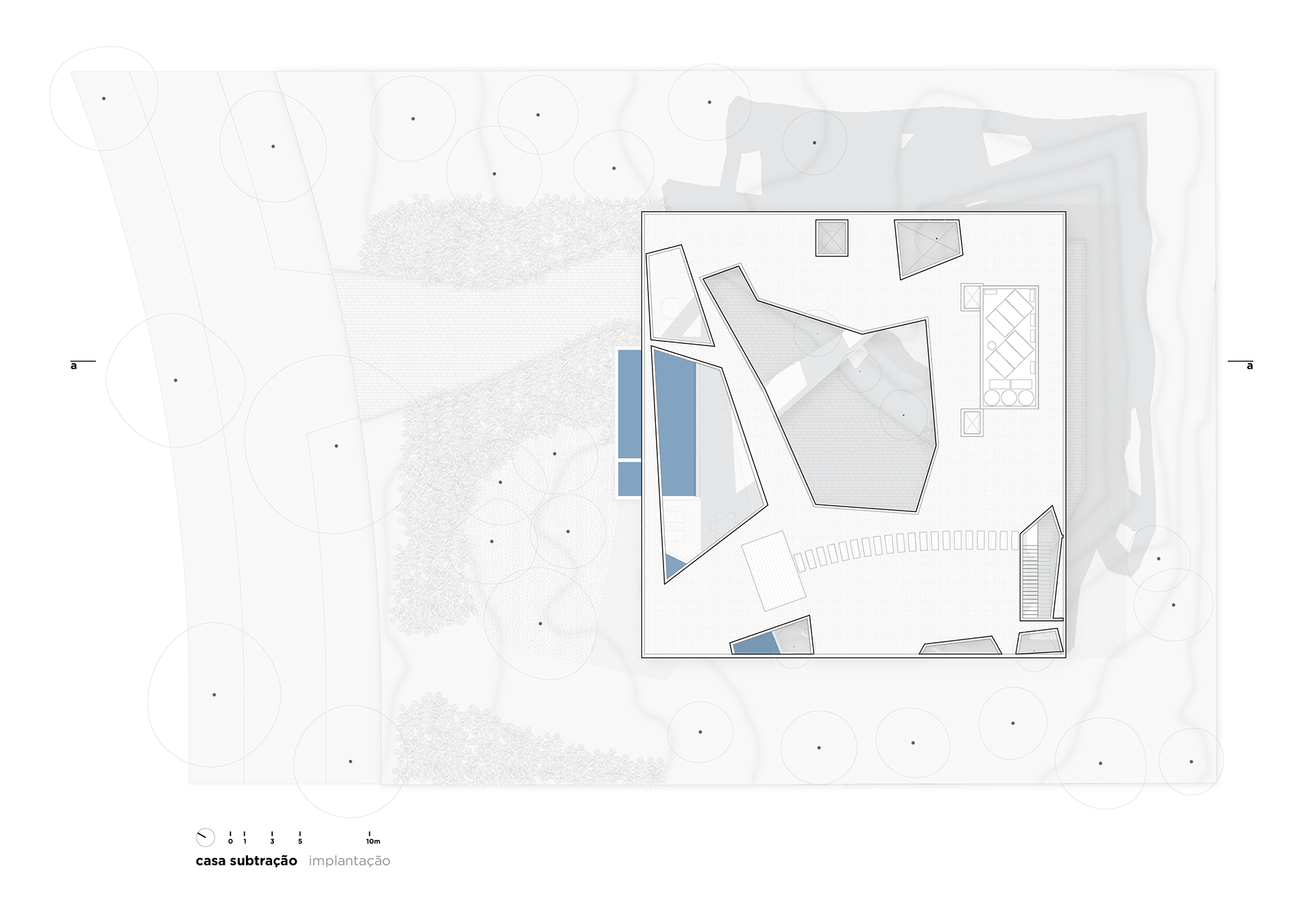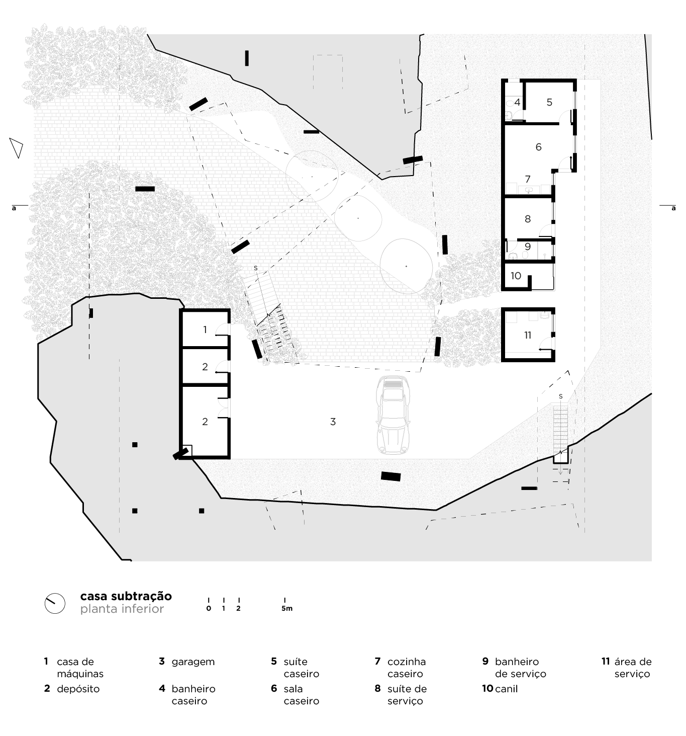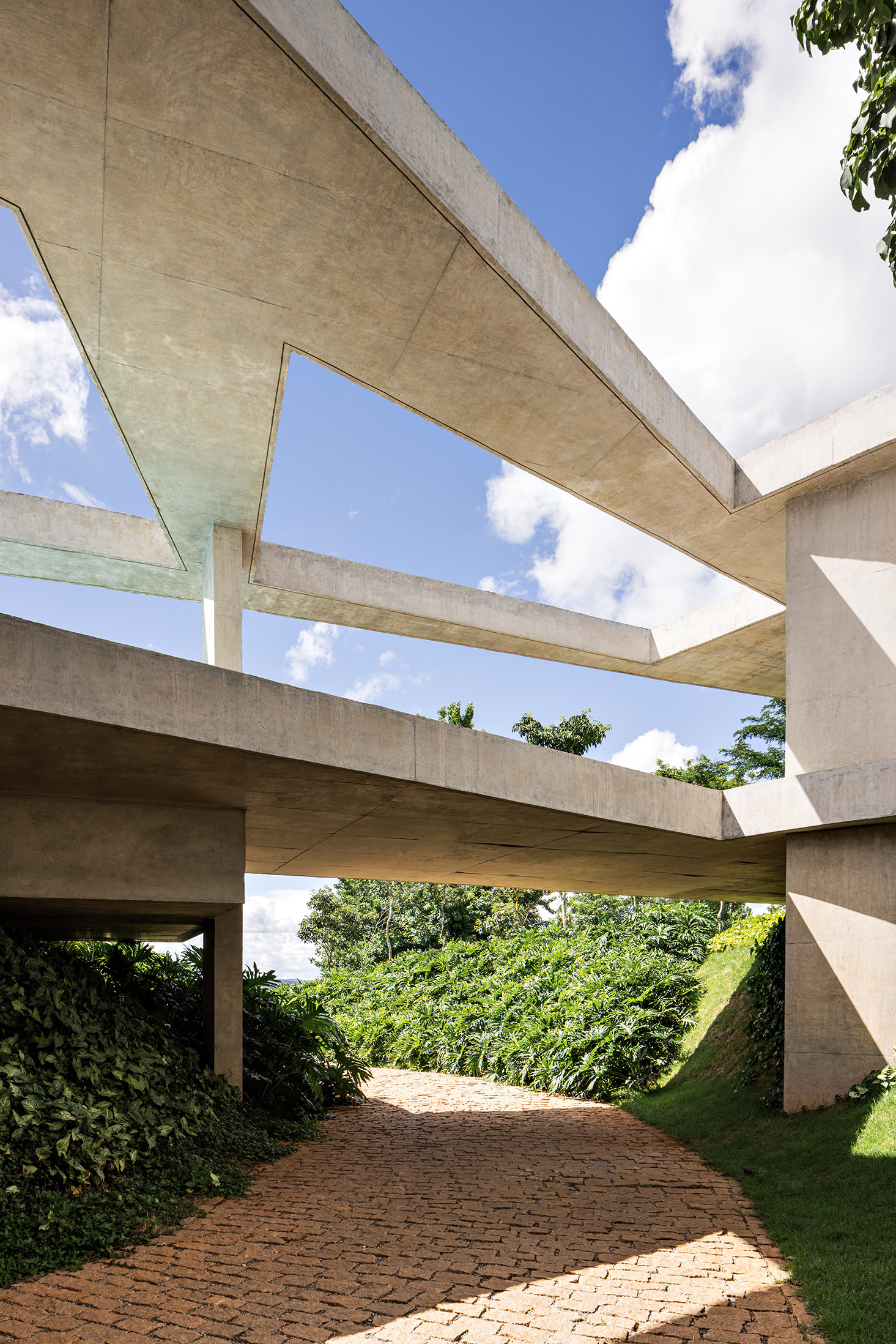 A laje de piso e a de cobertura formam dois planos de concreto aparente que, paralelos, delimitam o espaço onde se distribui o programa. Nele, a maior parte dos ambientes está integrada a terraços externos, com exceção dos quartos e banheiros que, tendo as aberturas voltadas para fora, são como pequenas caixas brancas encaixadas entre as lajes. Contudo, a acentuada horizontalidade do projeto é contrabalançada por vazios abertos nos planos horizontais, desencontrados entre si e associados às escadas. Através dos vazios há a multiplicidade de vistas e o contato visual entre as pessoas na sala, na piscina e no jardim da garagem, bem como a vegetação - as árvores no nível inferior estão crescendo e ocupando parte dos vazios. “O desafio é fazer um programa convencional assumir uma aparência não ordinária”, define o arquiteto.