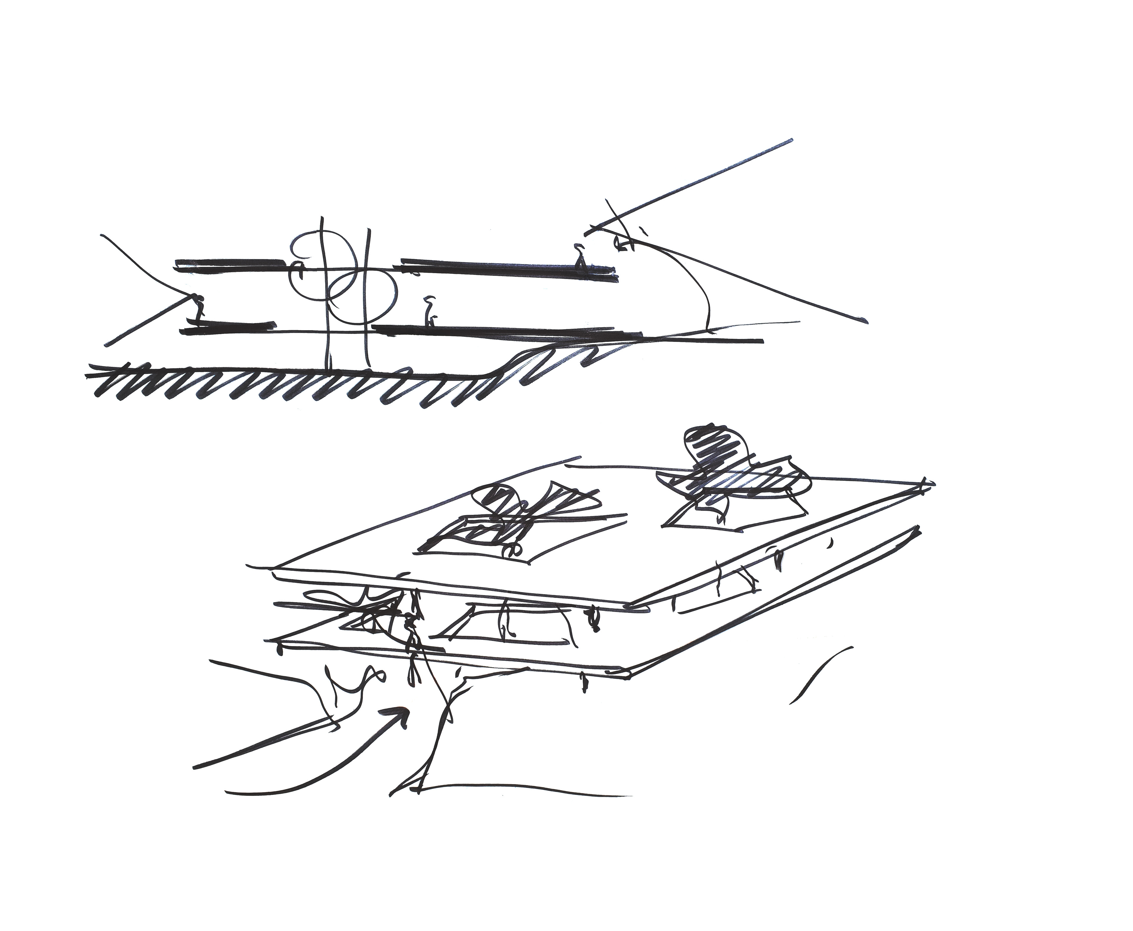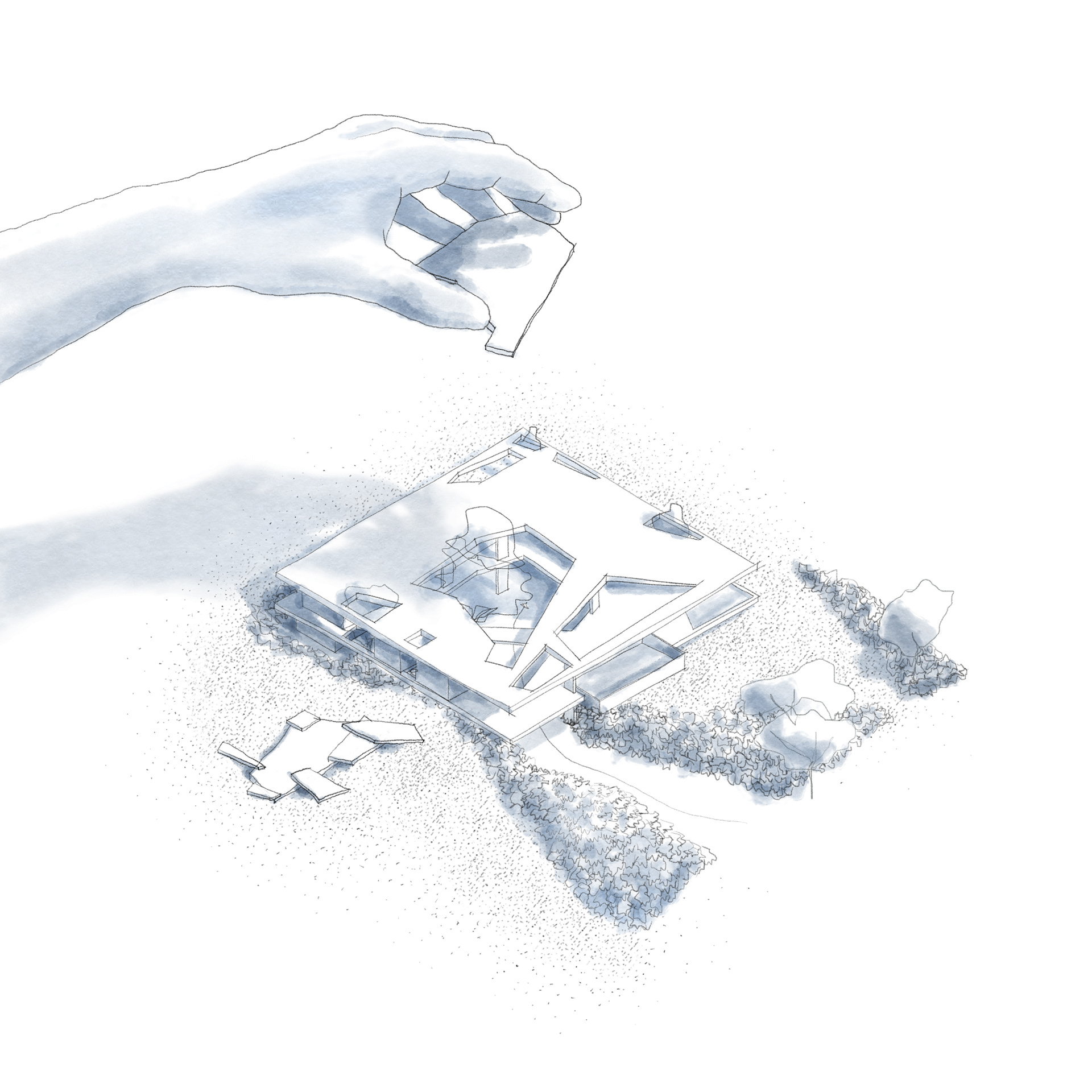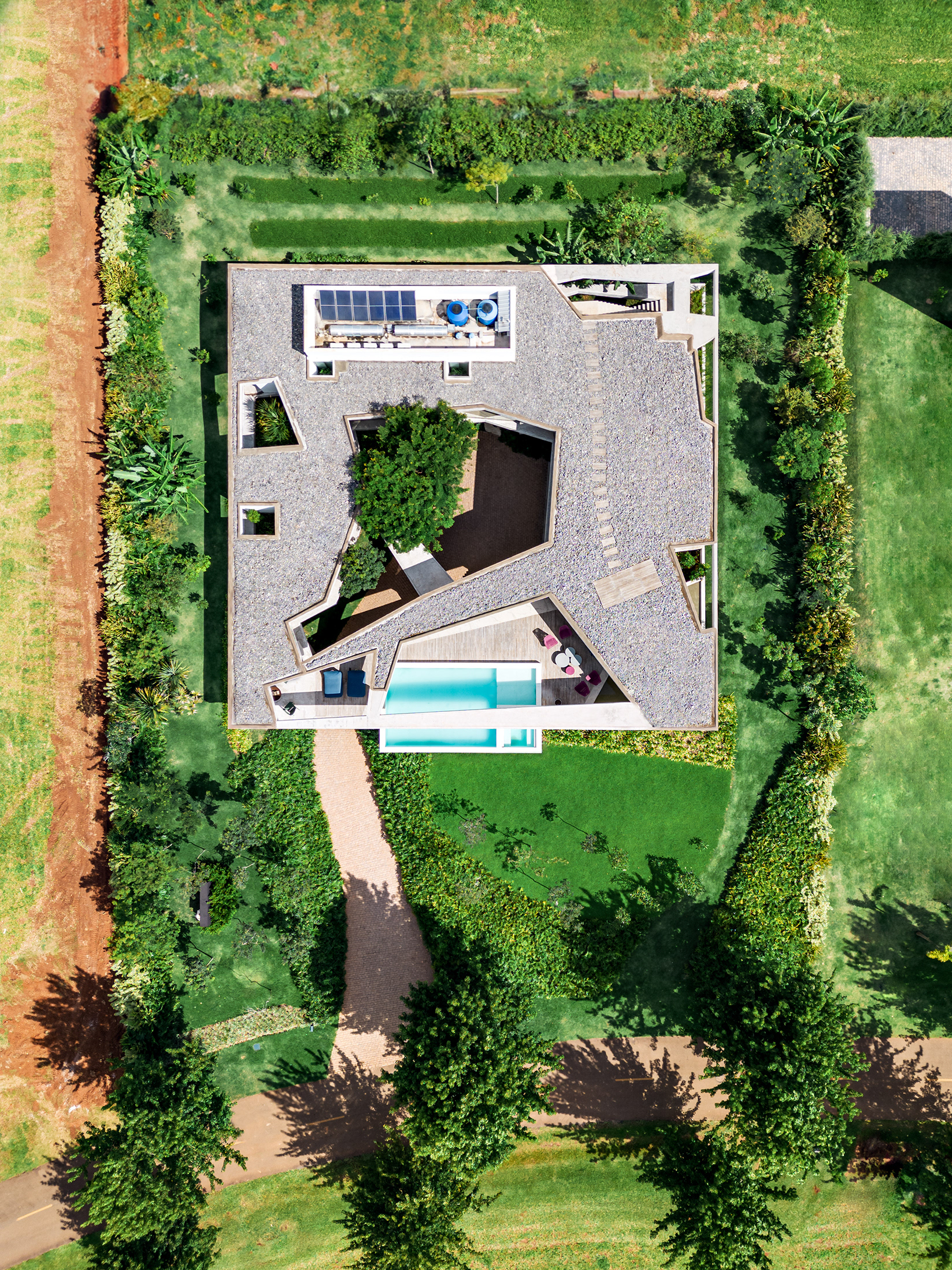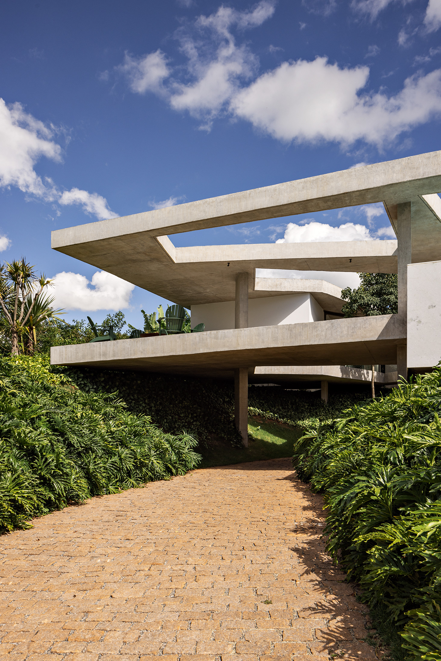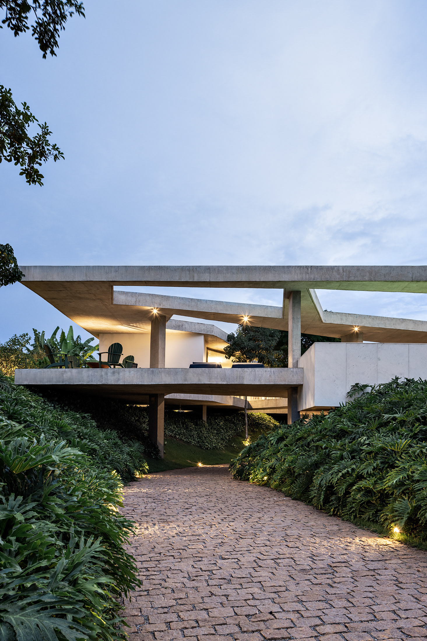 A laje de piso e a de cobertura formam dois planos de concreto aparente que, paralelos, delimitam o espaço onde se distribui o programa. Nele, a maior parte dos ambientes está integrada a terraços externos, com exceção dos quartos e banheiros que, tendo as aberturas voltadas para fora, são como pequenas caixas brancas encaixadas entre as lajes. Contudo, a acentuada horizontalidade do projeto é contrabalançada por vazios abertos nos planos horizontais, desencontrados entre si e associados às escadas. Através dos vazios há a multiplicidade de vistas e o contato visual entre as pessoas na sala, na piscina e no jardim da garagem, bem como a vegetação - as árvores no nível inferior estão crescendo e ocupando parte dos vazios. “O desafio é fazer um programa convencional assumir uma aparência não ordinária”, define o arquiteto.