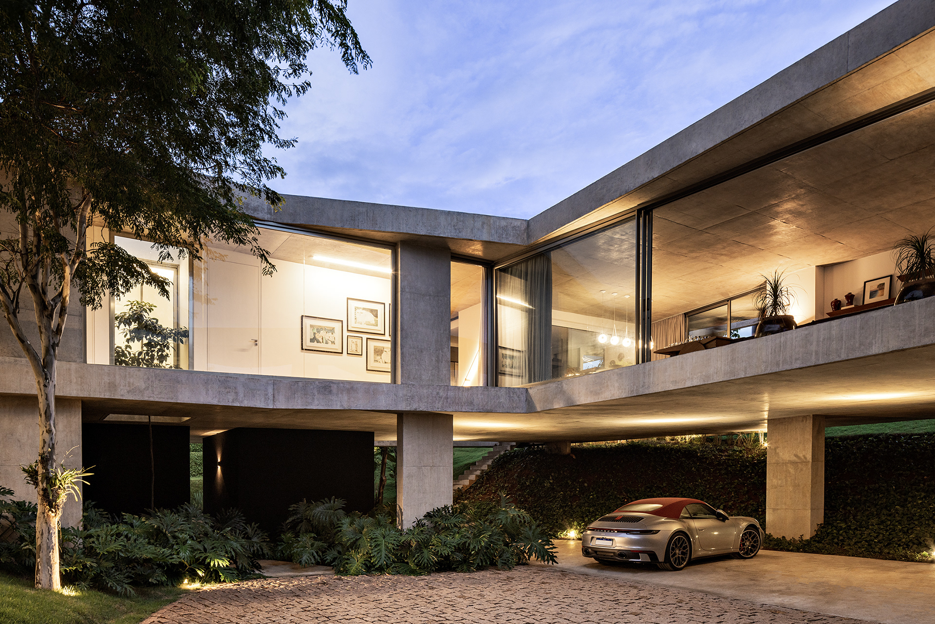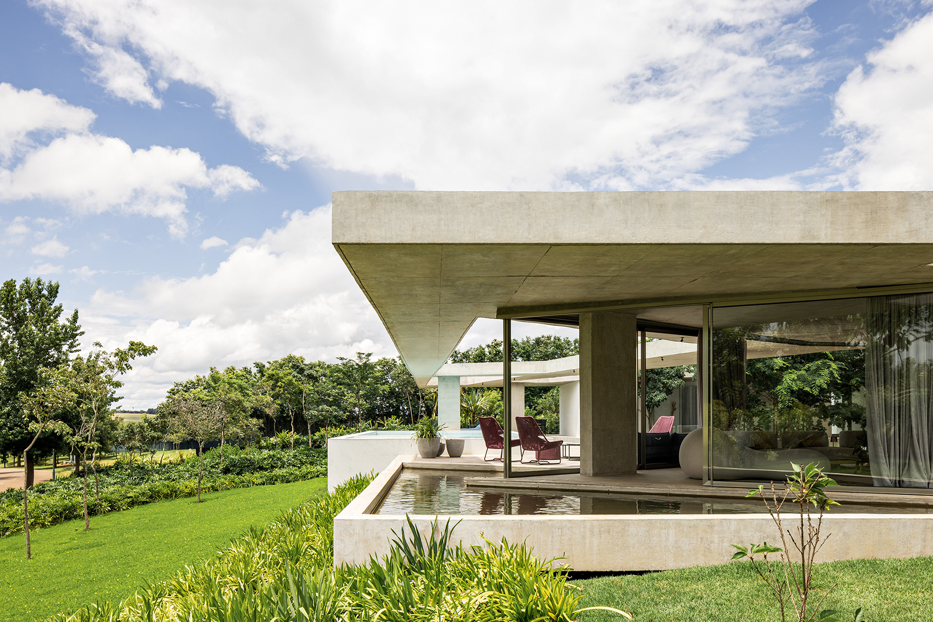 Localizada no Quinta da Baroneza, um condomínio residencial de alto padrão em Bragança Paulista, estância climática a 90 quilômetros da capital paulista, esta casa foi projetada para um casal e seu filho adolescente e implantada em um lote quadrado, com leve aclive e generosa vista. Como a futura construção de residências ao redor poderia comprometer boa parte das visuais, os arquitetos optaram por escavar o terreno na sua faixa central. Criou-se, assim, o subsolo com pátio iluminado, garagem e jardim no nível da rua, elevando-se em contrapartida a casa em relação ao solo. “Como a rua vai caindo, a vista frontal foi preservada”, explica o arquiteto, um dos autores do projeto.