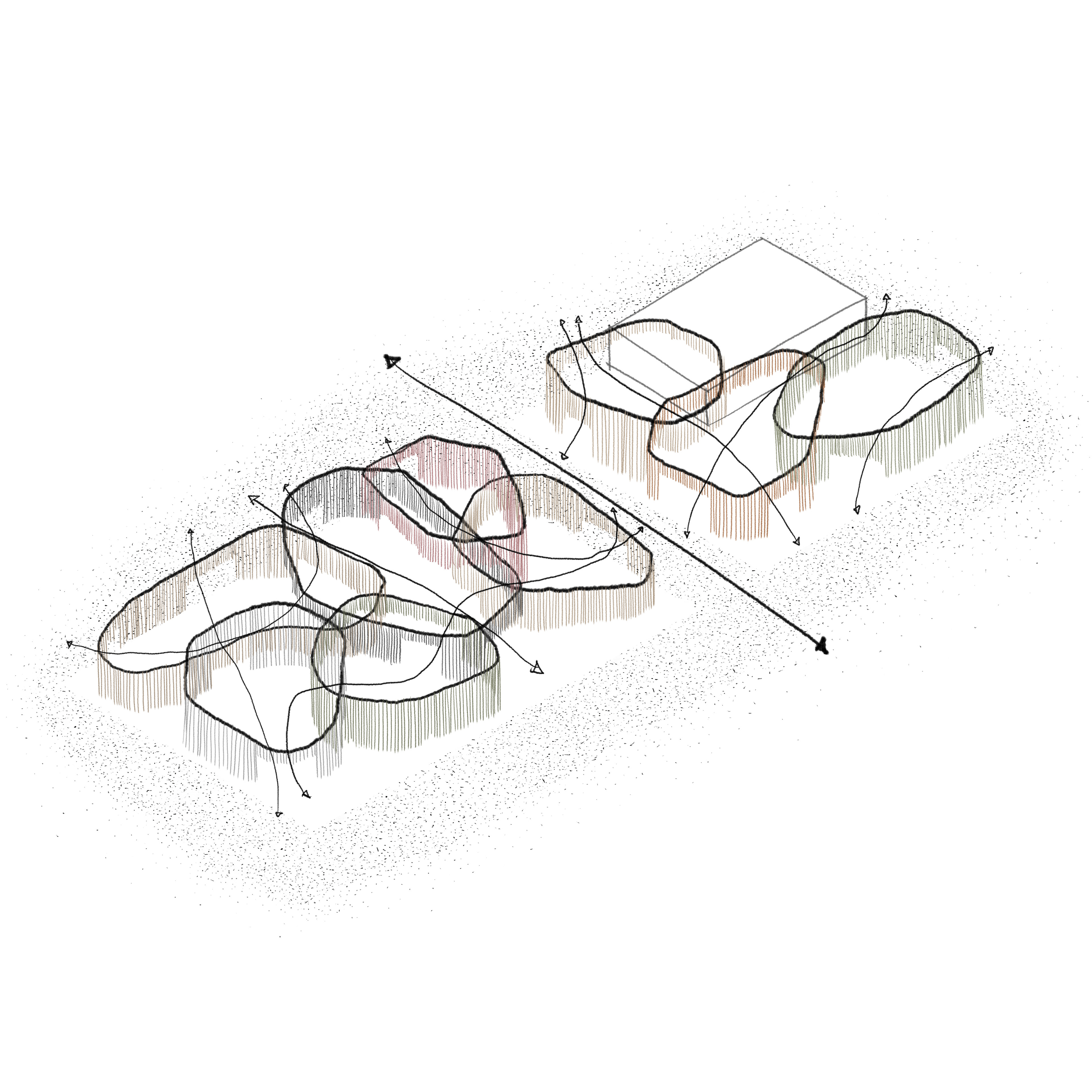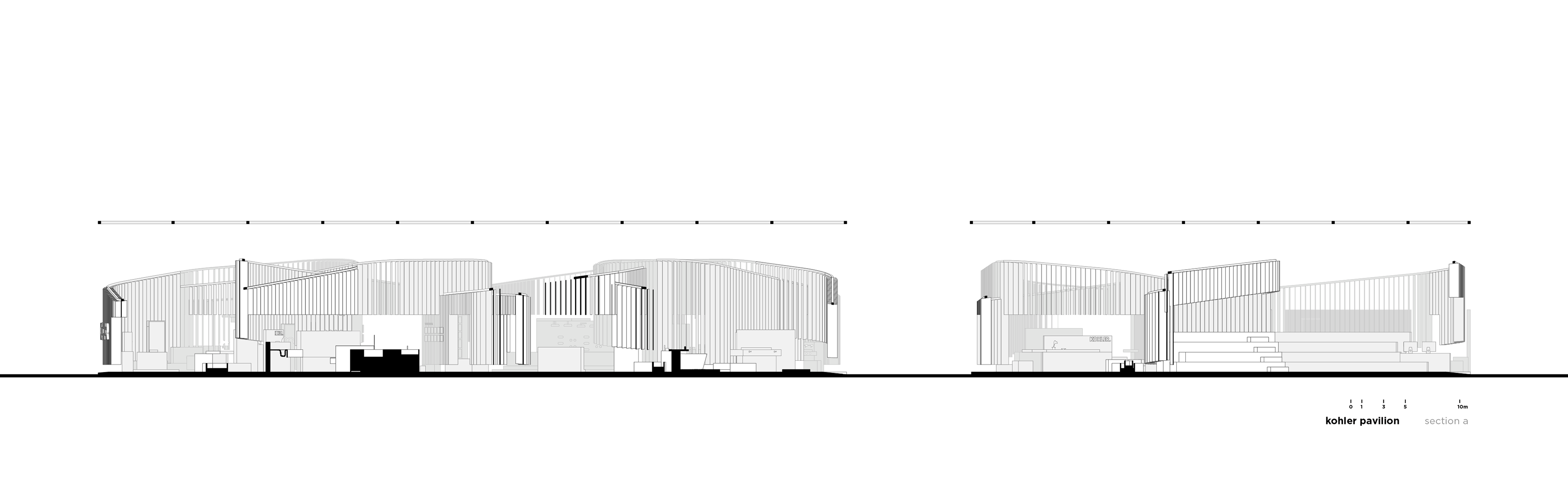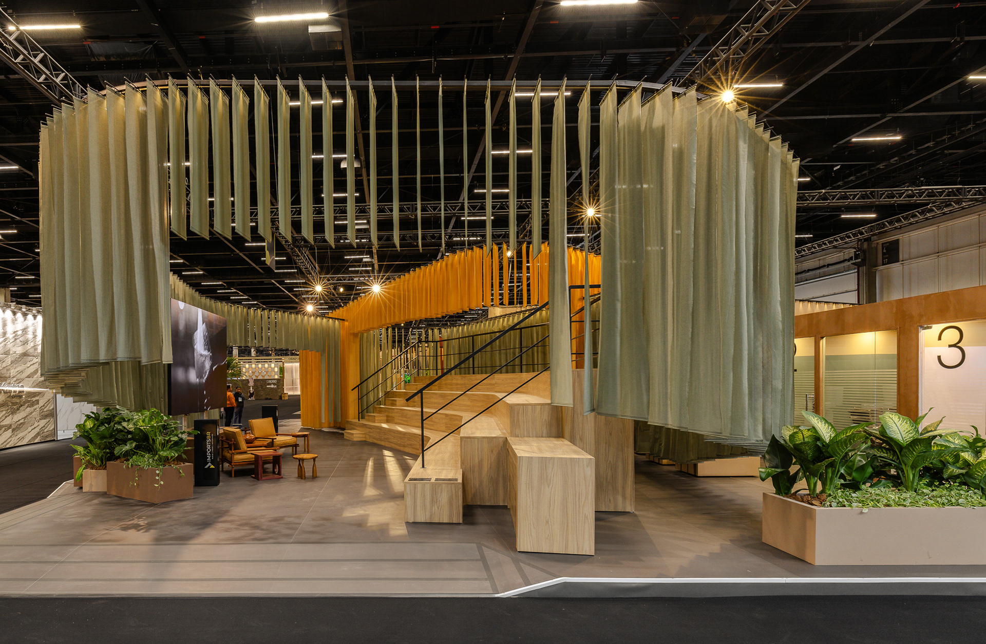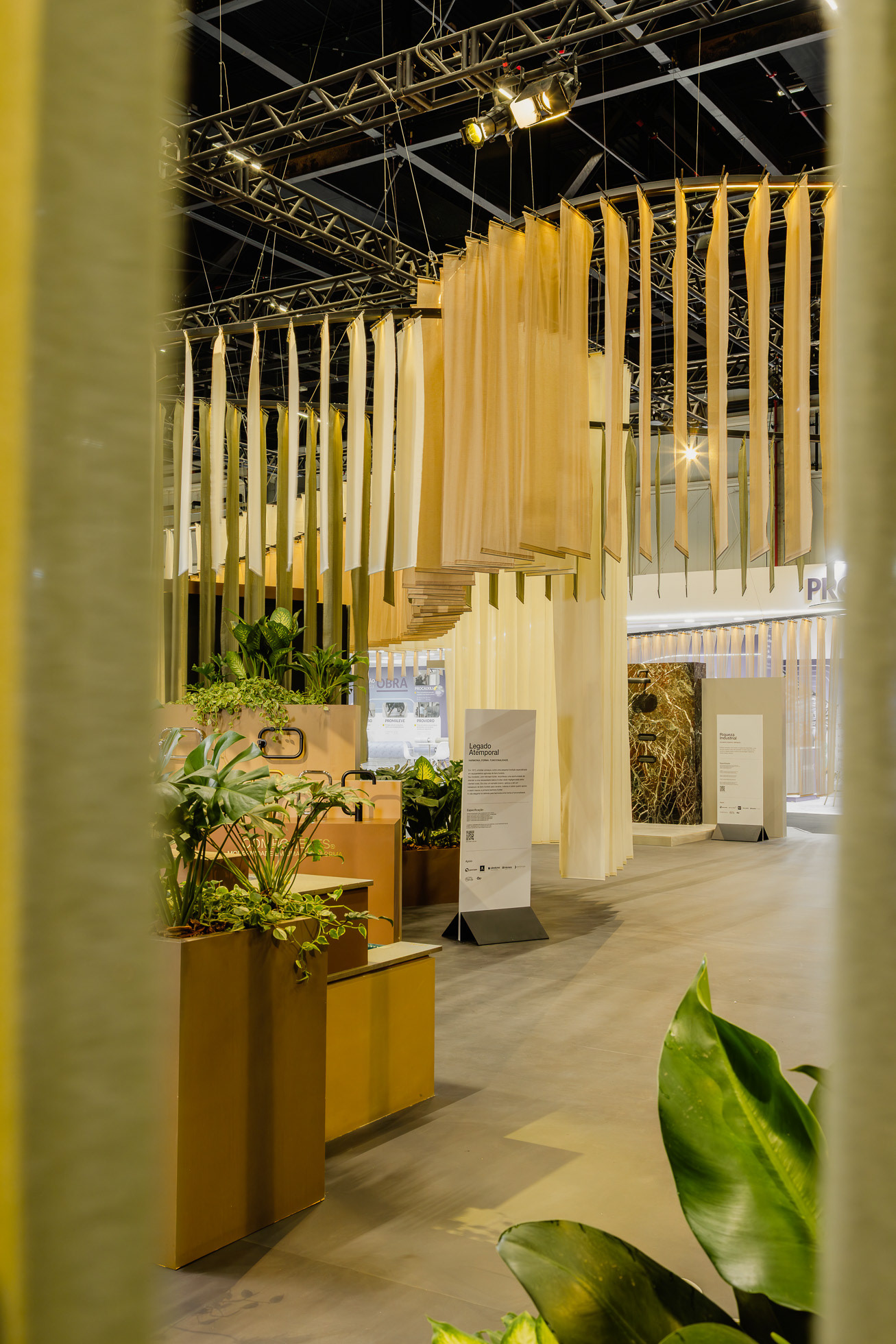 1. O invólucro ("Shell") – uma estrutura aérea leve e de rápida montagem, composta por grandes anéis metálicos calandrados e inclinados, variando entre 2,5 e 6 metros de altura. Esses anéis sustentam cerca de 1.570 tiras de tecido diáfano, numeradas e suspensas diretamente na infraestrutura da feira, criando volumes cromáticos translúcidos que organizam e definem os espaços internos e externos, garantindo a leveza desejada, bem como a sensação de surpresa espacial, permeabilidade e dinamismo.