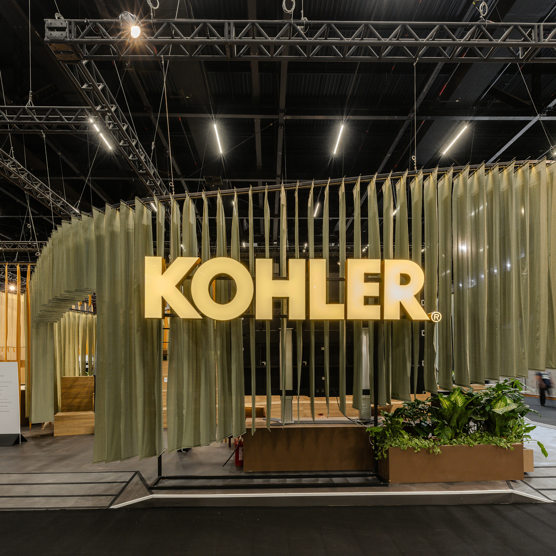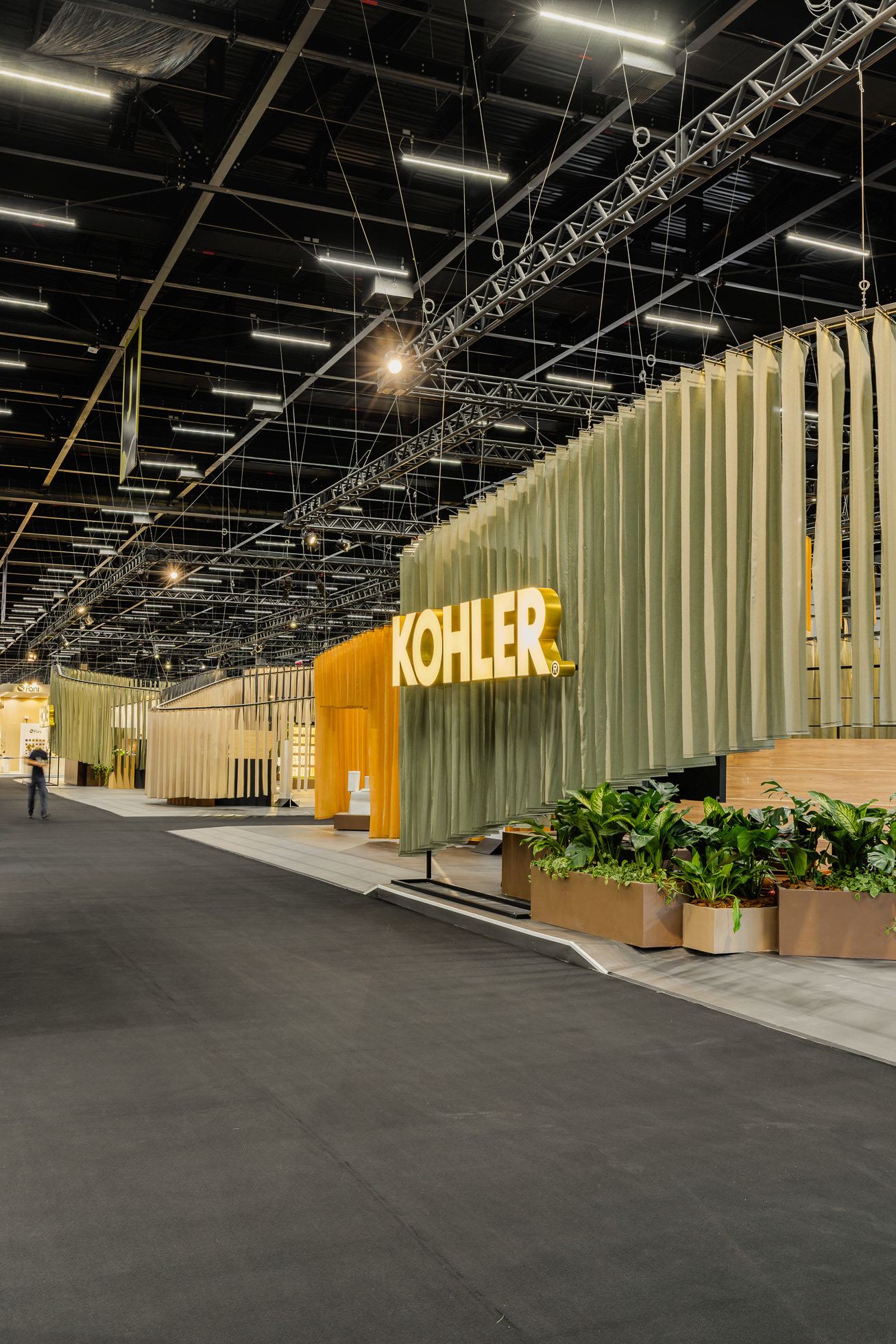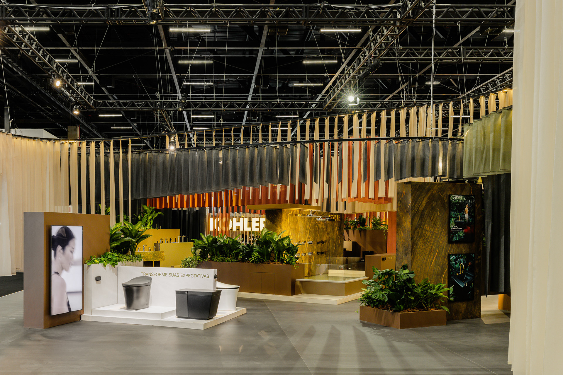 O pavilhão da Kohler para a Expo Revestir 2025 — principal evento de acabamentos da construção civil no Brasil — ocupou uma área total de 1.000 m², distribuída em dois lotes: um de 600 m² e outro de 400 m². A proposta parte de uma imersão no universo da marca, considerando sua presença nacional e internacional, e enfrentando uma condição logística desafiadora: apenas oito dias para montagem, consideravelmente menos que em outras feiras internacionais.