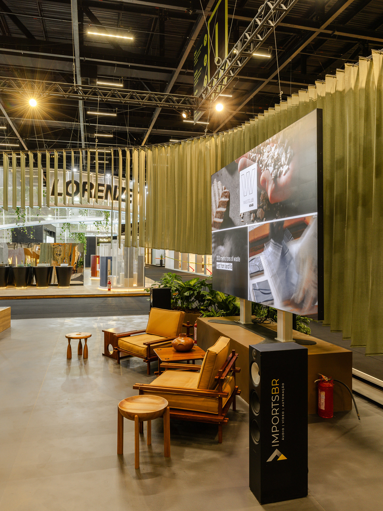 Diante dessas restrições e das ambições institucionais da marca, optou-se por um partido inédito no contexto da Revestir: uma estrutura efêmera de forte impacto visual e espacial, que abandonasse os formatos convencionais de exposição (como suítes e cozinhas cenográficas), adotando uma organização fluida, dinâmica e aberta ao público, centrada na experiência espacial e nos fluxos.