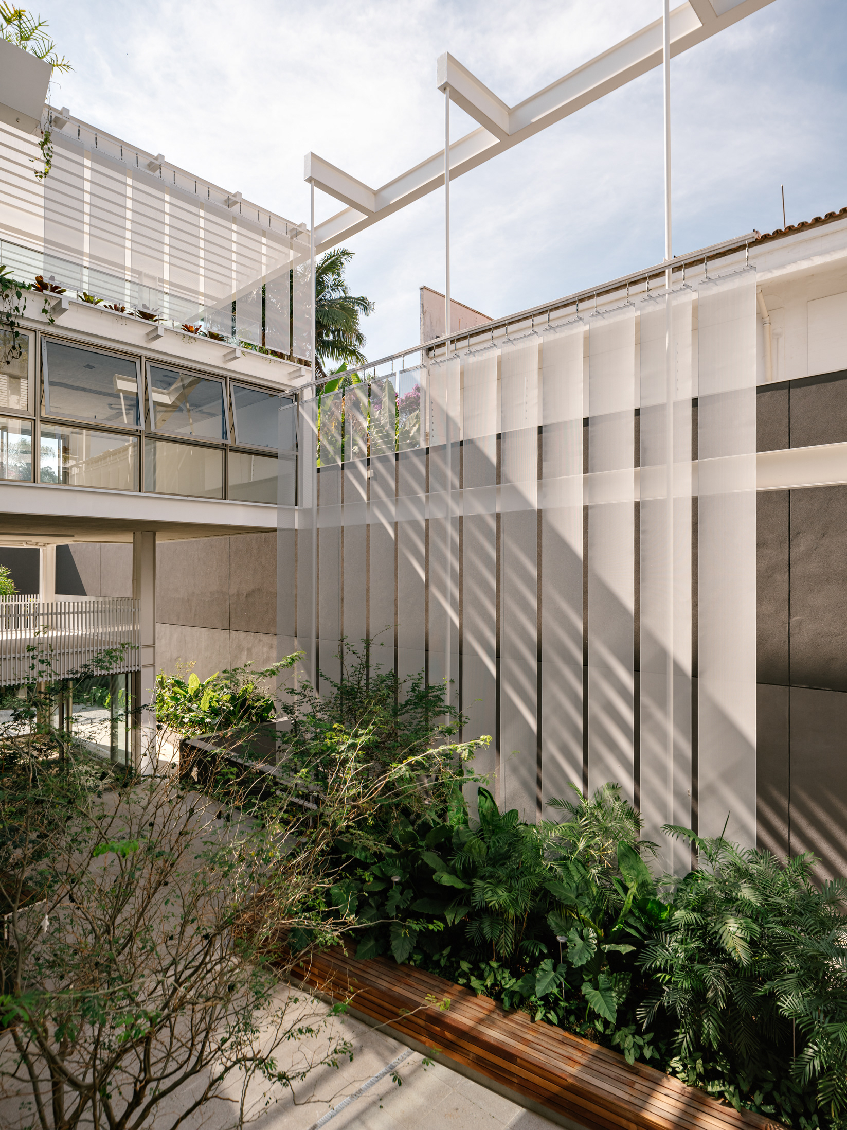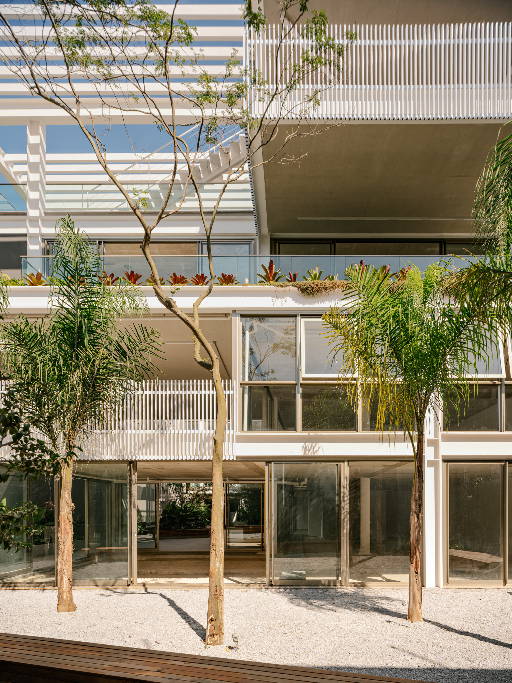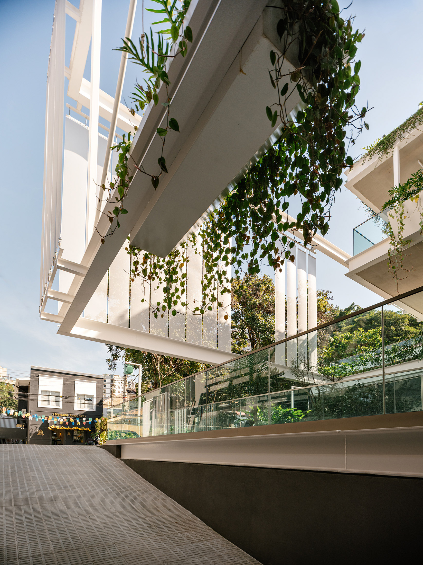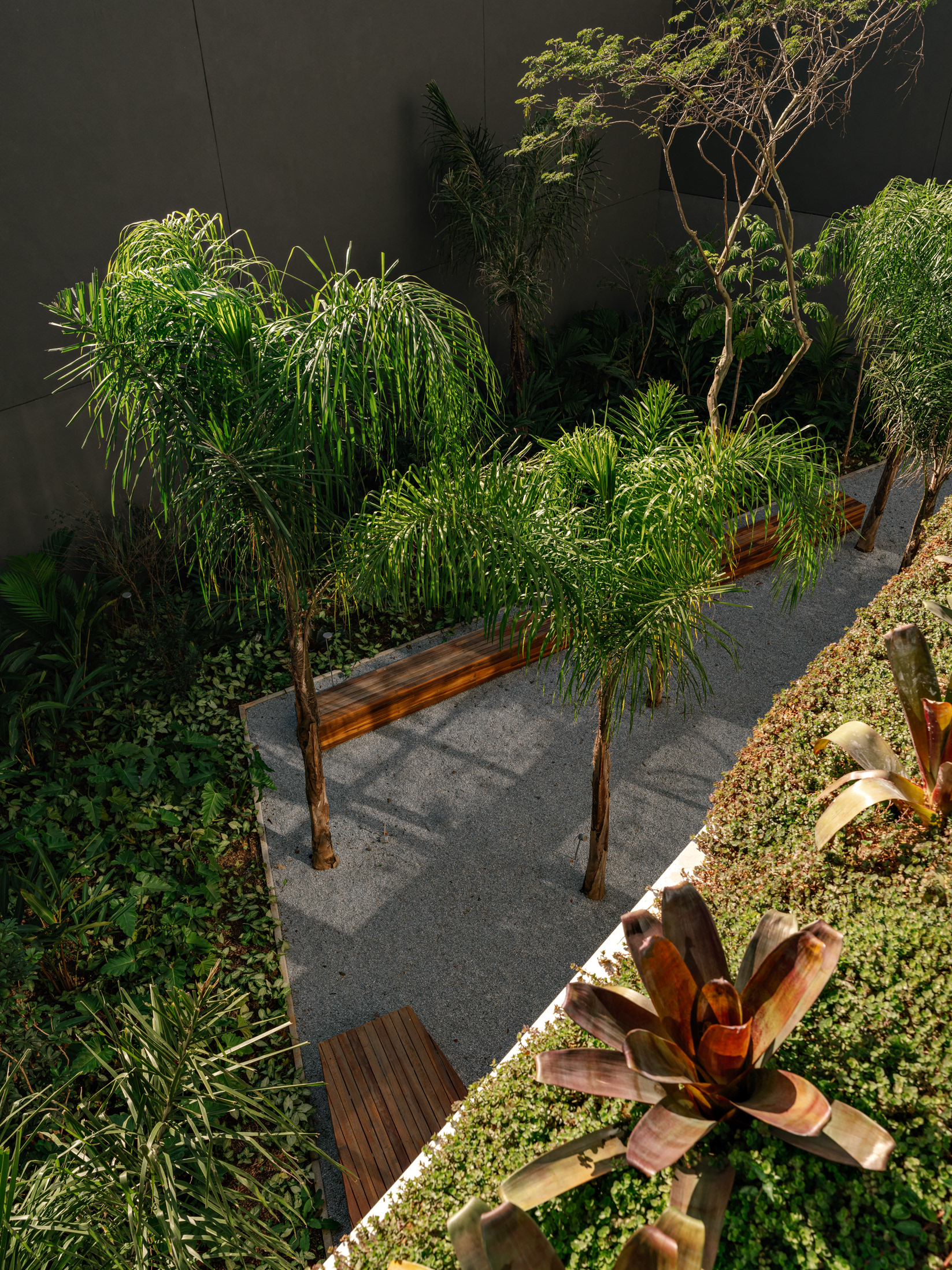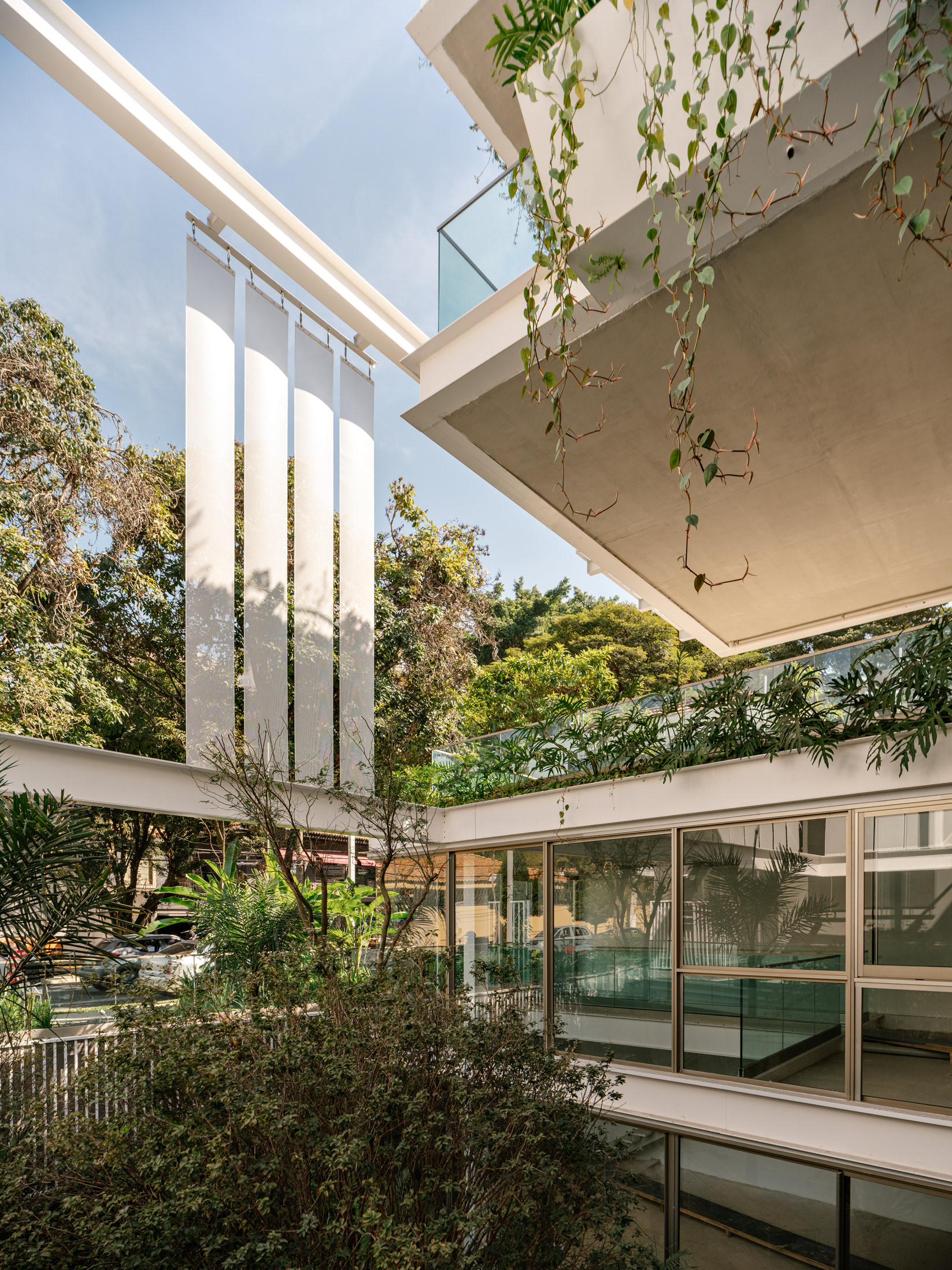 Aproveitando o nível mais baixo do terreno, com uma loja na frente cria-se uma agradável área extremamente ajardinada resguardada da rua. A entrada acontece por uma passarela sobre esse nível, em meio às copas das árvores do nível inferior e garante a entrada do visitante no core central da edificação por onde se acessam escritórios iluminados com ventilação cruzada e grande varandas, muito úteis no clima paulista.