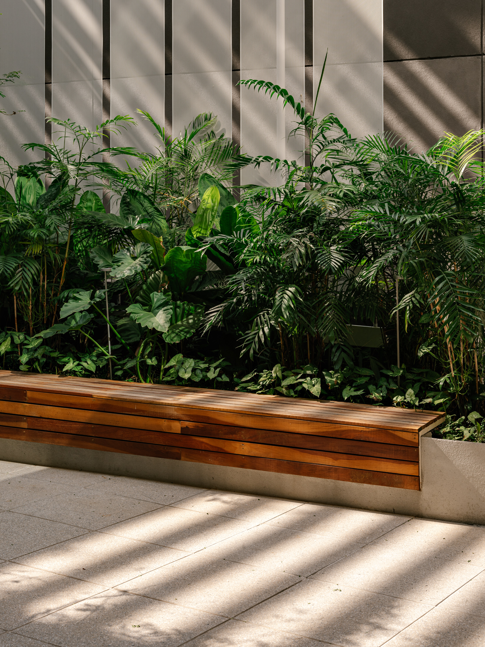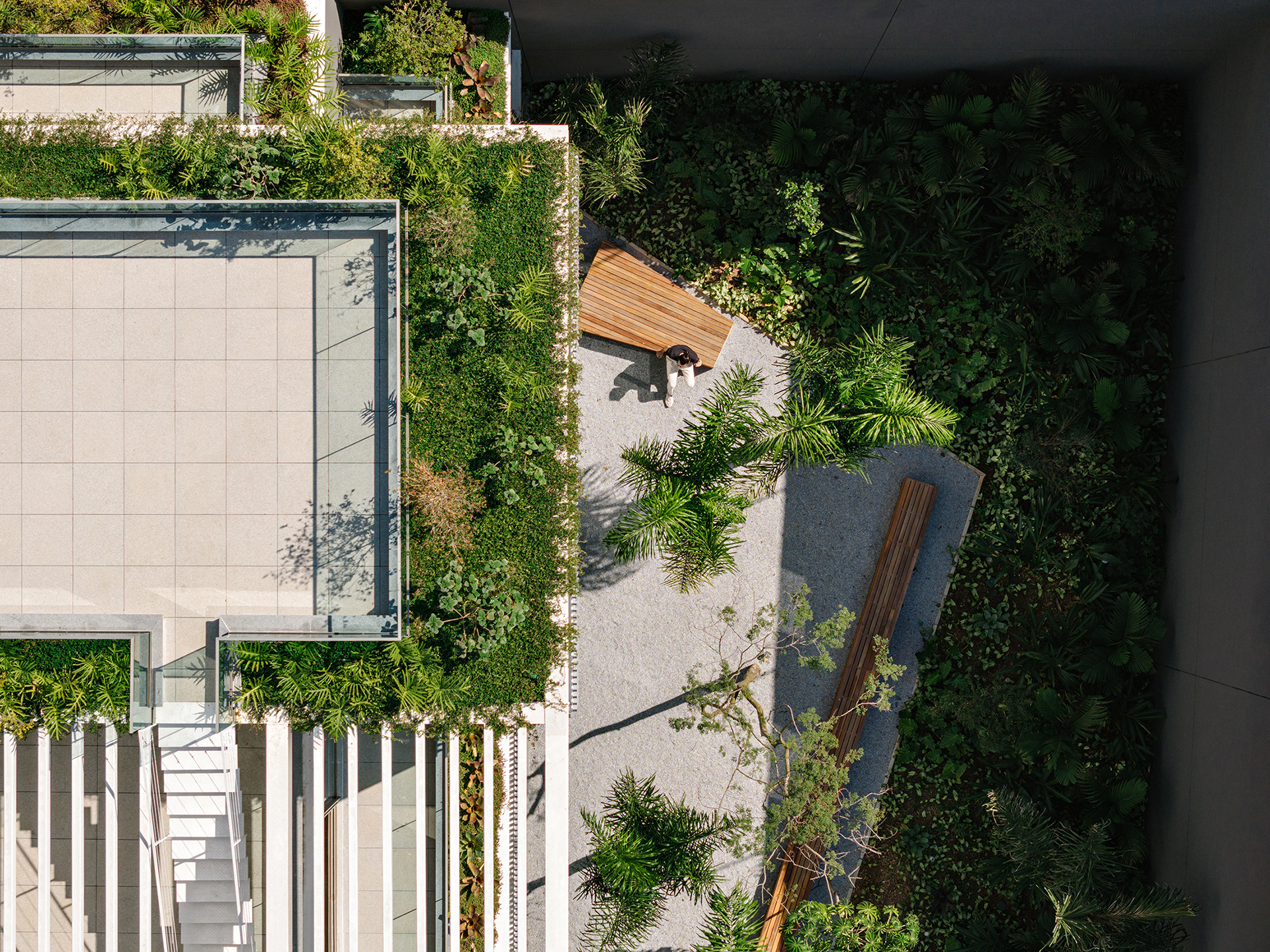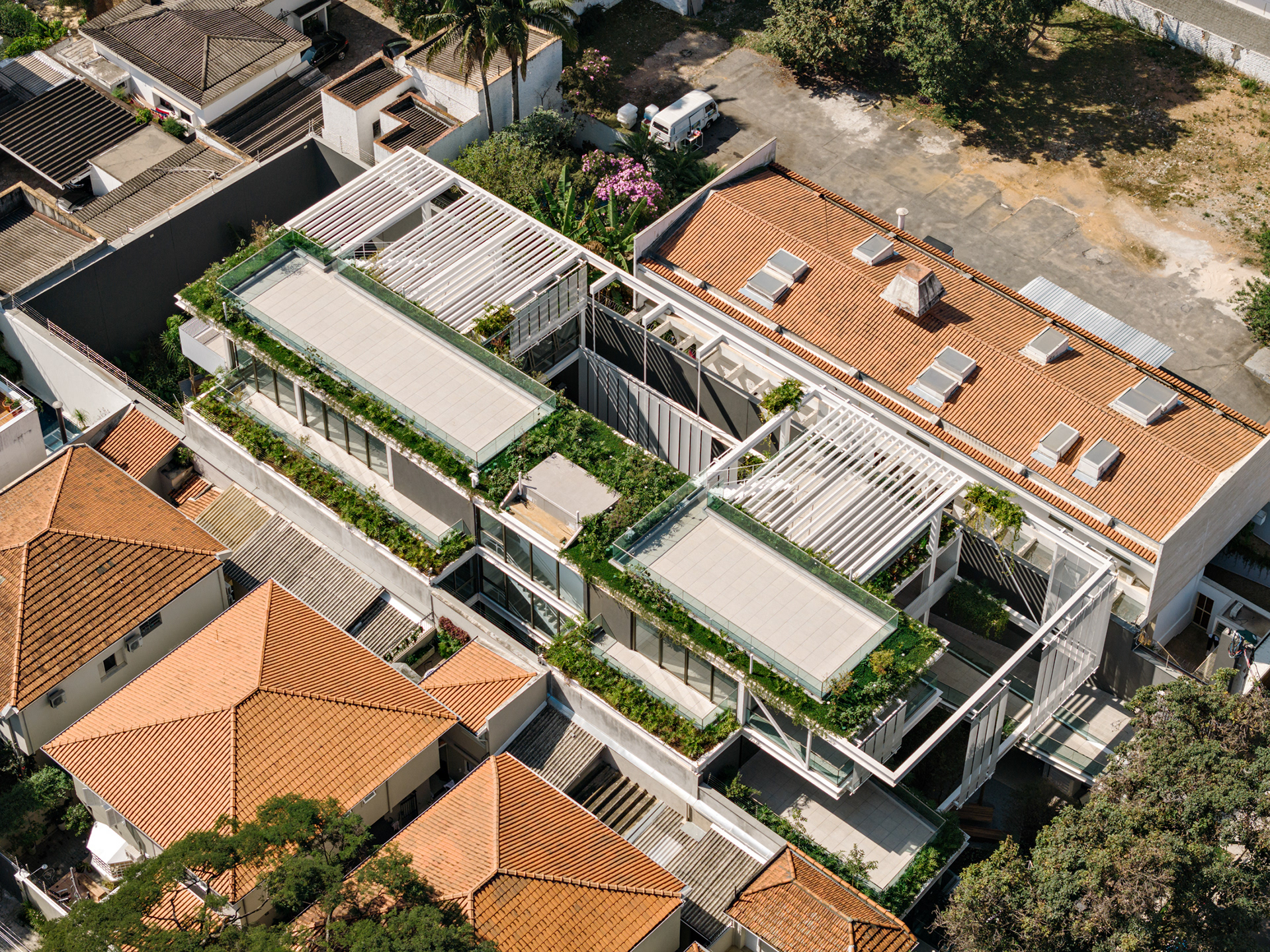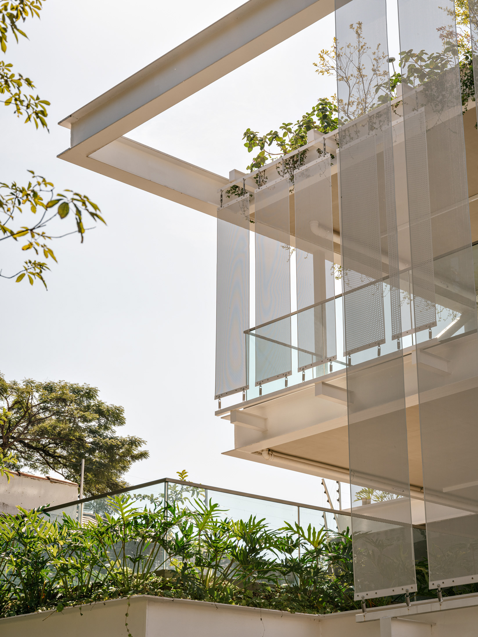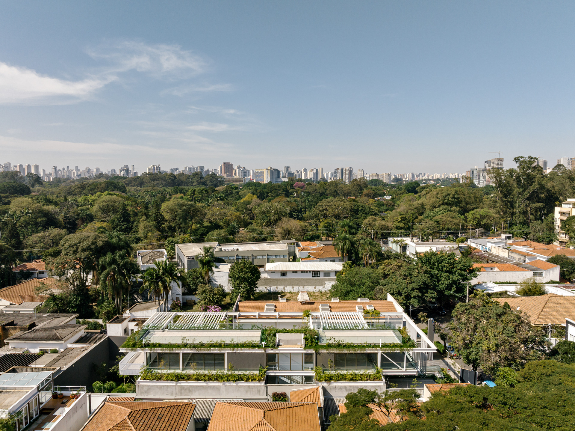 Aproveitando o nível mais baixo do terreno, com uma loja na frente cria-se uma agradável área extremamente ajardinada resguardada da rua. A entrada acontece por uma passarela sobre esse nível, em meio às copas das árvores do nível inferior e garante a entrada do visitante no core central da edificação por onde se acessam escritórios iluminados com ventilação cruzada e grande varandas, muito úteis no clima paulista.