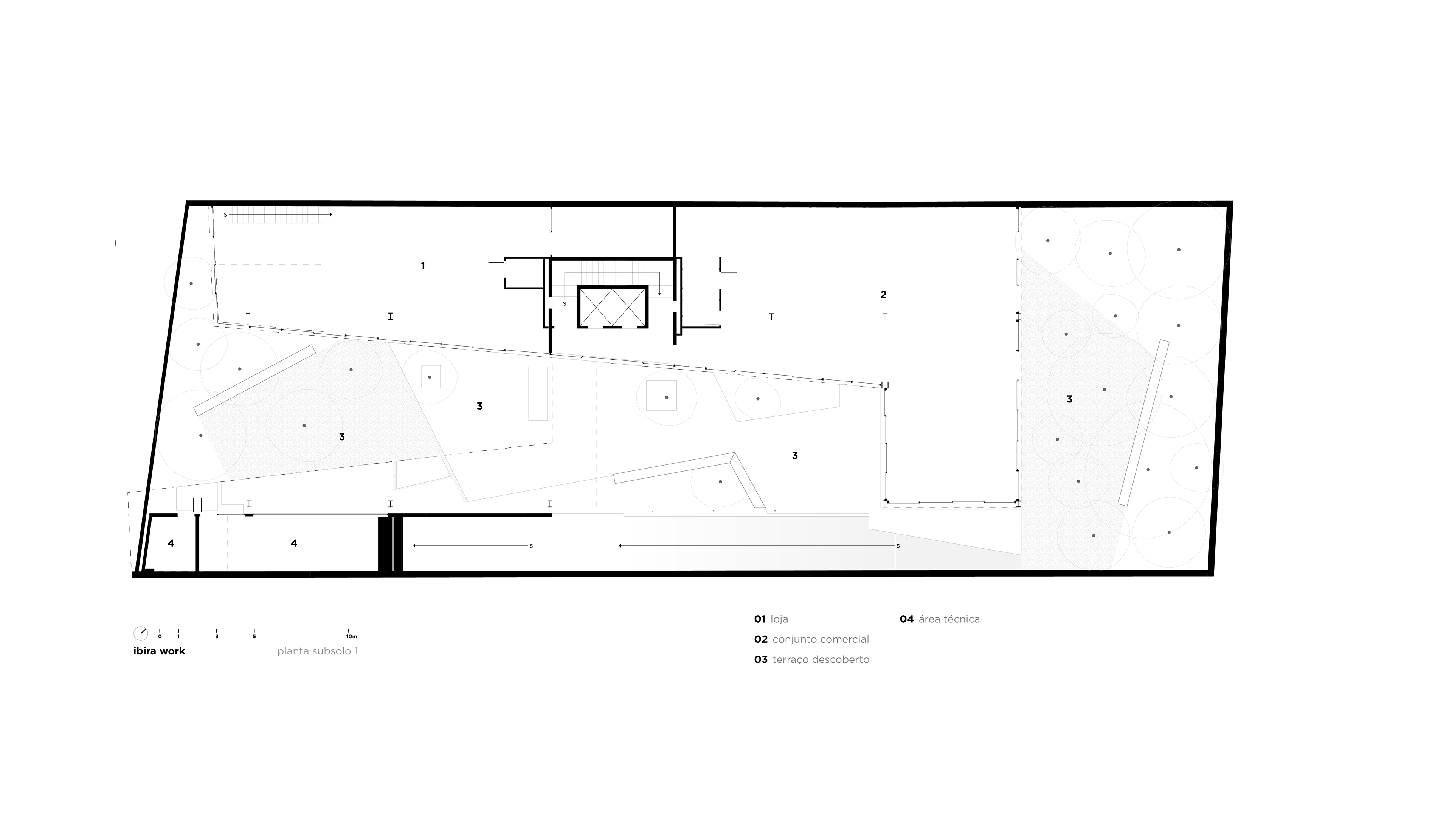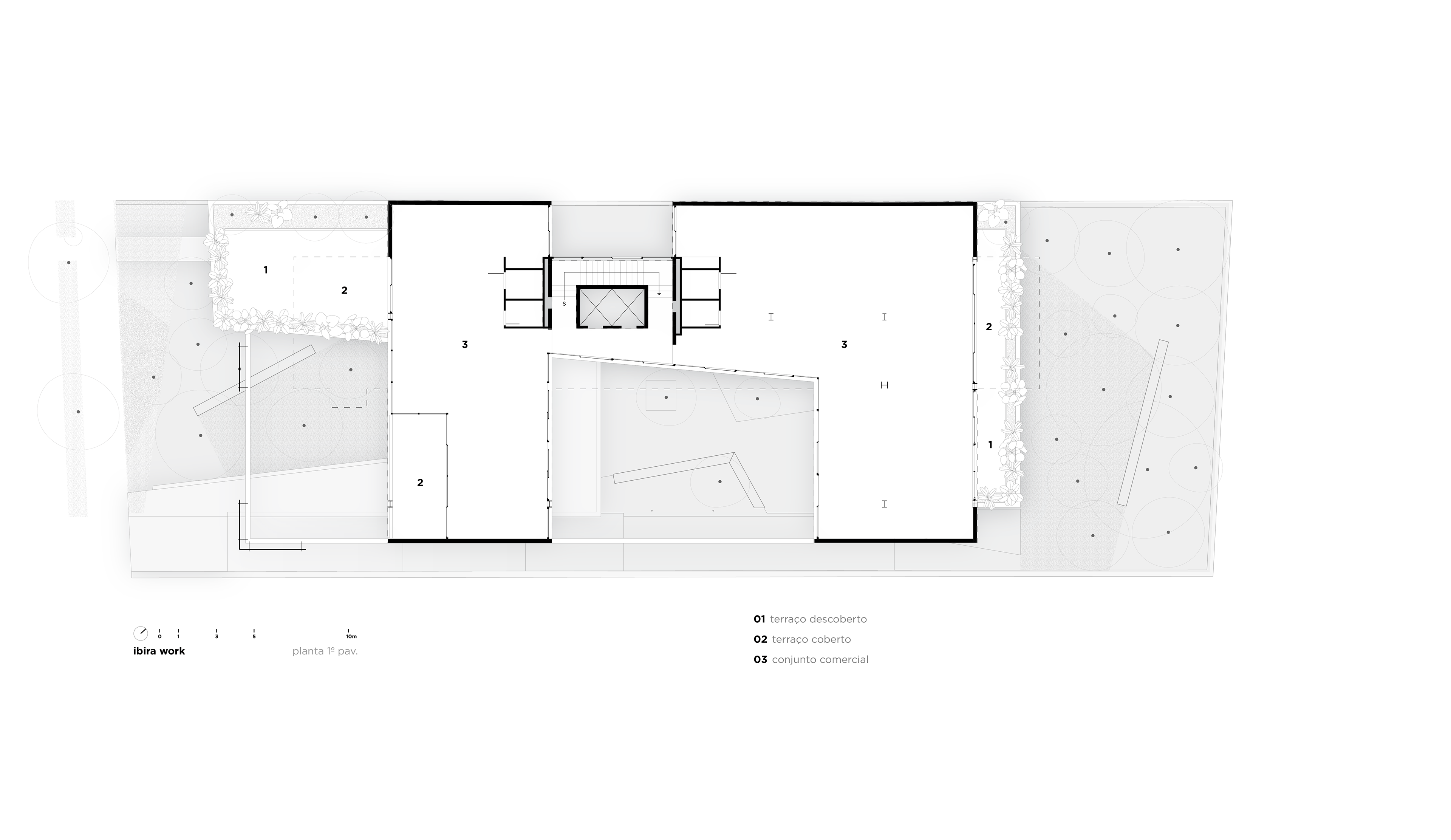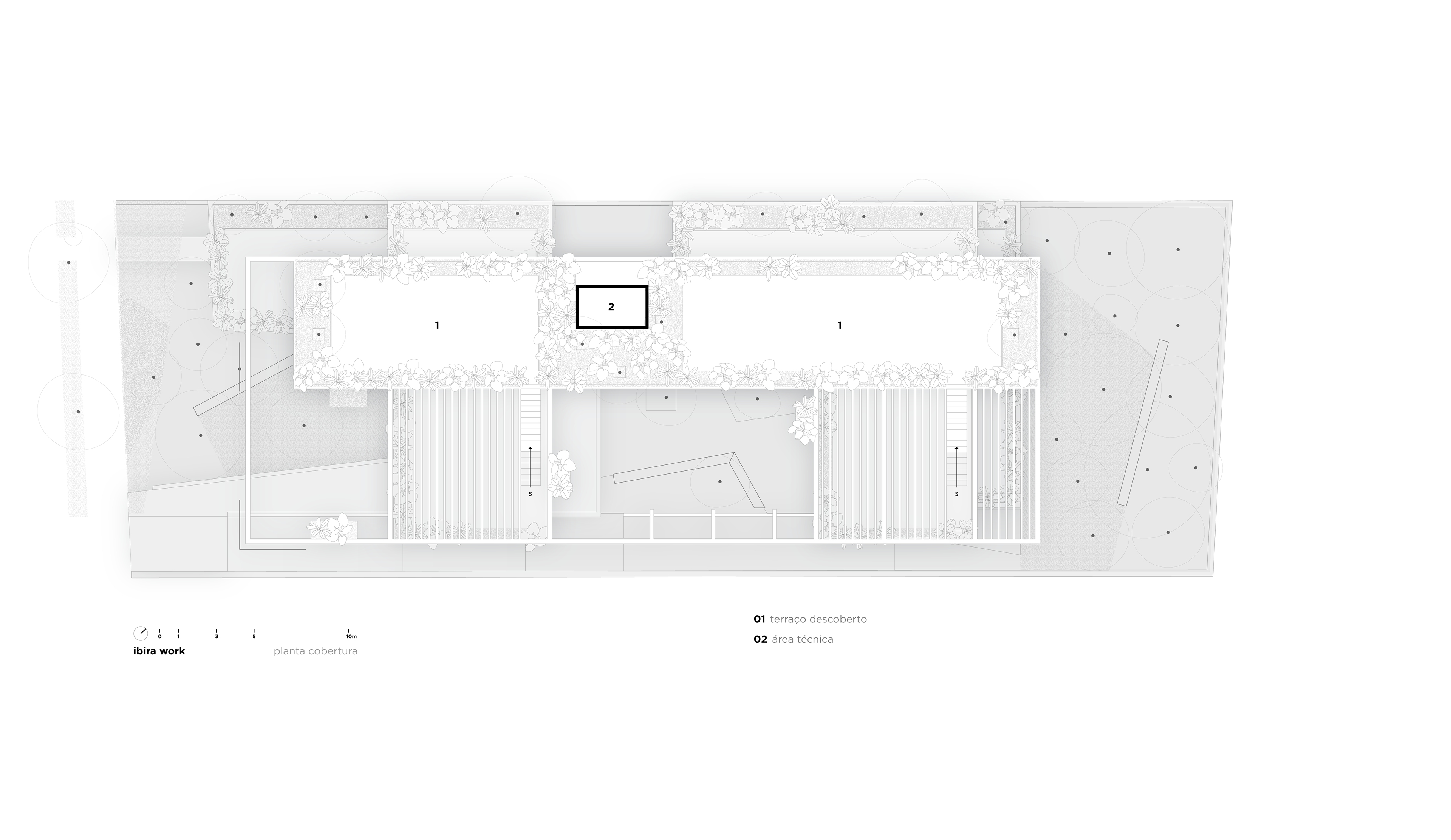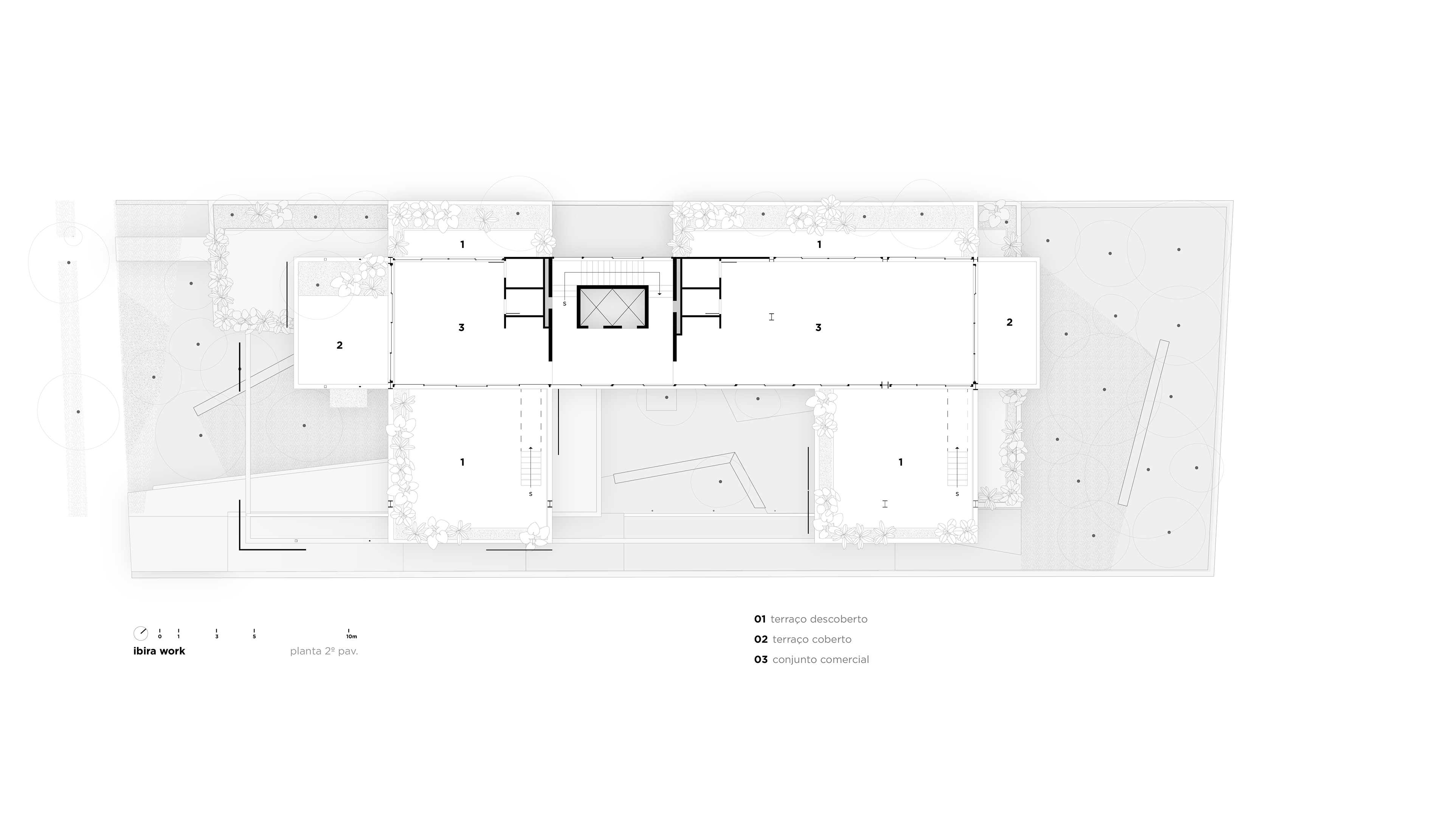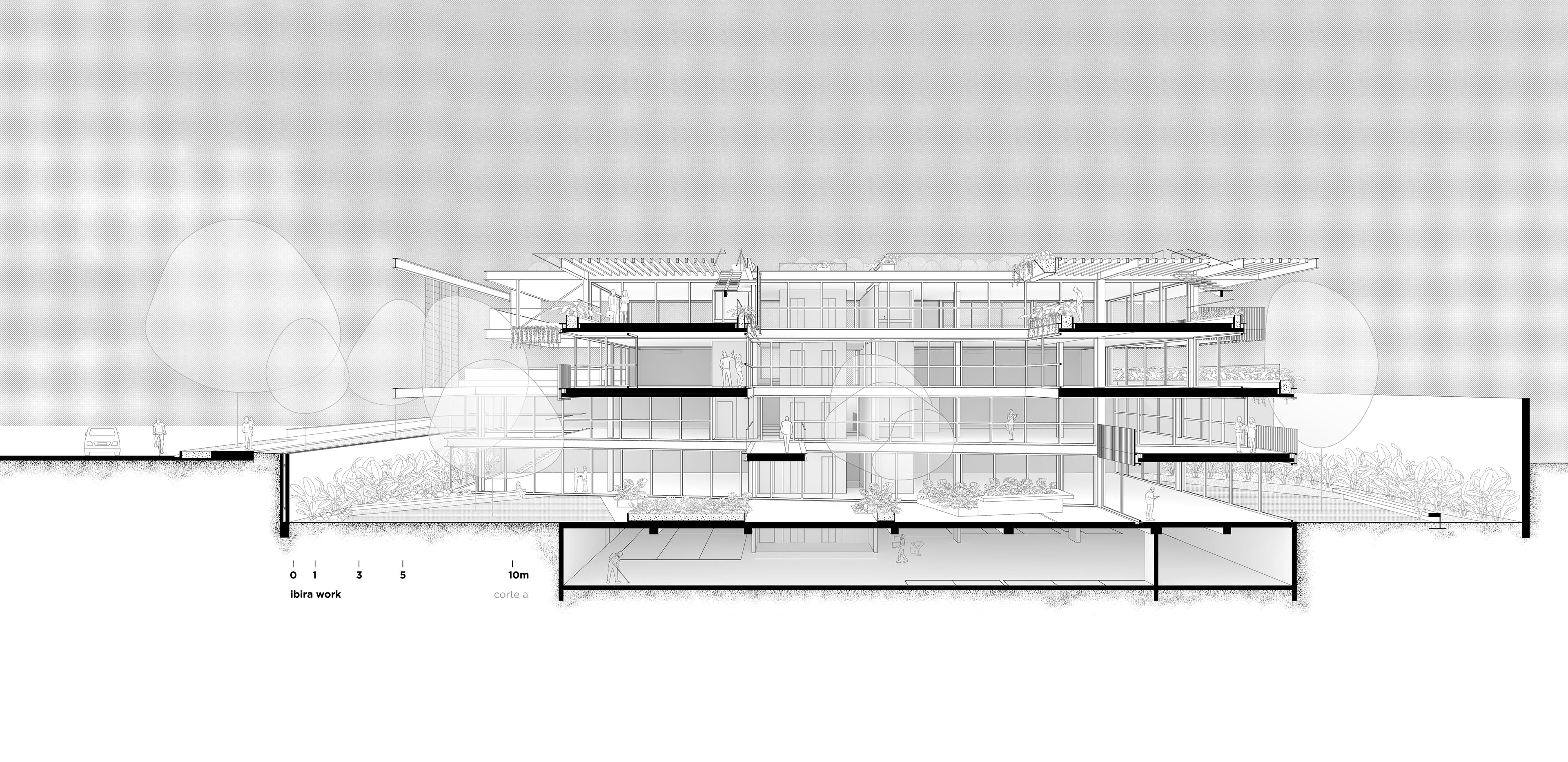 O espaço de trabalho do edifício Ibira busca o aproveitamento do terreno como um todo, criando relações íntimas do espaço de trabalho com o terreno, natureza e vistas. Próximo ao parque Ibirapuera, em um local cheio de atividades esportivas e afastado dos centros corporativos convencionais da cidade, é uma experiência de uma nova espacialidade pós pandemia da forma de trabalhar.