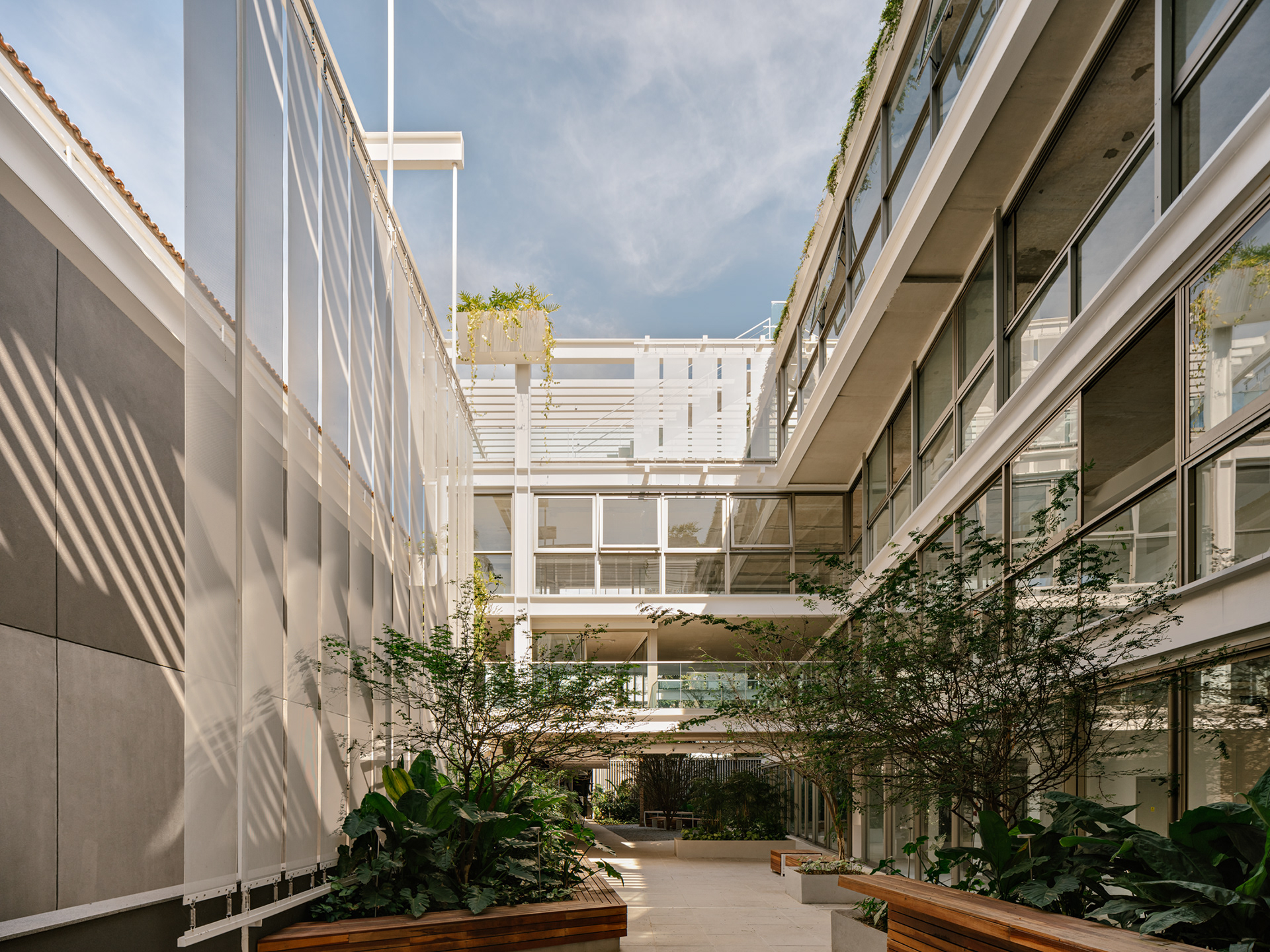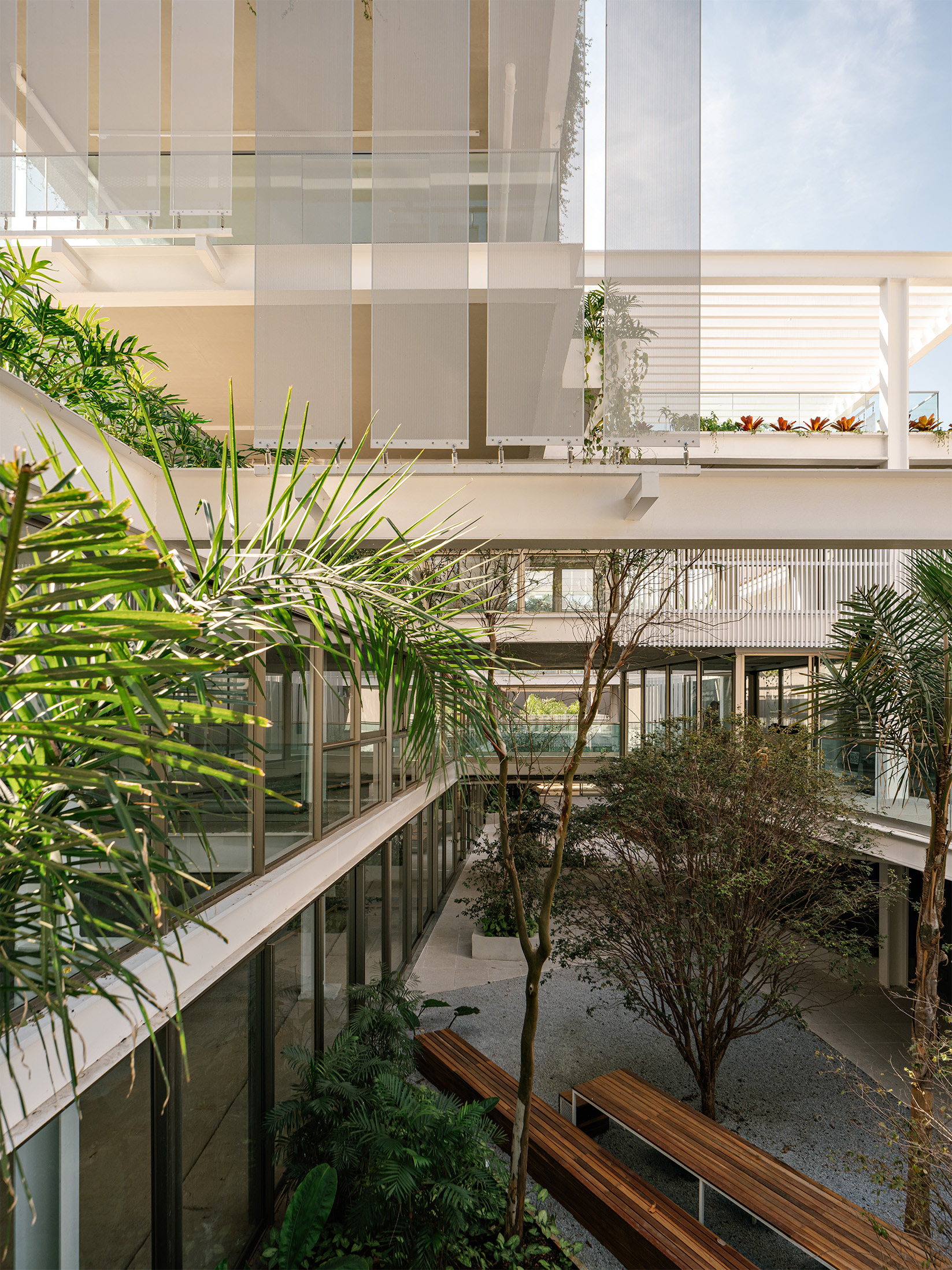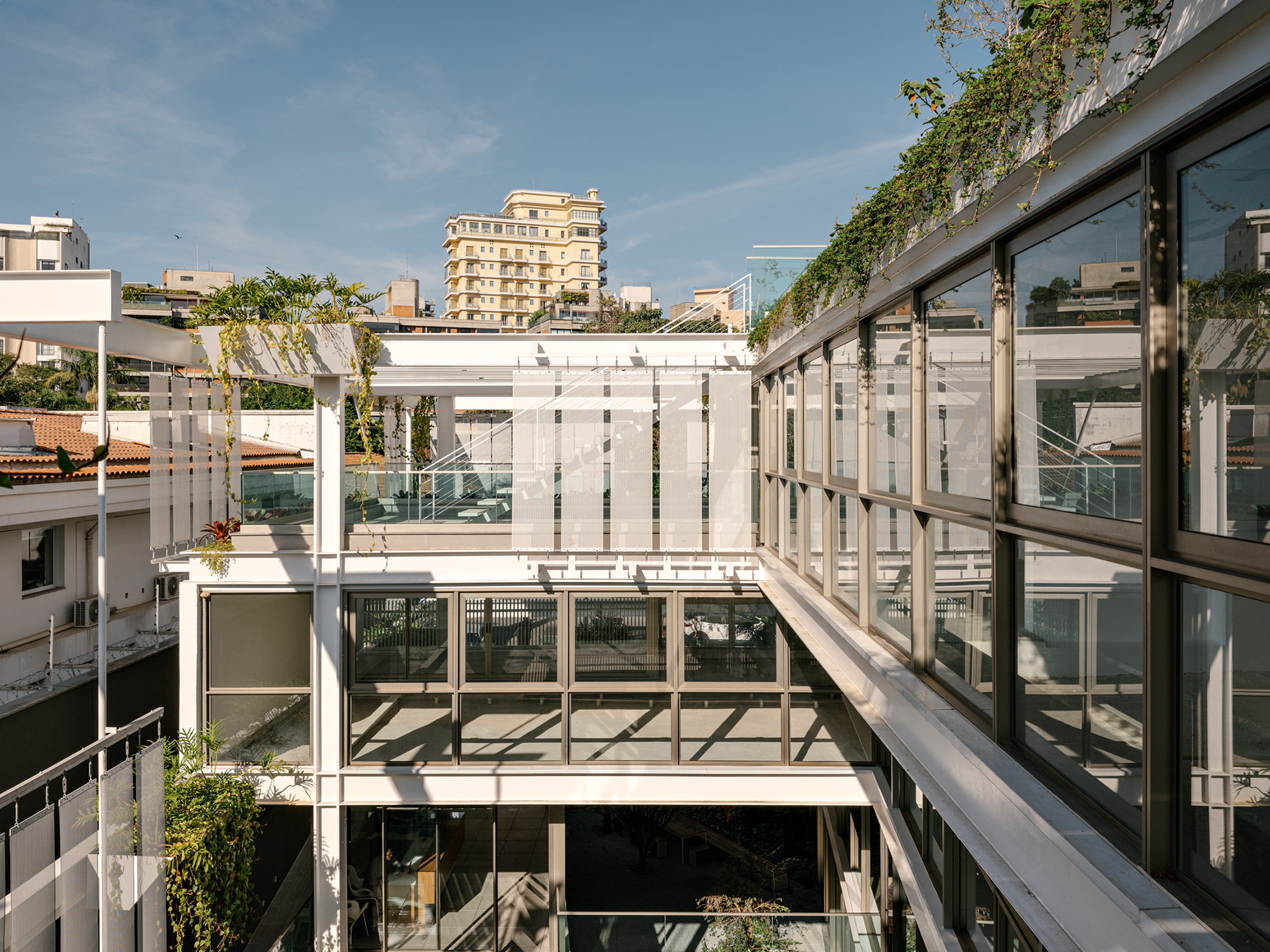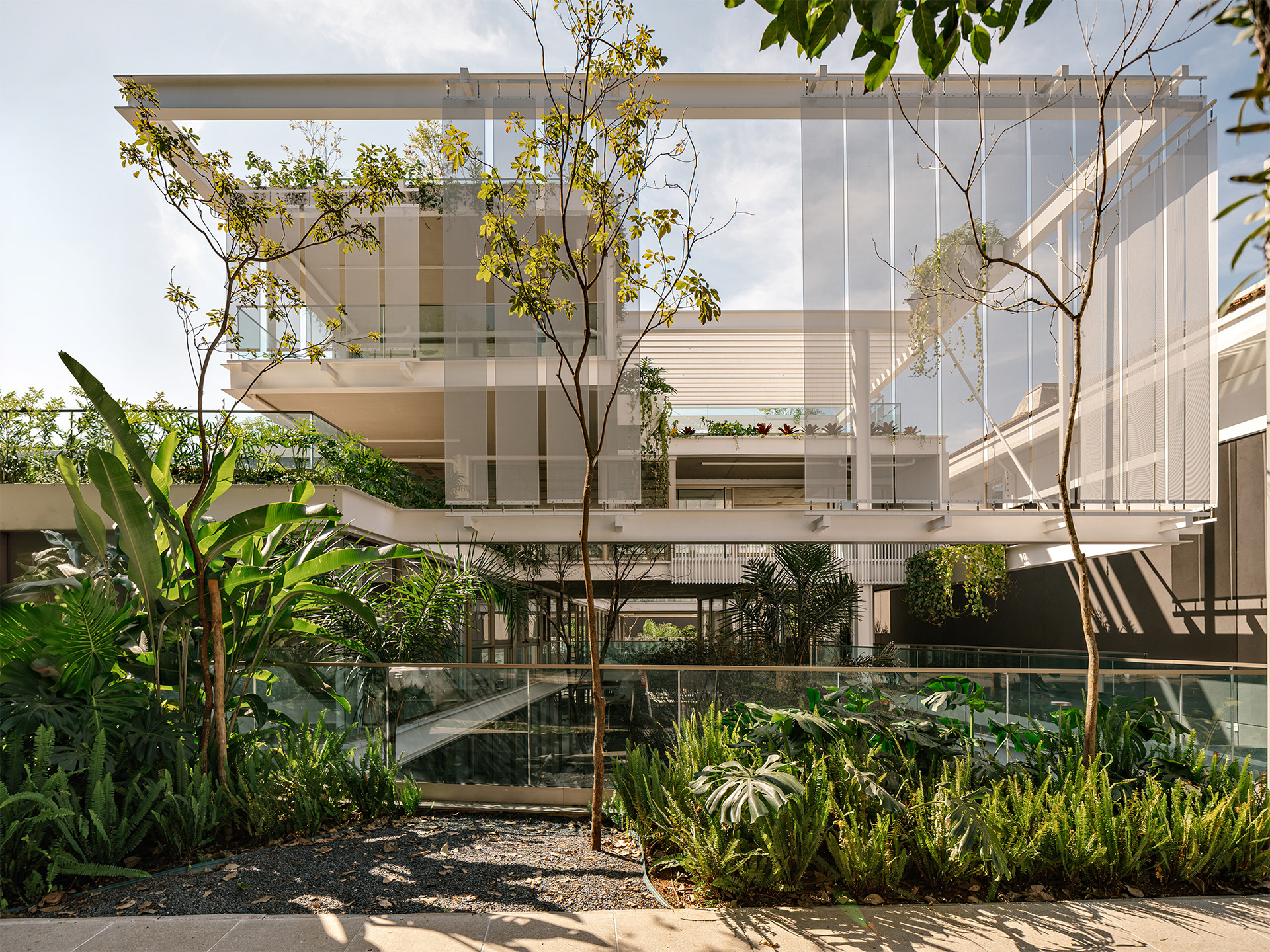 A edificação foi projetada em estrutura metálica para garantir grande vãos com peças esbeltas e delicadas. A mesma estrutura também cria suportes para brises metálicos tensionados, jardineiras suspensas e pérgolas, garantindo conforto térmico e uma espécie de microclima por todos os níveis da construção.