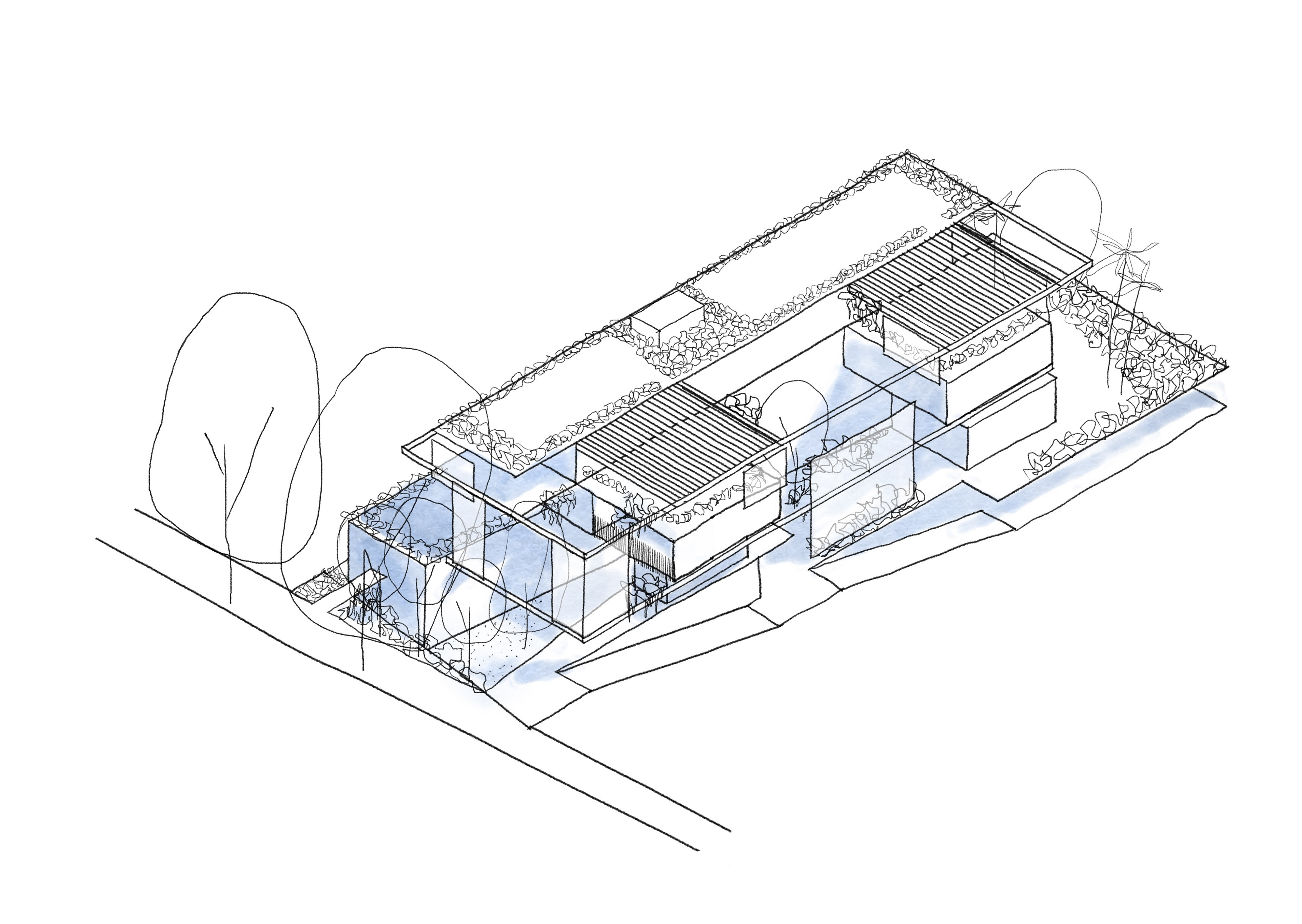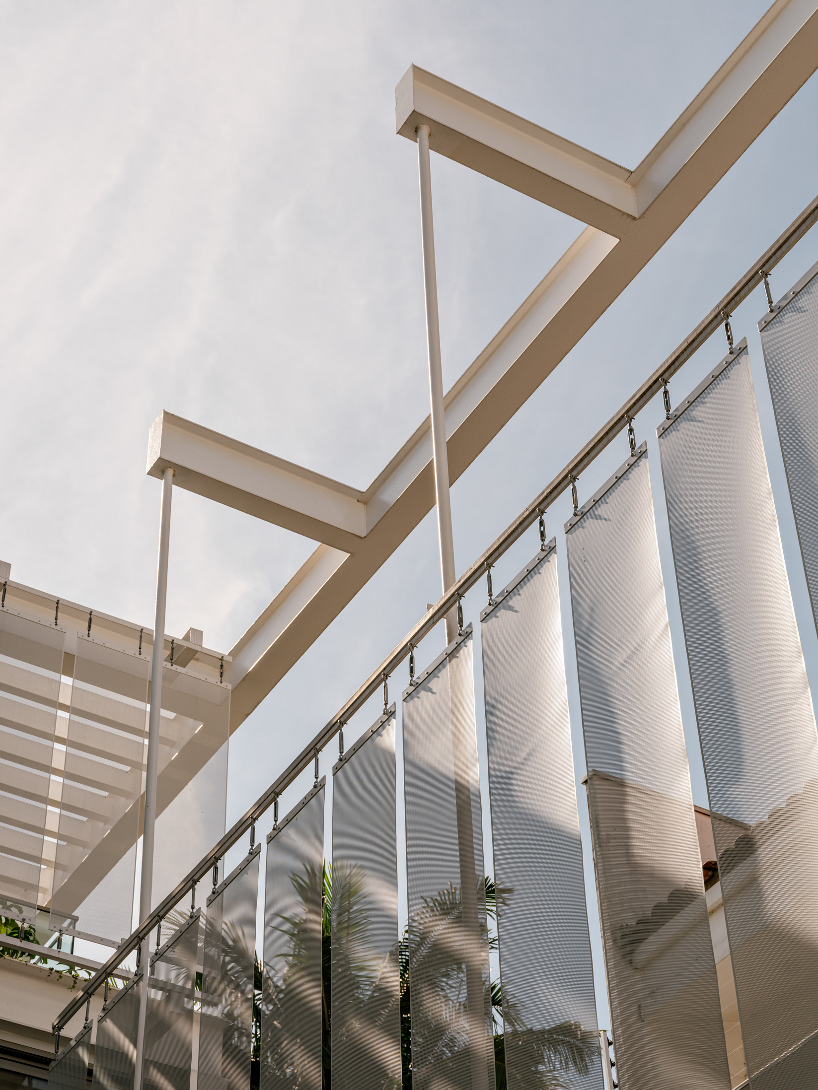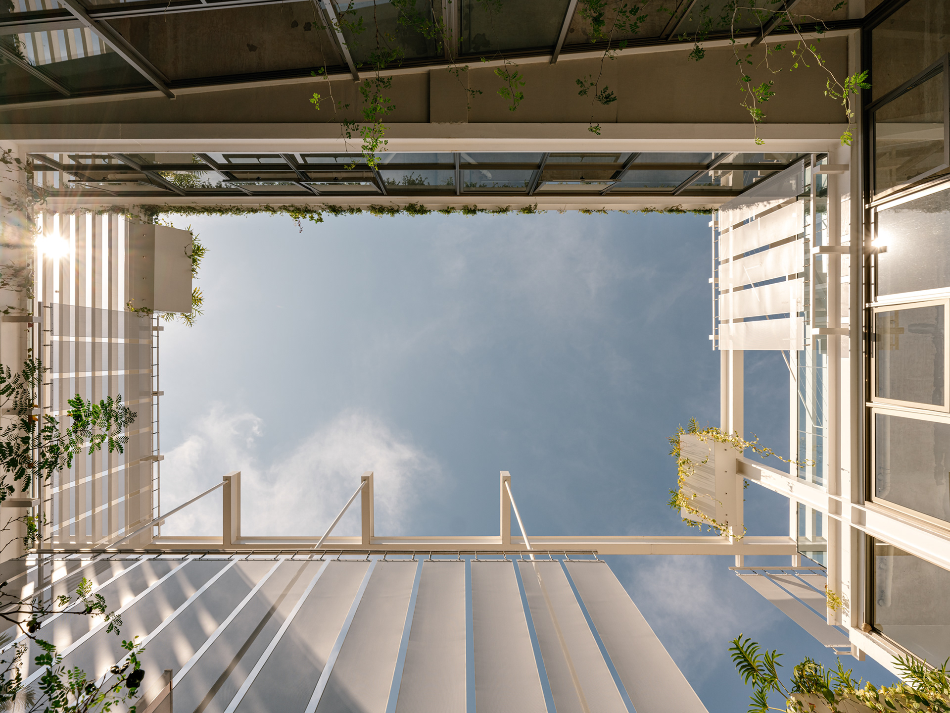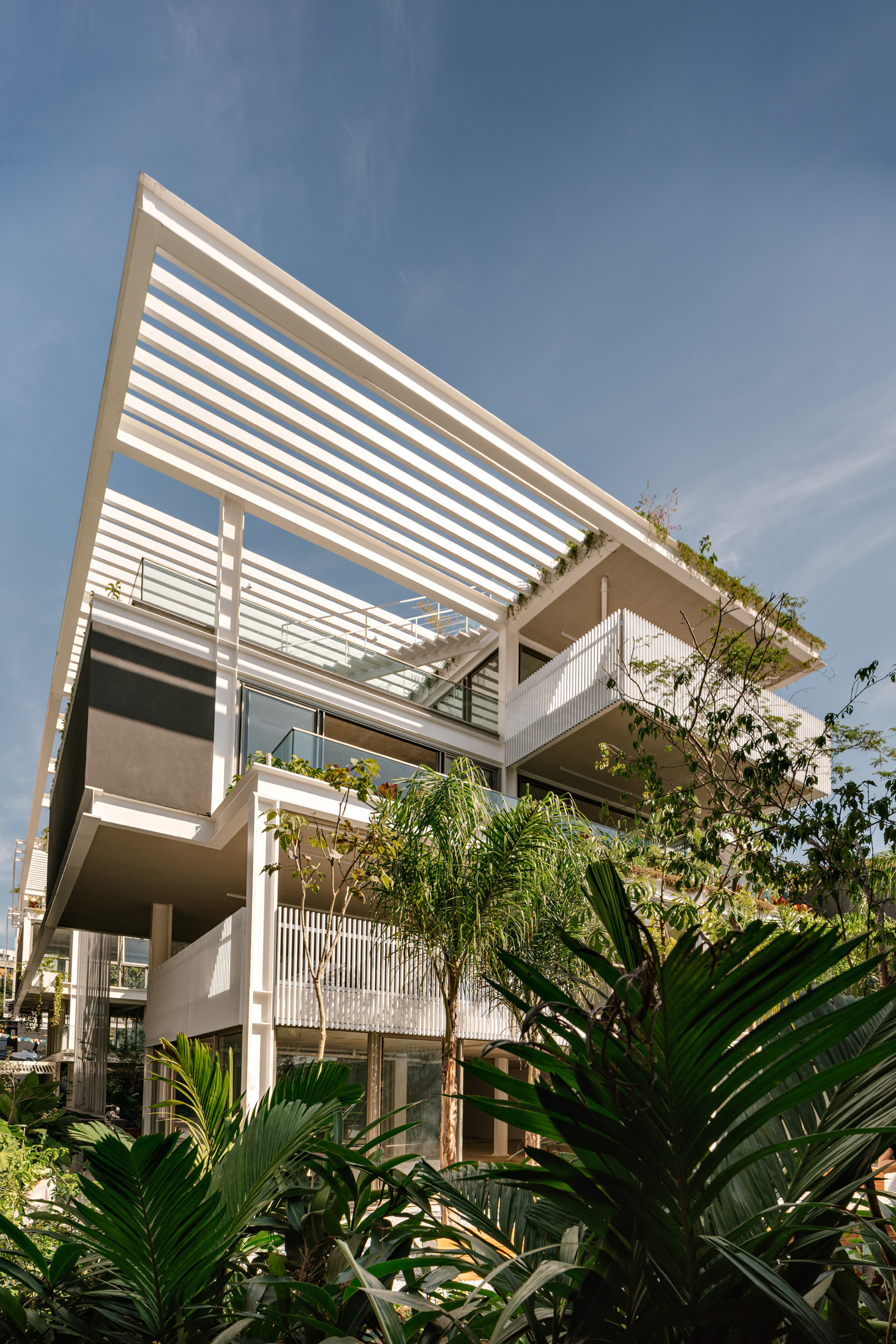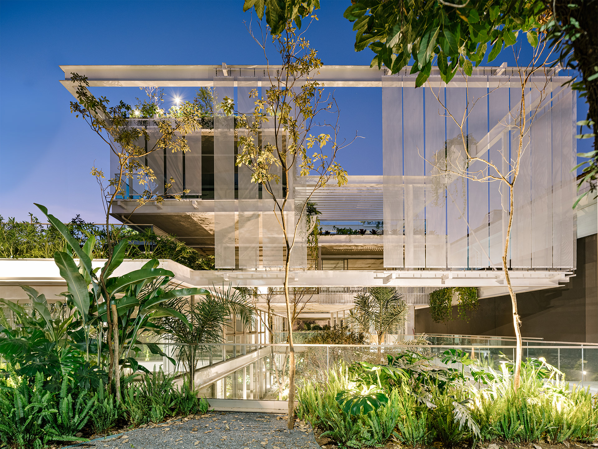A edificação foi projetada em estrutura metálica para garantir grande vãos com peças esbeltas e delicadas. A mesma estrutura também cria suportes para brises metálicos tensionados, jardineiras suspensas e pérgolas, garantindo conforto térmico e uma espécie de microclima por todos os níveis da construção.