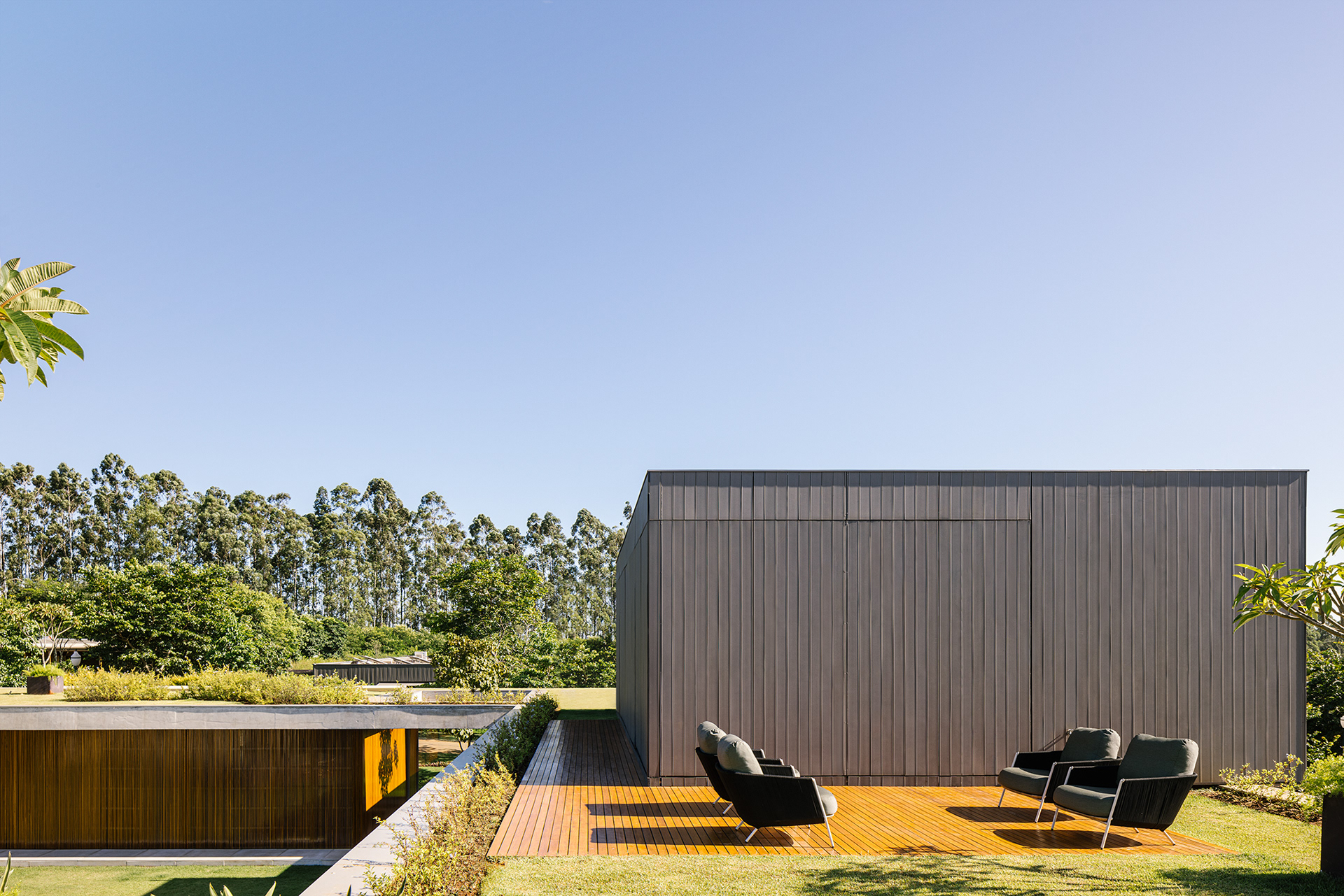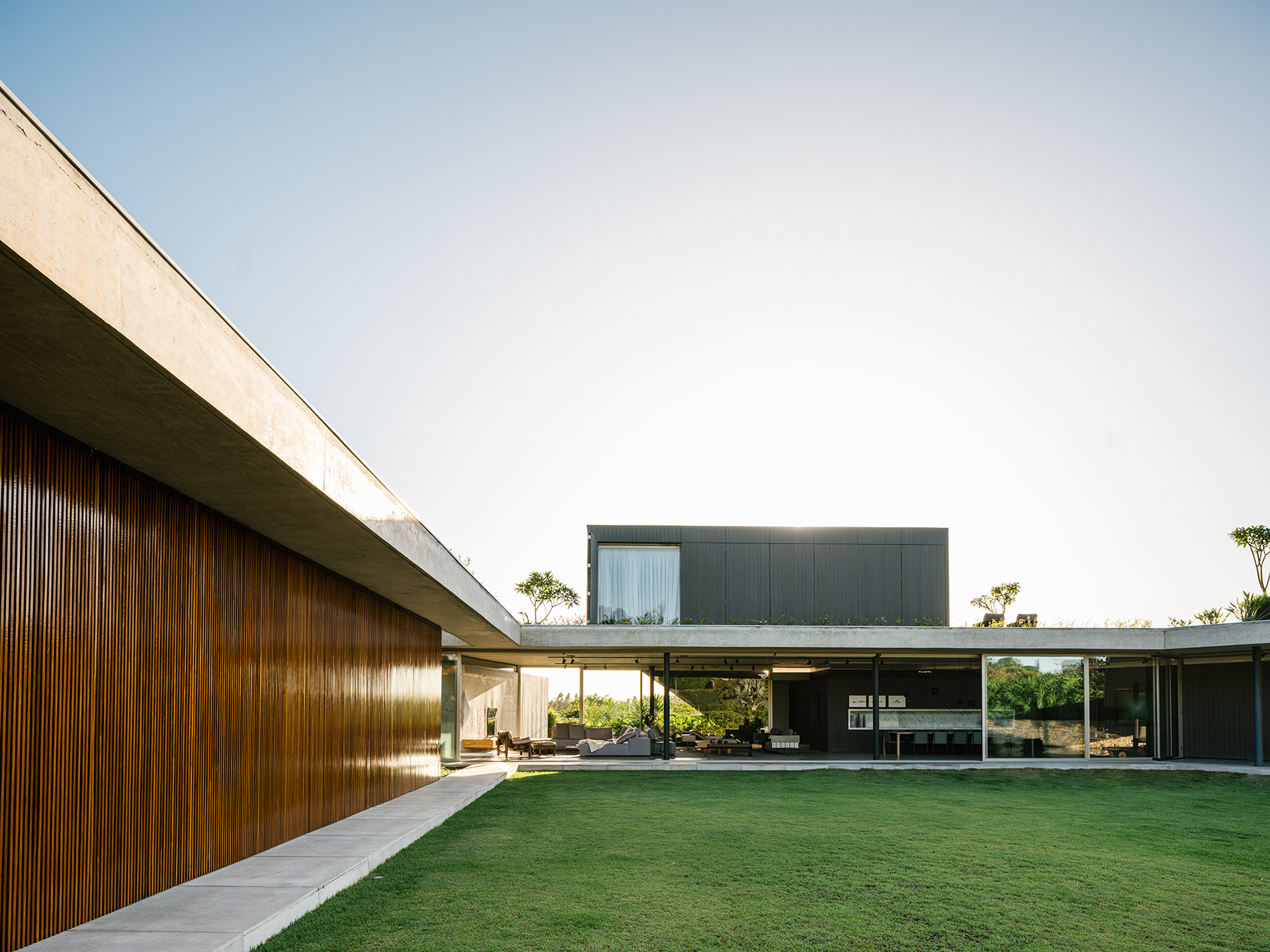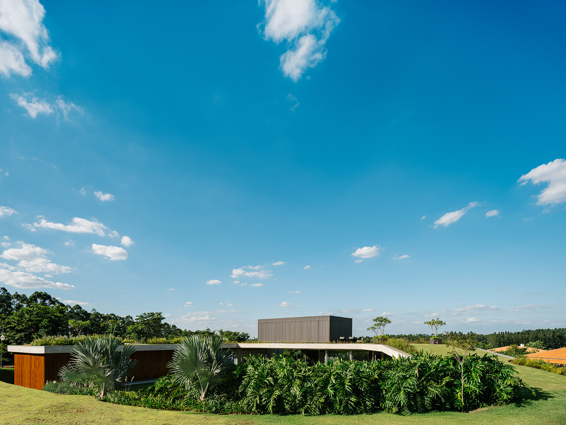 O projeto é também um ensaio de mínimo impacto no lote, que parece intocado em uma foto aérea em comparação a vizinhança - além do jardim, apenas piscina, solário, quadra de areia e algumas placas solares são de fato visíveis do alto, em uma espécie de “footprint” mínimo. A grande cobertura verde da laje propicia grande conforto térmico, e as extensas aberturas de vidro que possibilitam ventilação cruzada auxiliam no desempenho energético da edificação.