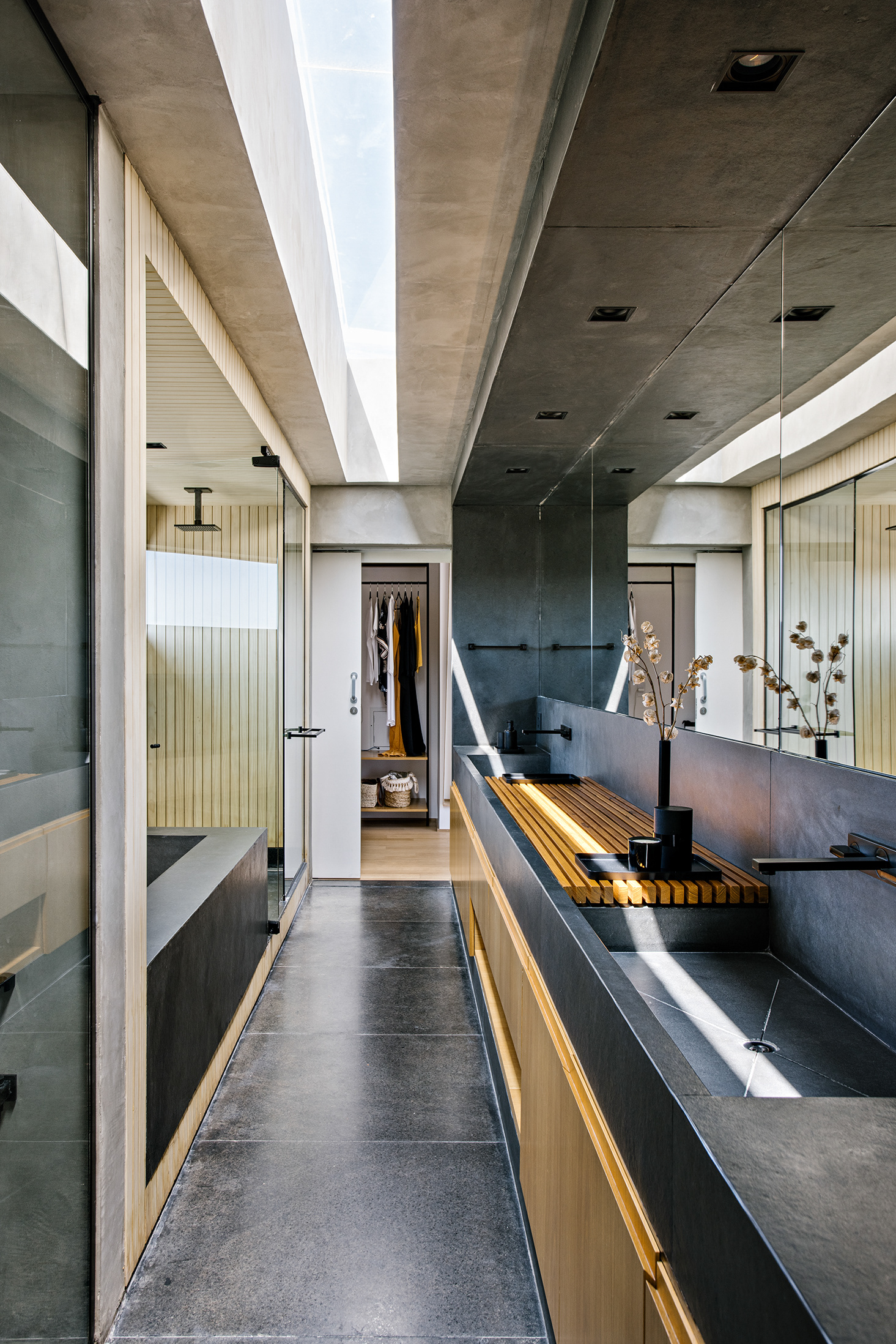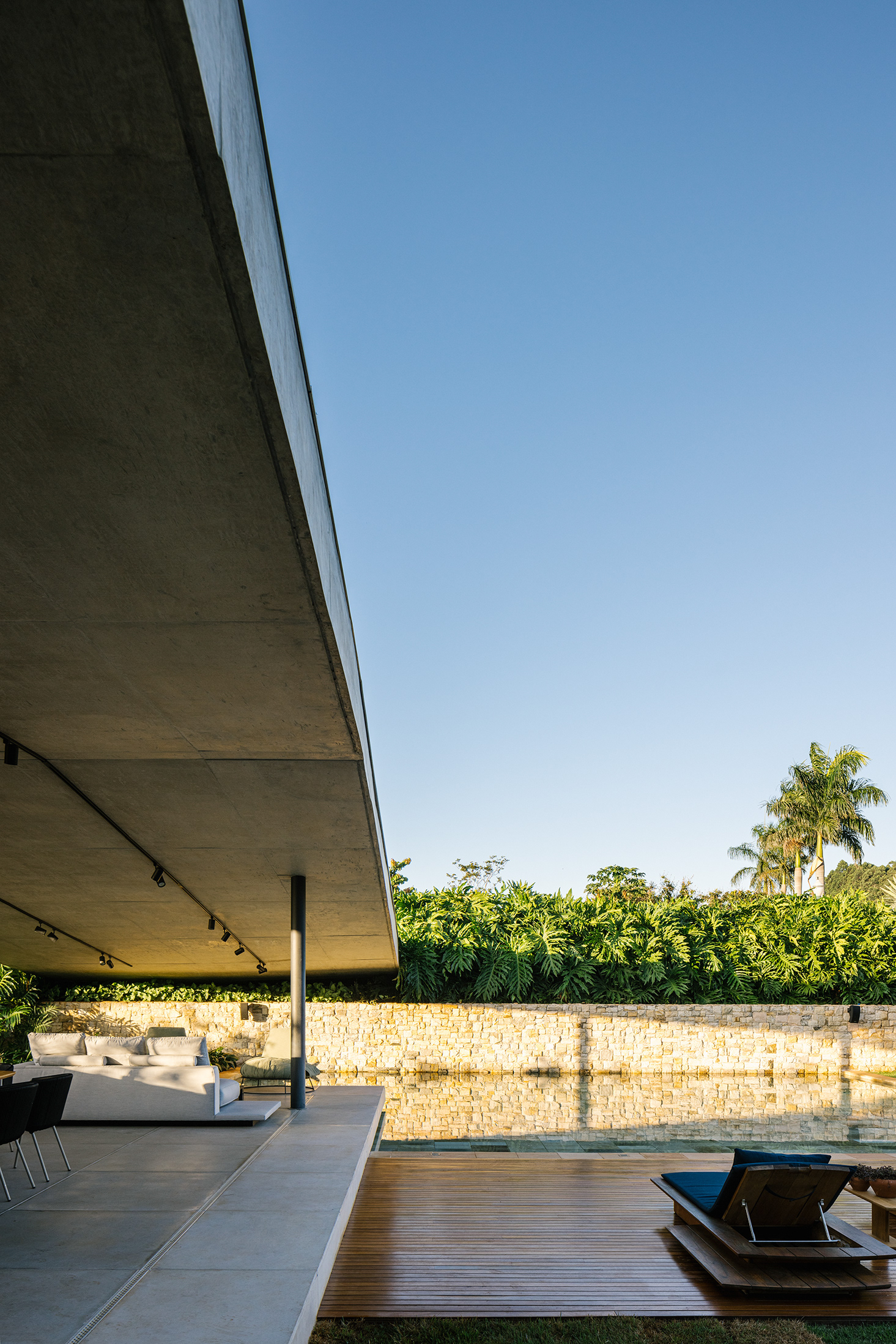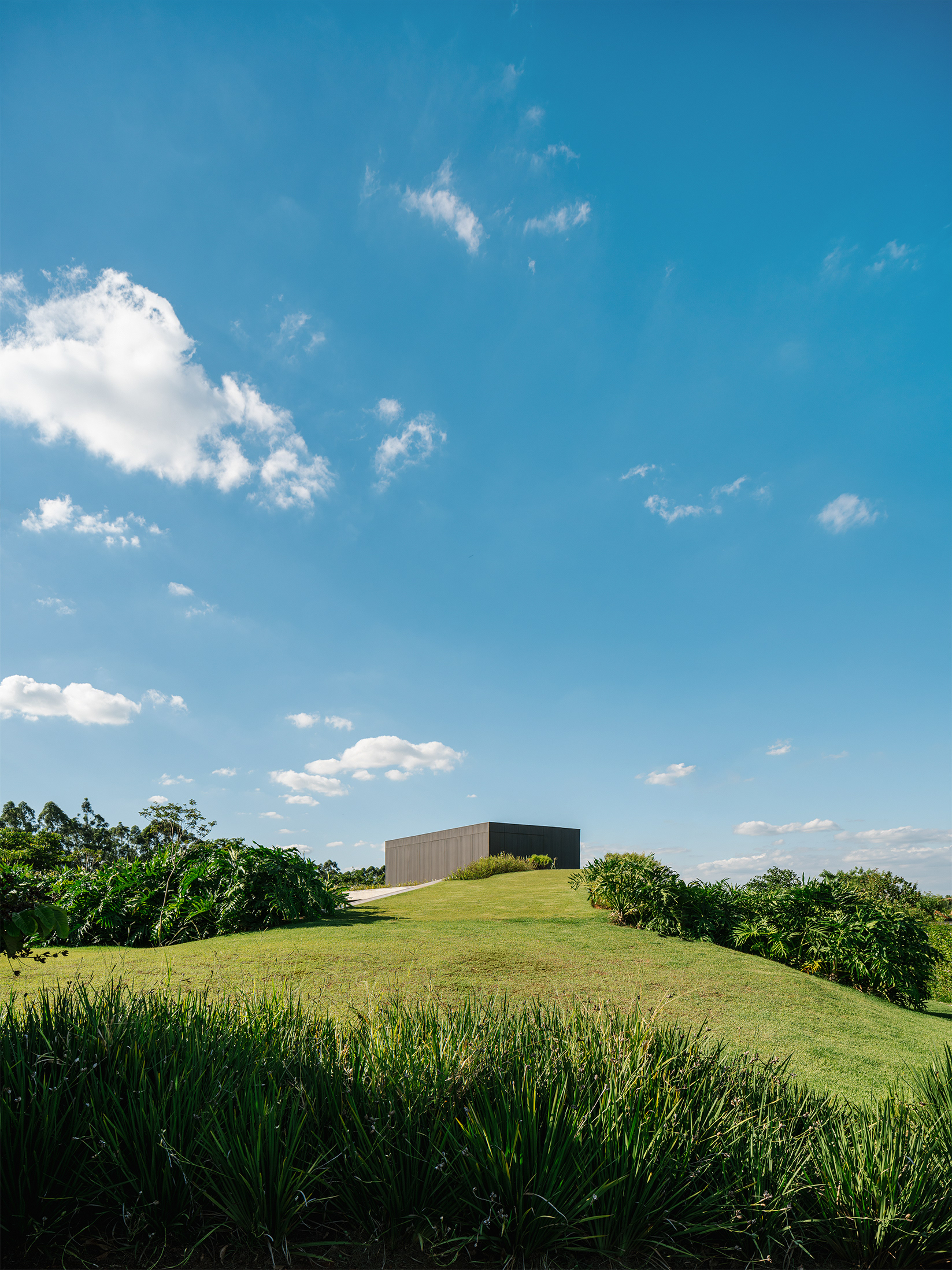 O uso de um “jardim suspenso” acessível em rampa que recobre o extenso programa da casa a tornou um espaço que é ao mesmo tempo muito integrado entre si e um pouco discreto do olhar externo propiciando uma dinâmica de uso que vinha de encontro aos desejos dos moradores. Acertos no terreno com um muro de arrimo em pedra e um extenso morrote lateral finalizam a composição e acertos do objeto no terreno, em um ensaio de fusão do lote com a arquitetura.