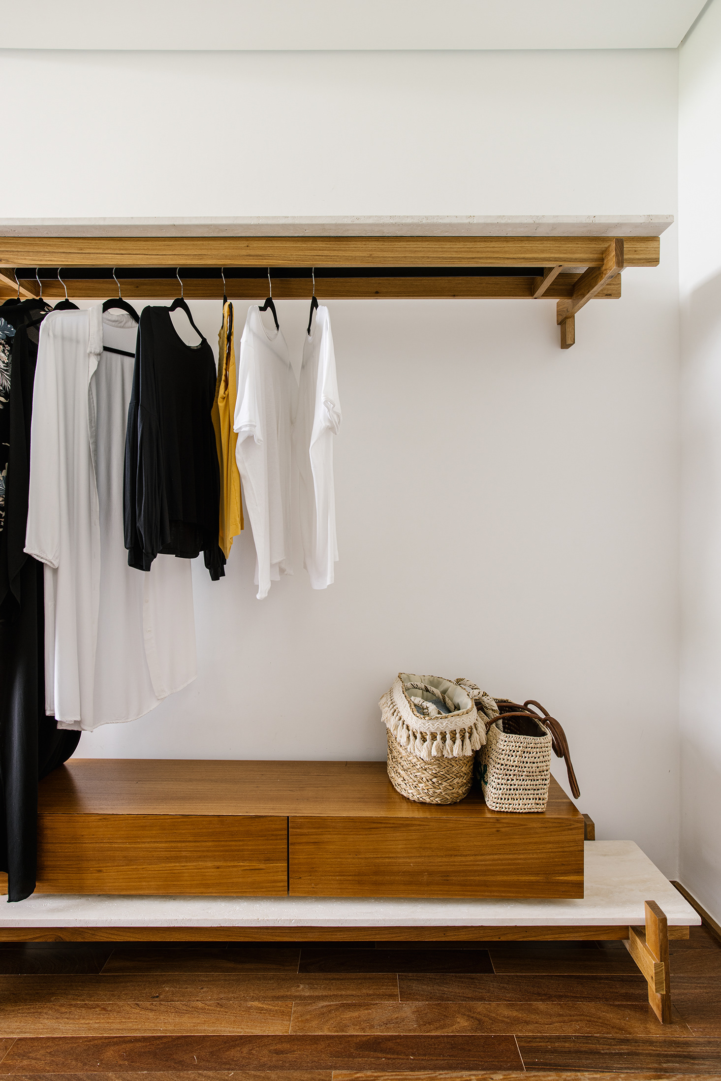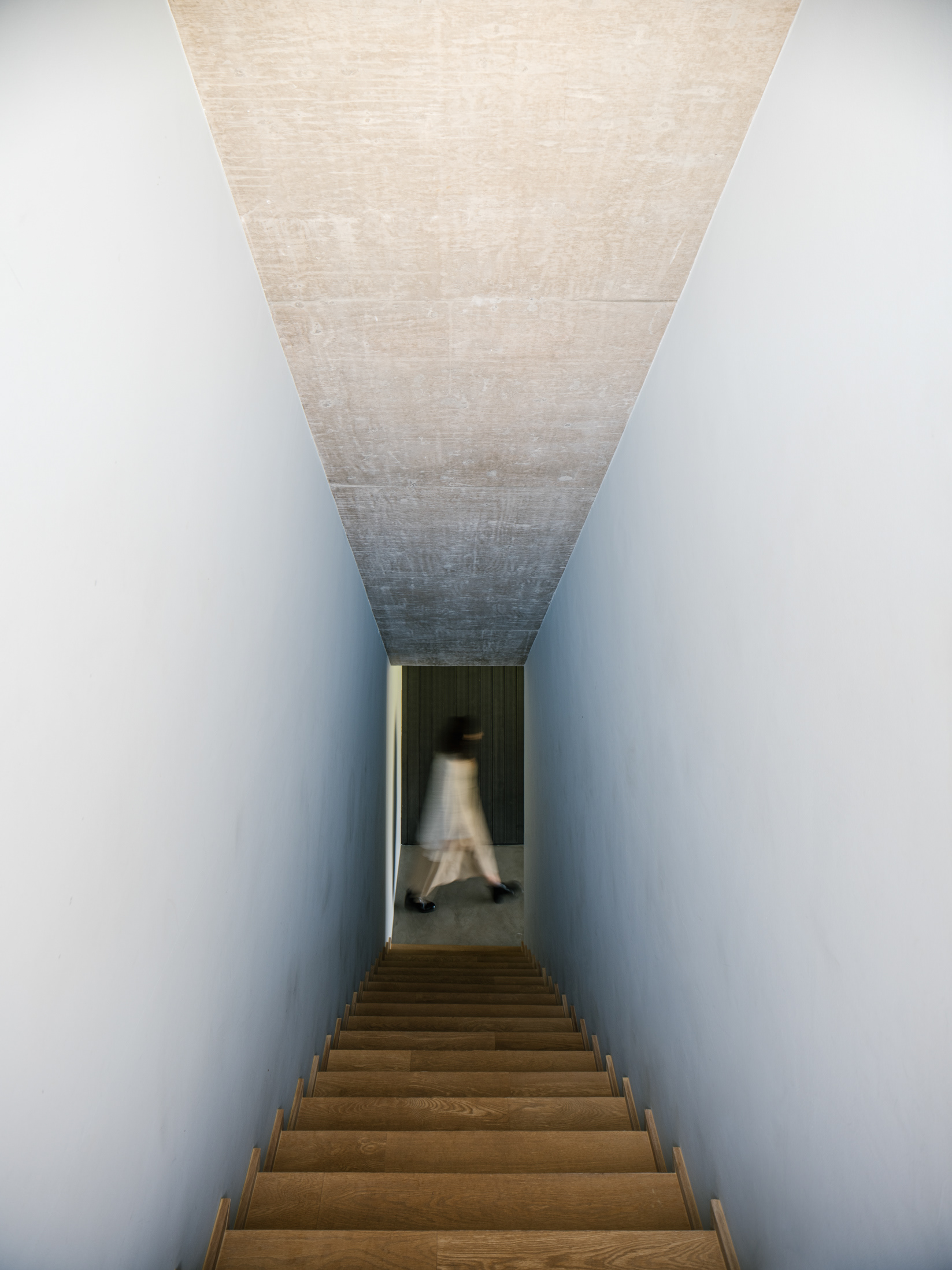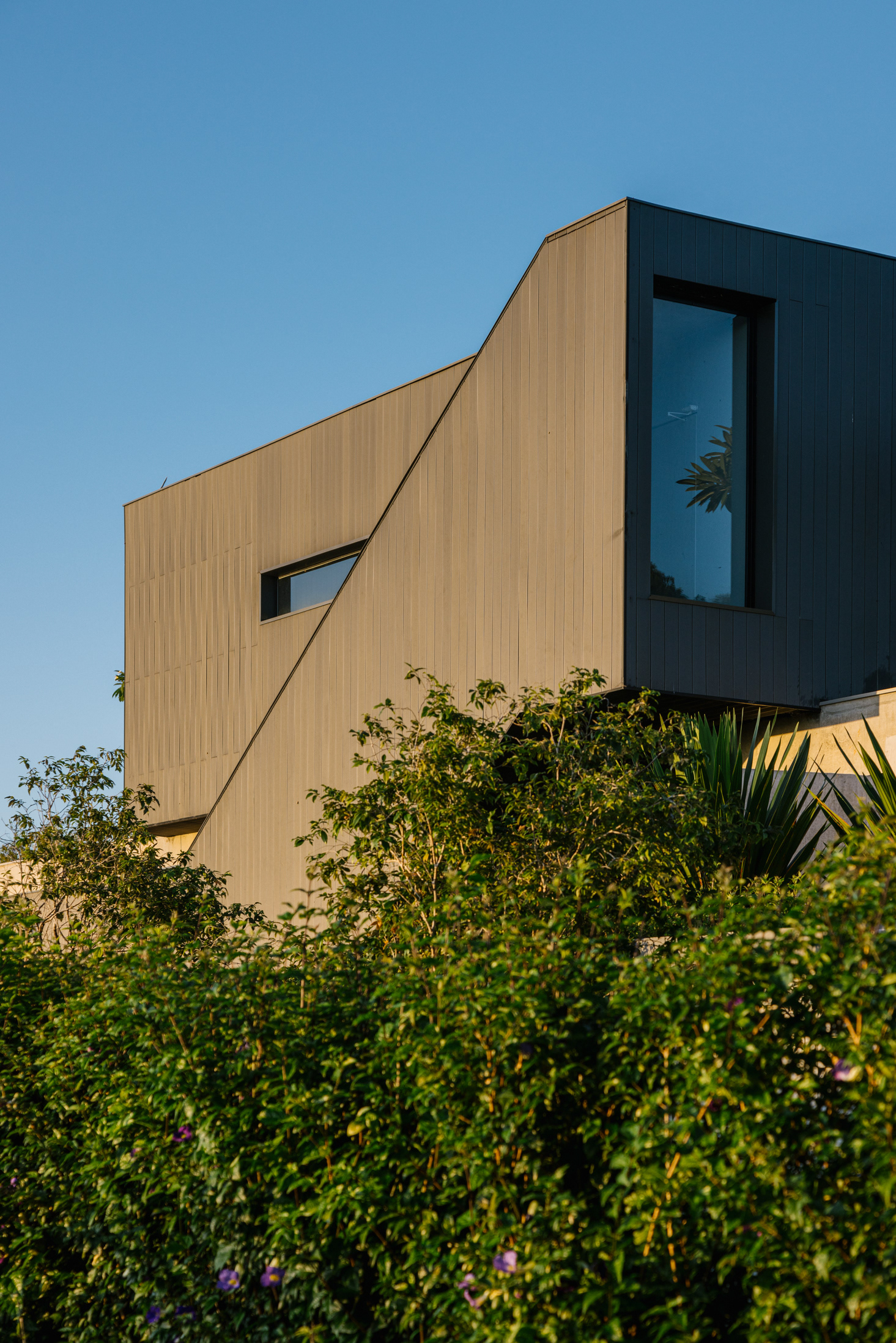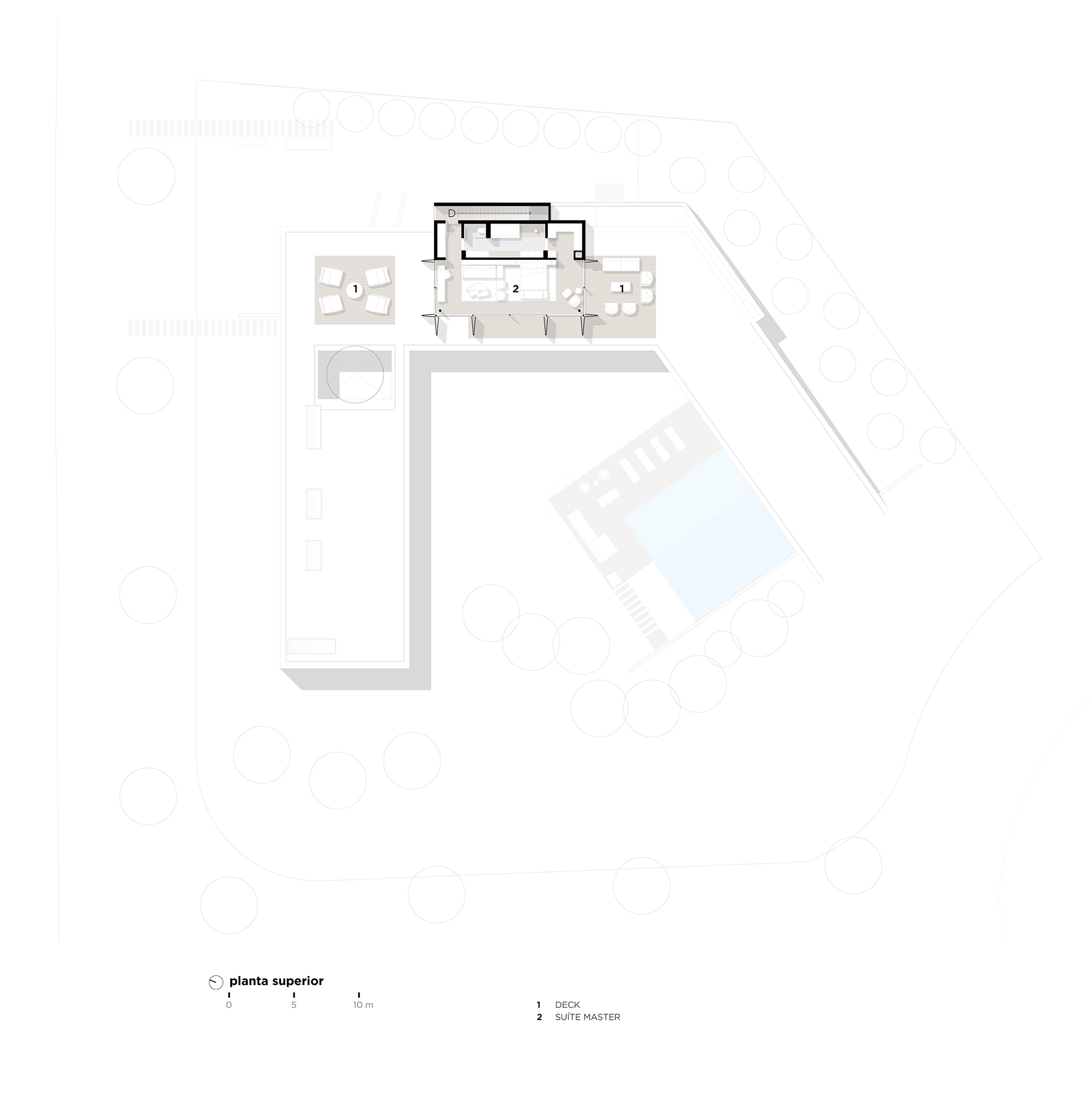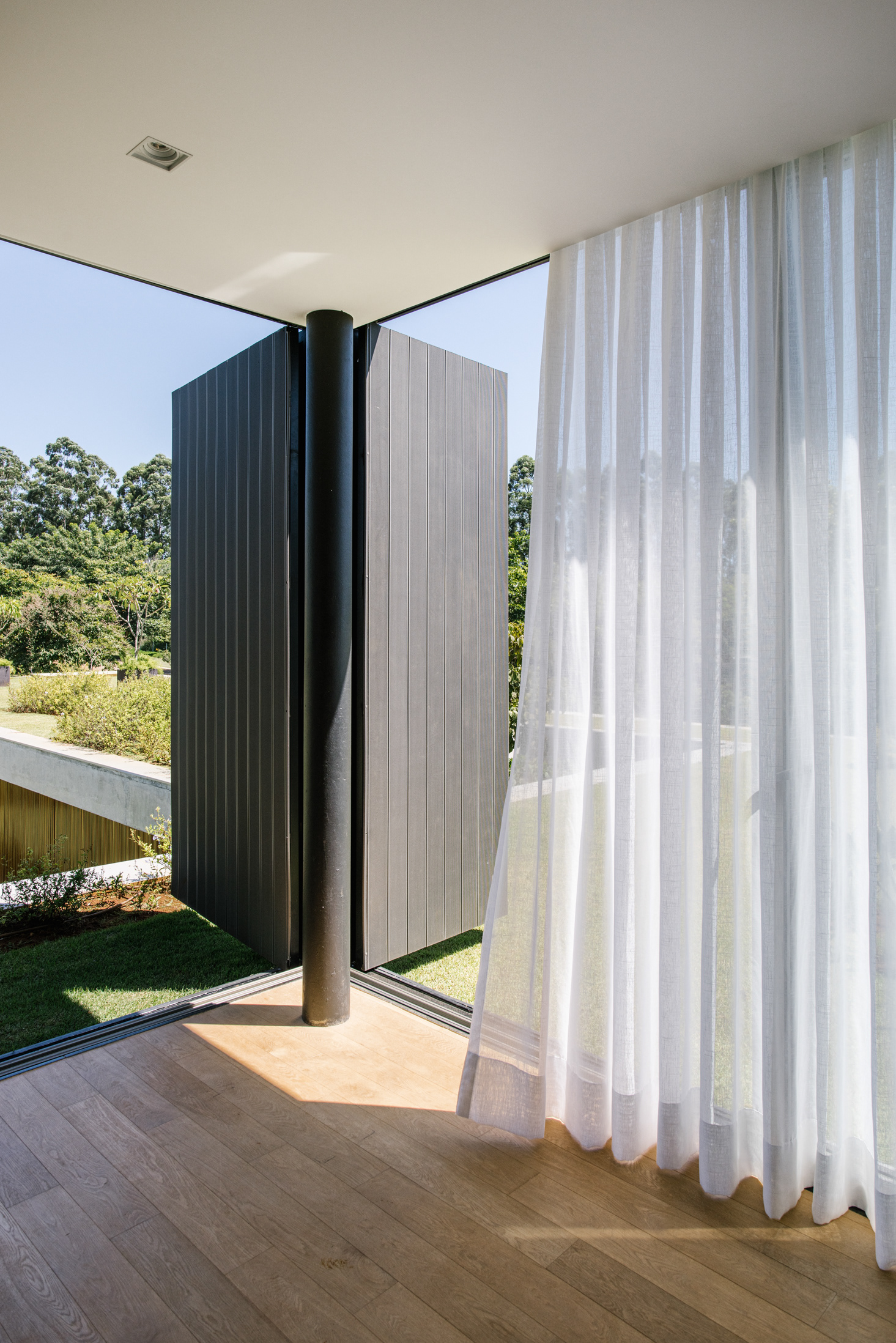 A setorização é reforçada por materiais diferentes de vedação; a área social e lazer é envidraçada ou aberta, a ala de hóspedes possui tratamento em madeira que quando fechada se transforma em um bloco monolítico sob a laje e as áreas de serviço tem fechamento em fachada ventilada ebanizada. Sobre a laje encontra-se apenas a suíte principal, que tem um tratamento de vedação que dá continuidade através da escada com os elementos opacos do andar térreo. Este pequeno volume no andar superior, em meio ao teto jardim possui grandes aberturas e funciona como um elemento que está ora estanque, ora completamente escancarado para as vistas. Garagem, jardim e hall de entrada são como negativos sob a laje, que em balanço ou com rasgos recobre os ambientes delicadamente.