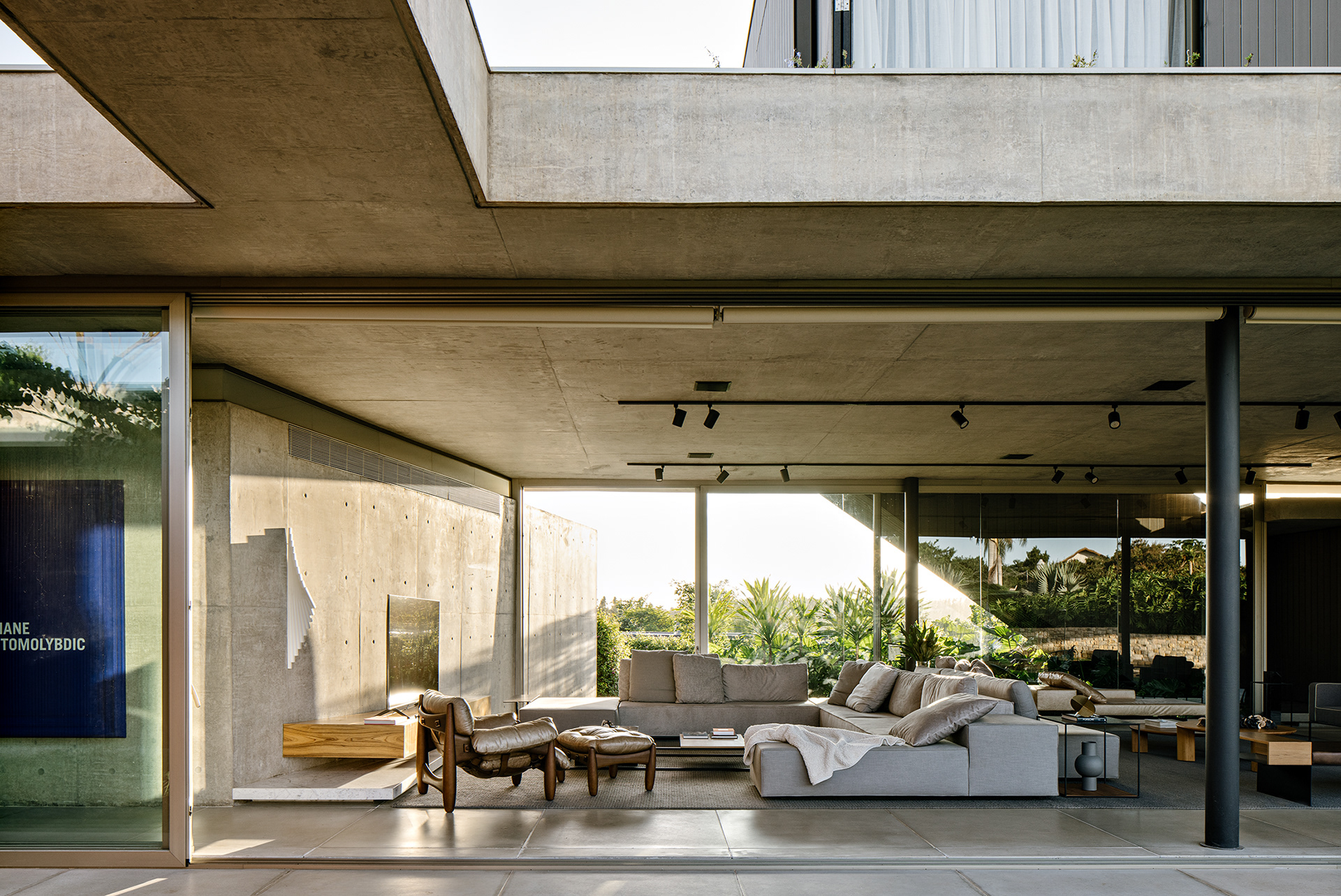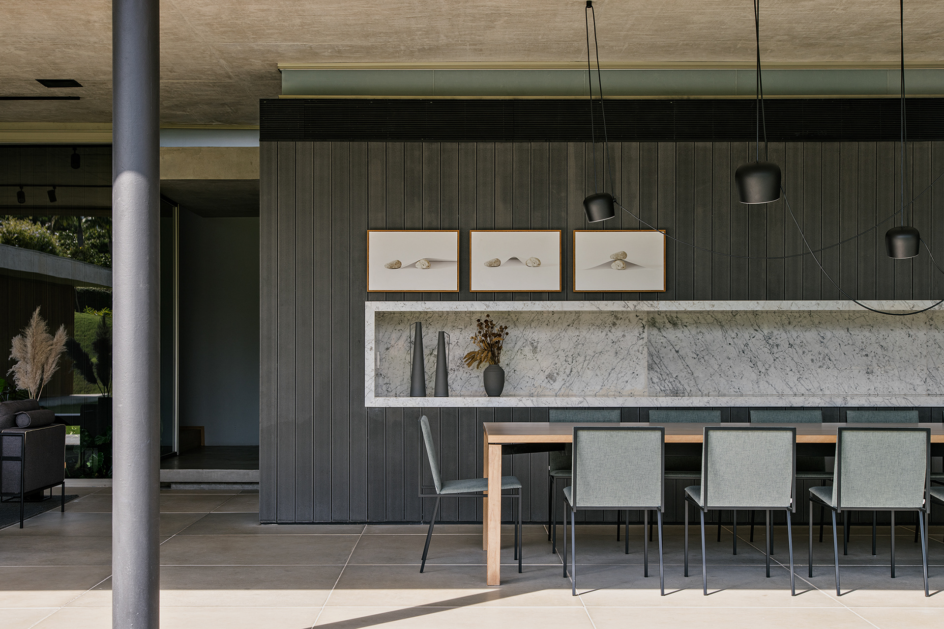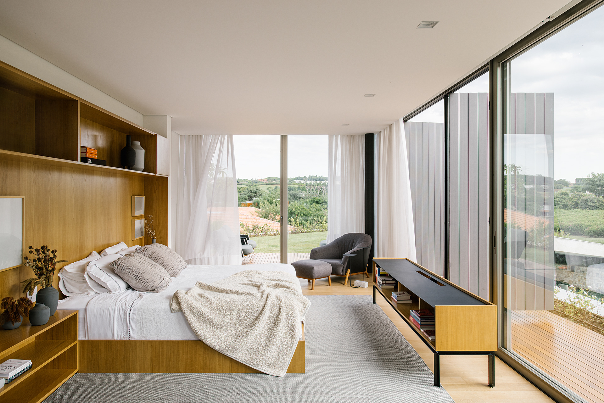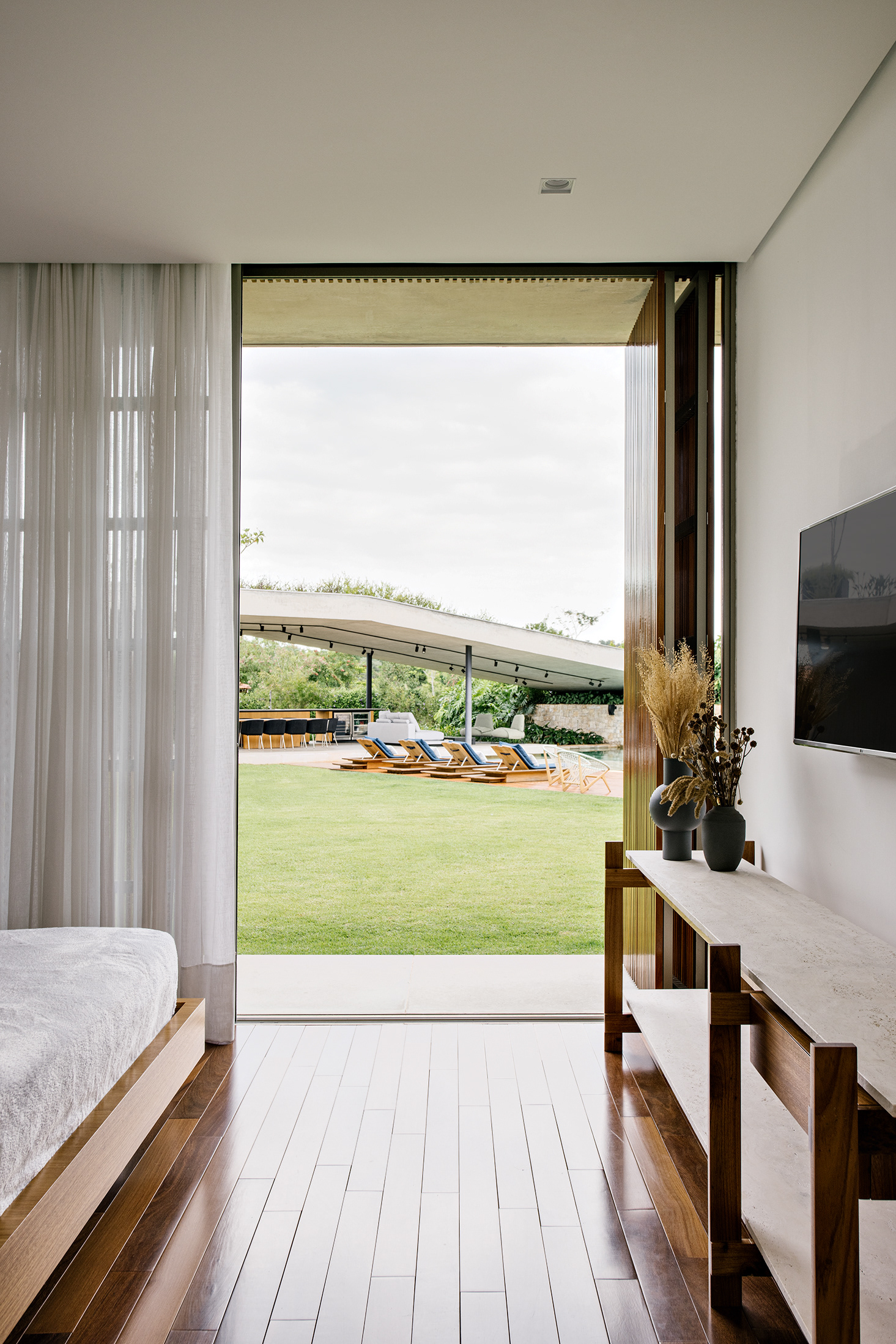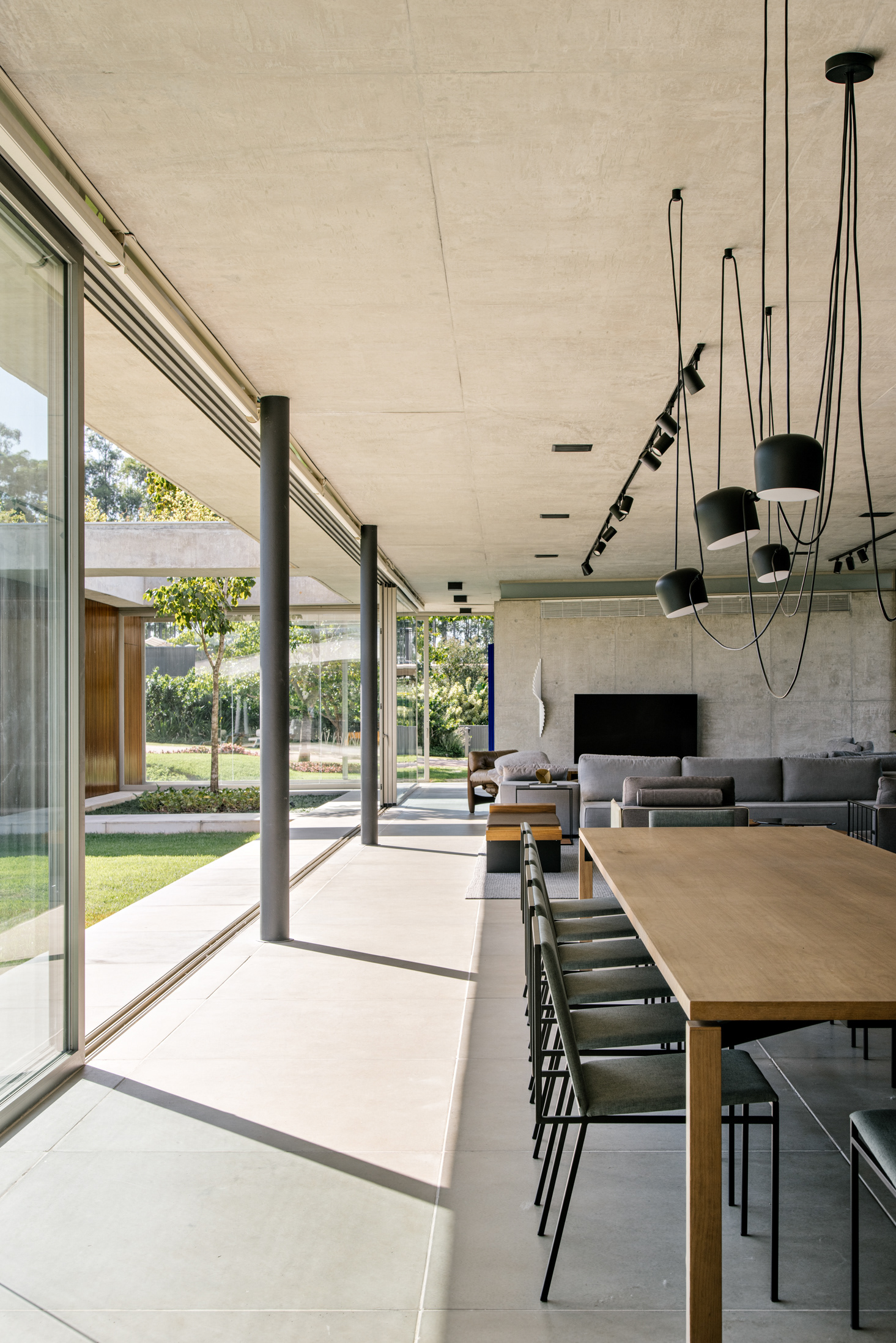 O projeto de interiores minimalista, com mix de designers nacionais e internacionais, também realizado pelo escritório complementa a casa e permite desde o uso informal e lazer, que eram os objetivos principais, até eventos um pouco mais formais.